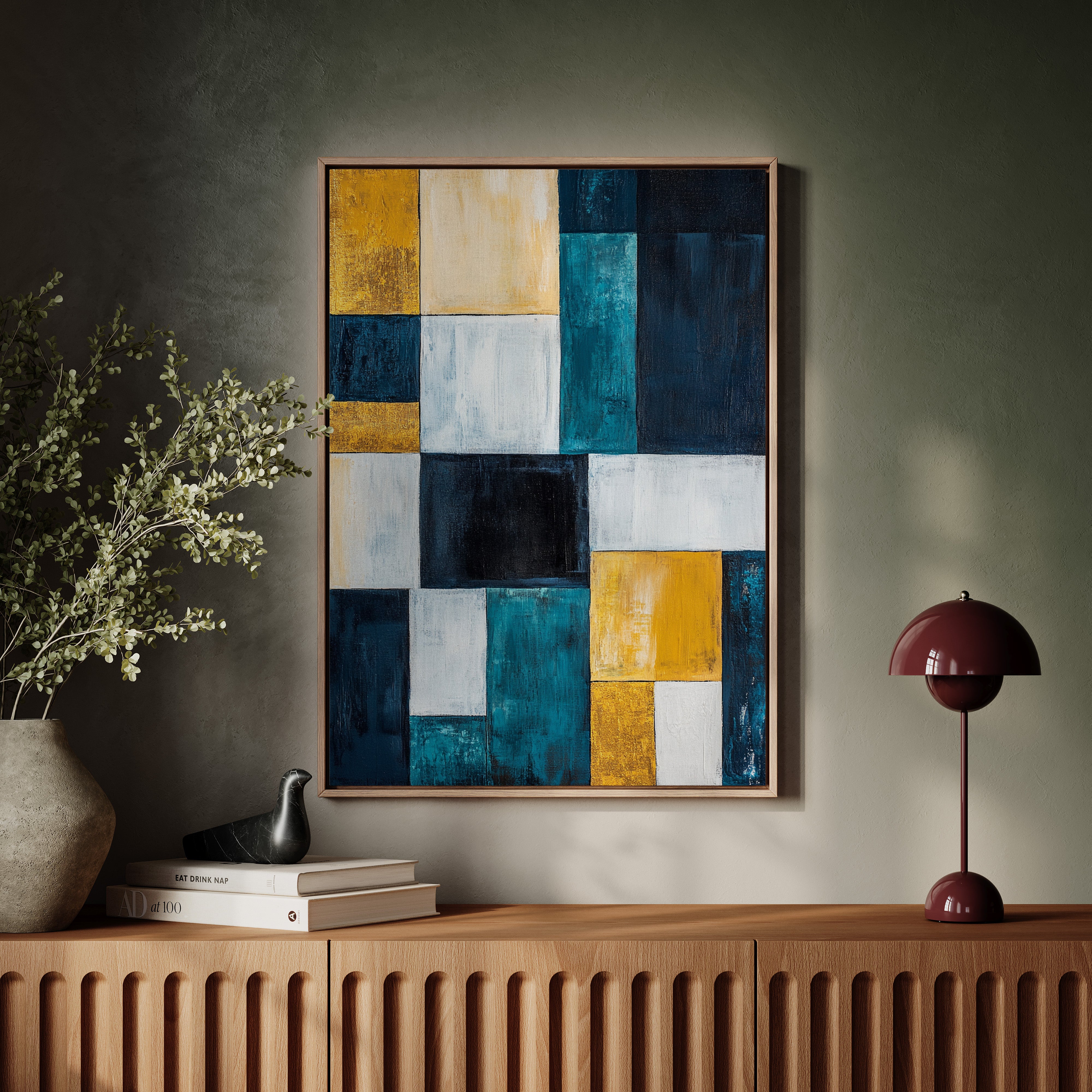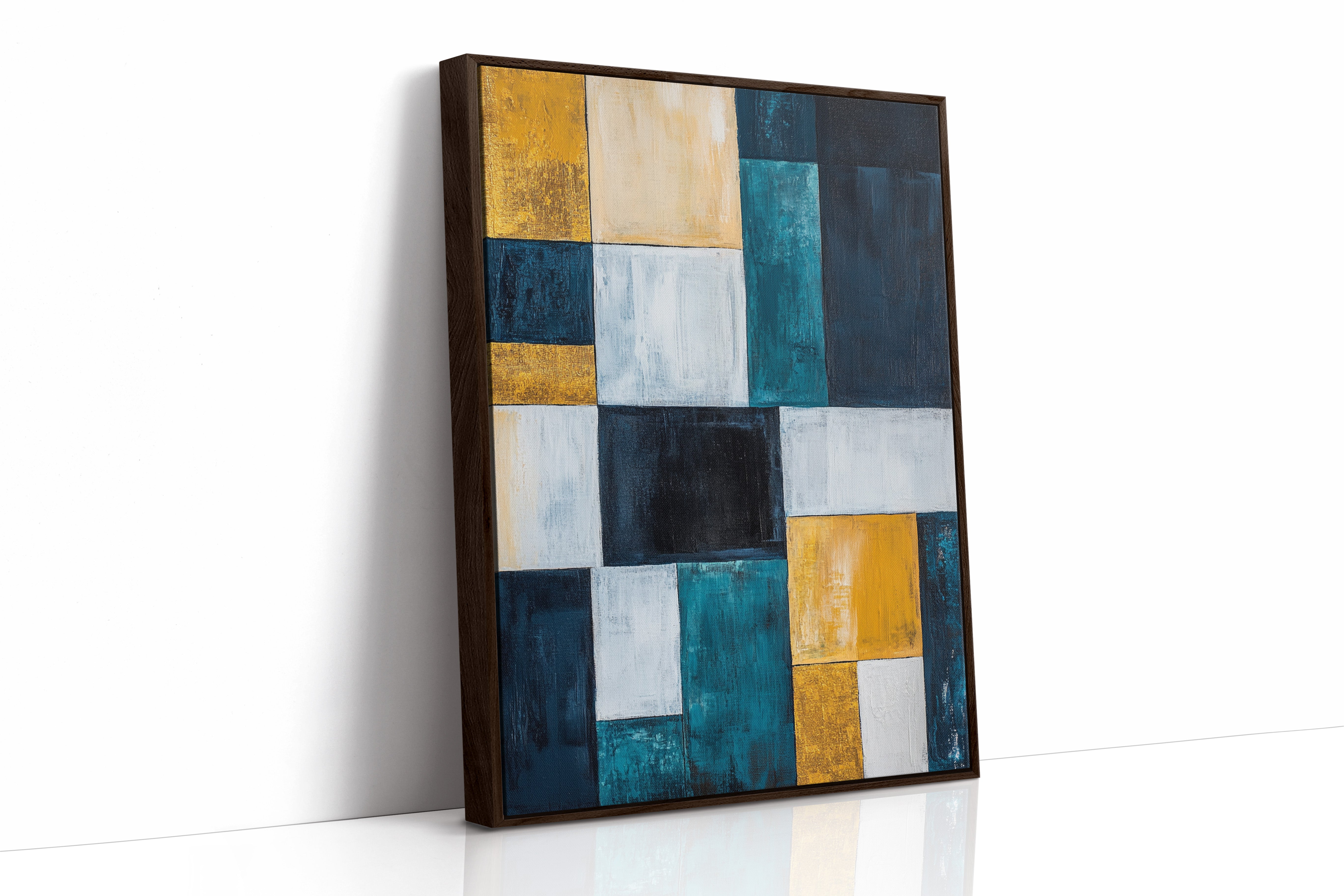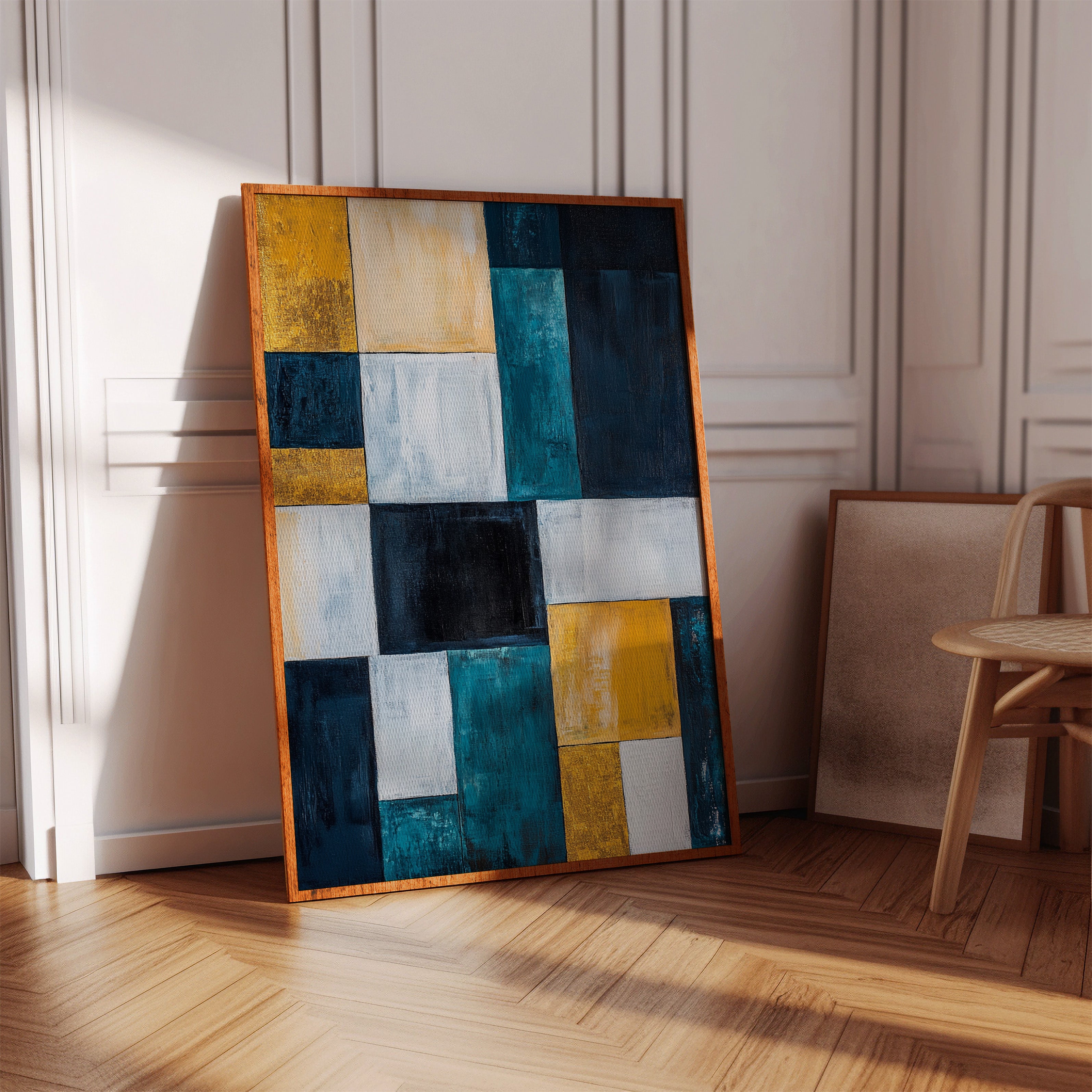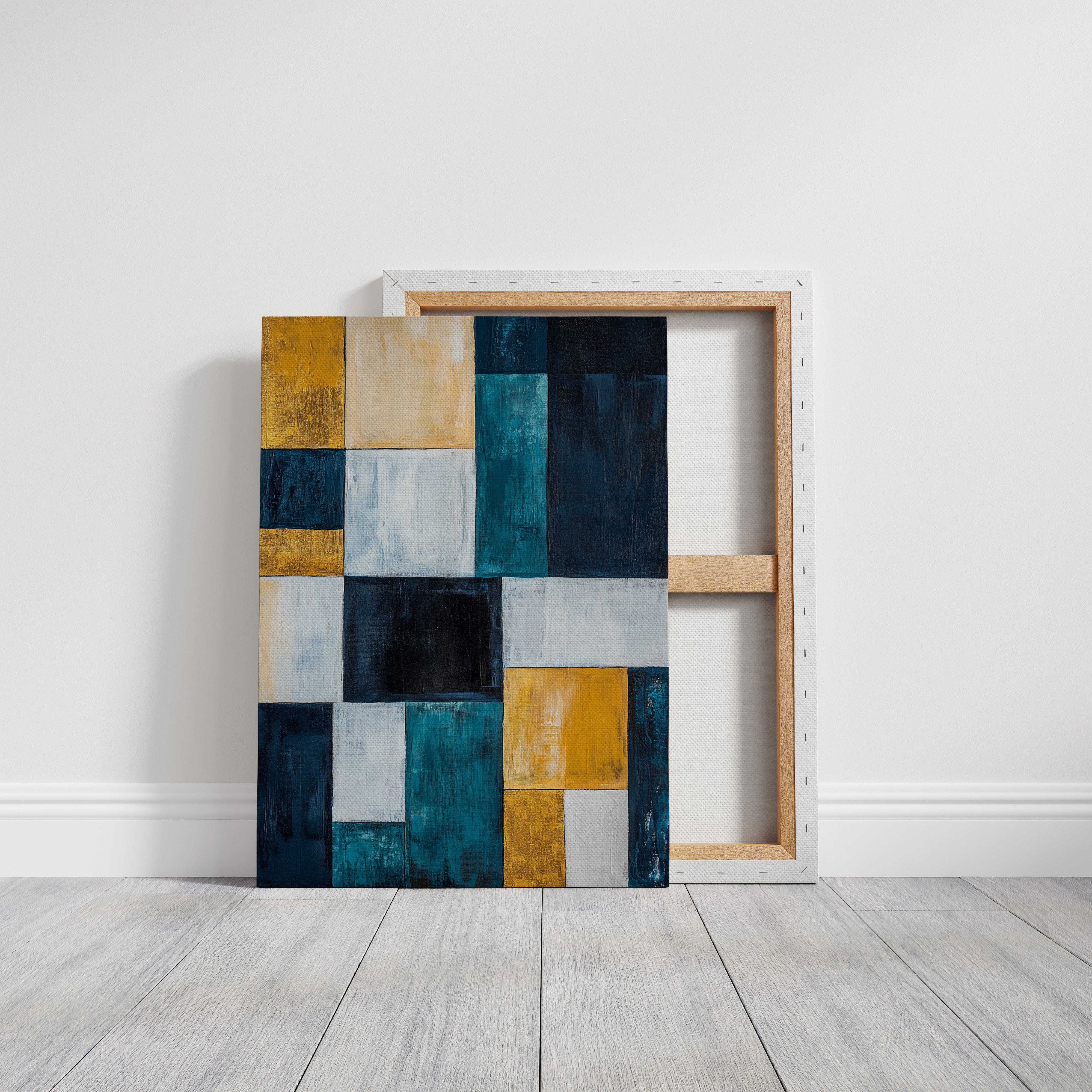 Enhance your space with this captivating modern abstract geometric canvas art, where bold navy and vibrant mustard hues interlock in a harmonious dance.