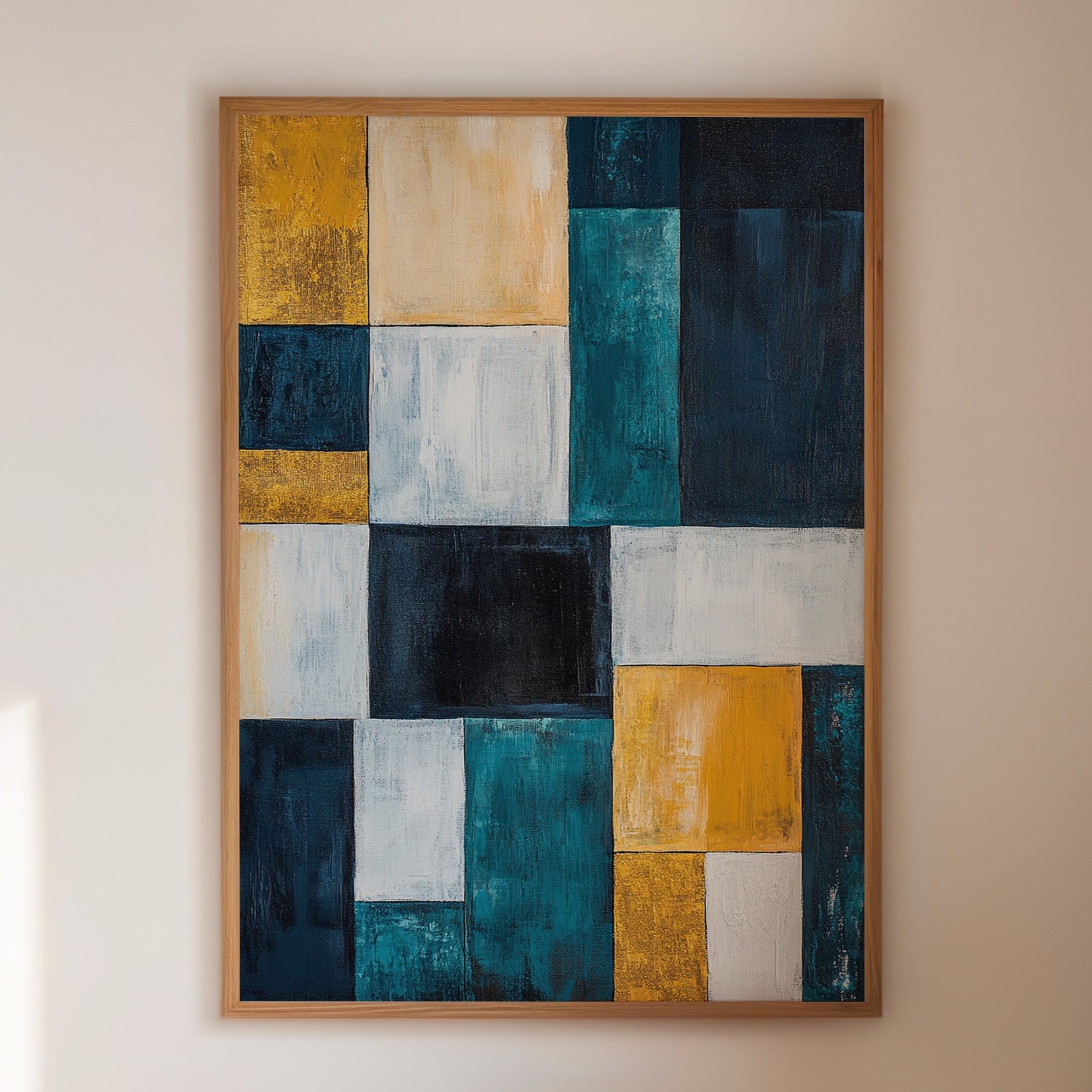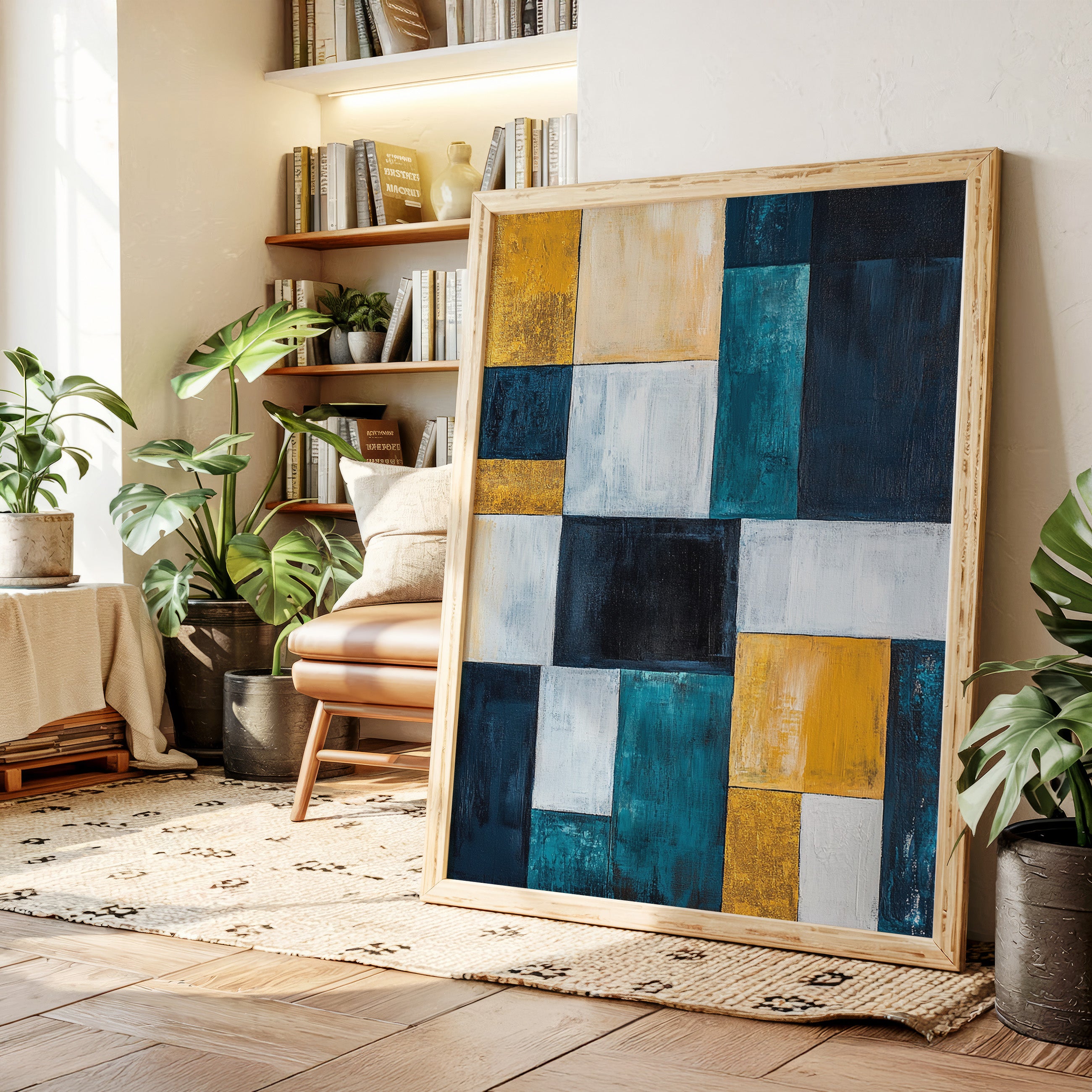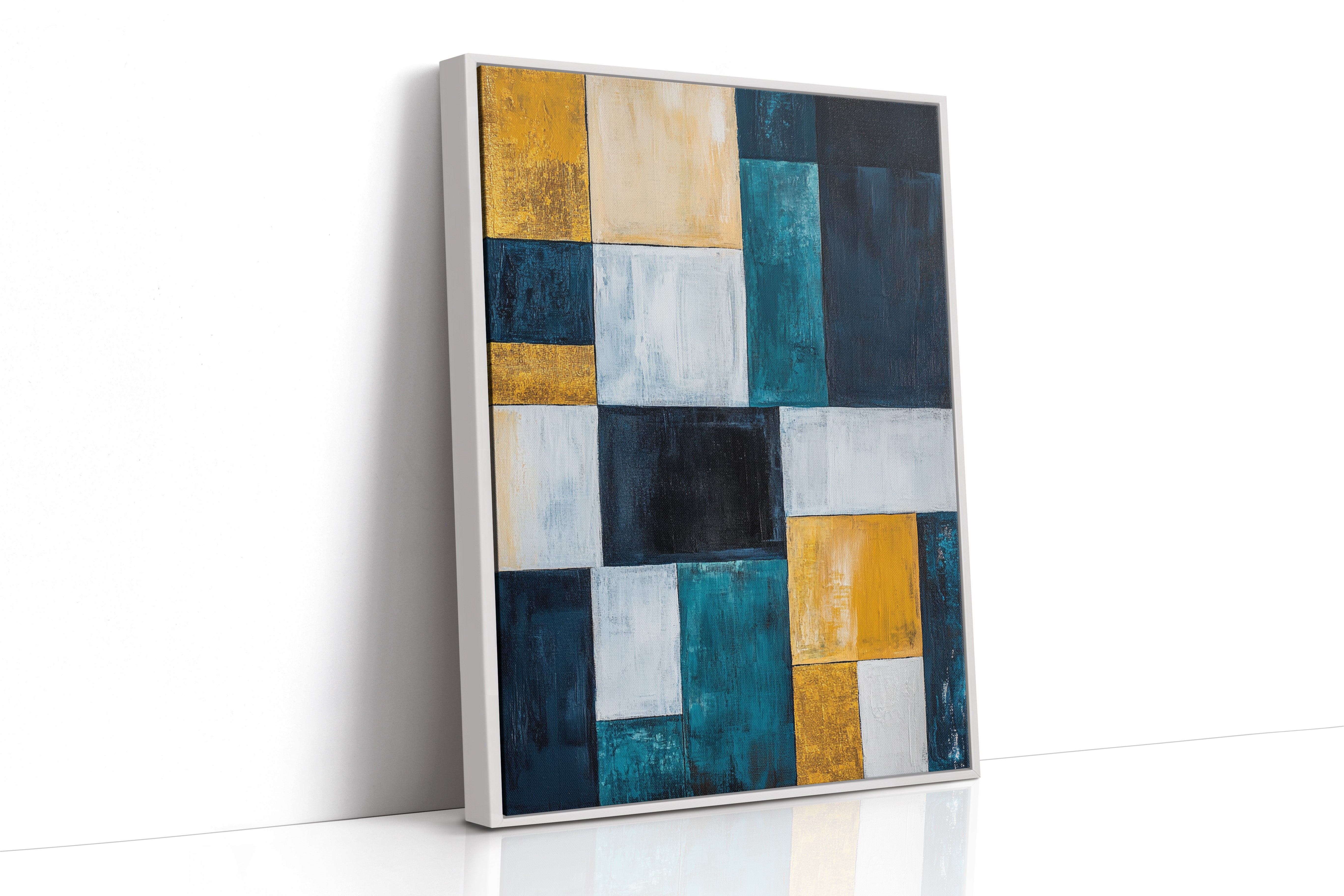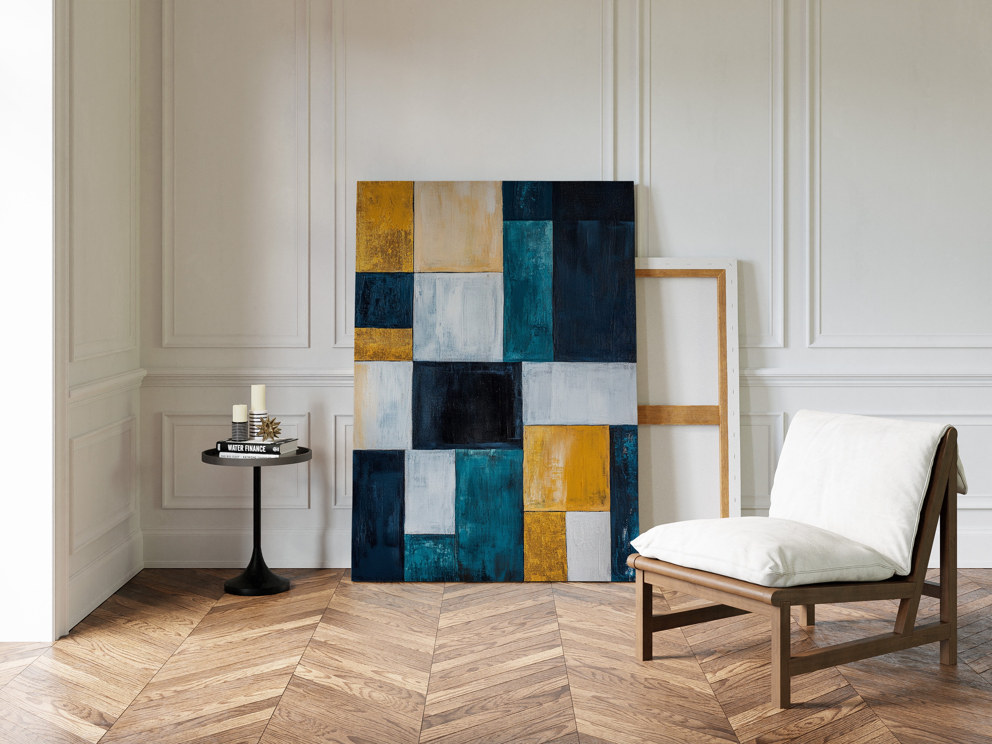 Enhance your space with this captivating modern abstract geometric canvas art, where bold navy and vibrant mustard hues interlock in a harmonious dance.
