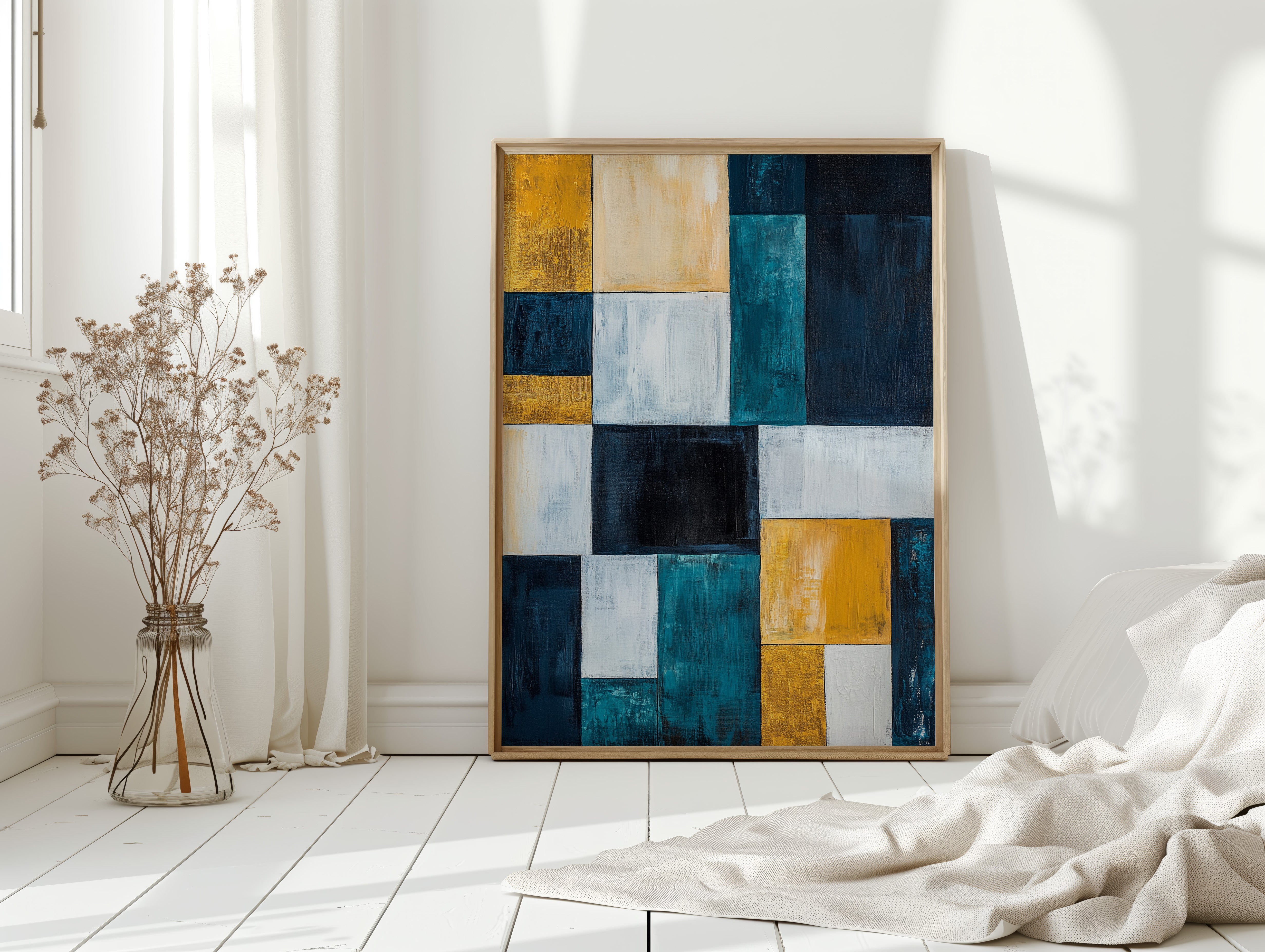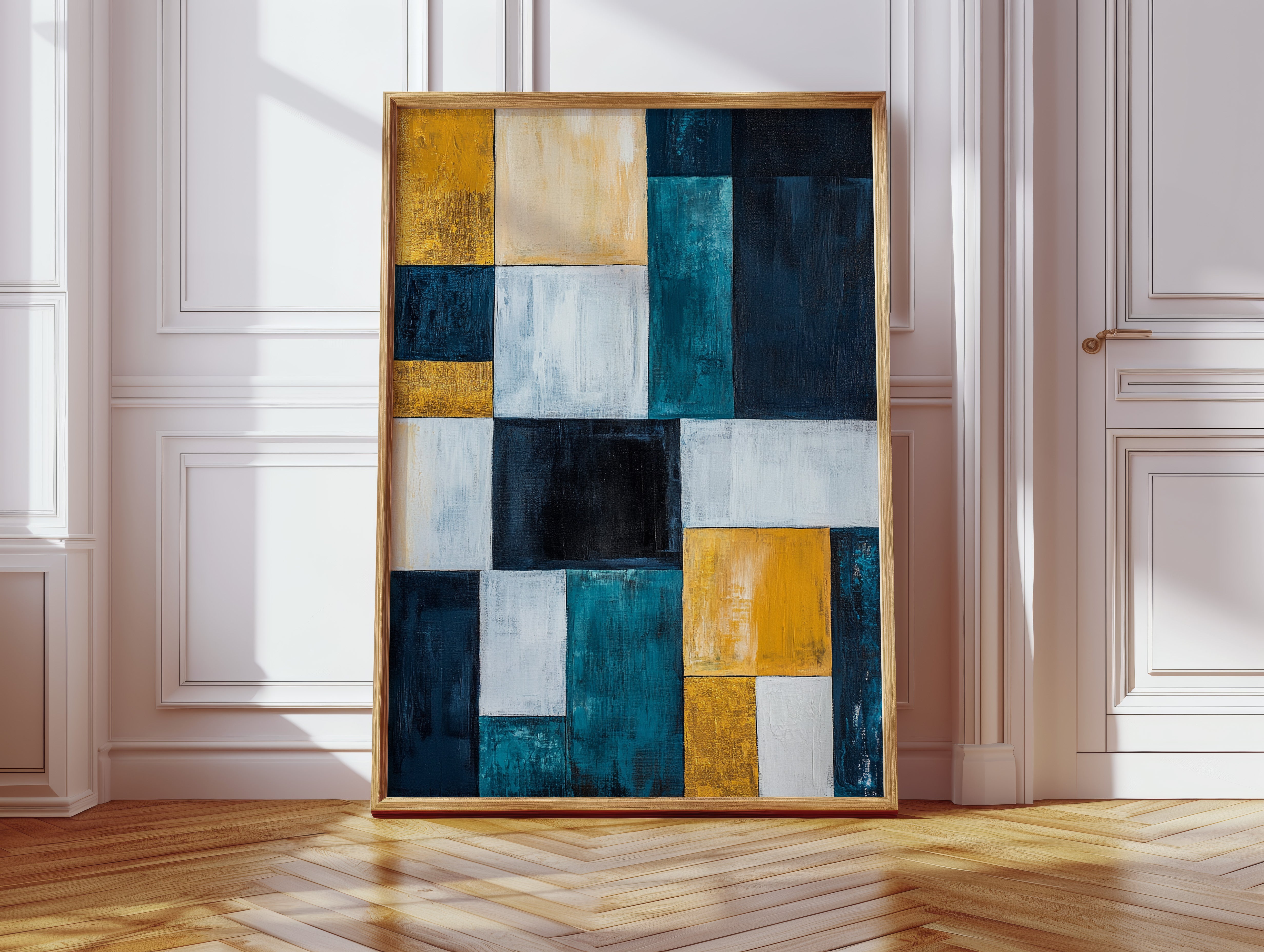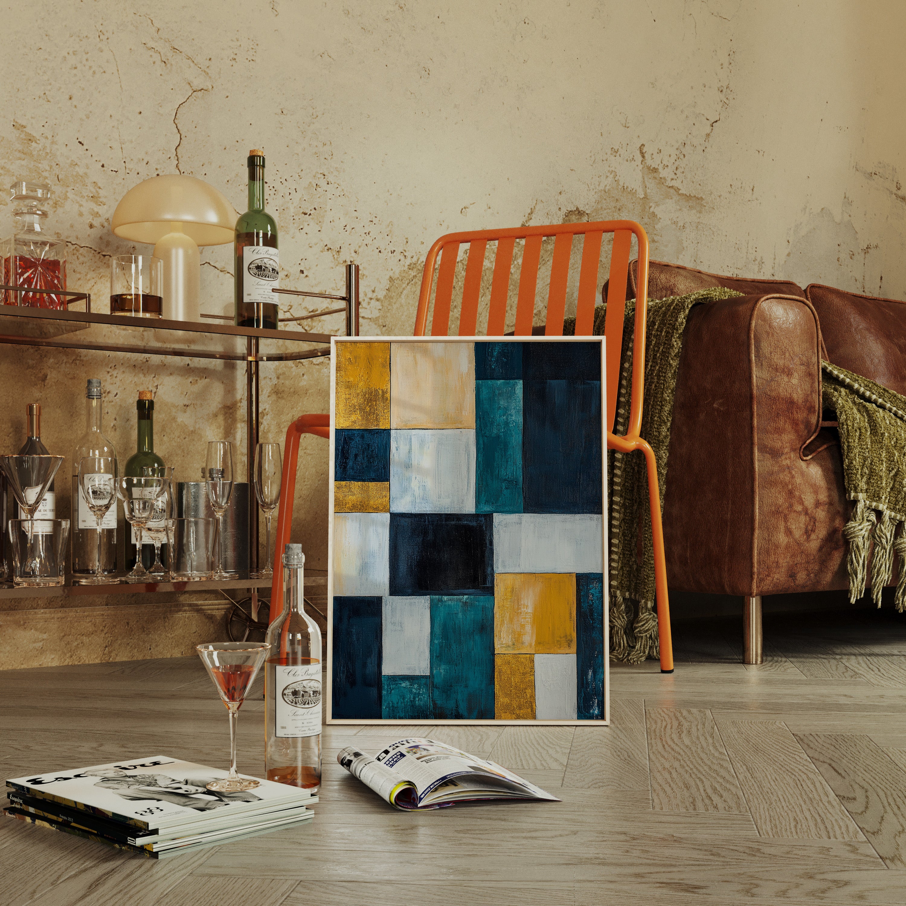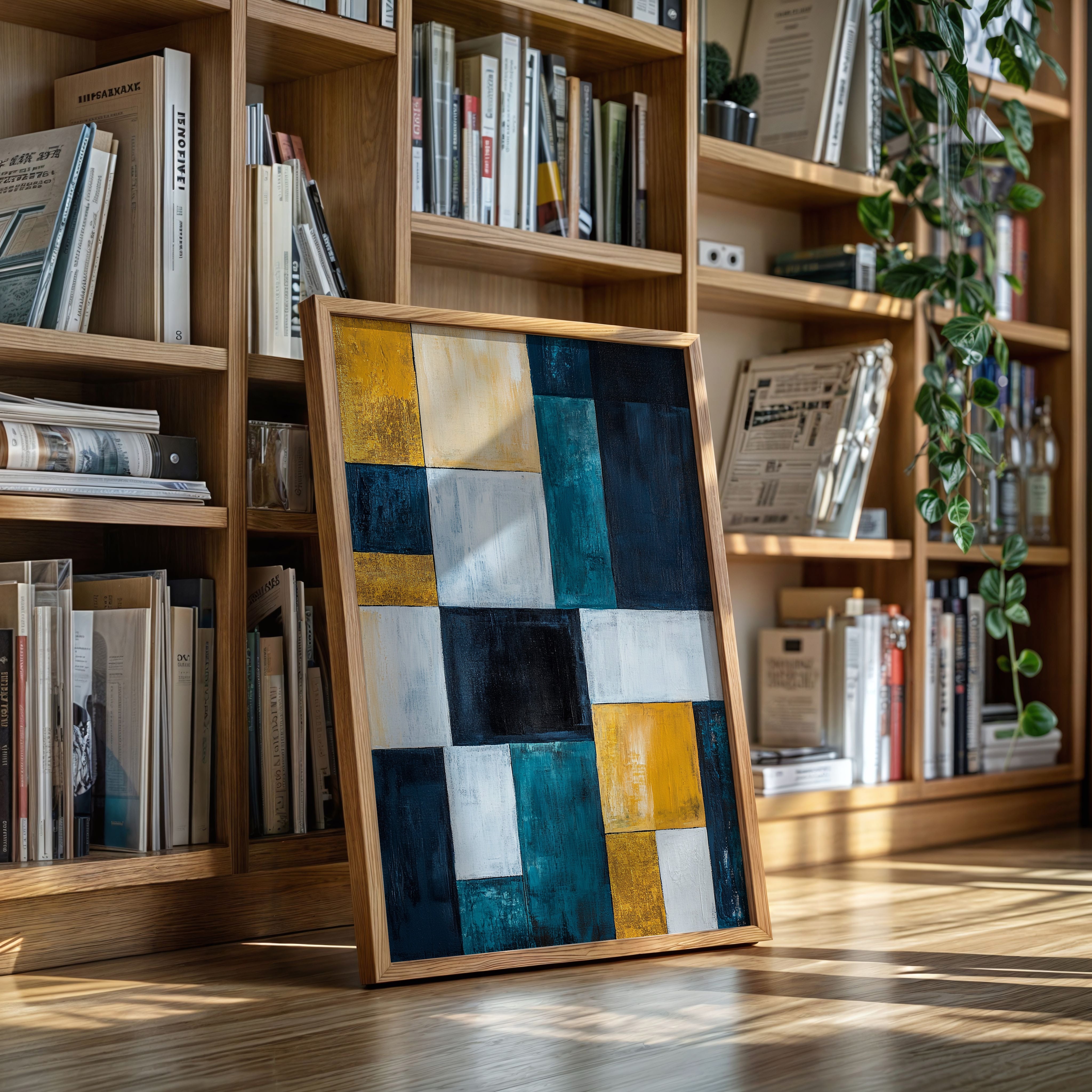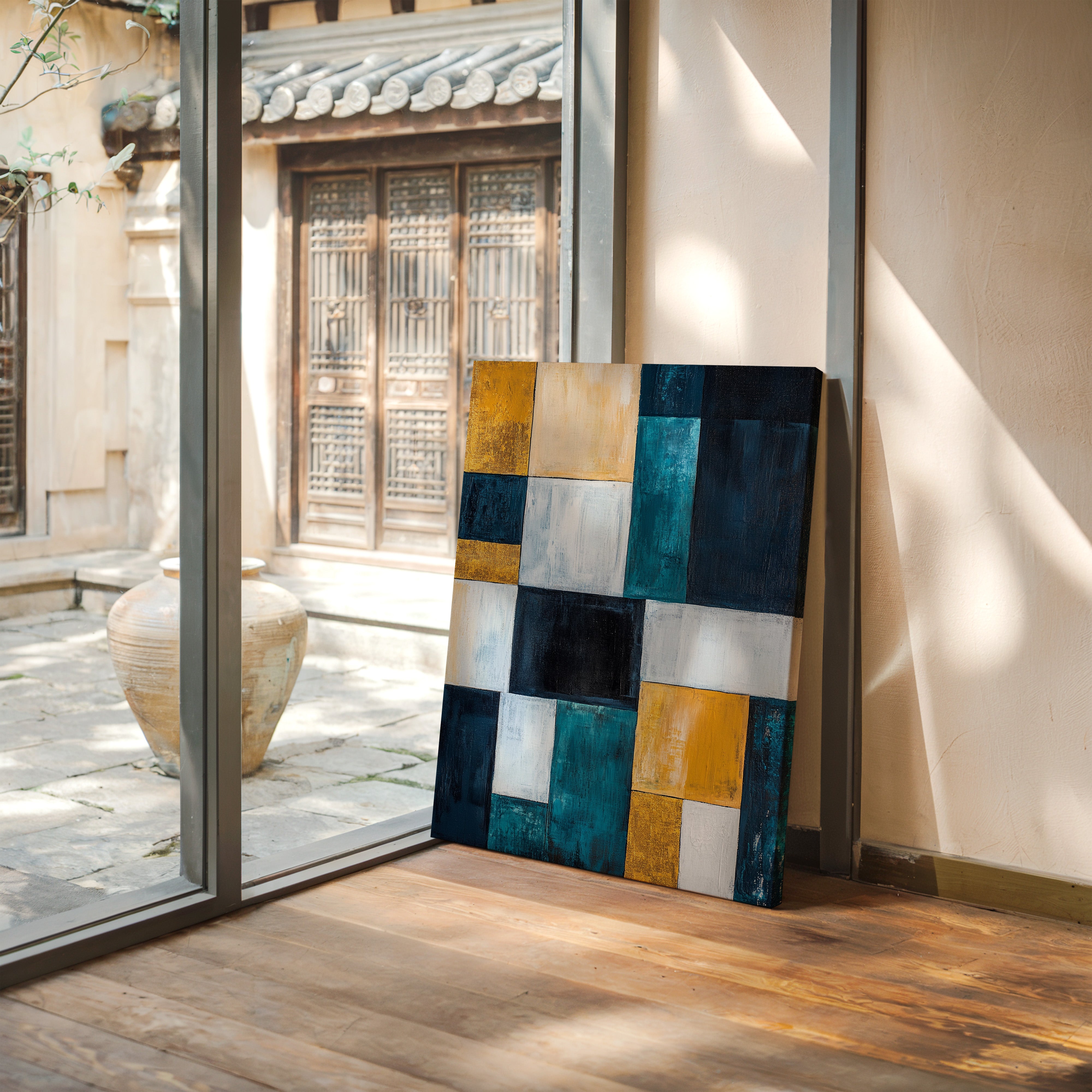 Enhance your space with this captivating modern abstract geometric canvas art, where bold navy and vibrant mustard hues interlock in a harmonious dance.