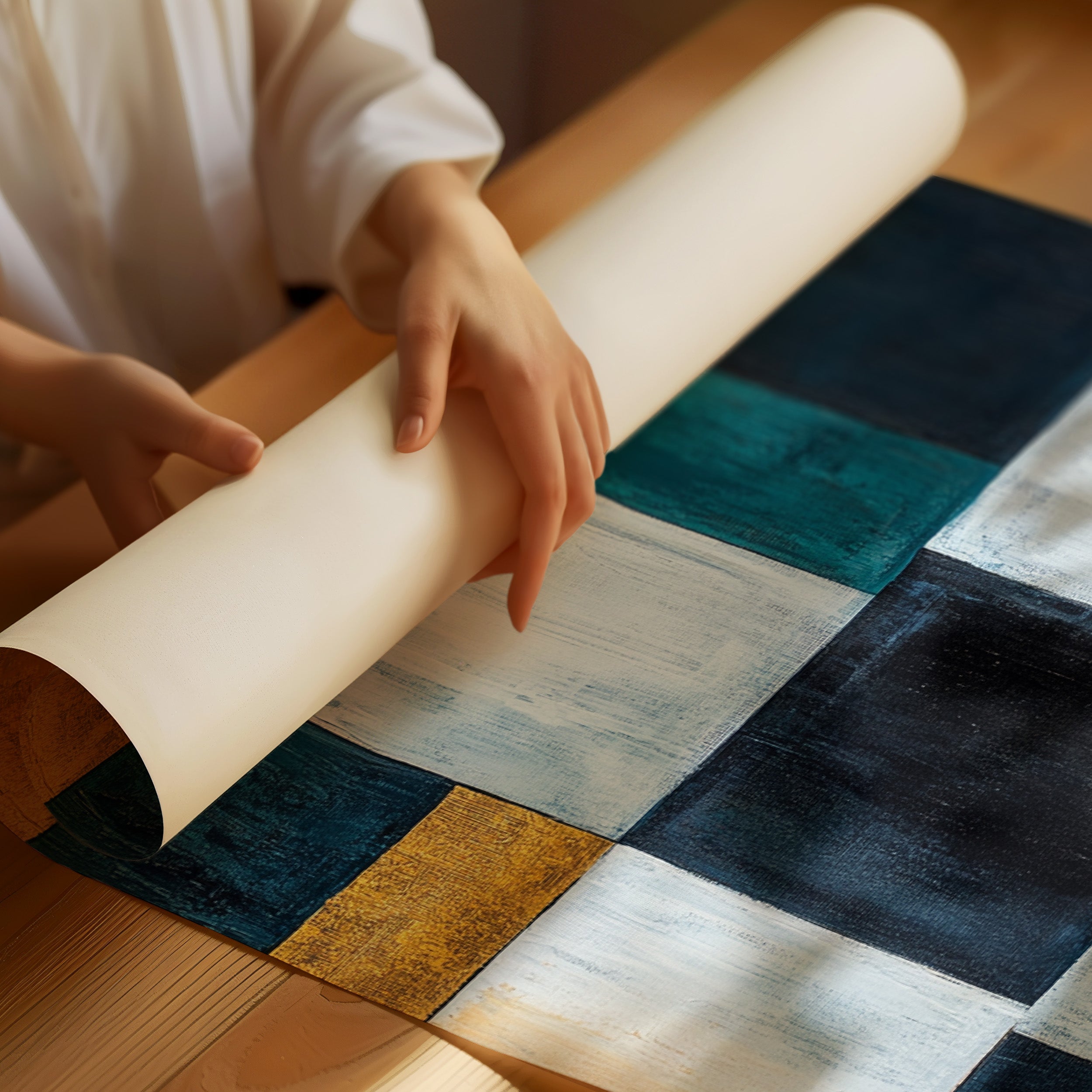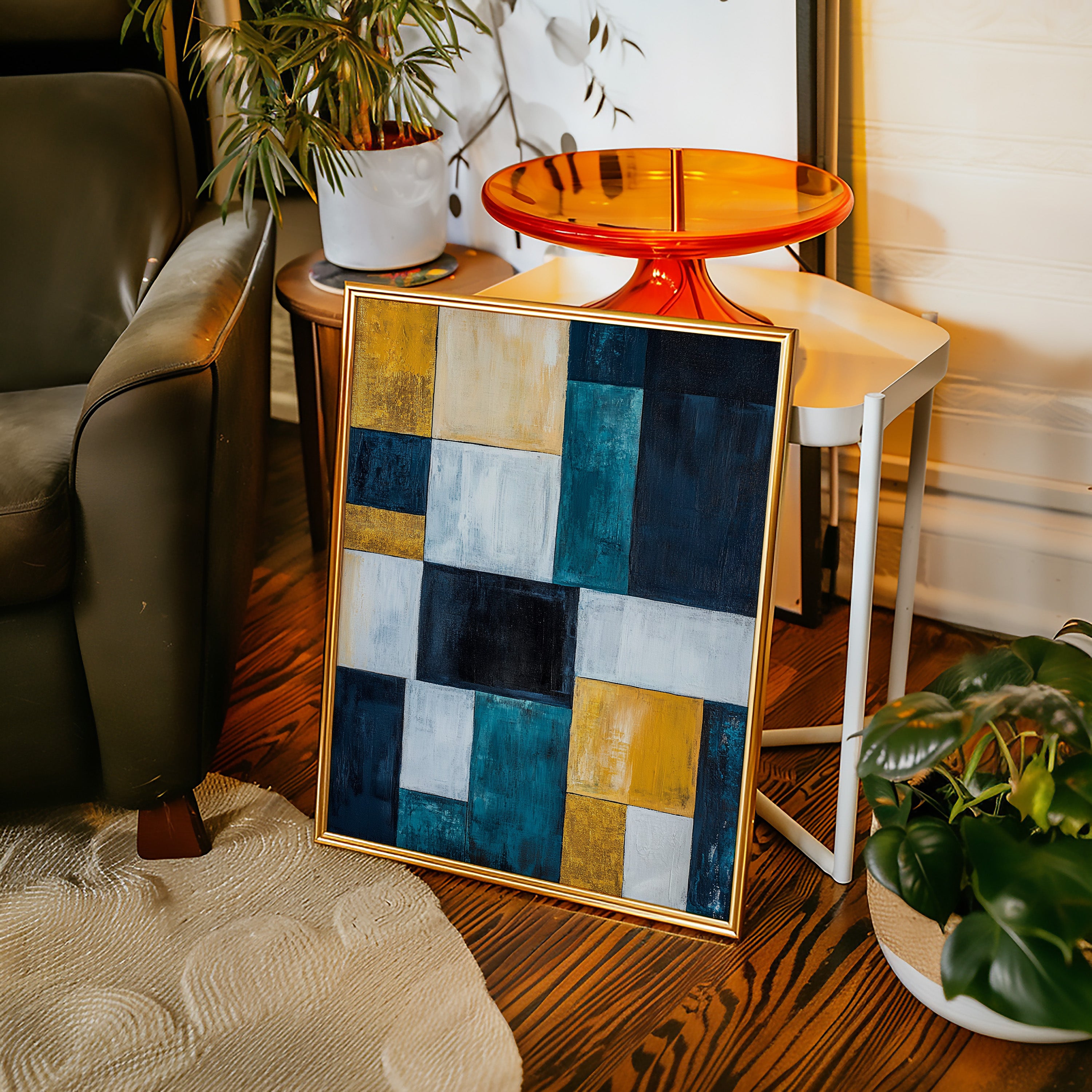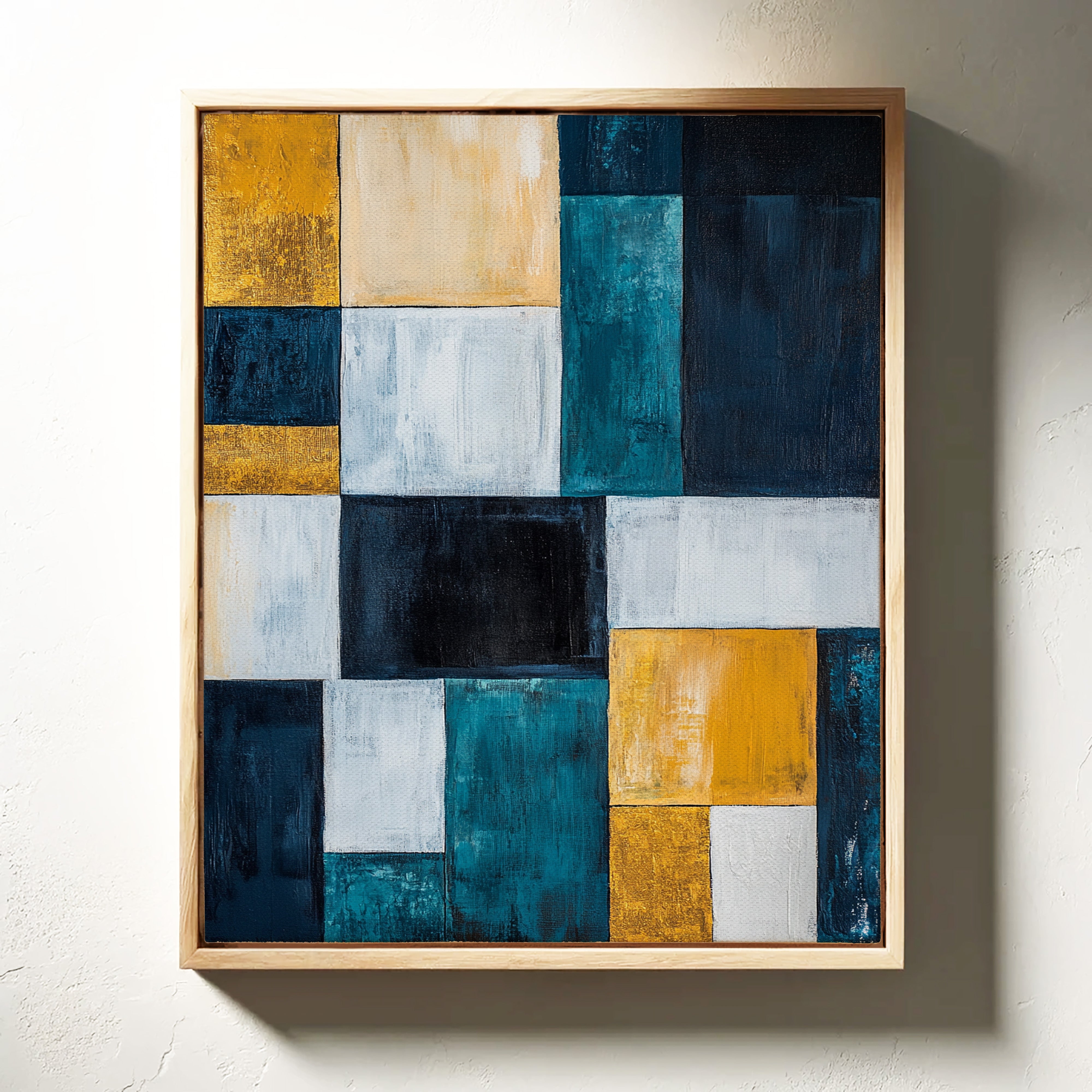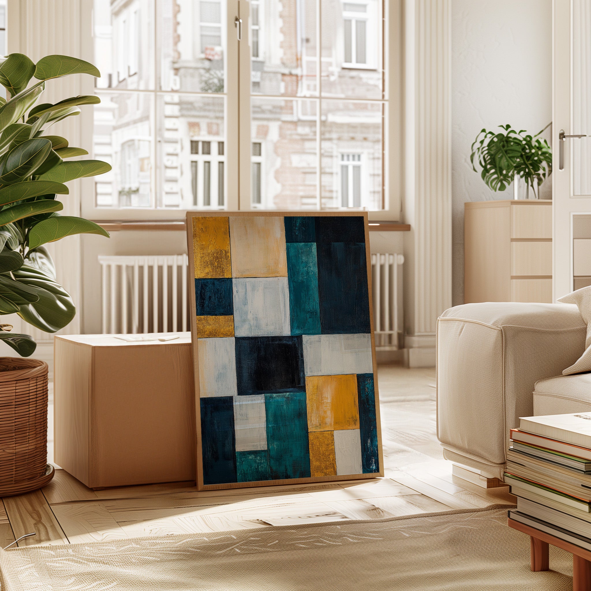 Enhance your space with this captivating modern abstract geometric canvas art, where bold navy and vibrant mustard hues interlock in a harmonious dance.