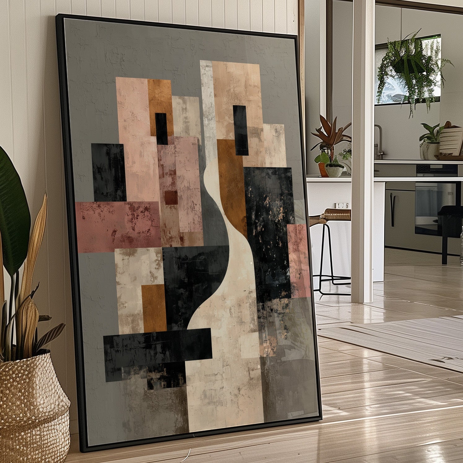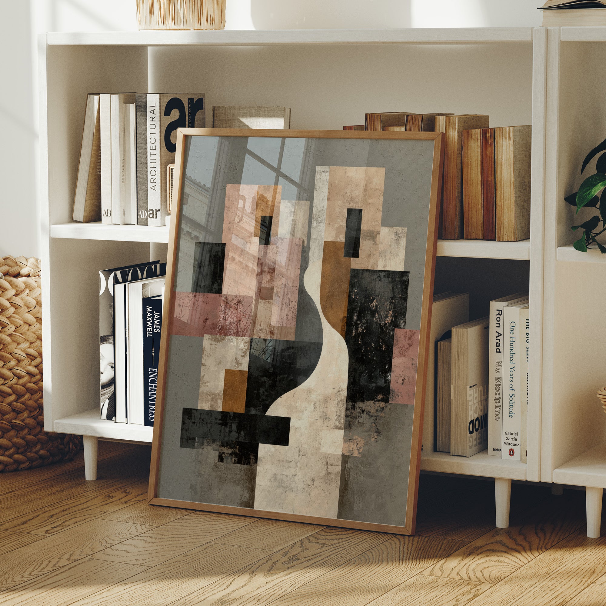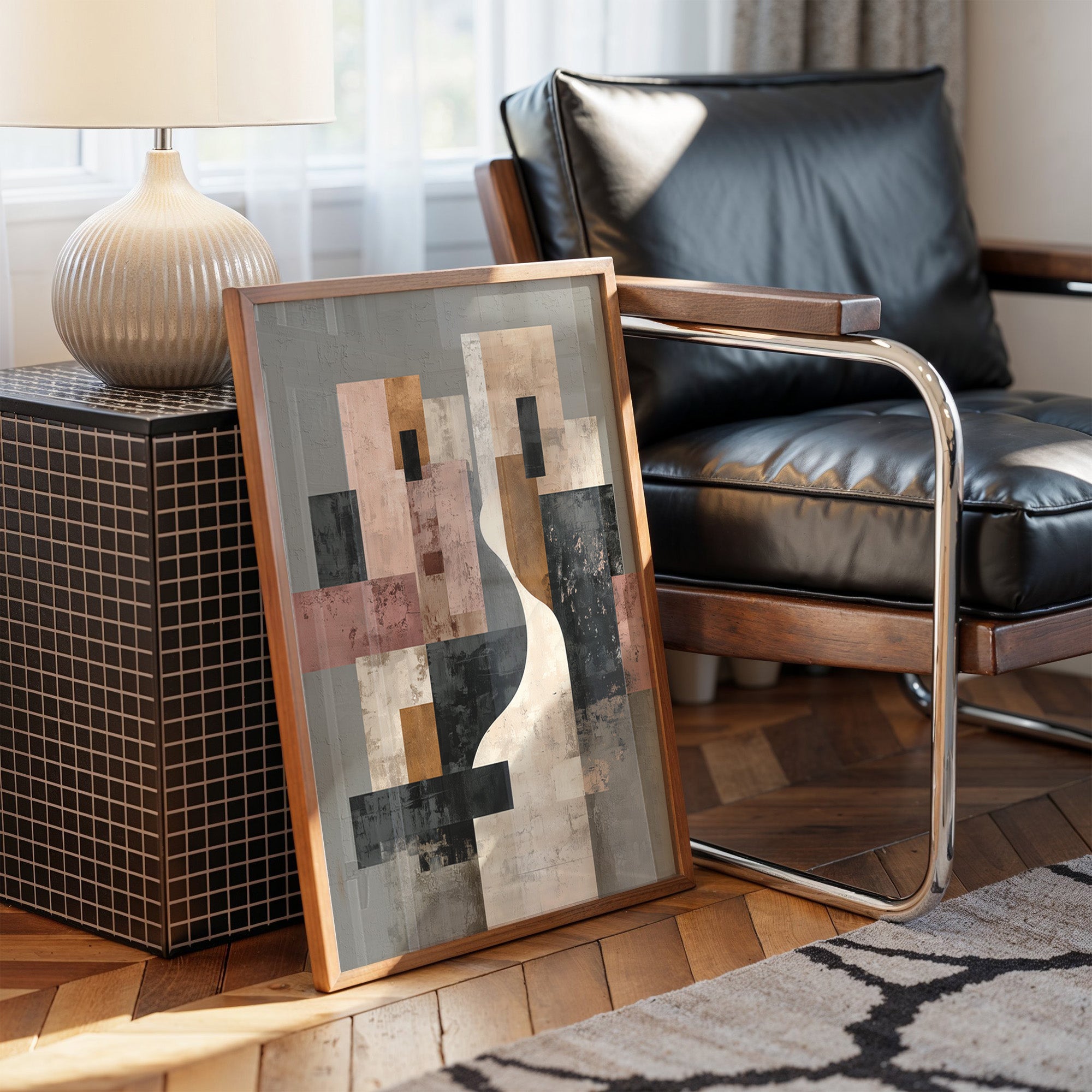 Warm morning light spills across a sophisticated living space, highlighting an abstract composition of geometric forms and muted earth tones. The artwork's organic curves weave between structured blocks of weathered grays and soft beiges, creating a harmonious dialogue with the room's mid-century modern furnishings. A leather armchair and ribbed ceramic lamp complete this scene of curated contemporary elegance. The piece would bring architectural interest and refined sophistication to a modern office, minimalist living room, or design-forward bedroom suite.