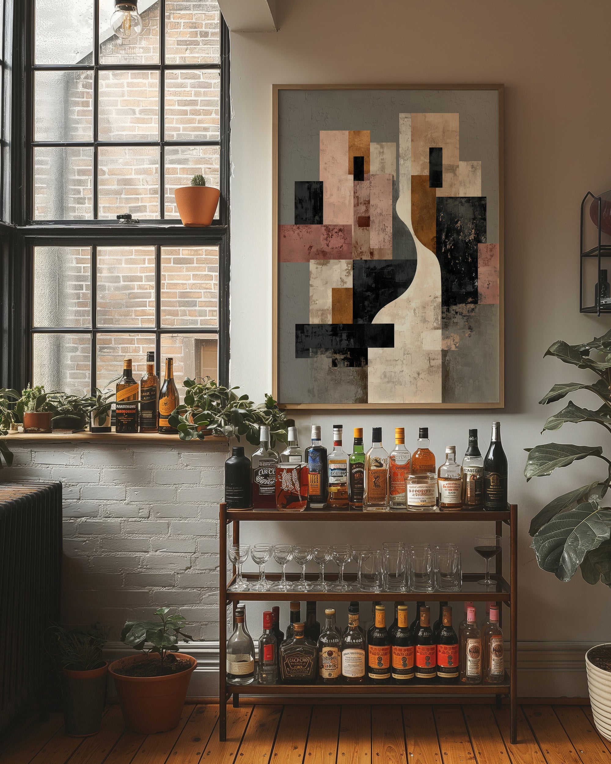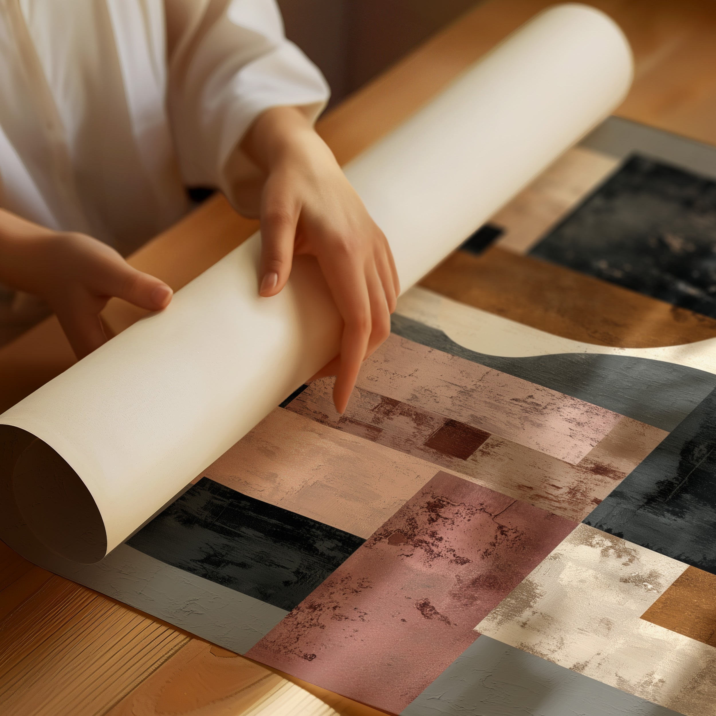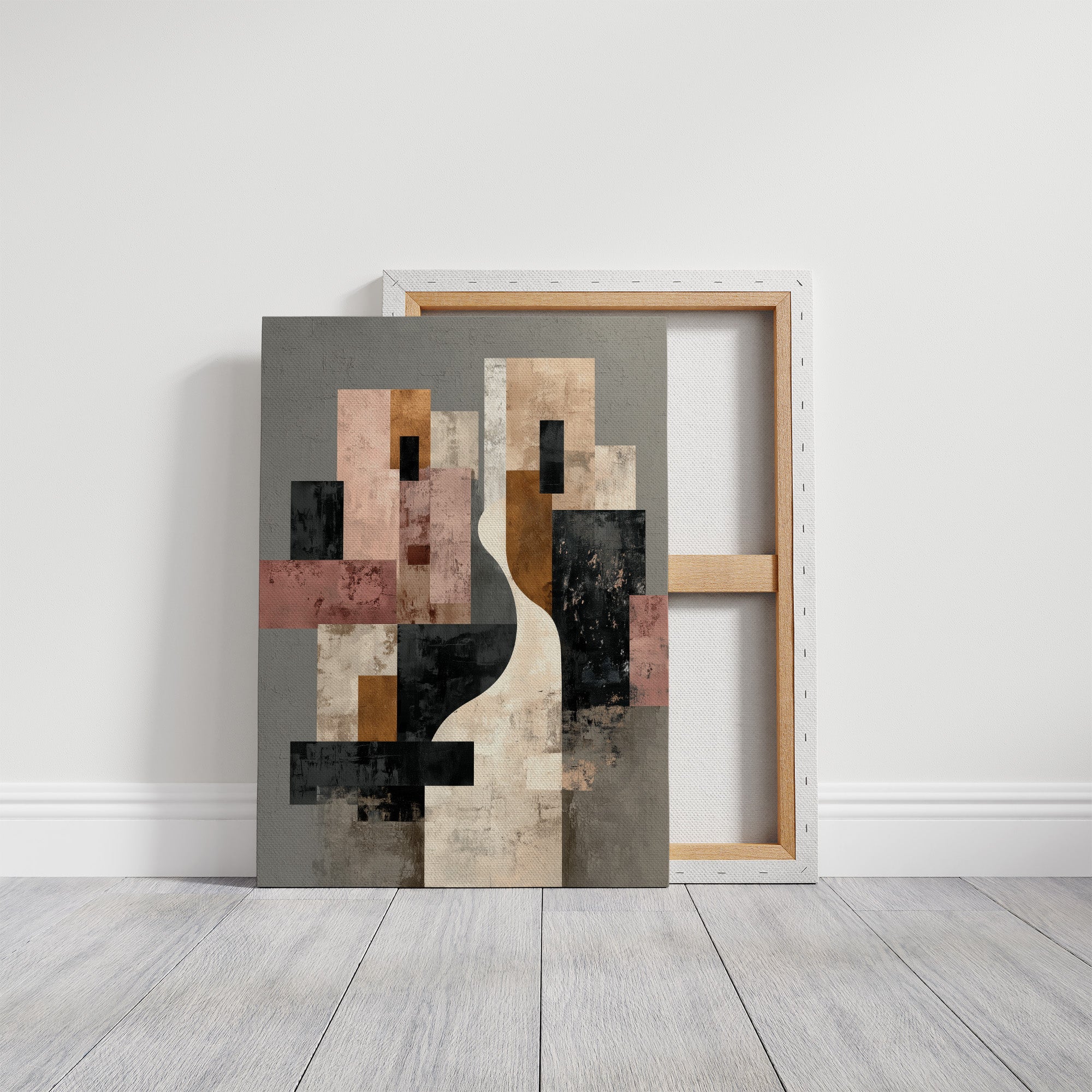 Warm morning light spills across a sophisticated living space, highlighting an abstract composition of geometric forms and muted earth tones. The artwork's organic curves weave between structured blocks of weathered grays and soft beiges, creating a harmonious dialogue with the room's mid-century modern furnishings. A leather armchair and ribbed ceramic lamp complete this scene of curated contemporary elegance. The piece would bring architectural interest and refined sophistication to a modern office, minimalist living room, or design-forward bedroom suite.