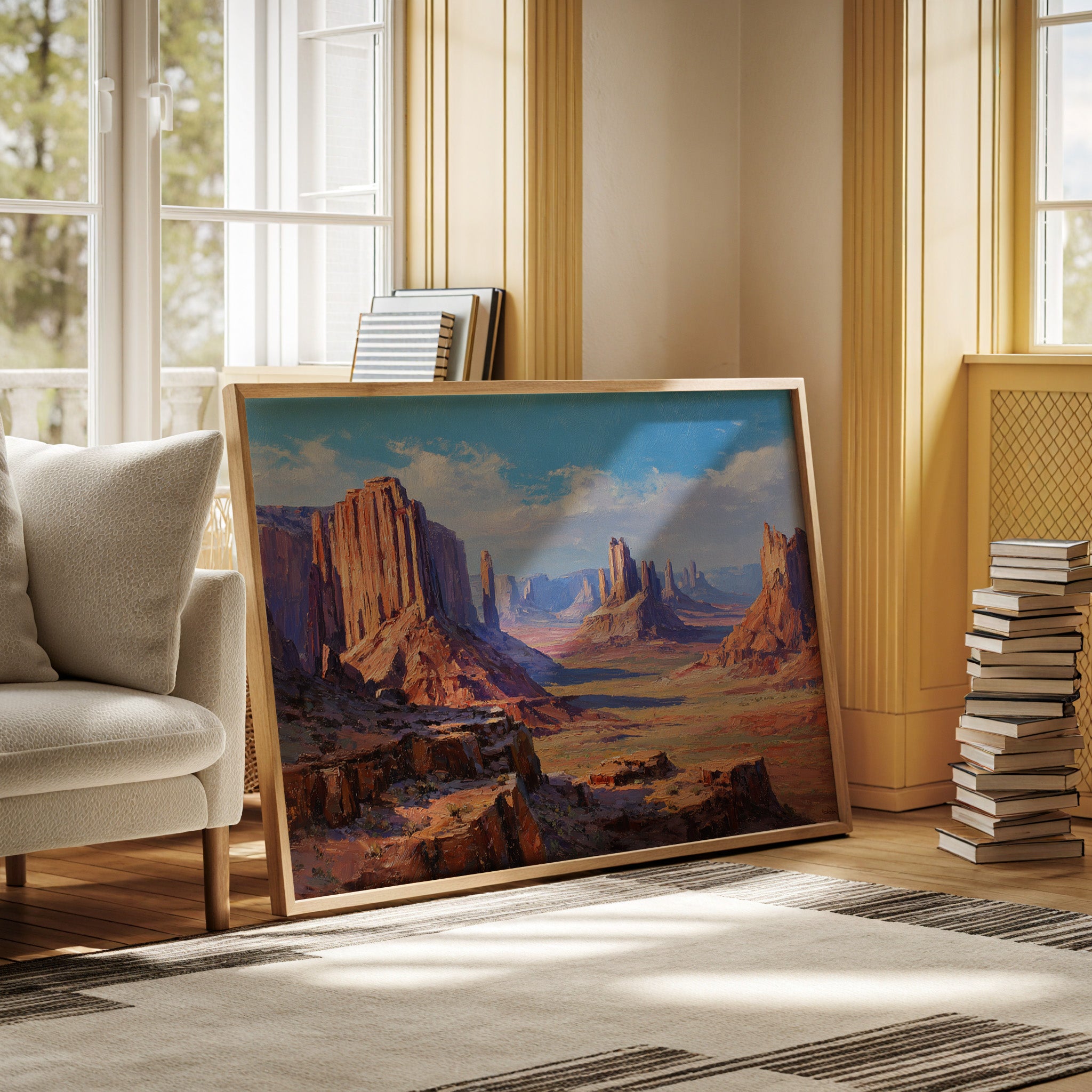 Towering sandstone sentinels catch the golden hour light, their faces ablaze with warm oranges and deep purples. The vast expanse of Monument Valley unfolds like a timeless stage, where ancient rock formations pierce the azure sky with determined grace. The landscape tells a story of geological poetry - massive buttes and spires rising from the desert floor, their layered walls holding millennia of wind-carved secrets. Rich shadows pool in the valleys between these natural skyscrapers, creating a rhythm of light and darkness across the rugged terrain. This piece would bring dramatic southwestern energy to a great room or office space, its epic scale inspiring big dreams and bold ventures.