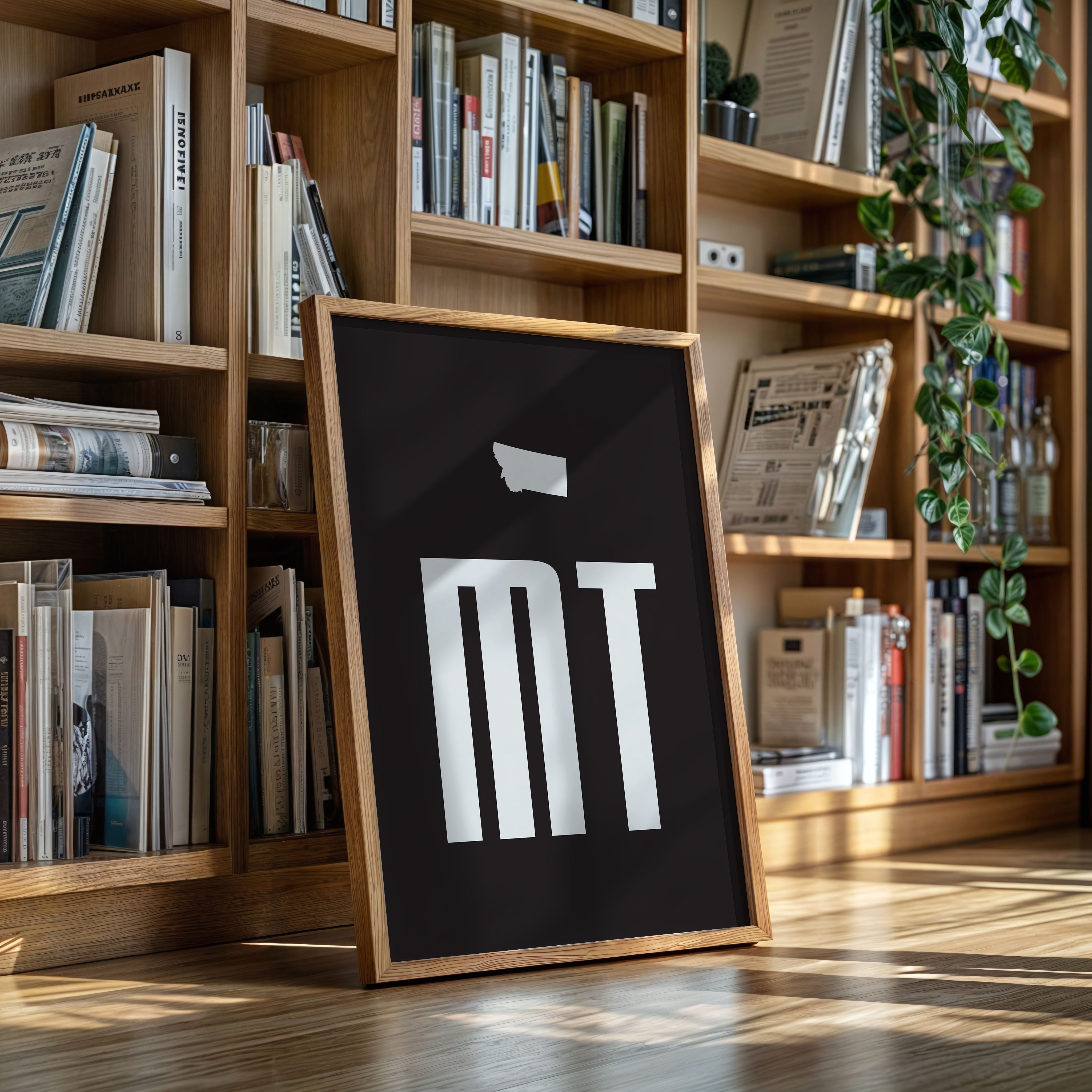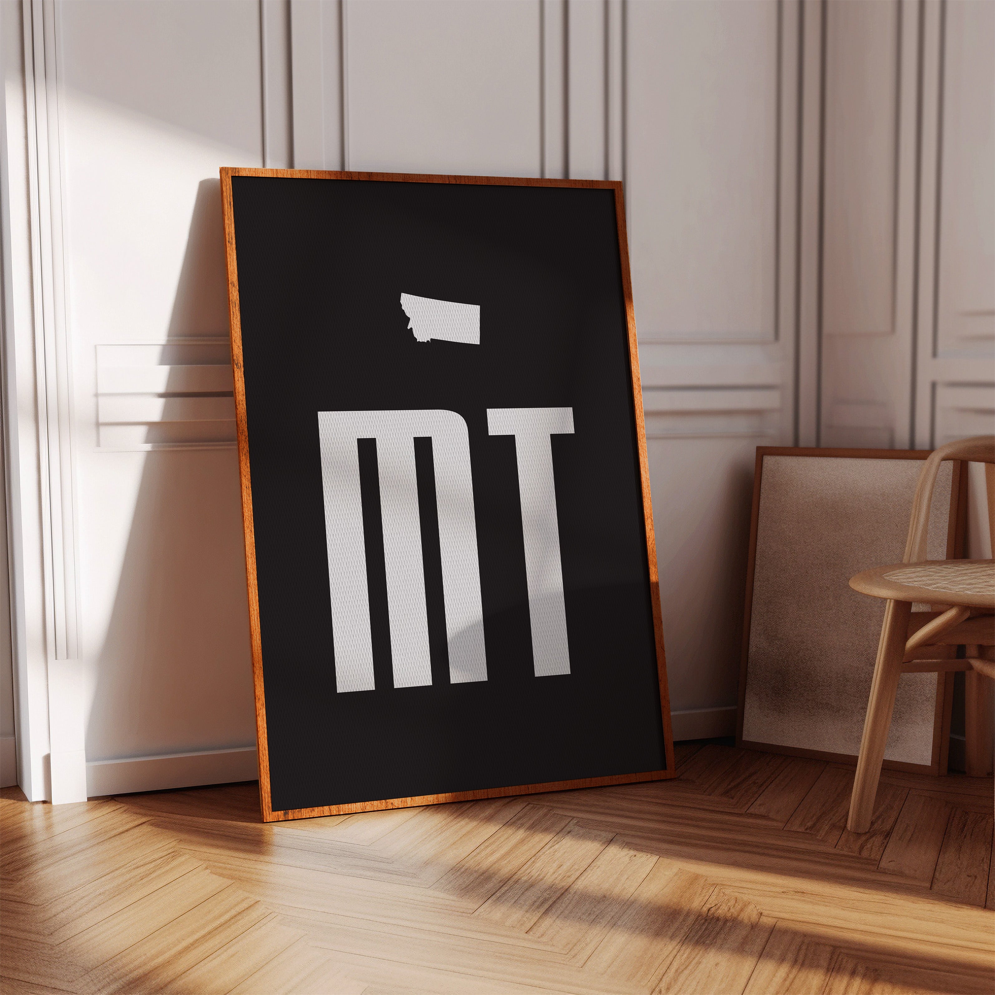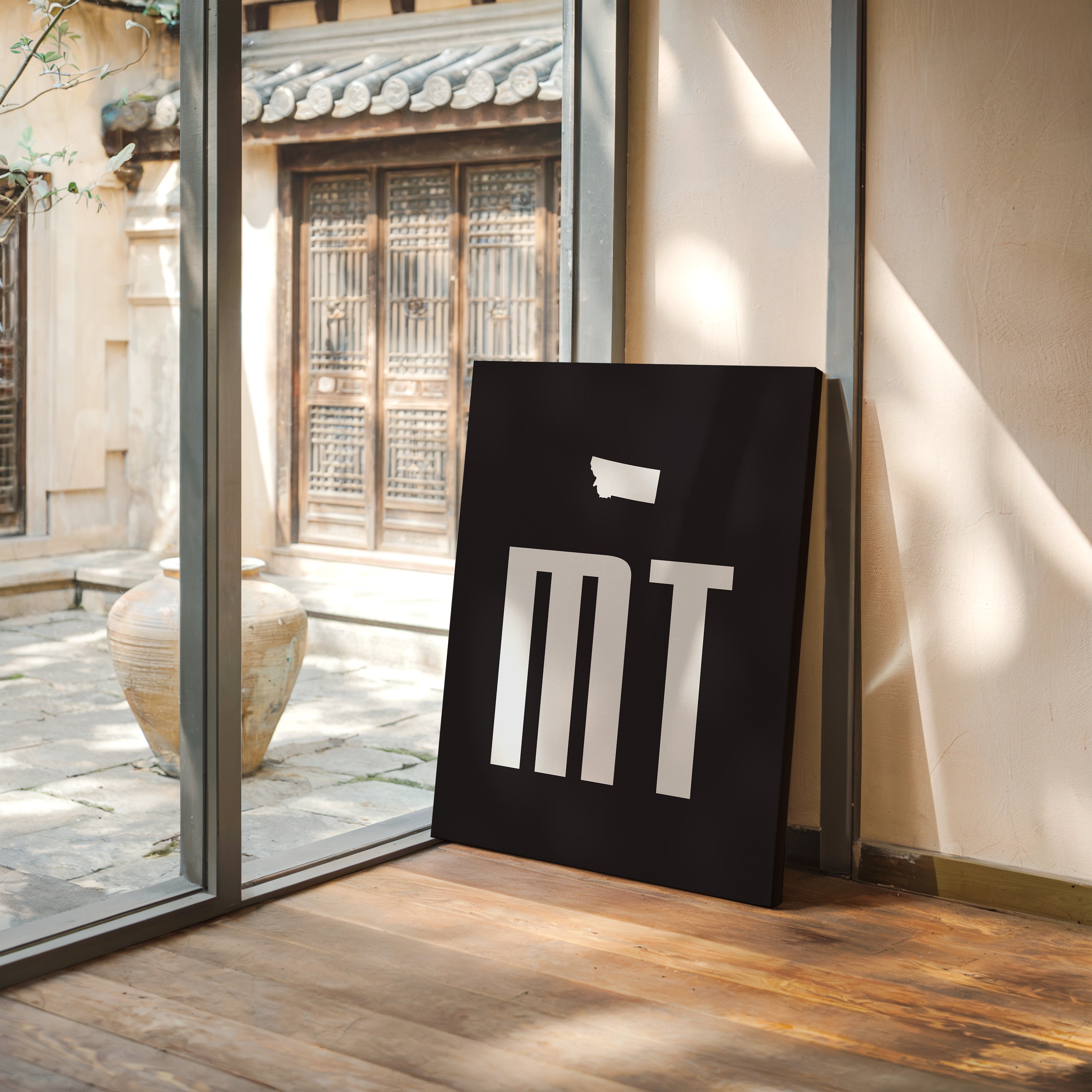 Clean lines cut through darkness, creating a striking monochromatic statement. The bold ""MT"" typography stands as a modern monument, with Montana's distinctive state shape floating above like a crown. The minimalist design speaks volumes through negative space, letting the stark contrast between black and white tell a story of strength and simplicity. This contemporary piece commands attention while maintaining elegant restraint. Perfect for modern office spaces, creative studios, or any room seeking to make a bold geometric statement while honoring Big Sky Country.