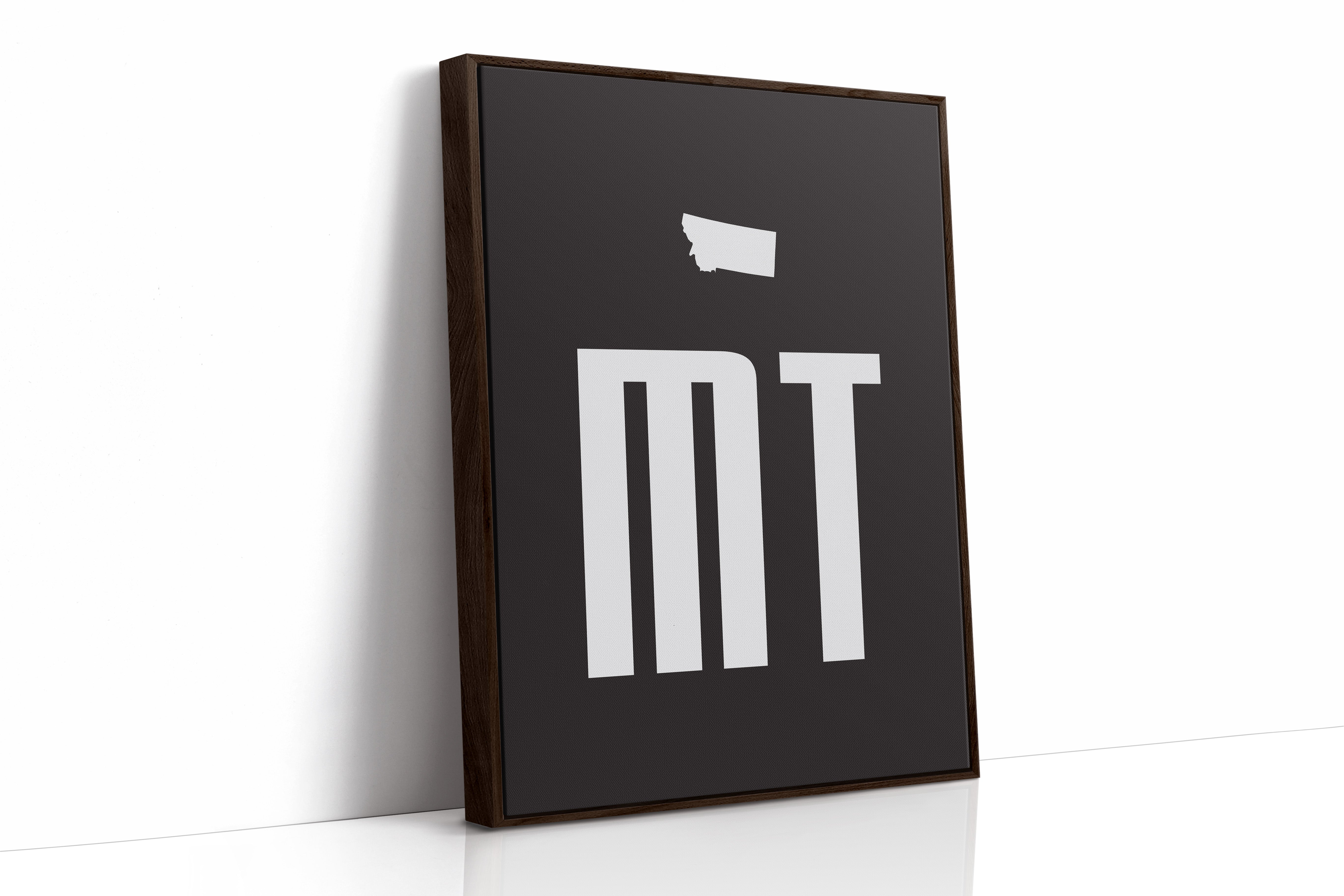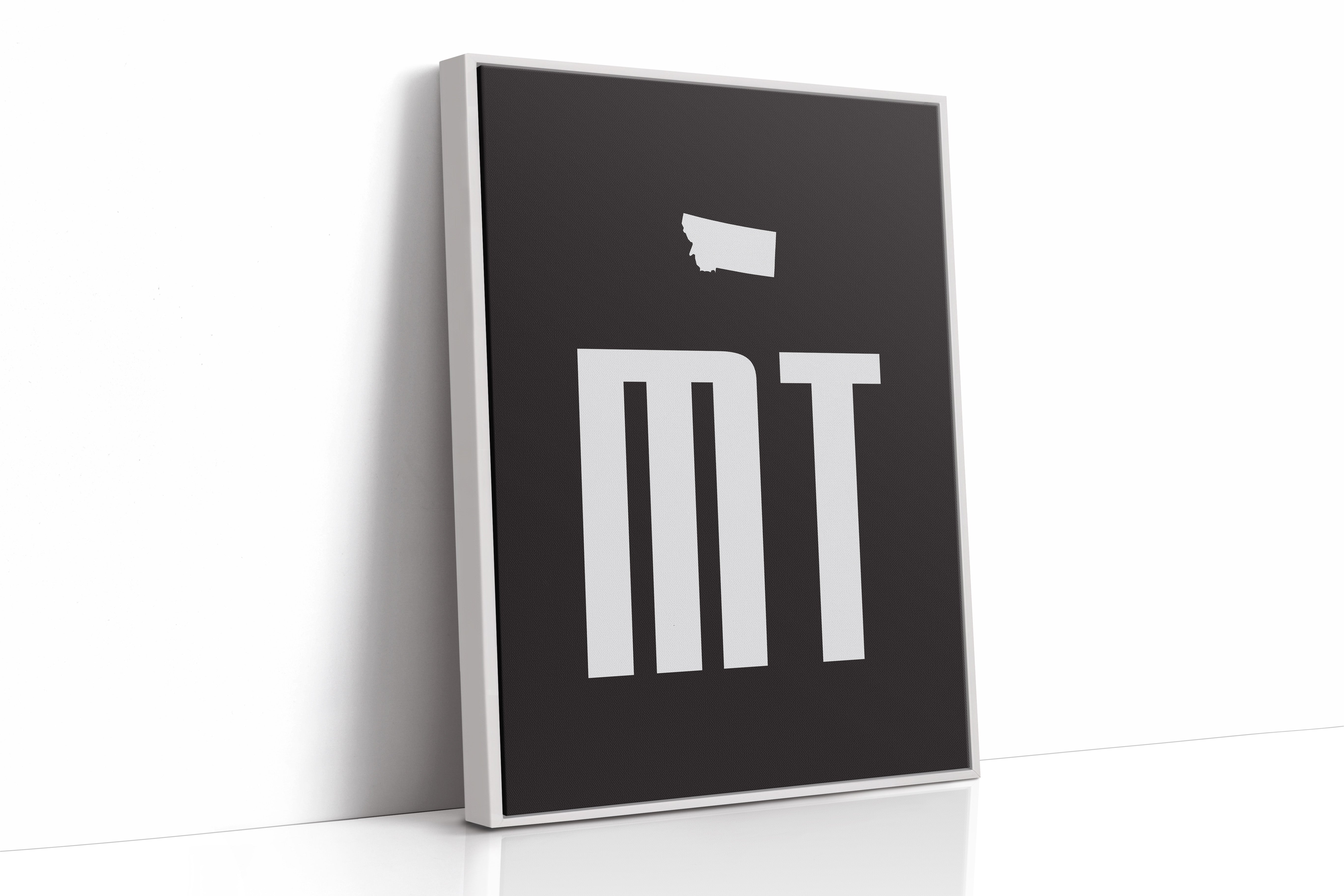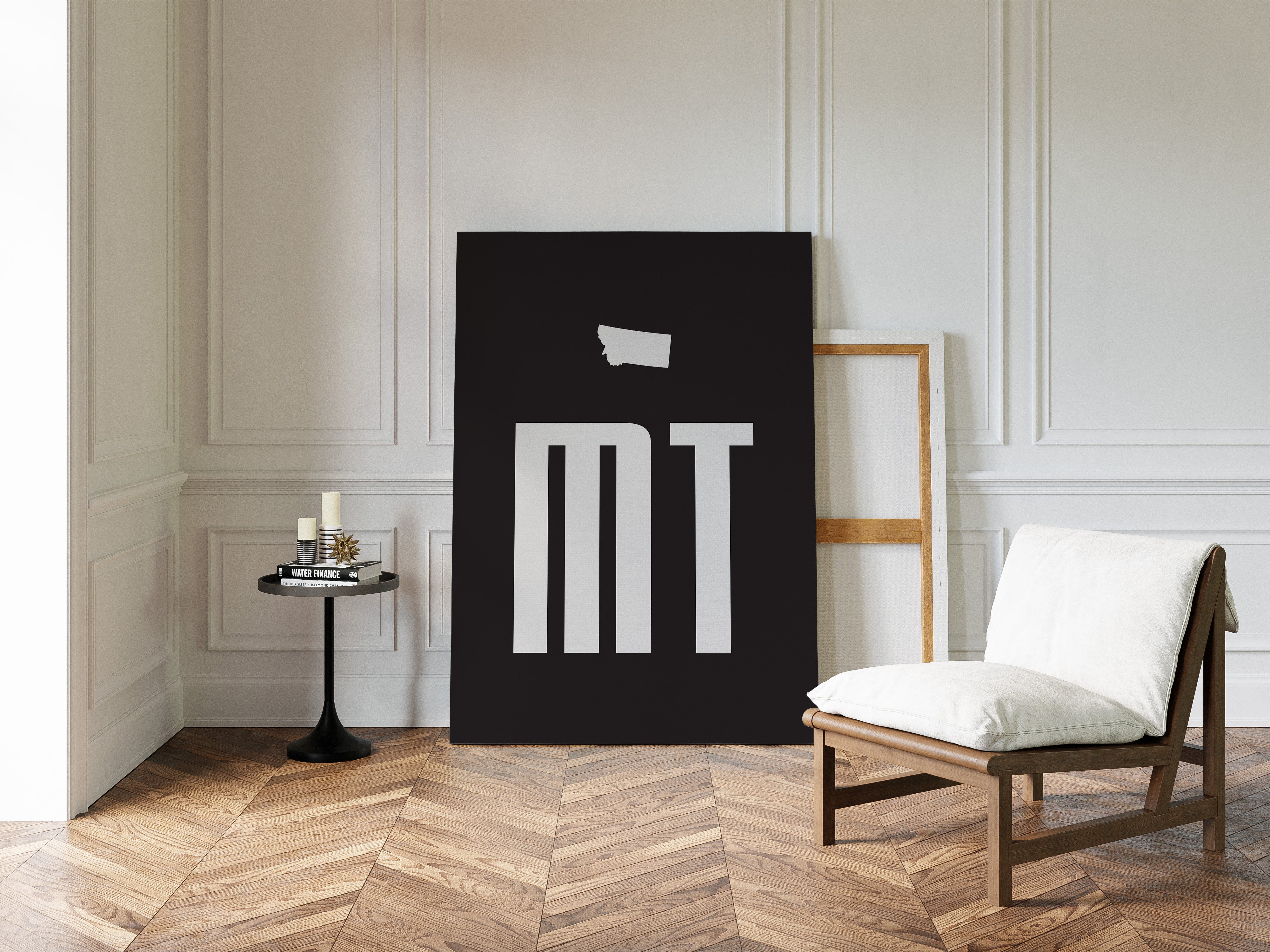 Clean lines cut through darkness, creating a striking monochromatic statement. The bold ""MT"" typography stands as a modern monument, with Montana's distinctive state shape floating above like a crown. The minimalist design speaks volumes through negative space, letting the stark contrast between black and white tell a story of strength and simplicity. This contemporary piece commands attention while maintaining elegant restraint. Perfect for modern office spaces, creative studios, or any room seeking to make a bold geometric statement while honoring Big Sky Country.
