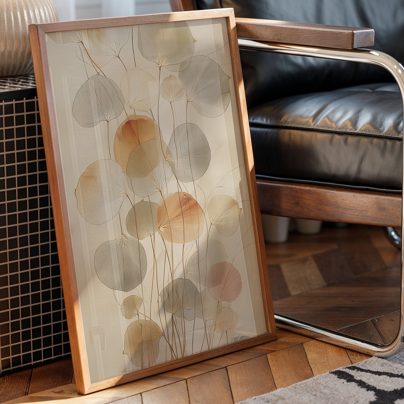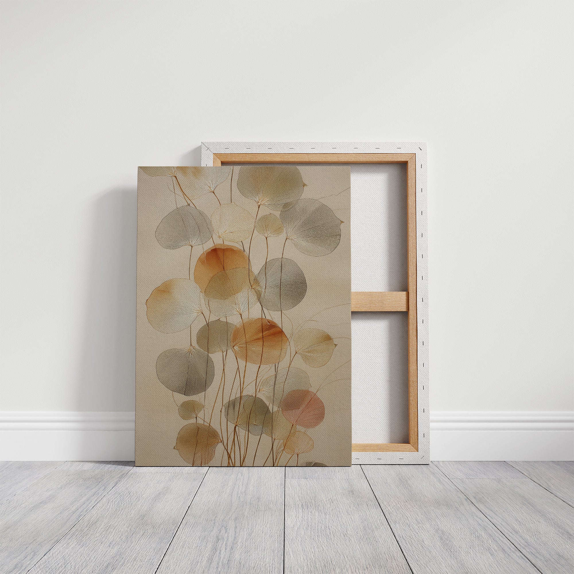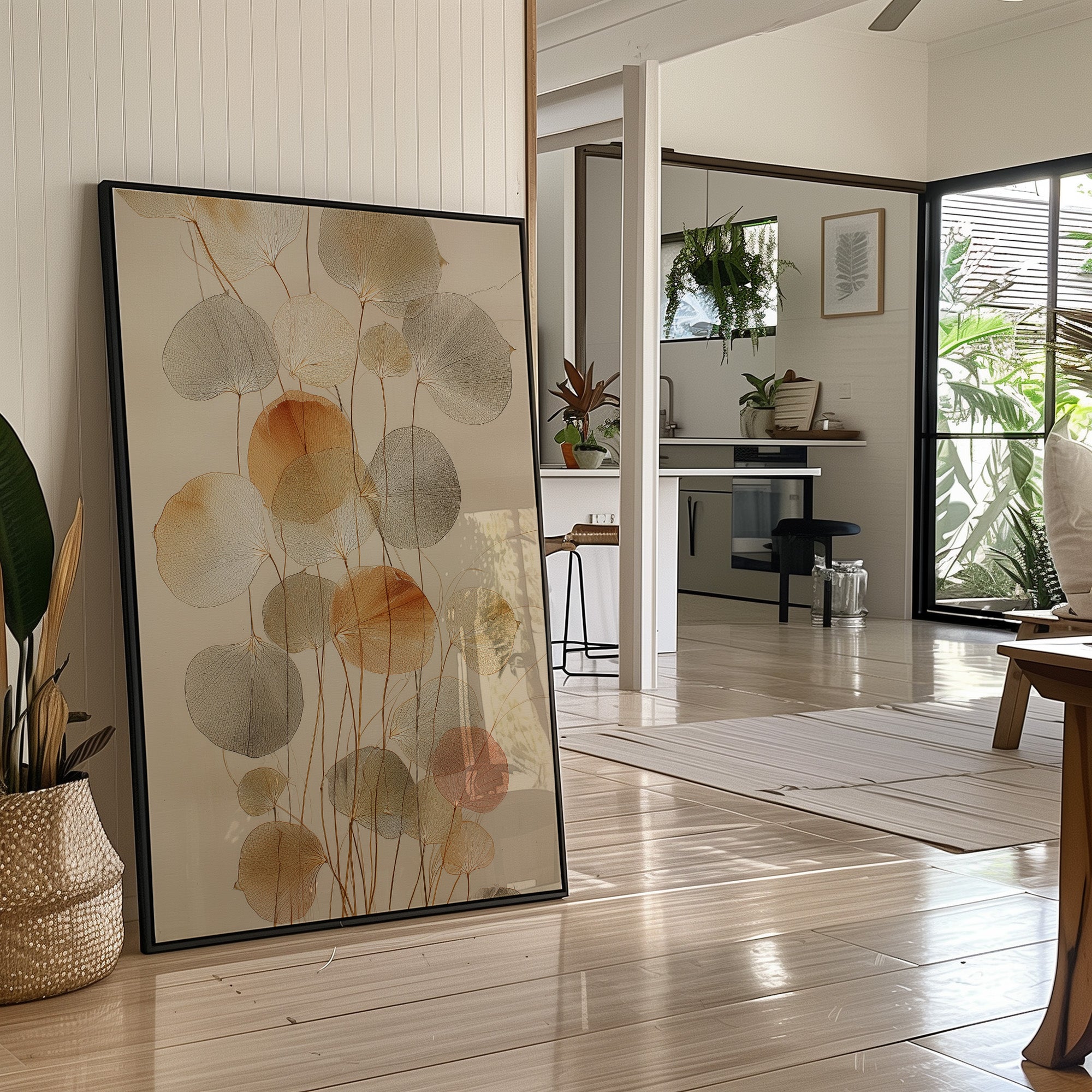 Delicate circles float like lunar blooms against a cream canvas, their translucent forms catching morning light. Gray and amber petals create a gentle rhythm, each one suspended on whisper-thin stems that reach skyward with graceful intention. The composition marries organic movement with minimalist restraint, creating a meditative dance of shape and shadow. This serene piece finds its perfect home in a reading nook or meditation space, where soft natural light can play across its subtle variations throughout the day.