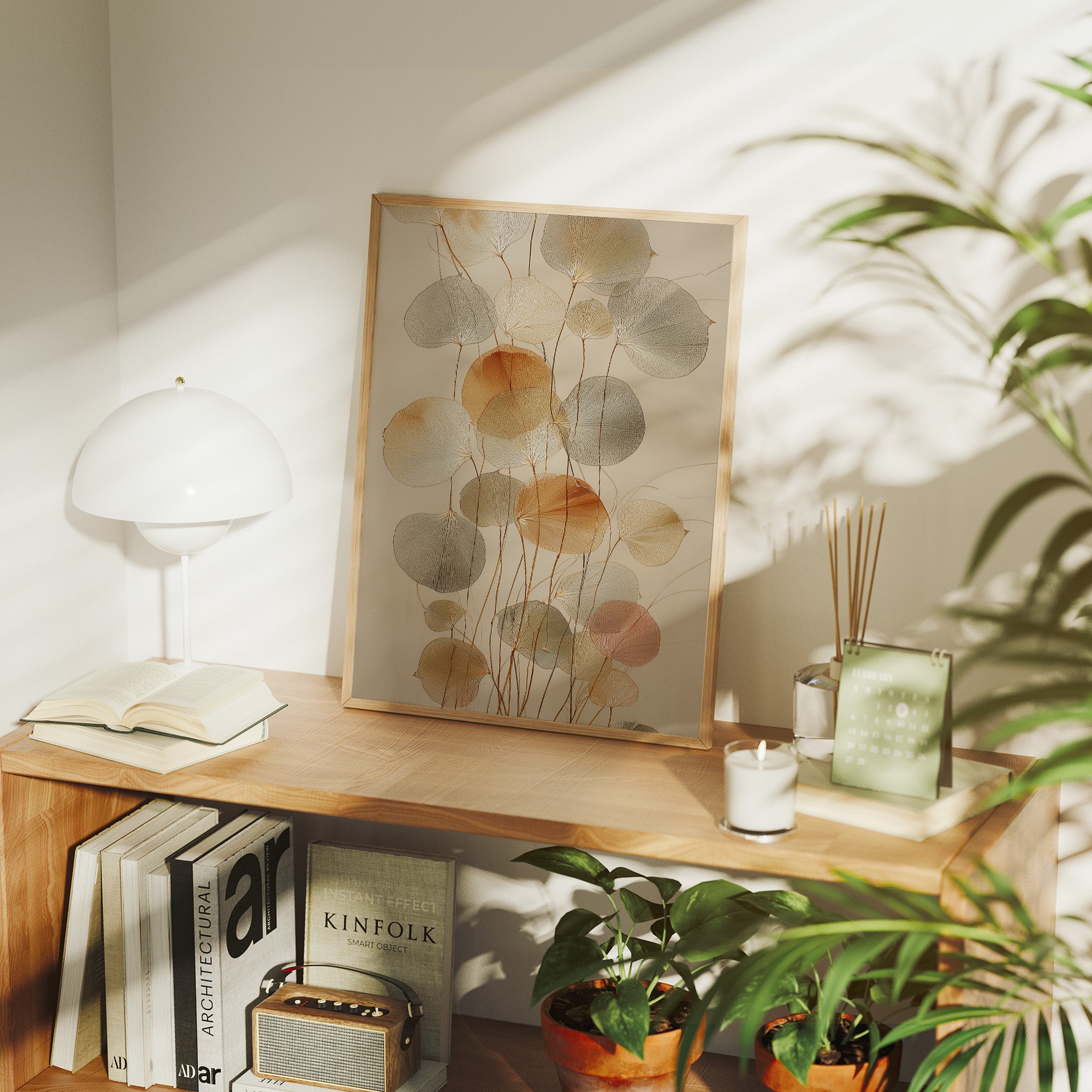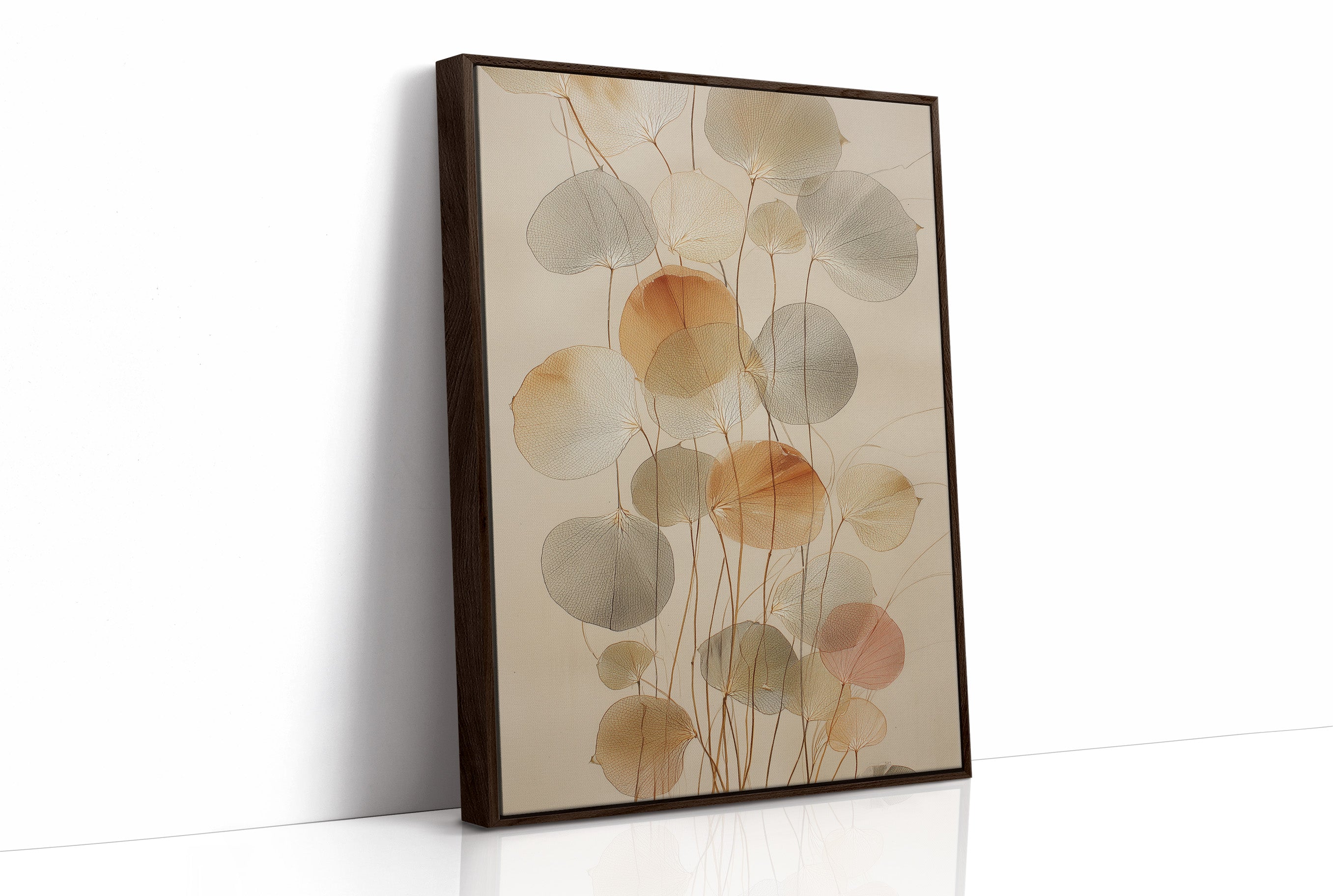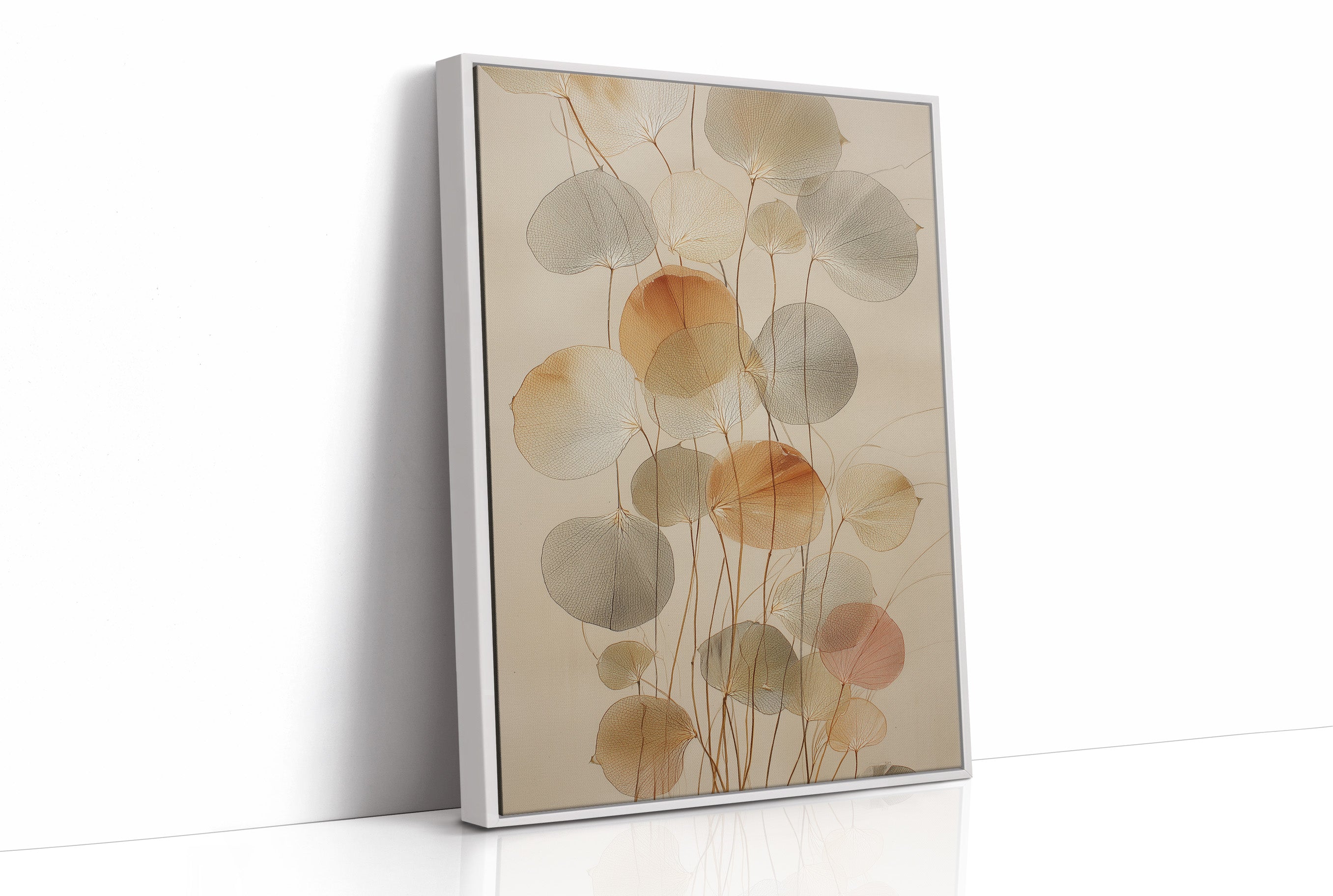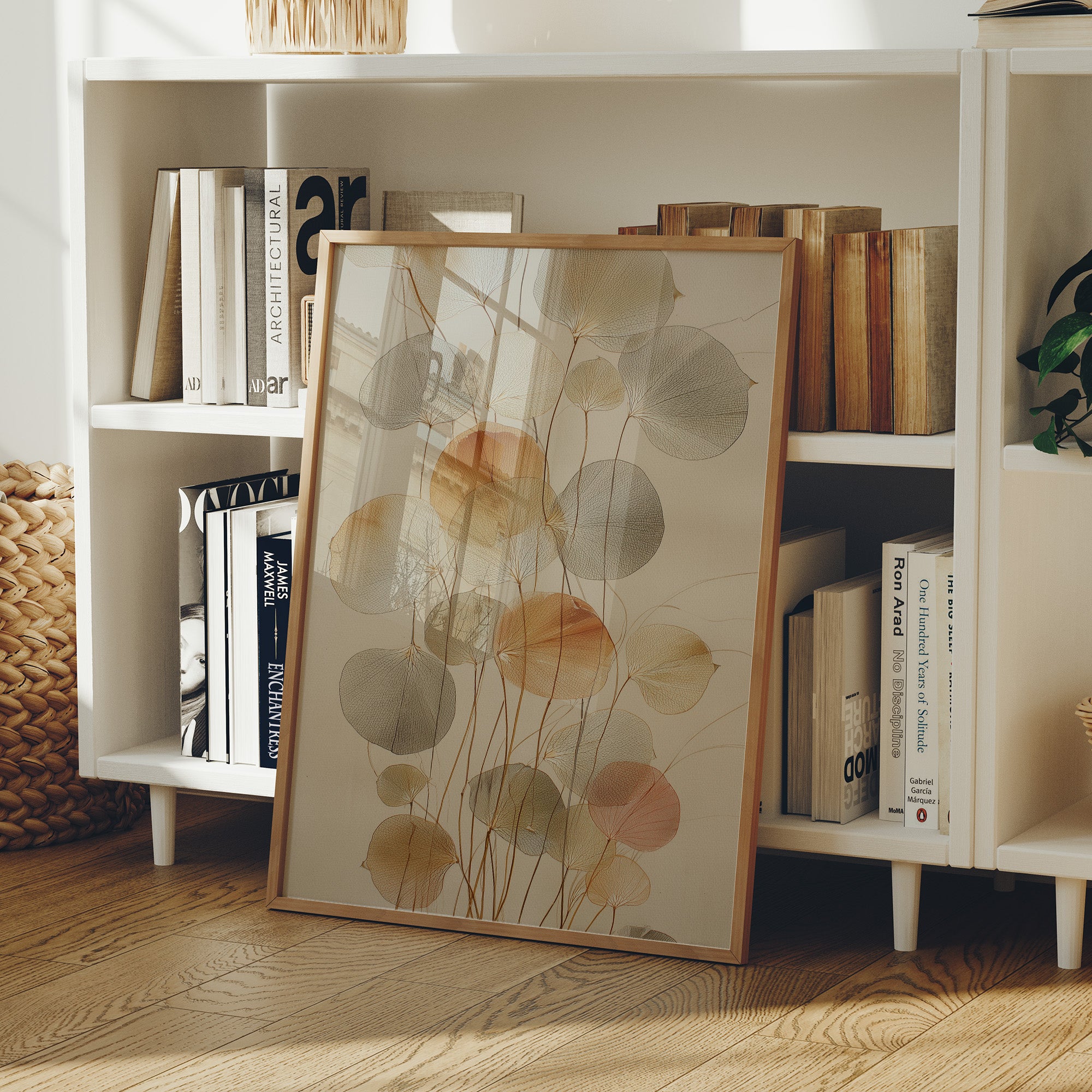 Delicate circles float like lunar blooms against a cream canvas, their translucent forms catching morning light. Gray and amber petals create a gentle rhythm, each one suspended on whisper-thin stems that reach skyward with graceful intention. The composition marries organic movement with minimalist restraint, creating a meditative dance of shape and shadow. This serene piece finds its perfect home in a reading nook or meditation space, where soft natural light can play across its subtle variations throughout the day.