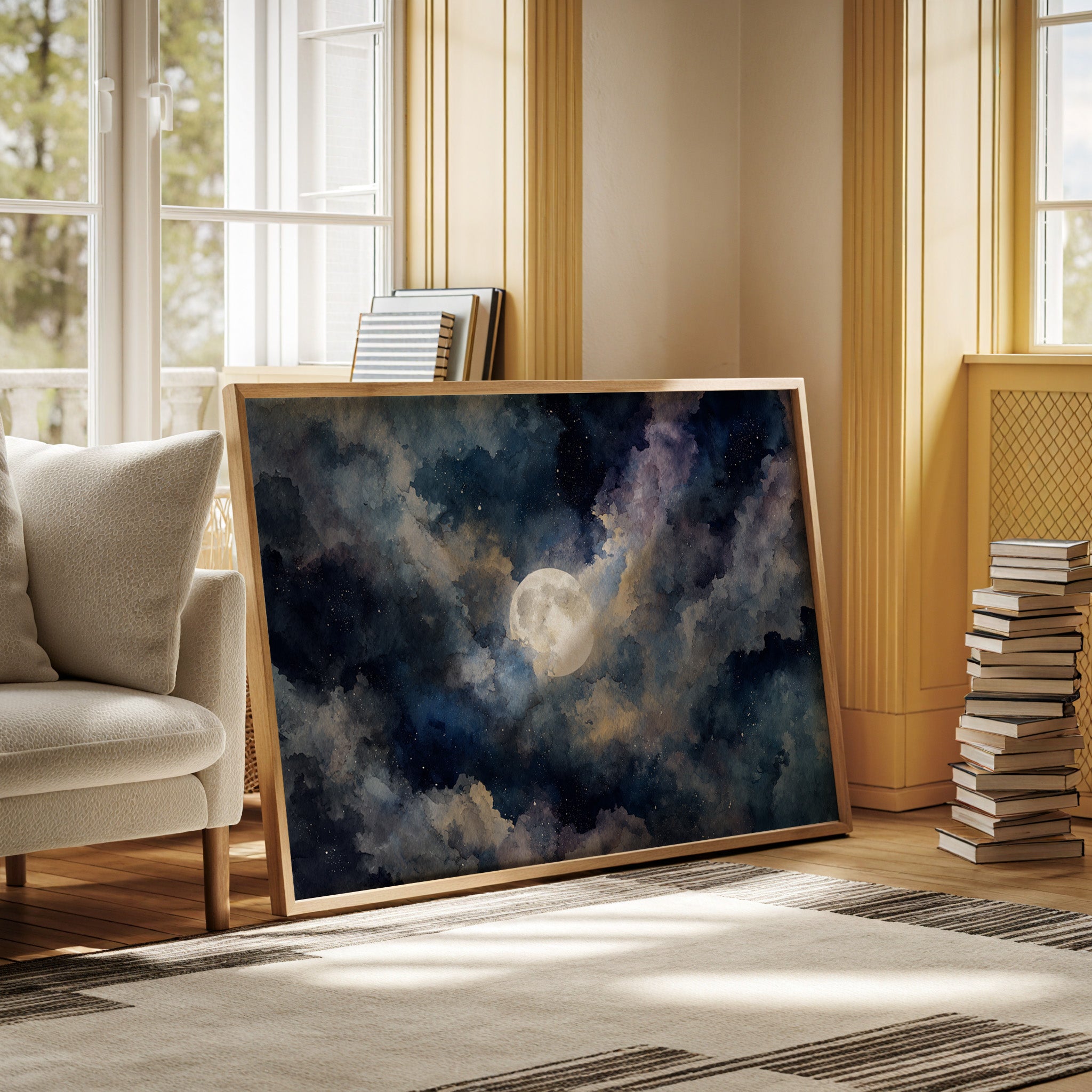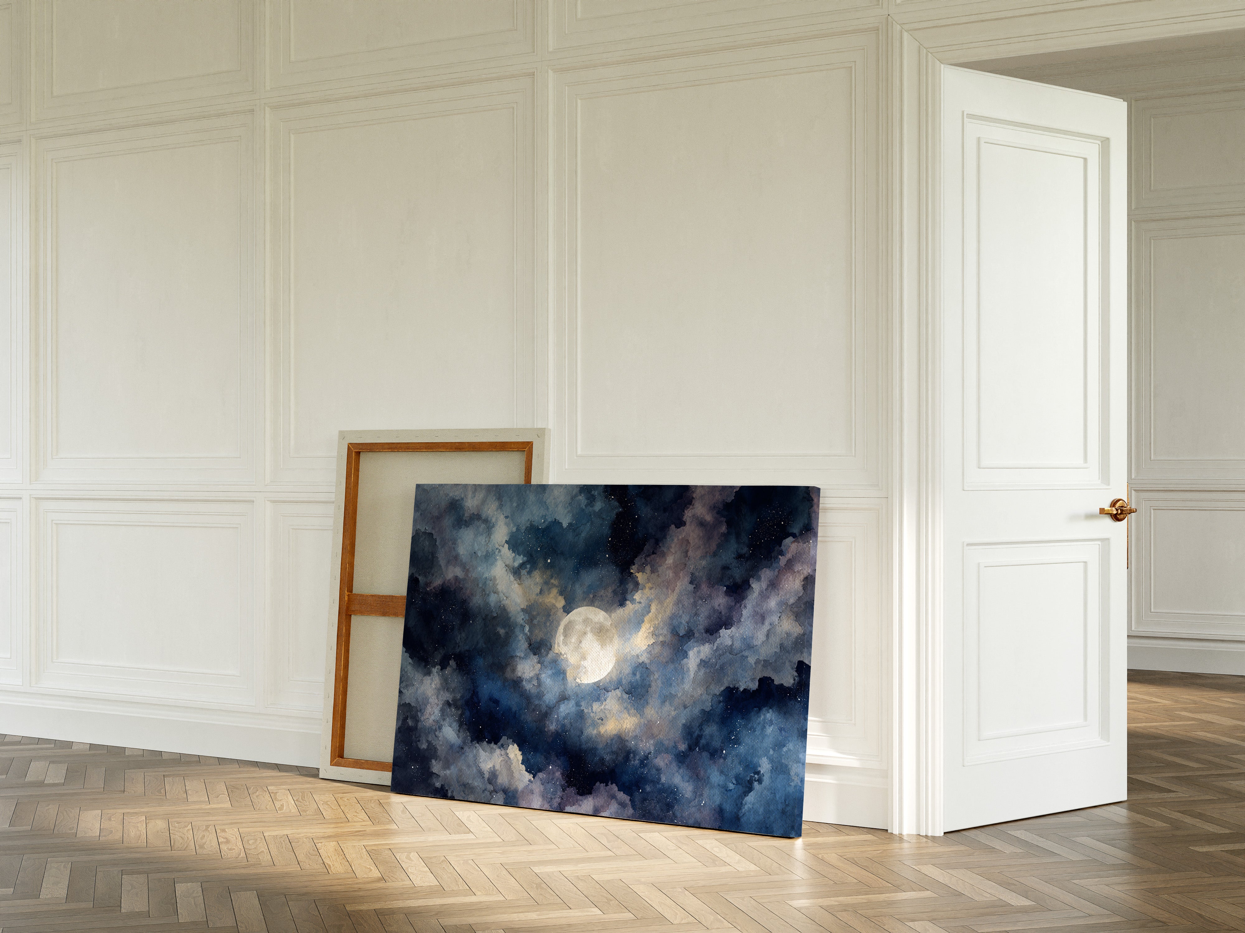 A luminous full moon emerges from behind billowing clouds, casting an ethereal glow across a turbulent night sky. Watercolor-like textures blend deep navy blues with touches of dusty rose and golden light, creating a dramatic celestial scene. The interplay of light and shadow brings depth to the clouded atmosphere, while scattered stars peek through breaks in the coverage. Perfect for a master bedroom or meditation space where its dreamy quality can inspire peaceful contemplation and rest.
