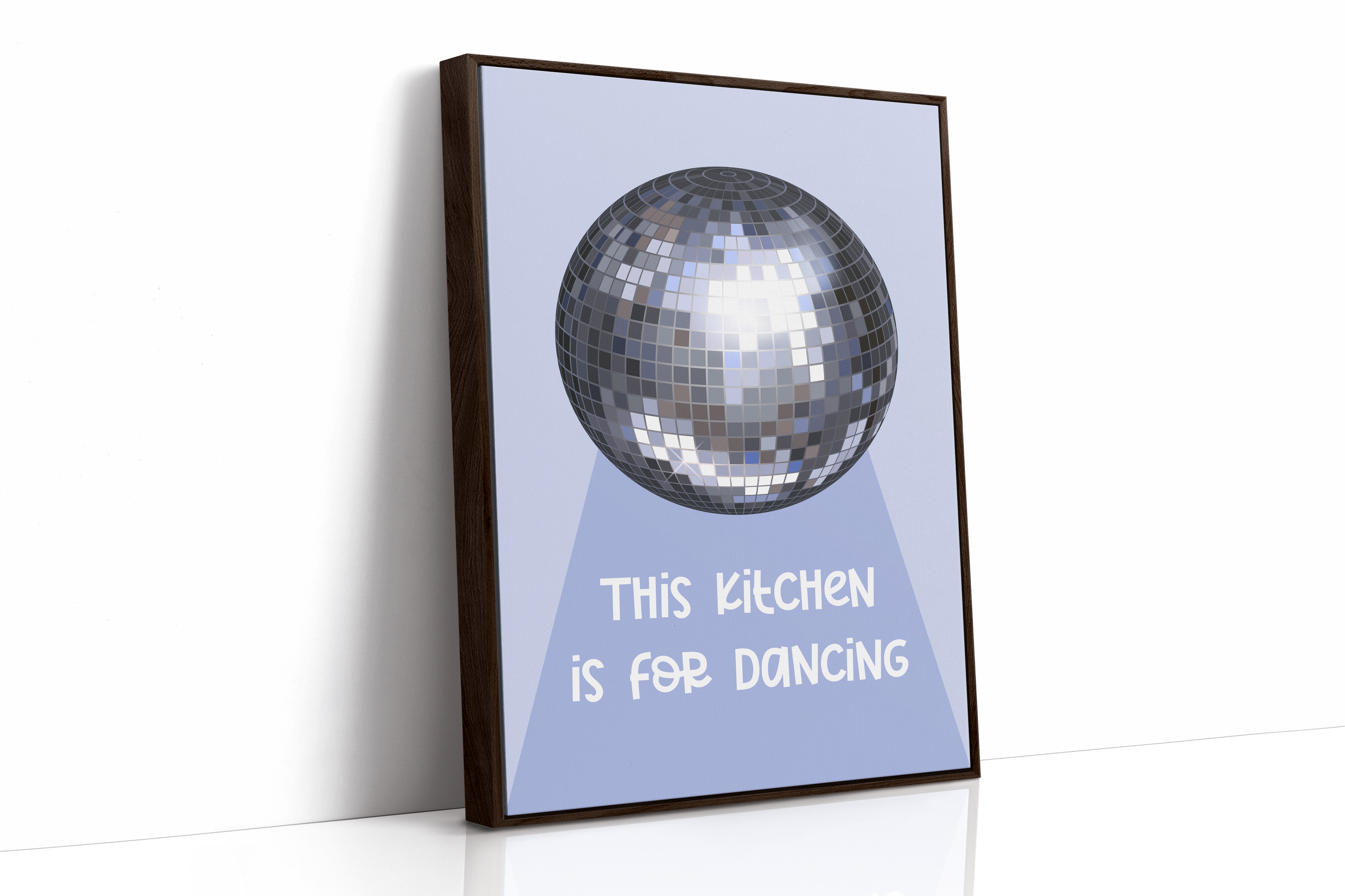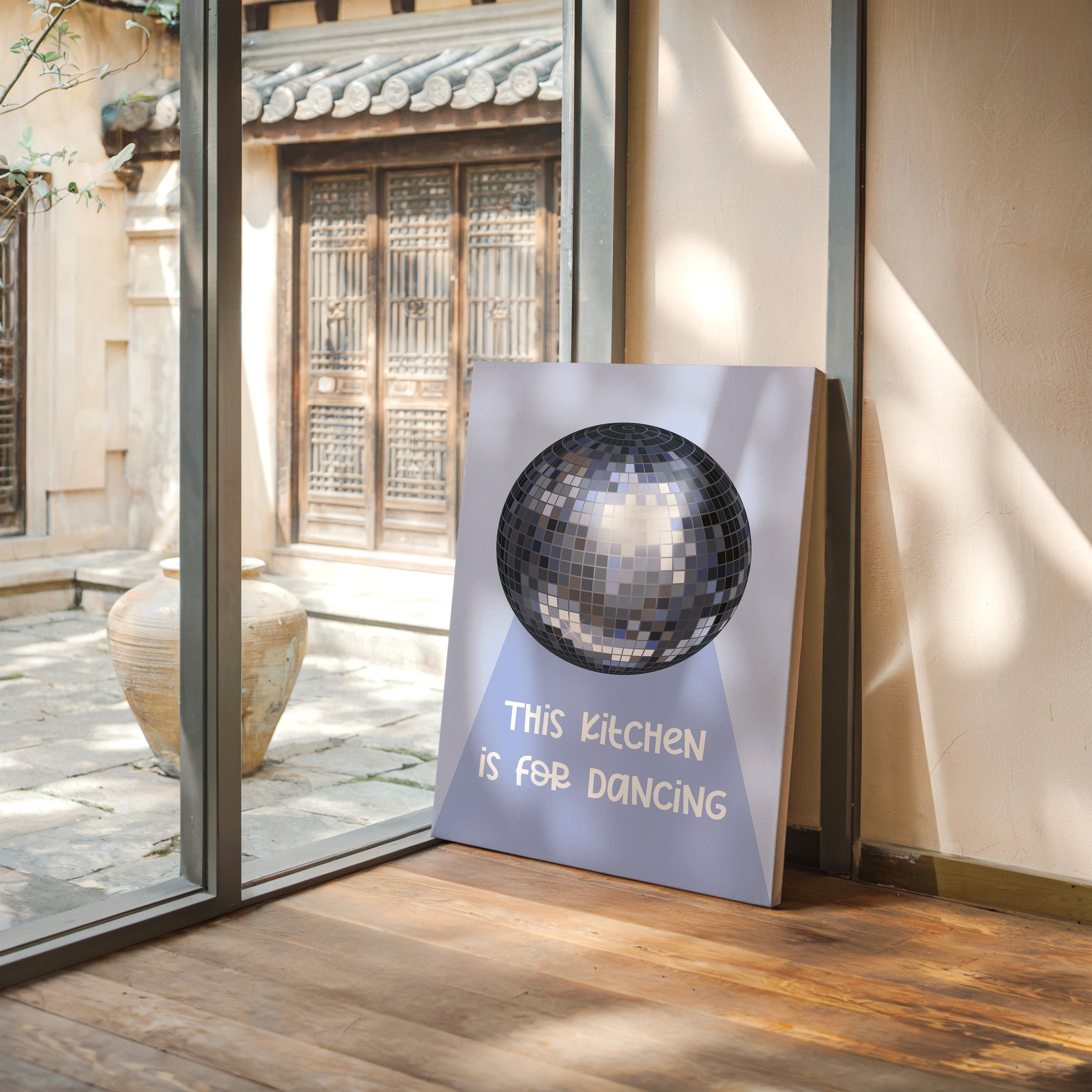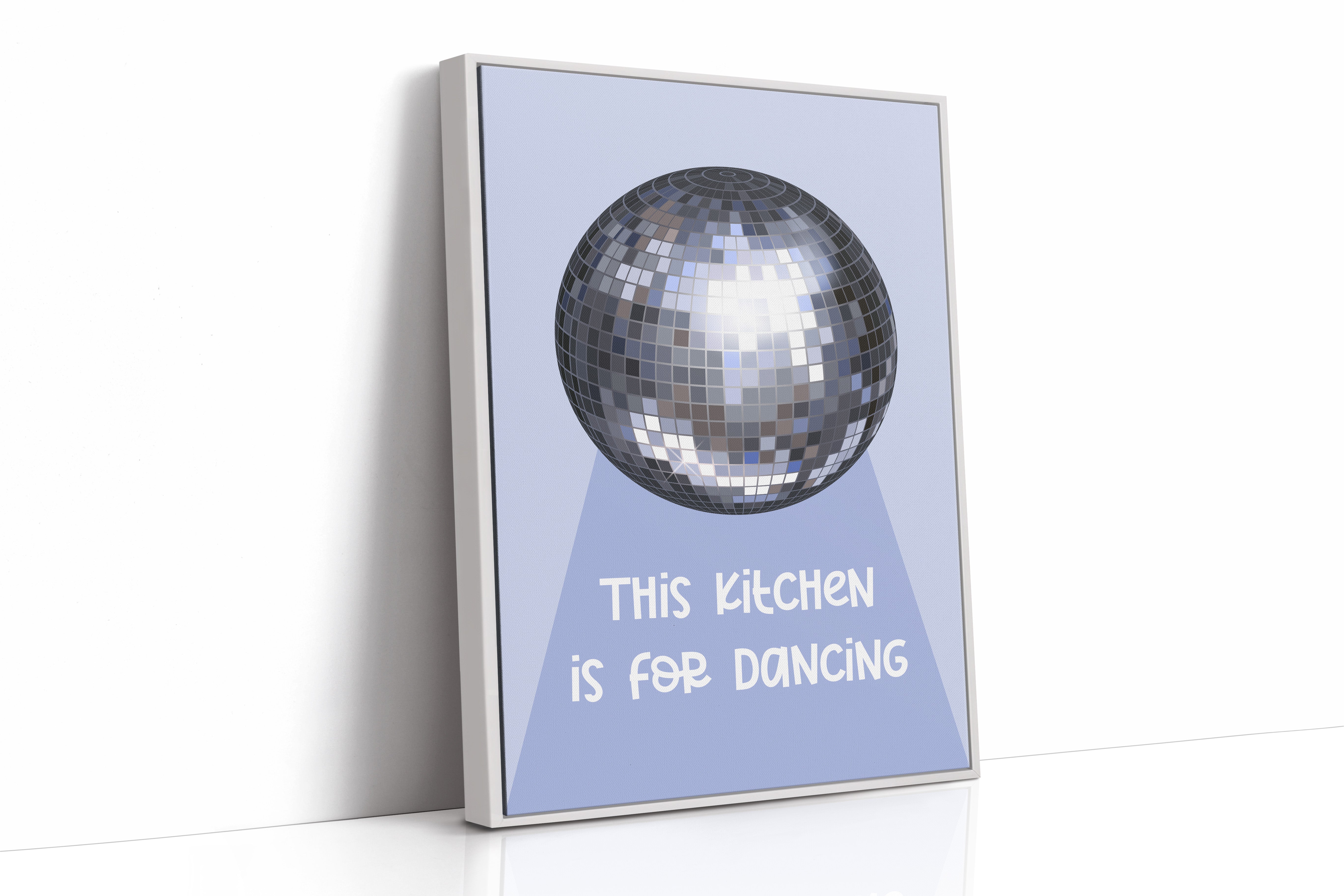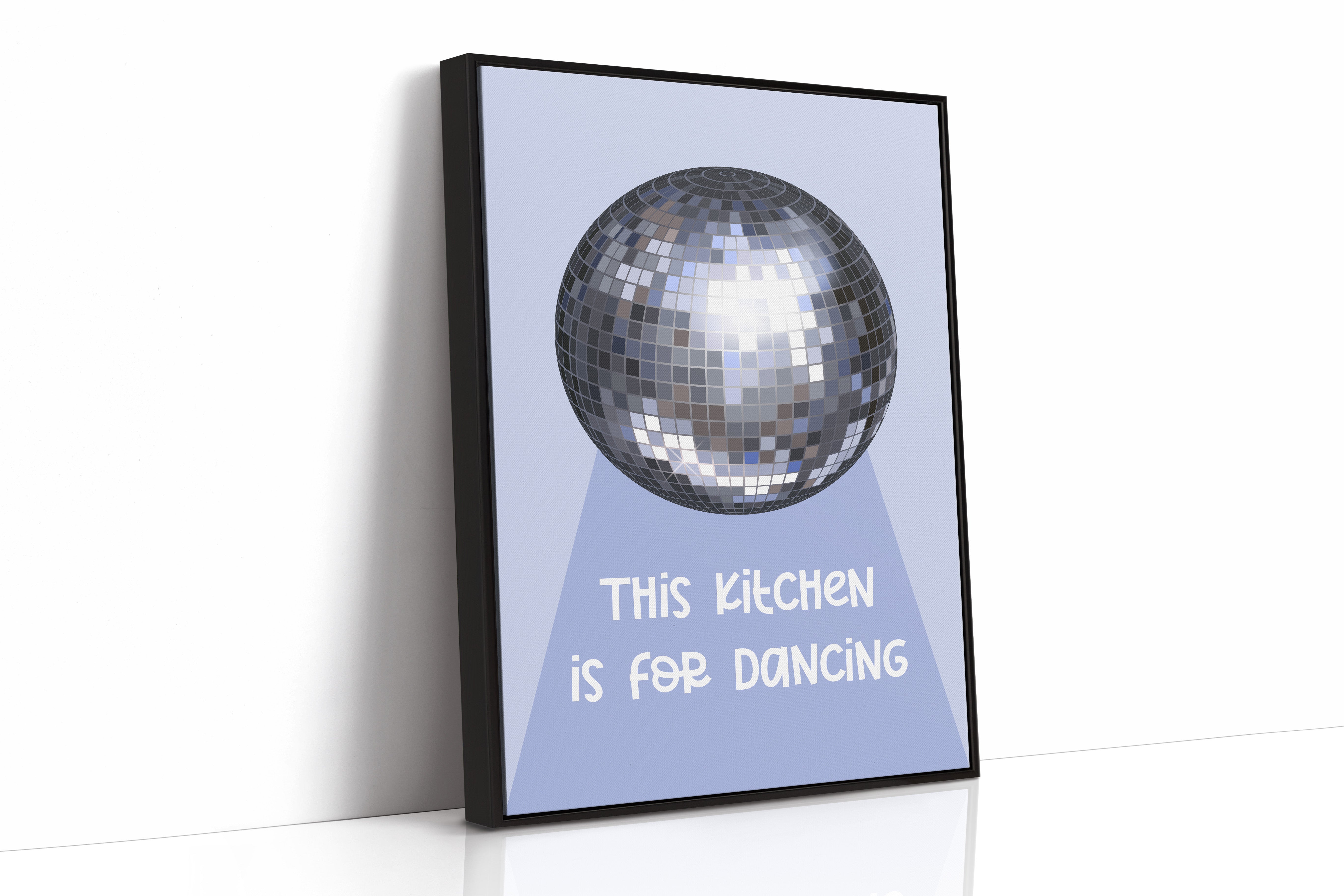 Silver light scatters across the floor like stardust, transforming an ordinary space into a realm of possibility and joy. This playful piece captures the spirit of the Contemporary collection, where everyday moments become extraordinary celebrations. The iconic disco ball casts its spell in shades of chrome and pewter, creating a dance of light and shadow that speaks to the magic found in casual gatherings. Against a soft periwinkle backdrop, it reminds us that sometimes the best parties happen spontaneously, right at home. Perfect for adding a touch of whimsy to kitchen spaces, dining rooms, or any area where good times naturally unfold. Let this piece be a reminder that sometimes the best memories are made while dancing between the refrigerator and stove.