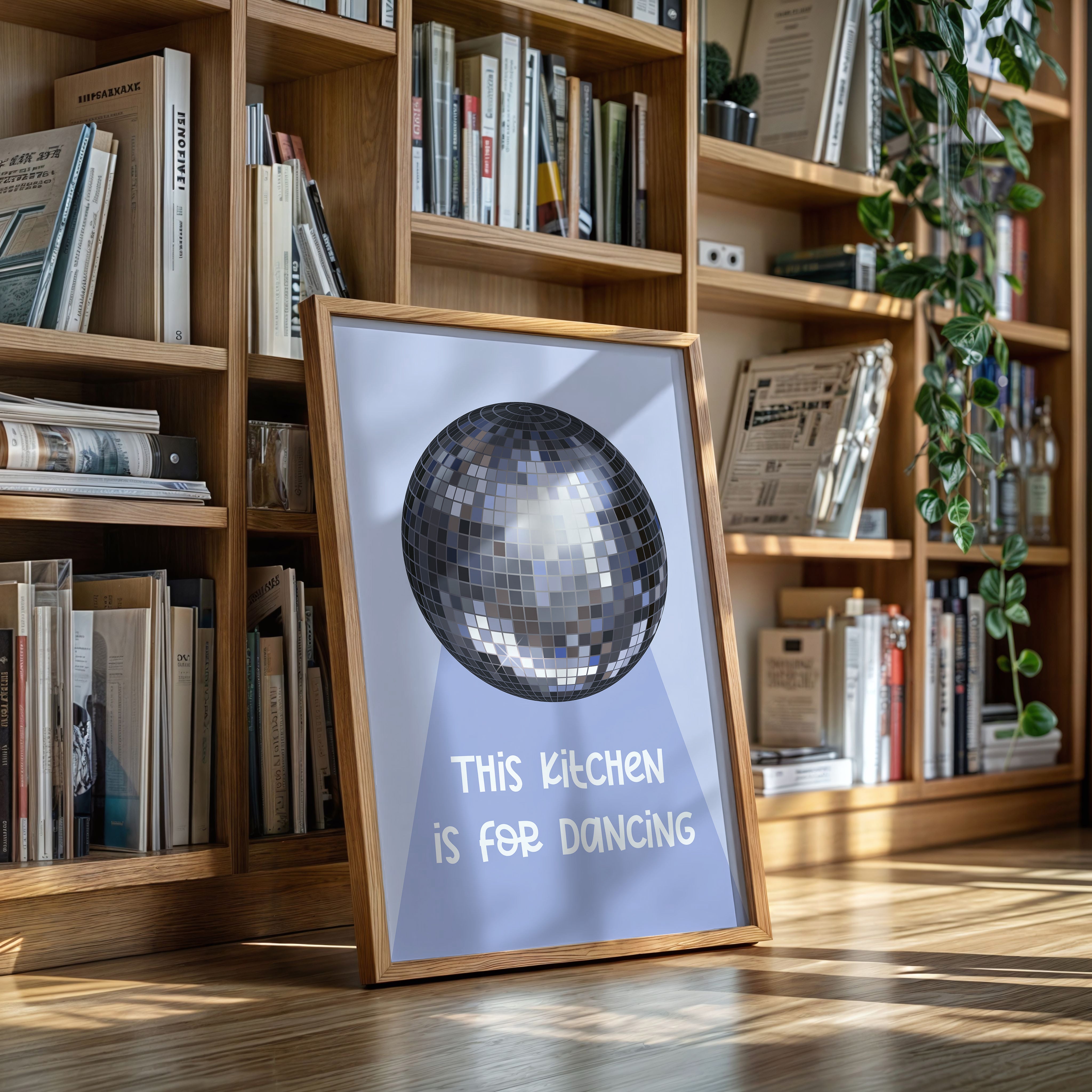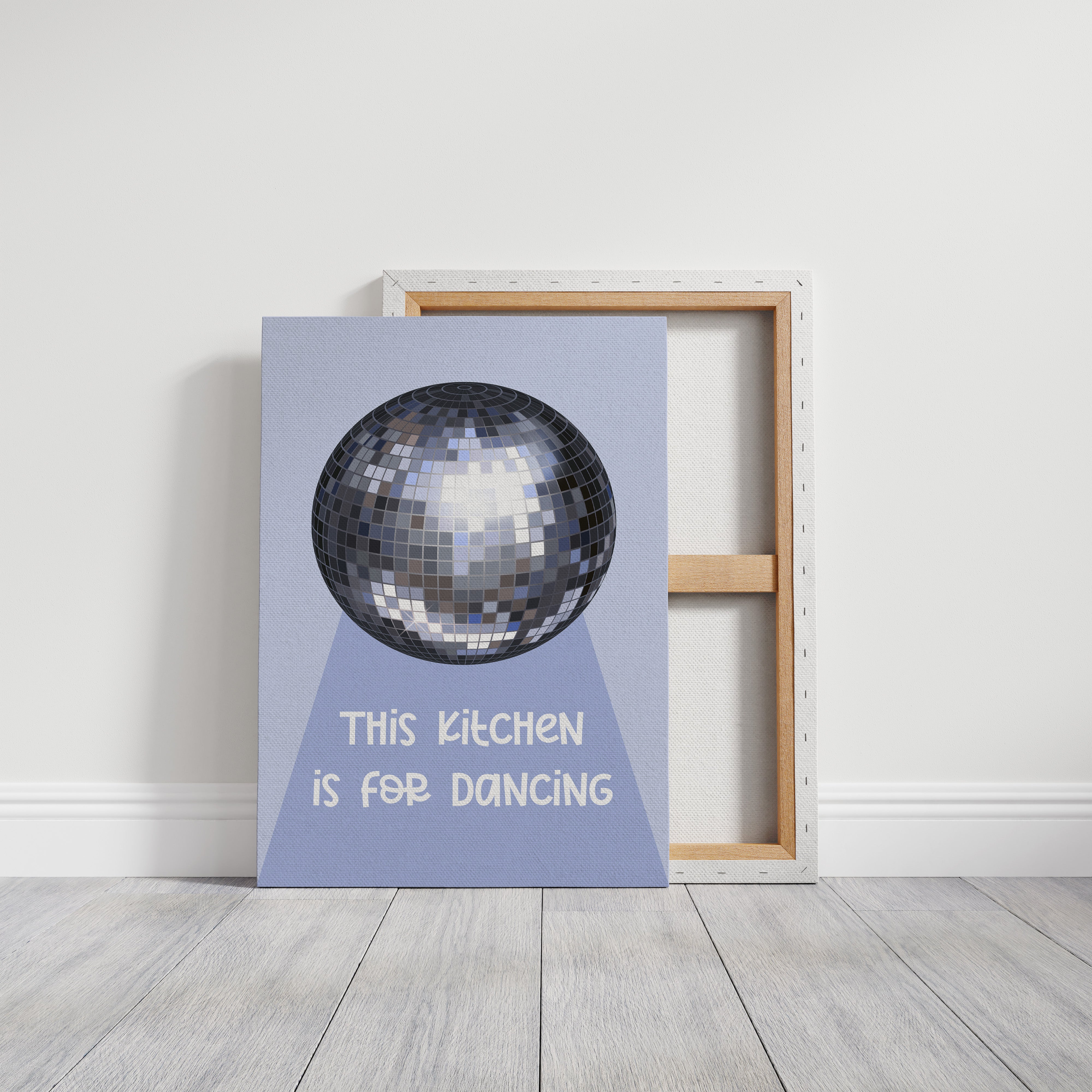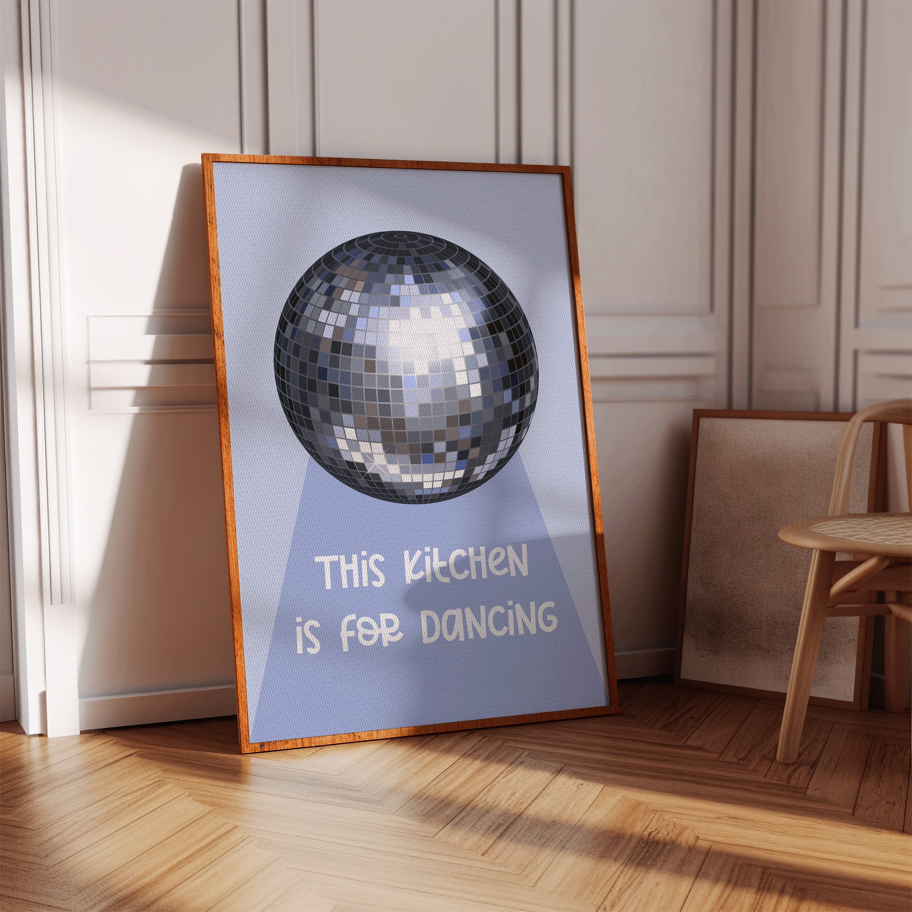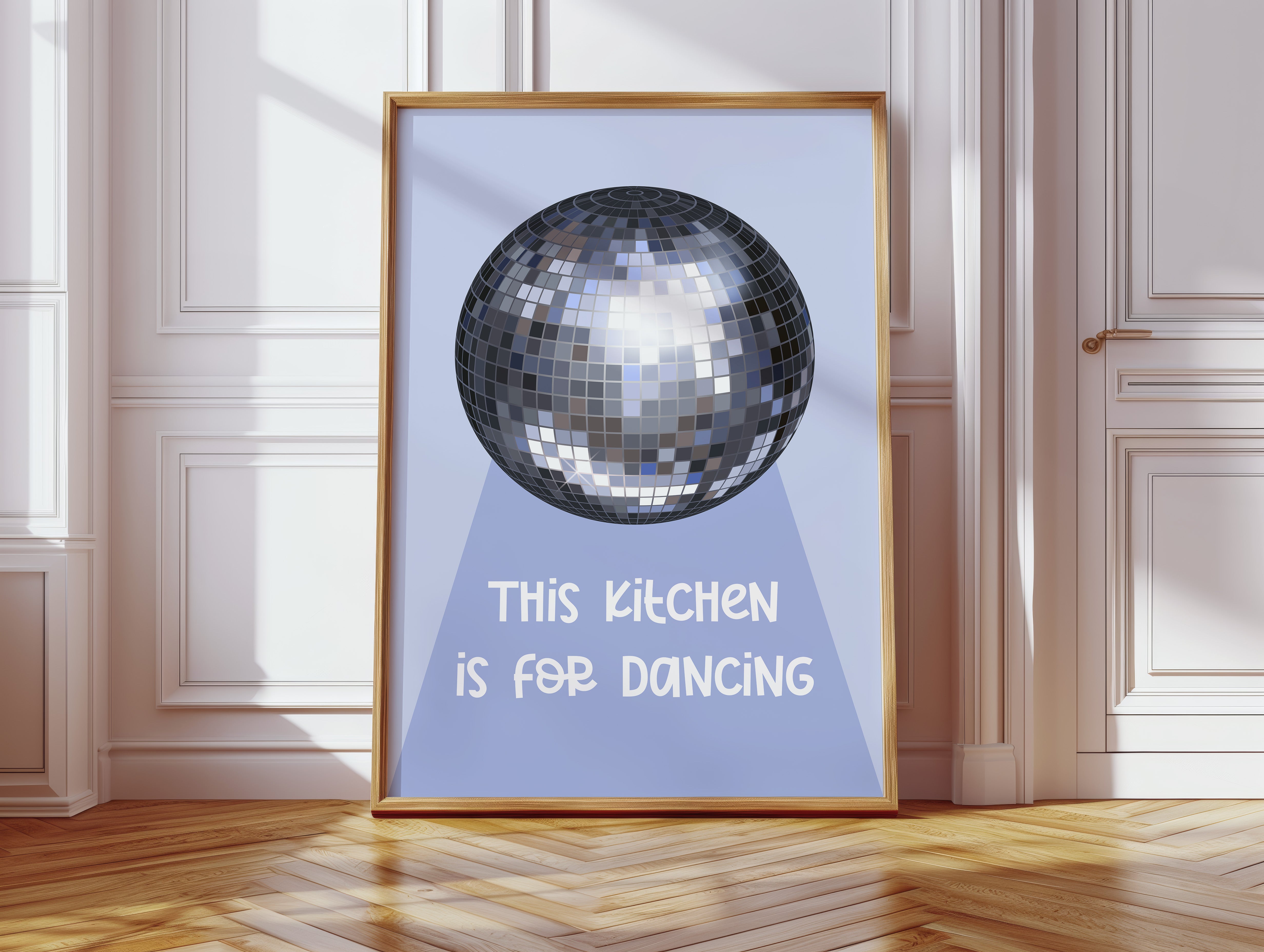 Silver light scatters across the floor like stardust, transforming an ordinary space into a realm of possibility and joy. This playful piece captures the spirit of the Contemporary collection, where everyday moments become extraordinary celebrations. The iconic disco ball casts its spell in shades of chrome and pewter, creating a dance of light and shadow that speaks to the magic found in casual gatherings. Against a soft periwinkle backdrop, it reminds us that sometimes the best parties happen spontaneously, right at home. Perfect for adding a touch of whimsy to kitchen spaces, dining rooms, or any area where good times naturally unfold. Let this piece be a reminder that sometimes the best memories are made while dancing between the refrigerator and stove.