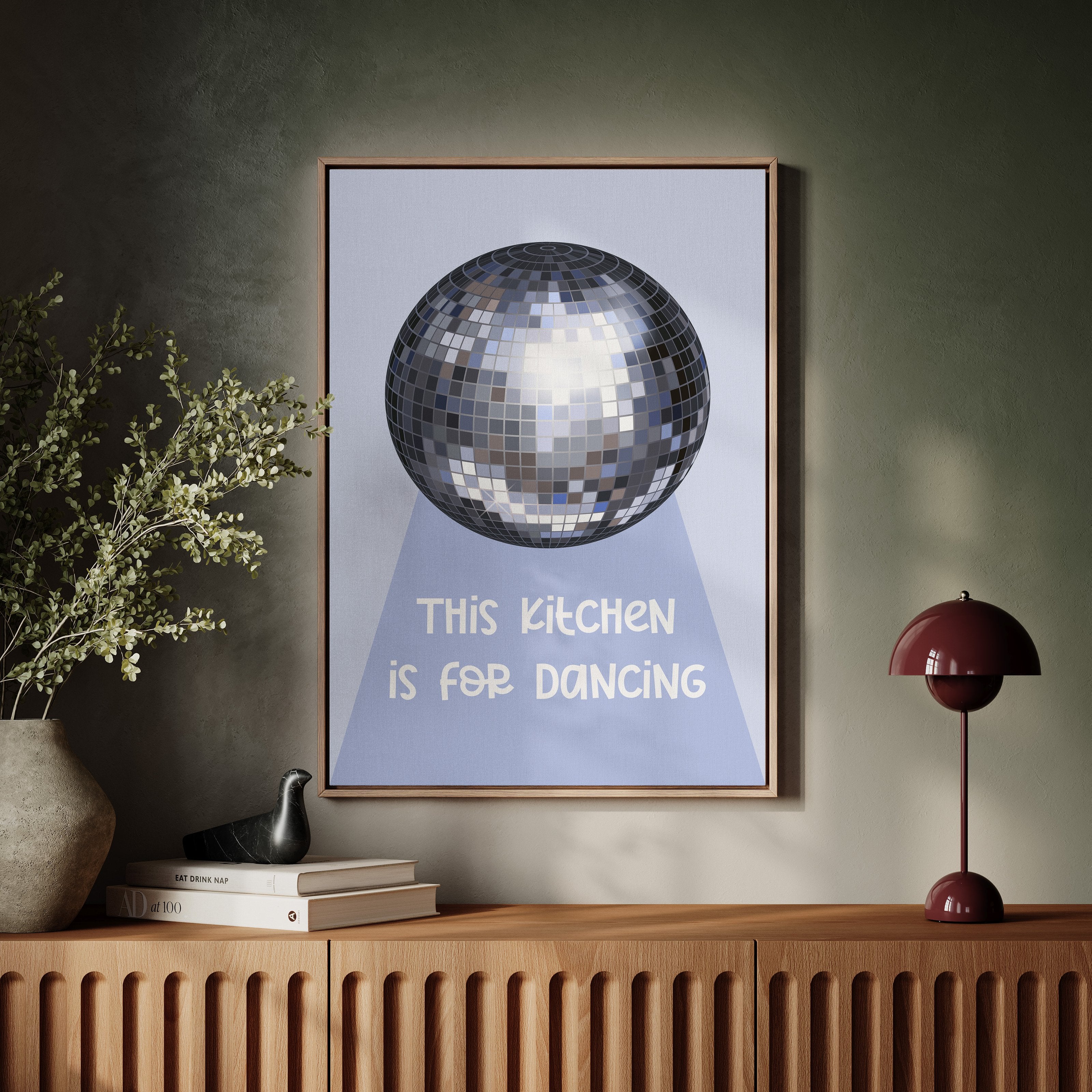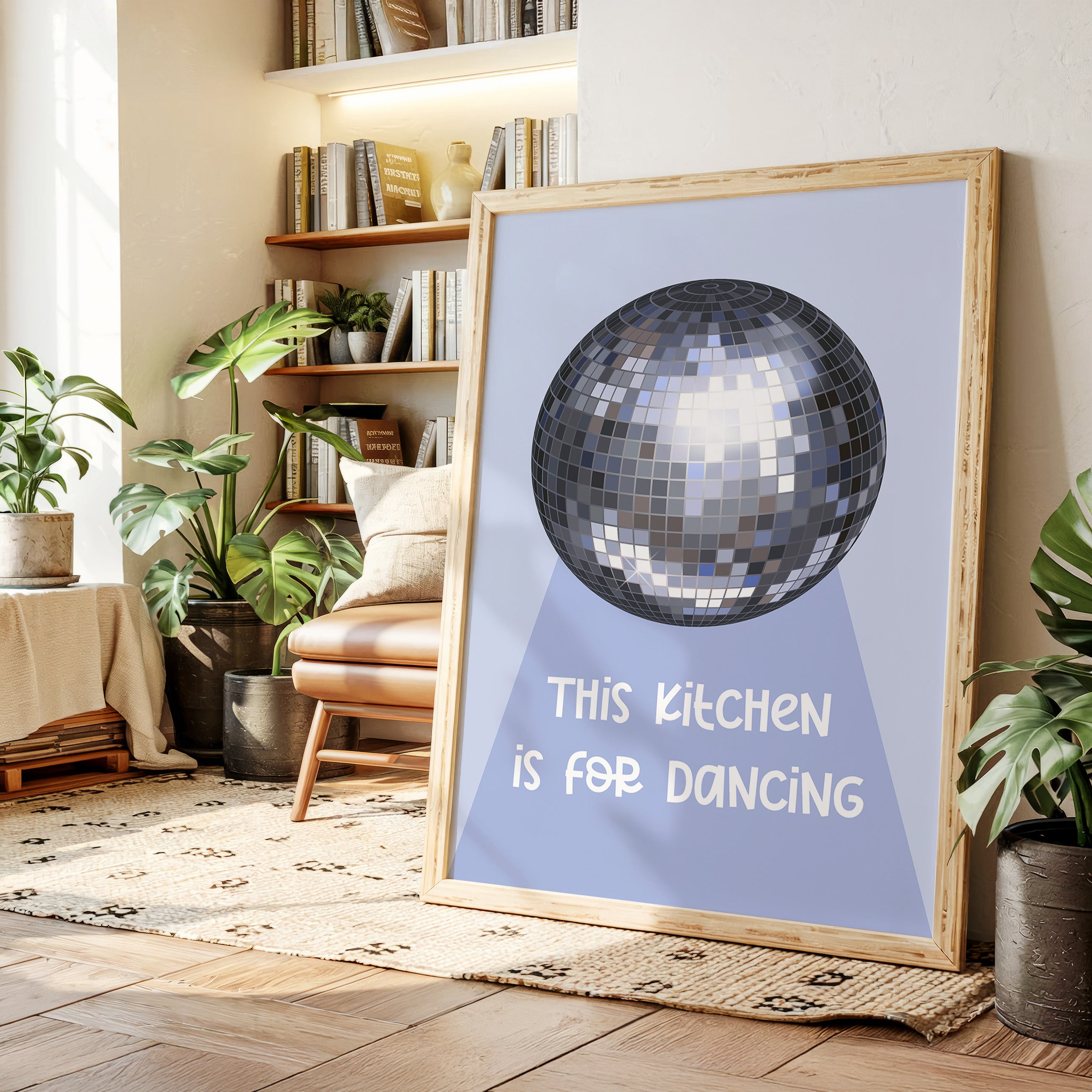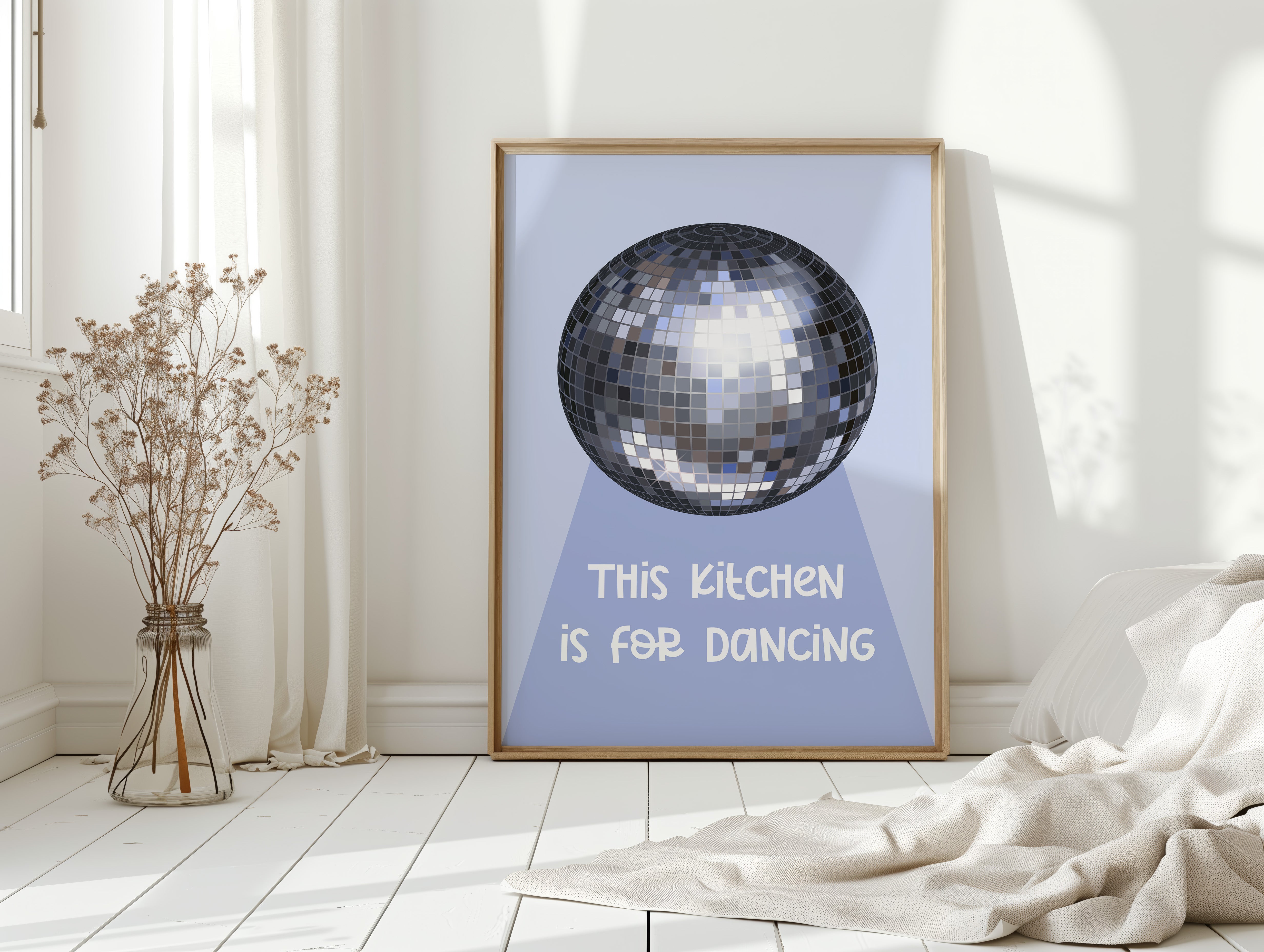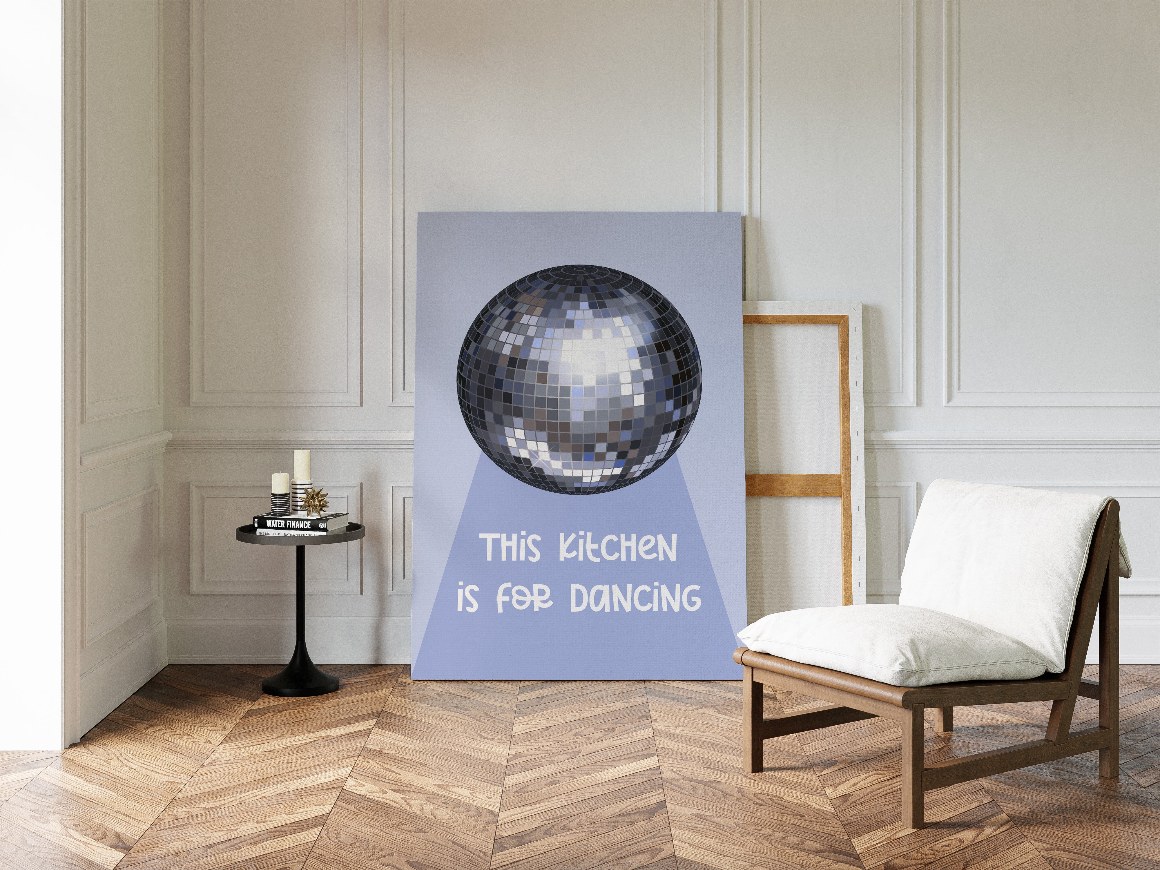 Silver light scatters across the floor like stardust, transforming an ordinary space into a realm of possibility and joy. This playful piece captures the spirit of the Contemporary collection, where everyday moments become extraordinary celebrations. The iconic disco ball casts its spell in shades of chrome and pewter, creating a dance of light and shadow that speaks to the magic found in casual gatherings. Against a soft periwinkle backdrop, it reminds us that sometimes the best parties happen spontaneously, right at home. Perfect for adding a touch of whimsy to kitchen spaces, dining rooms, or any area where good times naturally unfold. Let this piece be a reminder that sometimes the best memories are made while dancing between the refrigerator and stove.
