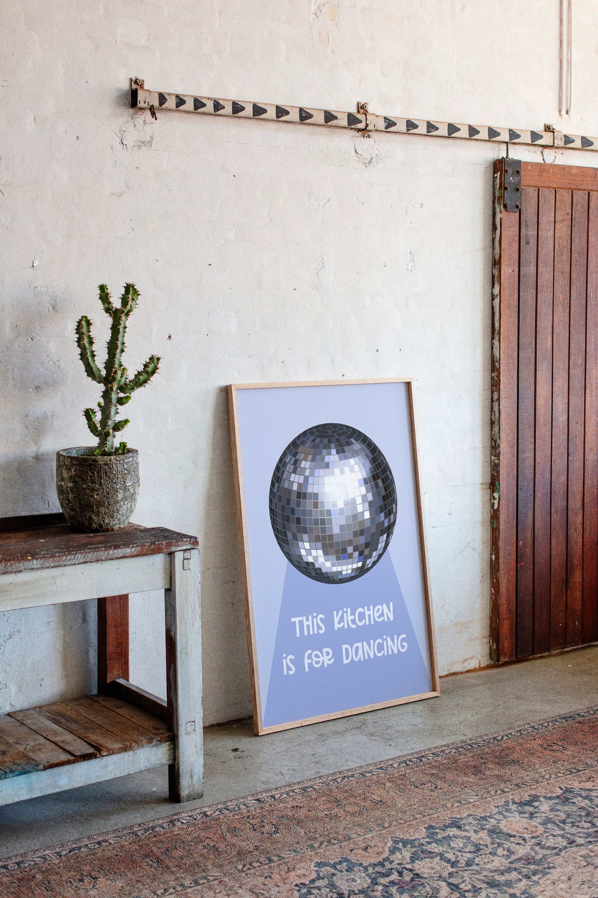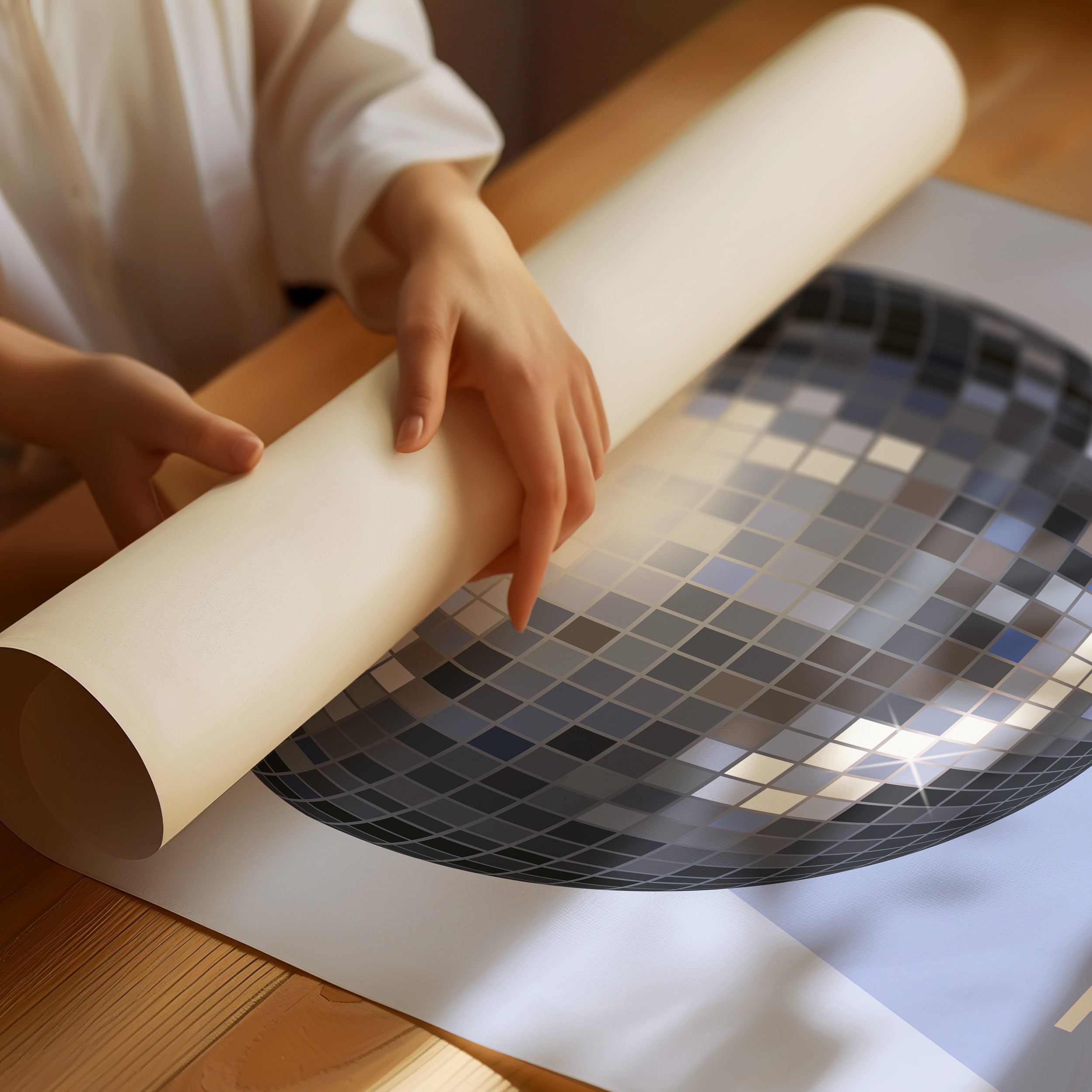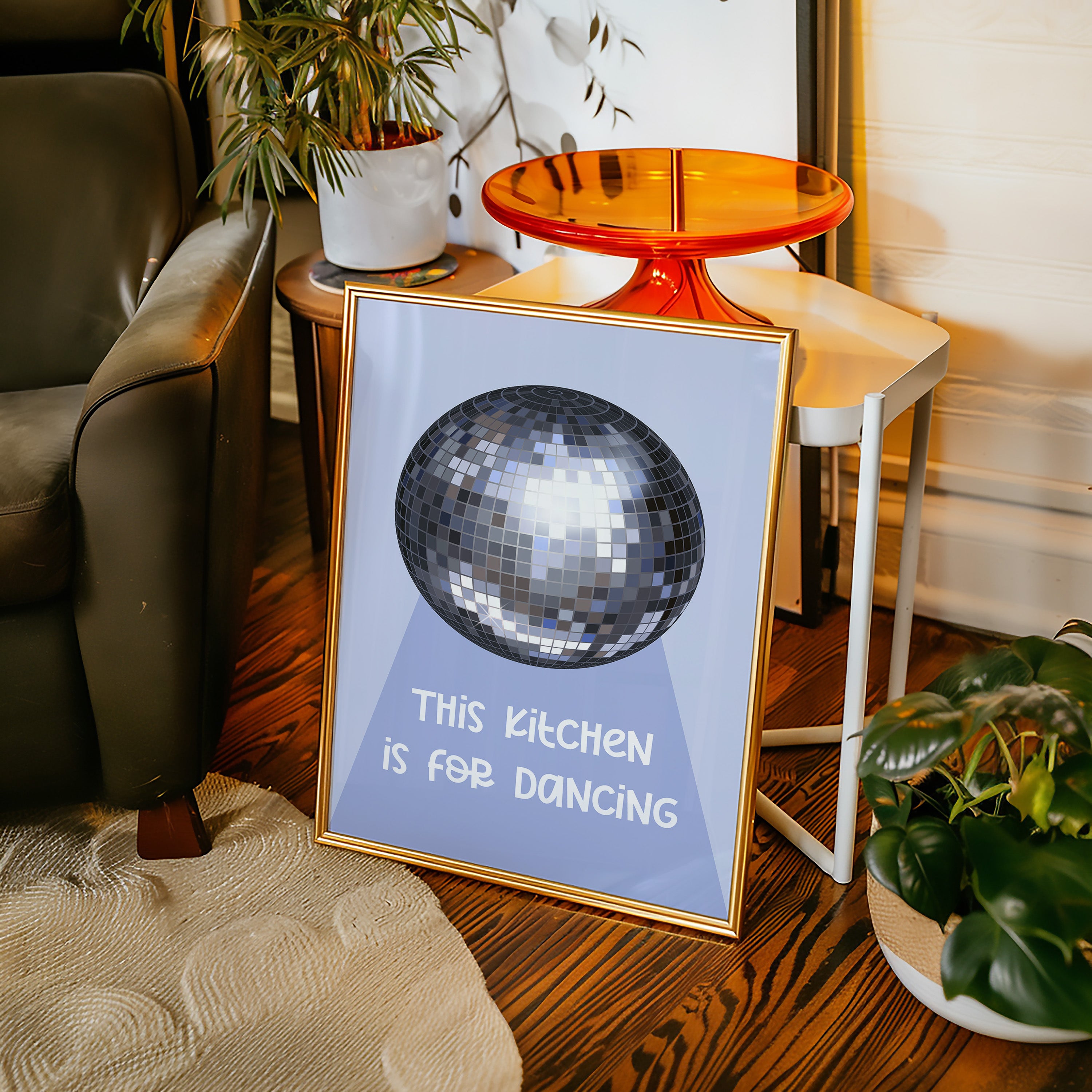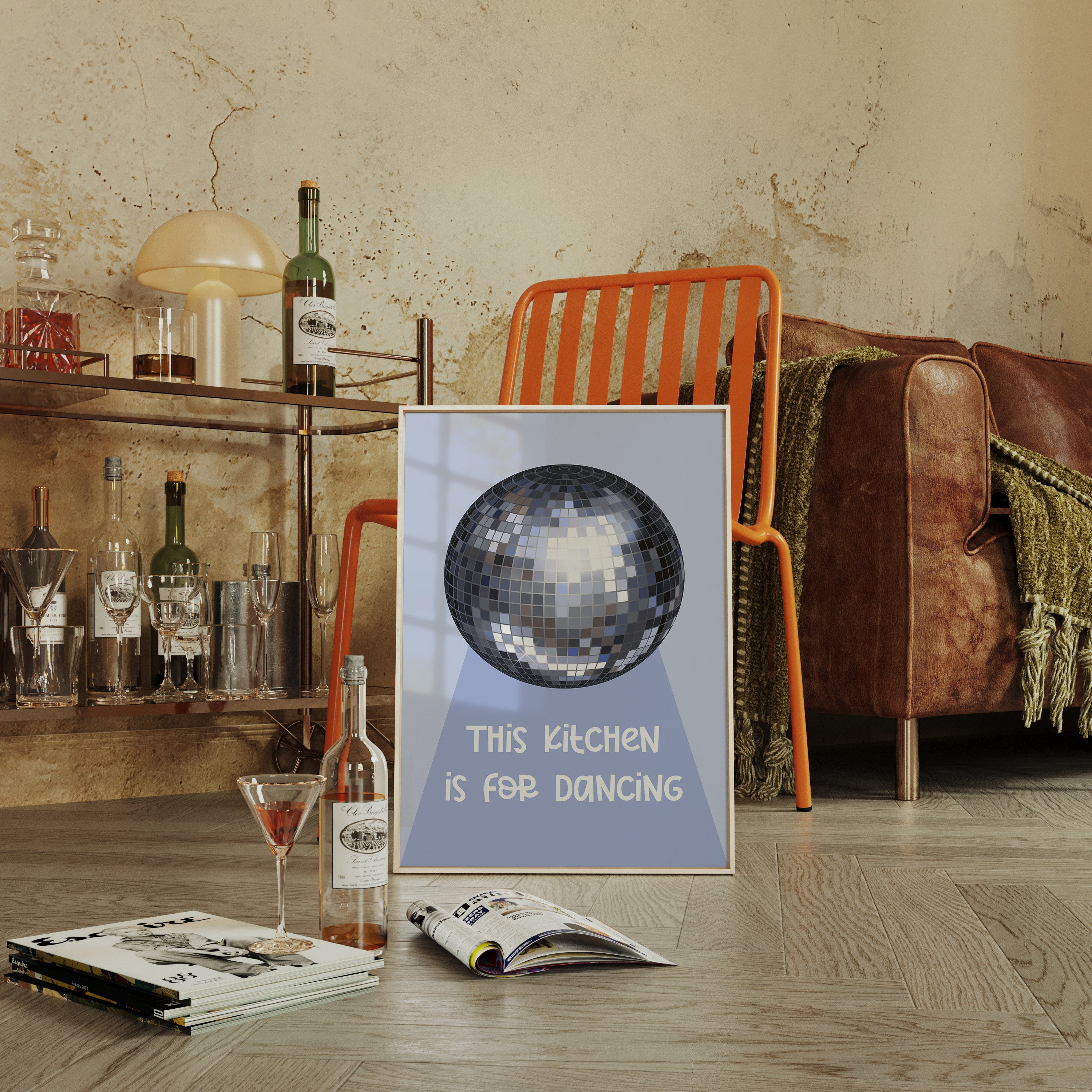 Silver light scatters across the floor like stardust, transforming an ordinary space into a realm of possibility and joy. This playful piece captures the spirit of the Contemporary collection, where everyday moments become extraordinary celebrations. The iconic disco ball casts its spell in shades of chrome and pewter, creating a dance of light and shadow that speaks to the magic found in casual gatherings. Against a soft periwinkle backdrop, it reminds us that sometimes the best parties happen spontaneously, right at home. Perfect for adding a touch of whimsy to kitchen spaces, dining rooms, or any area where good times naturally unfold. Let this piece be a reminder that sometimes the best memories are made while dancing between the refrigerator and stove.