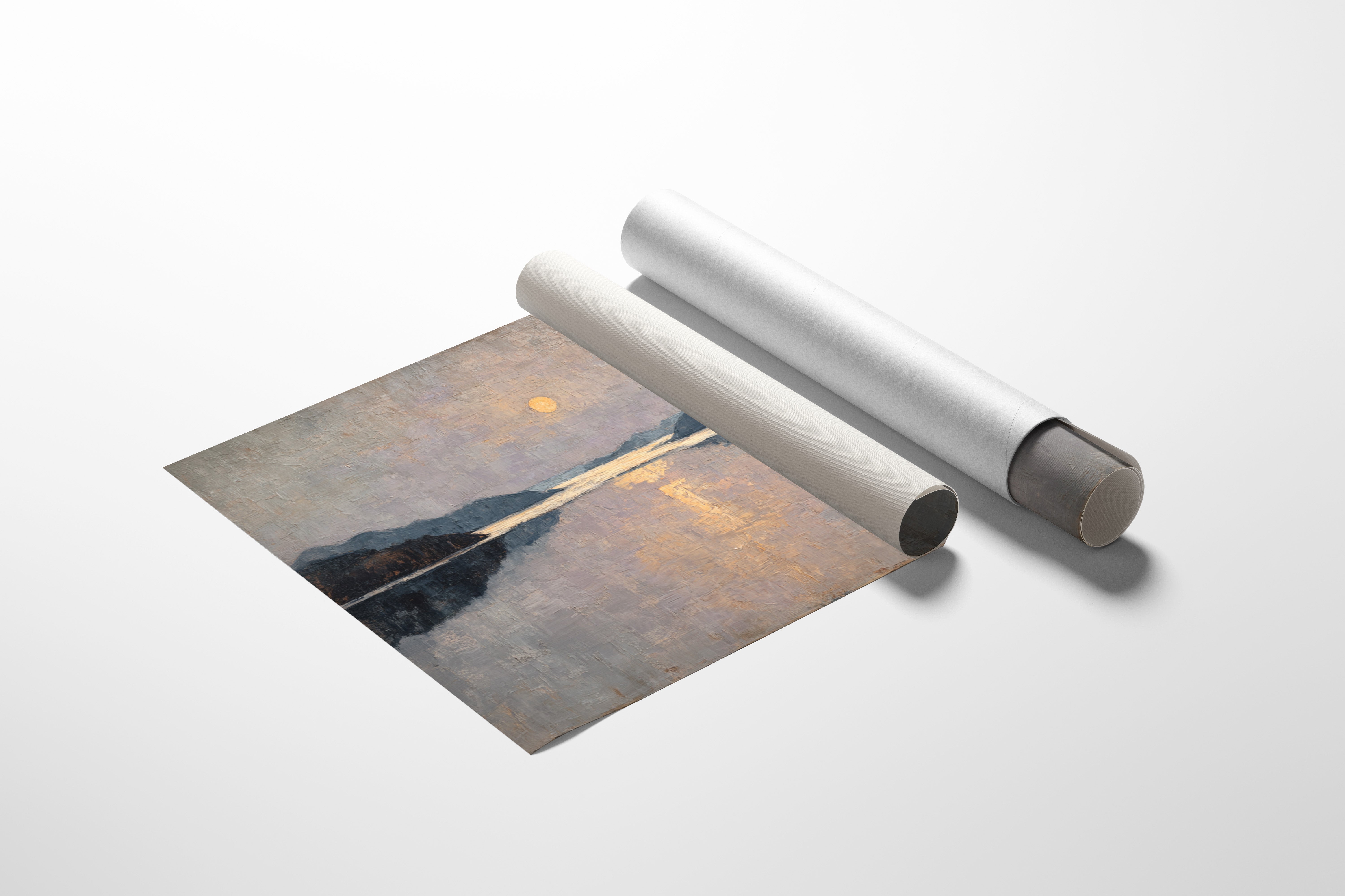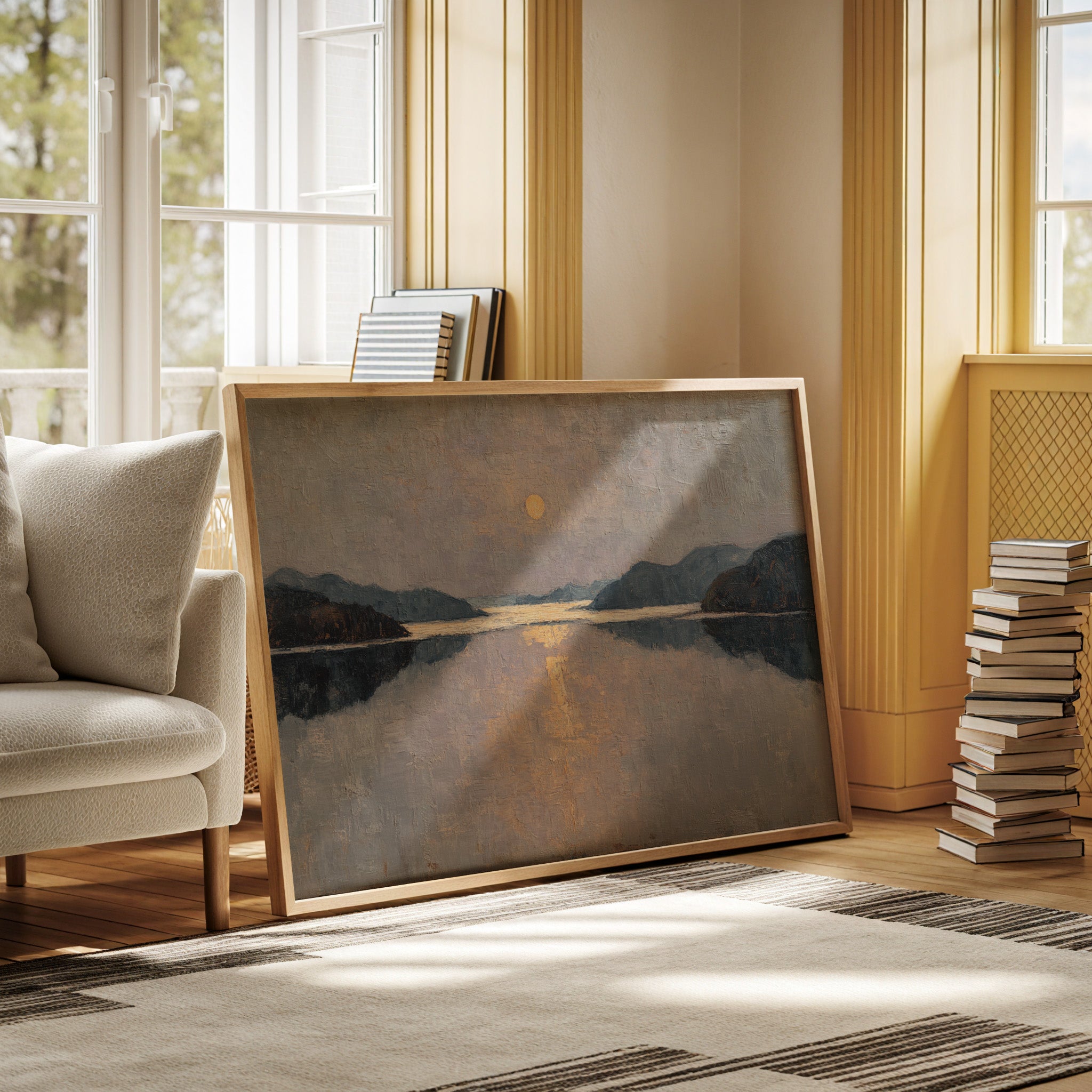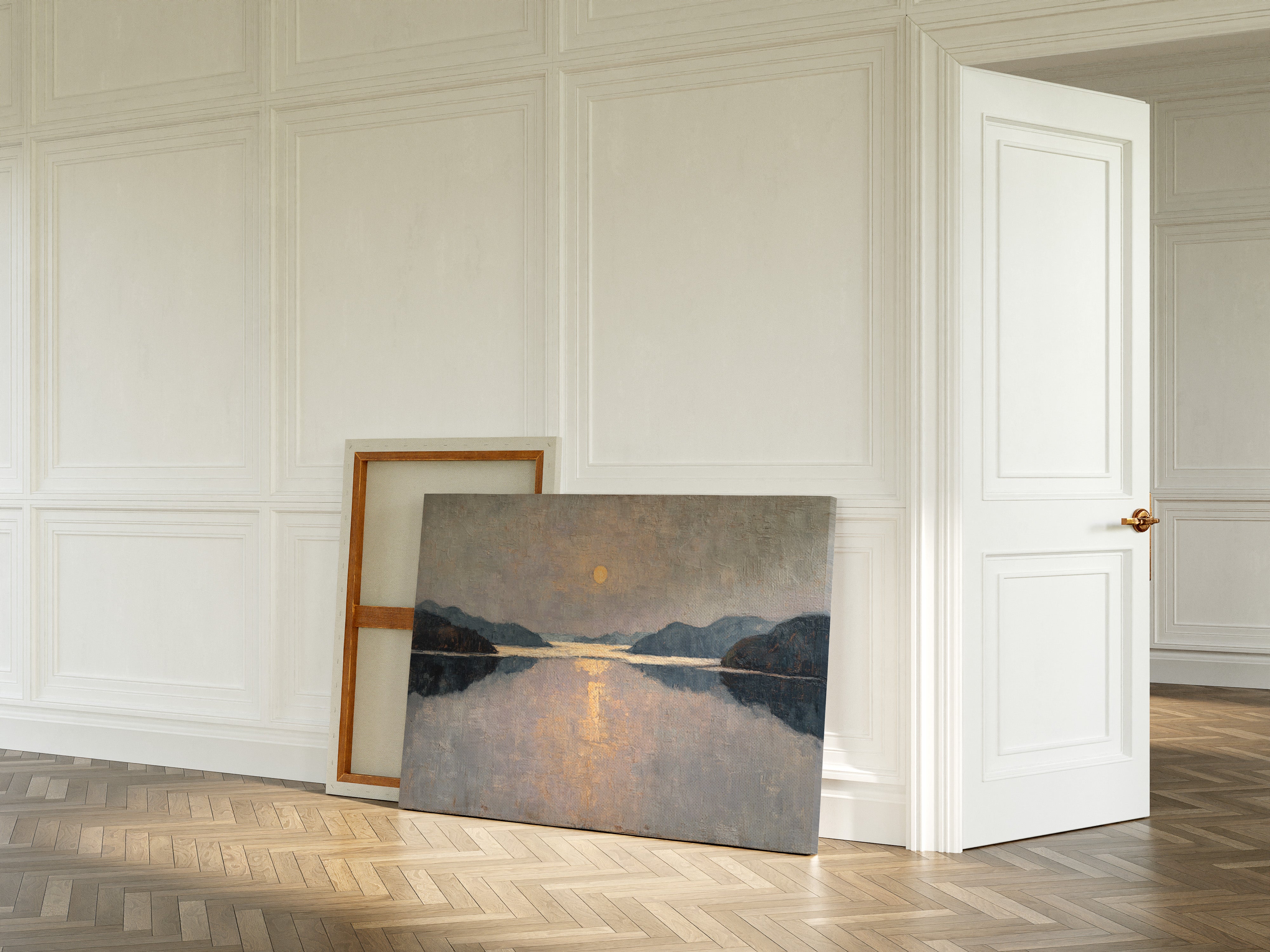 A golden moon hangs suspended in a pearl-grey sky, casting its luminous reflection across tranquil waters. The scene captures that ethereal moment when day surrenders to dusk, and the world holds its breath. Dark mountains rise like sleeping giants along the shoreline, their silhouettes creating a perfect mirror image on the glass-like surface below. The textured brushstrokes evoke a sense of timeless serenity, with subtle variations of slate blue and warm amber tones merging into a harmonious whole. This piece would bring a sense of peaceful contemplation to a master bedroom or meditation space, where its quiet dignity can set the tone for reflection and rest.