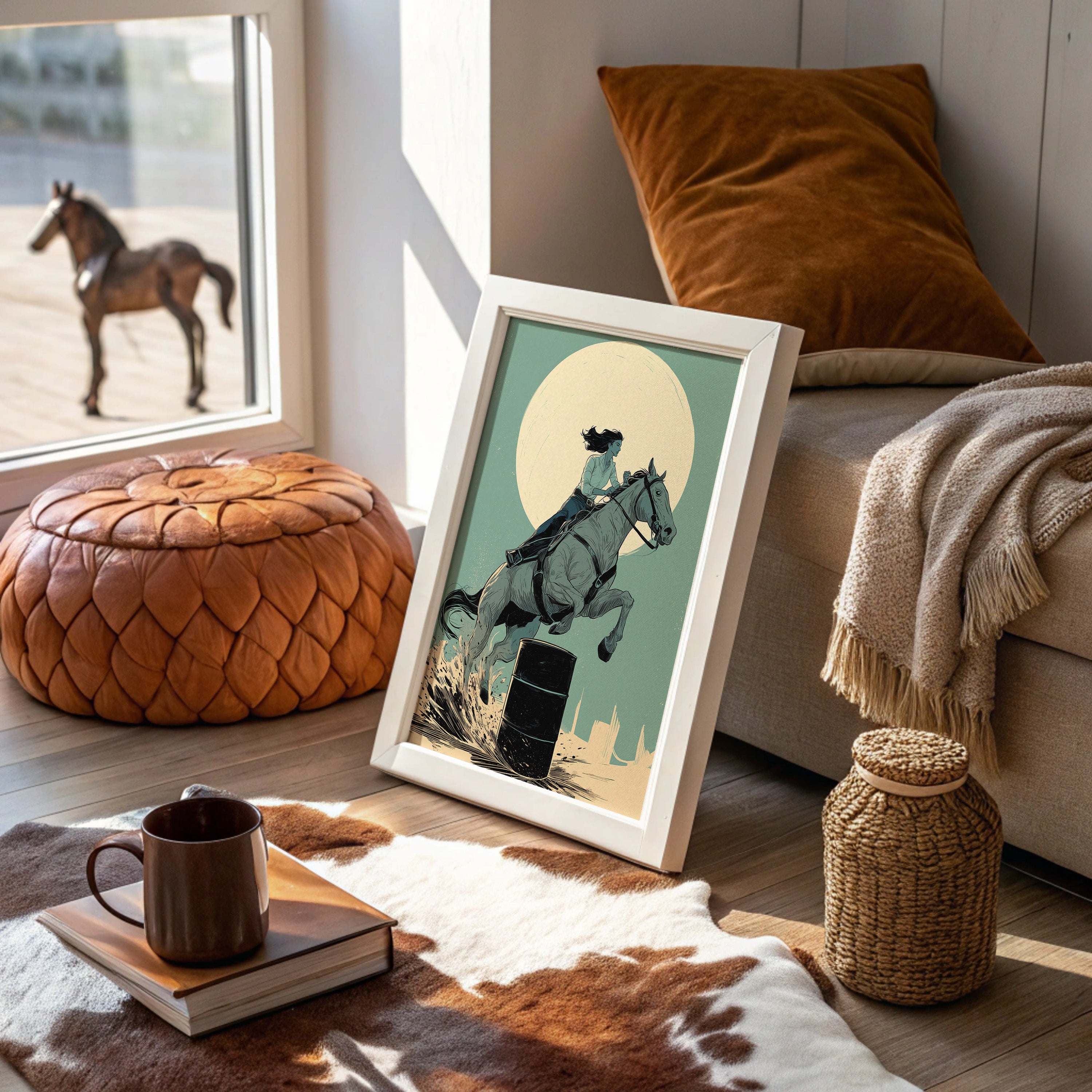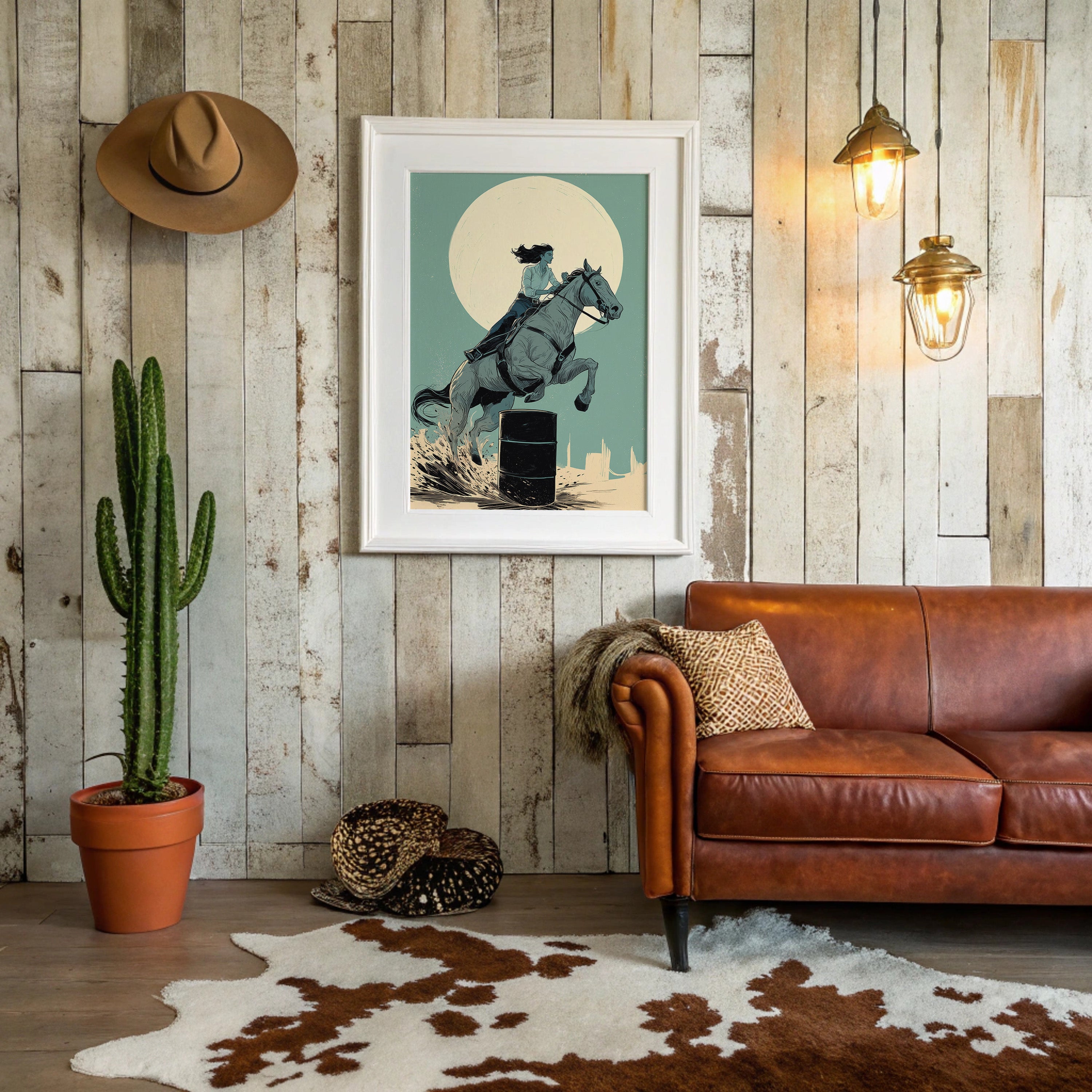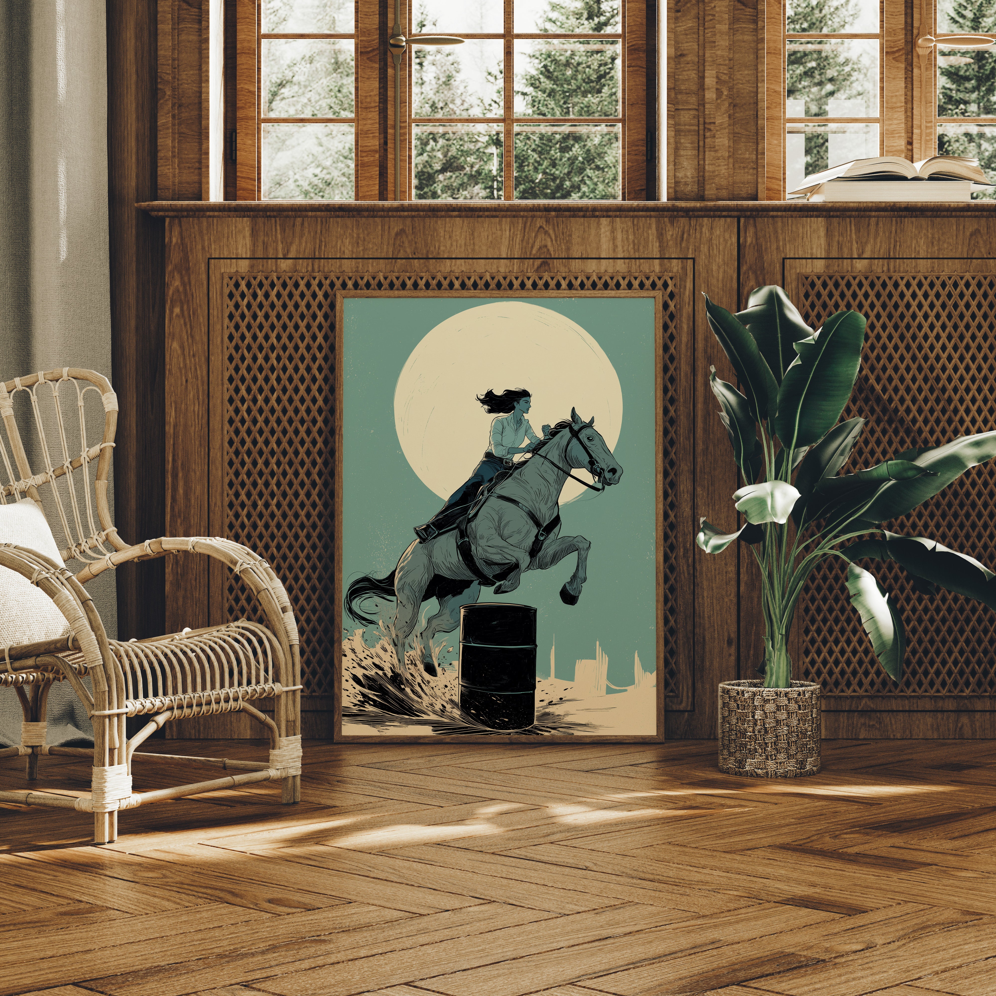 A dynamic scene captures the raw energy of a barrel racer and horse suspended in motion against a luminous full moon. The mint-green backdrop creates a striking contrast with the rider's determined silhouette, while dust kicks up dramatically around the barrel. The illustration masterfully blends modern minimalist style with classic western imagery, creating a timeless narrative of speed and skill. Perfect for adding a bold contemporary western accent to a home office, den, or any space celebrating equestrian culture.