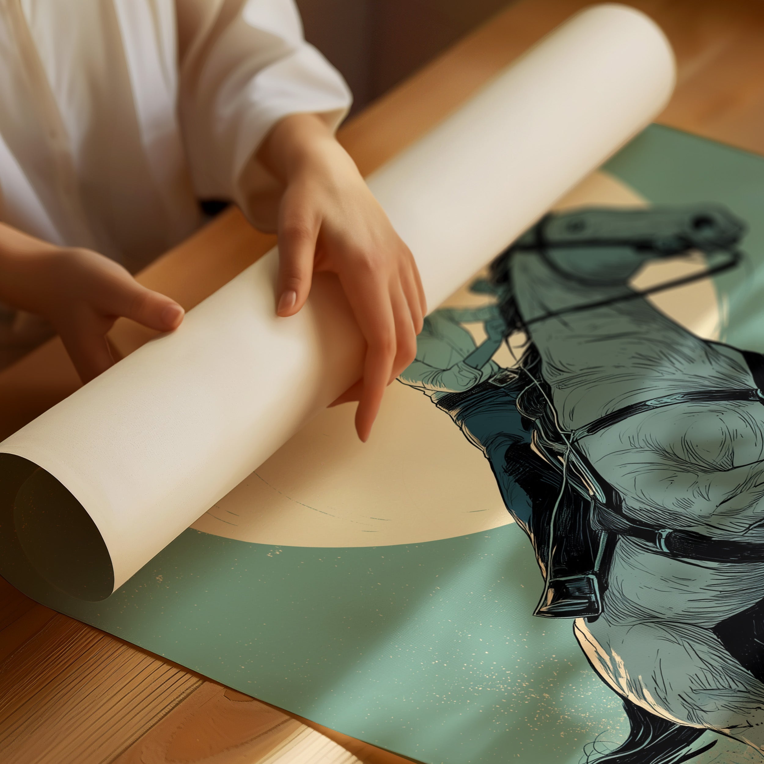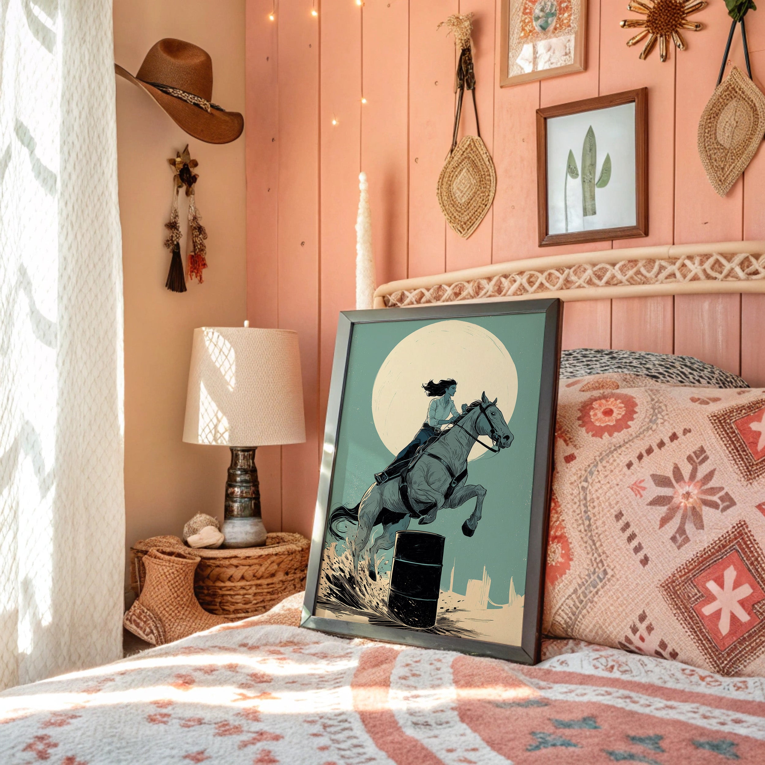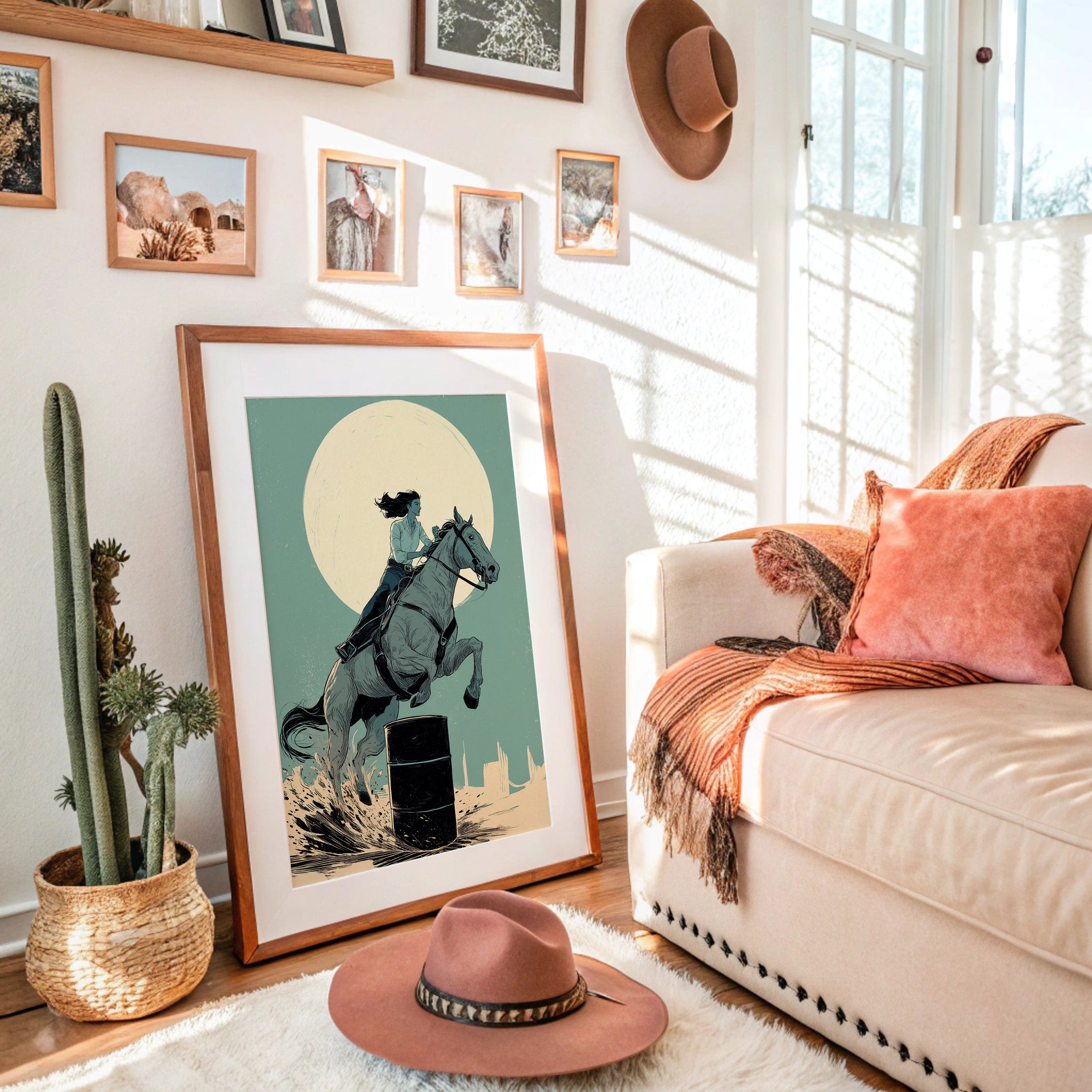 A dynamic scene captures the raw energy of a barrel racer and horse suspended in motion against a luminous full moon. The mint-green backdrop creates a striking contrast with the rider's determined silhouette, while dust kicks up dramatically around the barrel. The illustration masterfully blends modern minimalist style with classic western imagery, creating a timeless narrative of speed and skill. Perfect for adding a bold contemporary western accent to a home office, den, or any space celebrating equestrian culture.