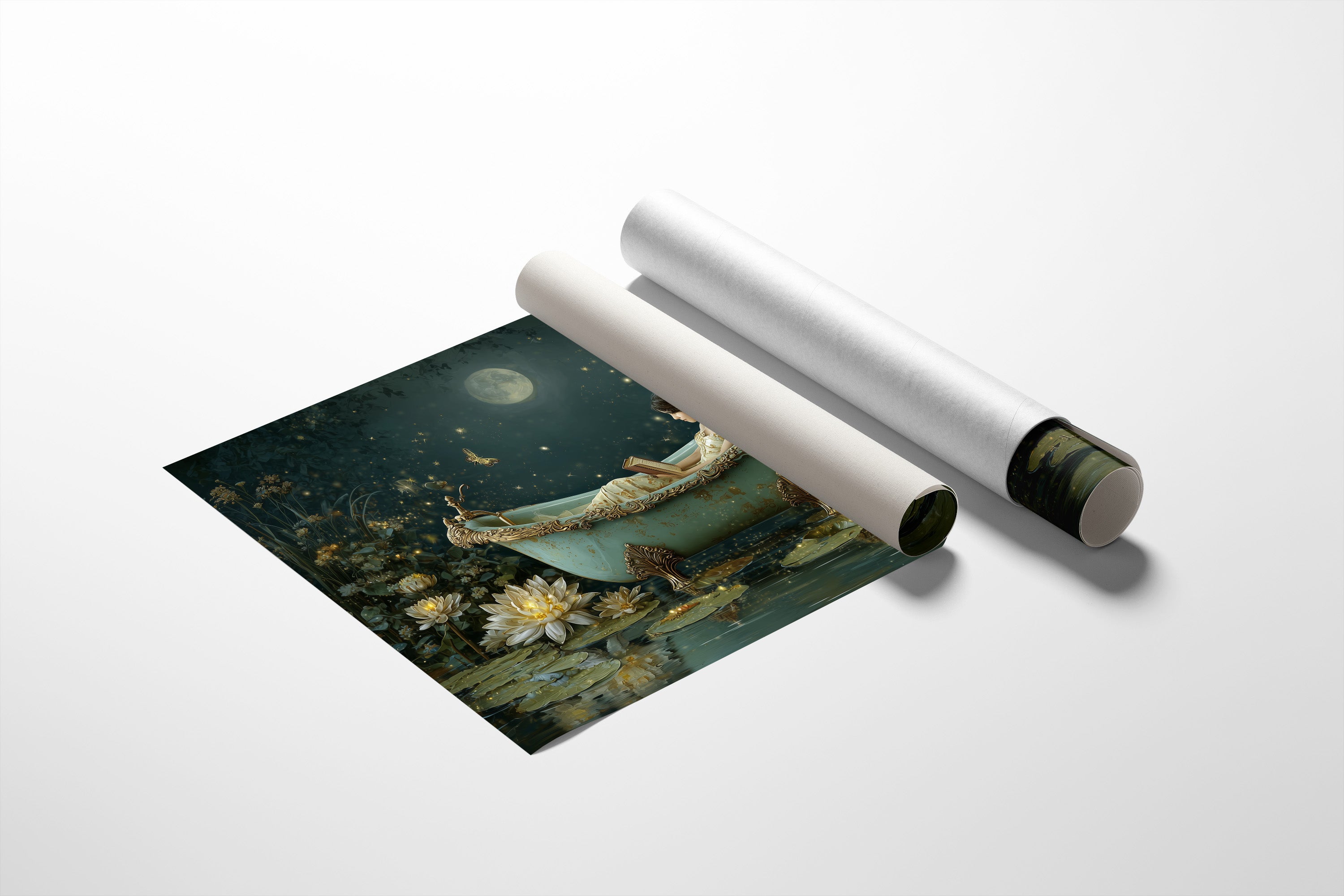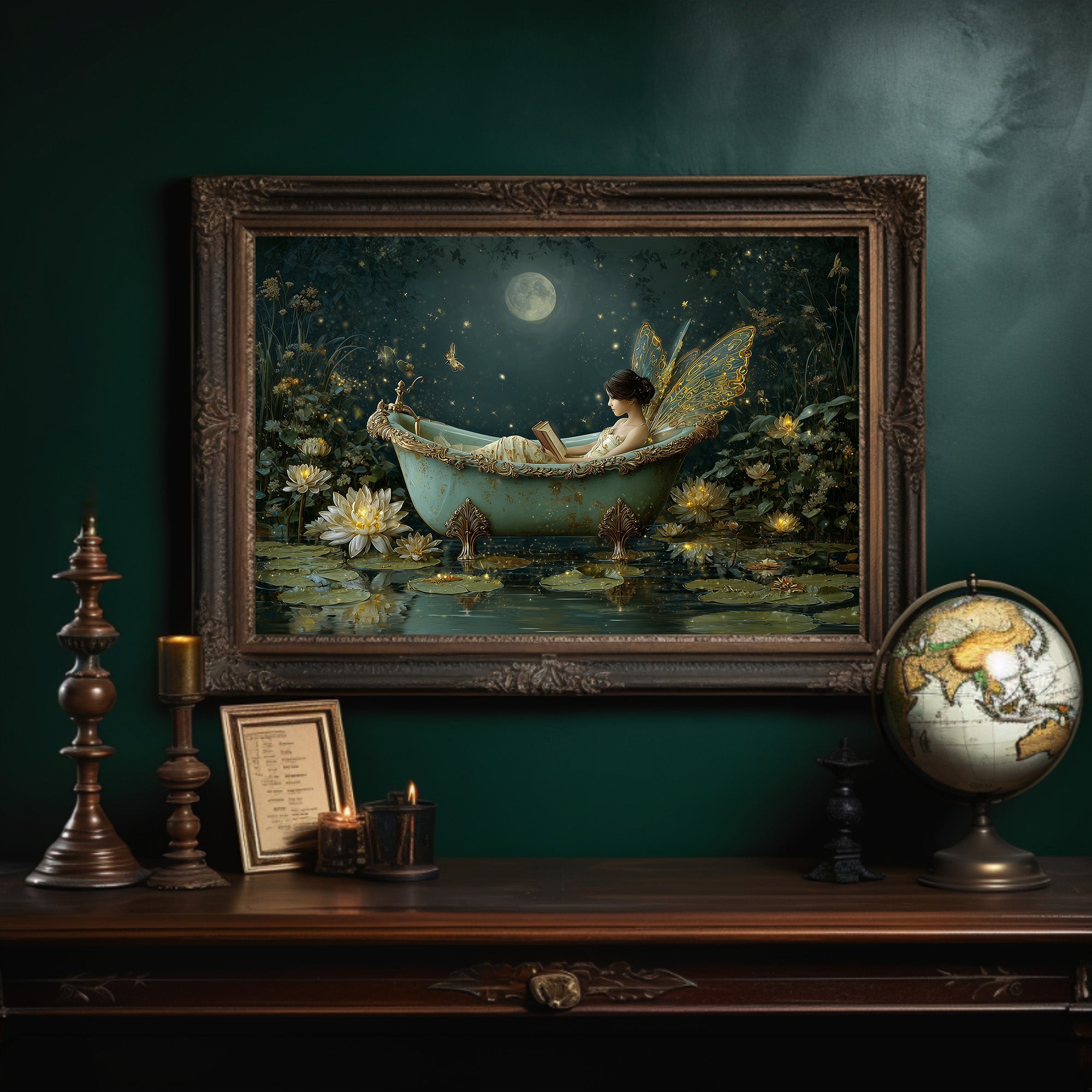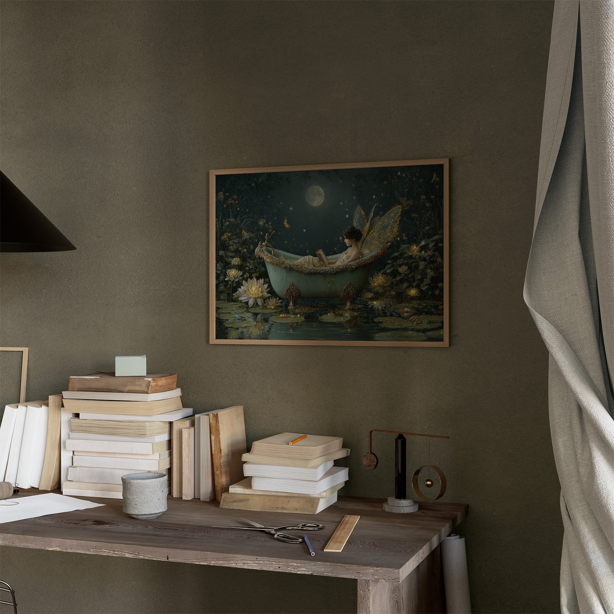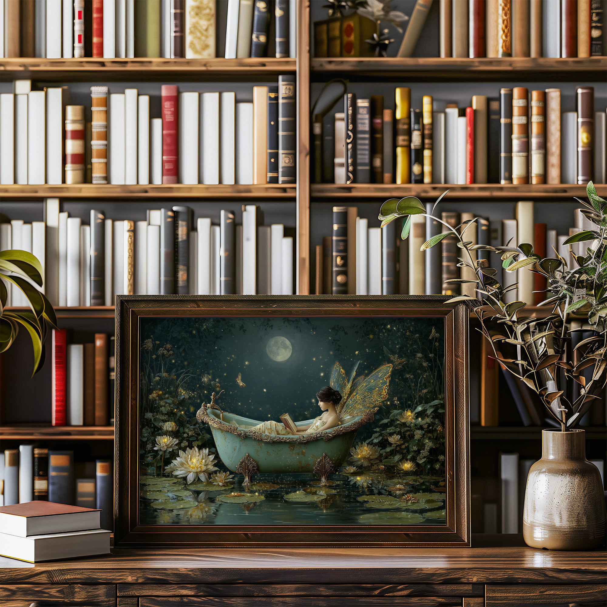 A magical twilight scene unfolds where imagination meets tranquility. The framed artwork depicts an ethereal figure with delicate wings resting in a vintage clawfoot tub, surrounded by luminous water lilies that glow beneath a full moon. Rich emerald tones blend with golden accents, creating a dreamlike atmosphere where fantasy and serenity coexist against the backdrop of a scholarly library. This enchanting piece would bring a touch of literary whimsy to a reading nook, study, or any space where dreams and knowledge naturally intertwine.