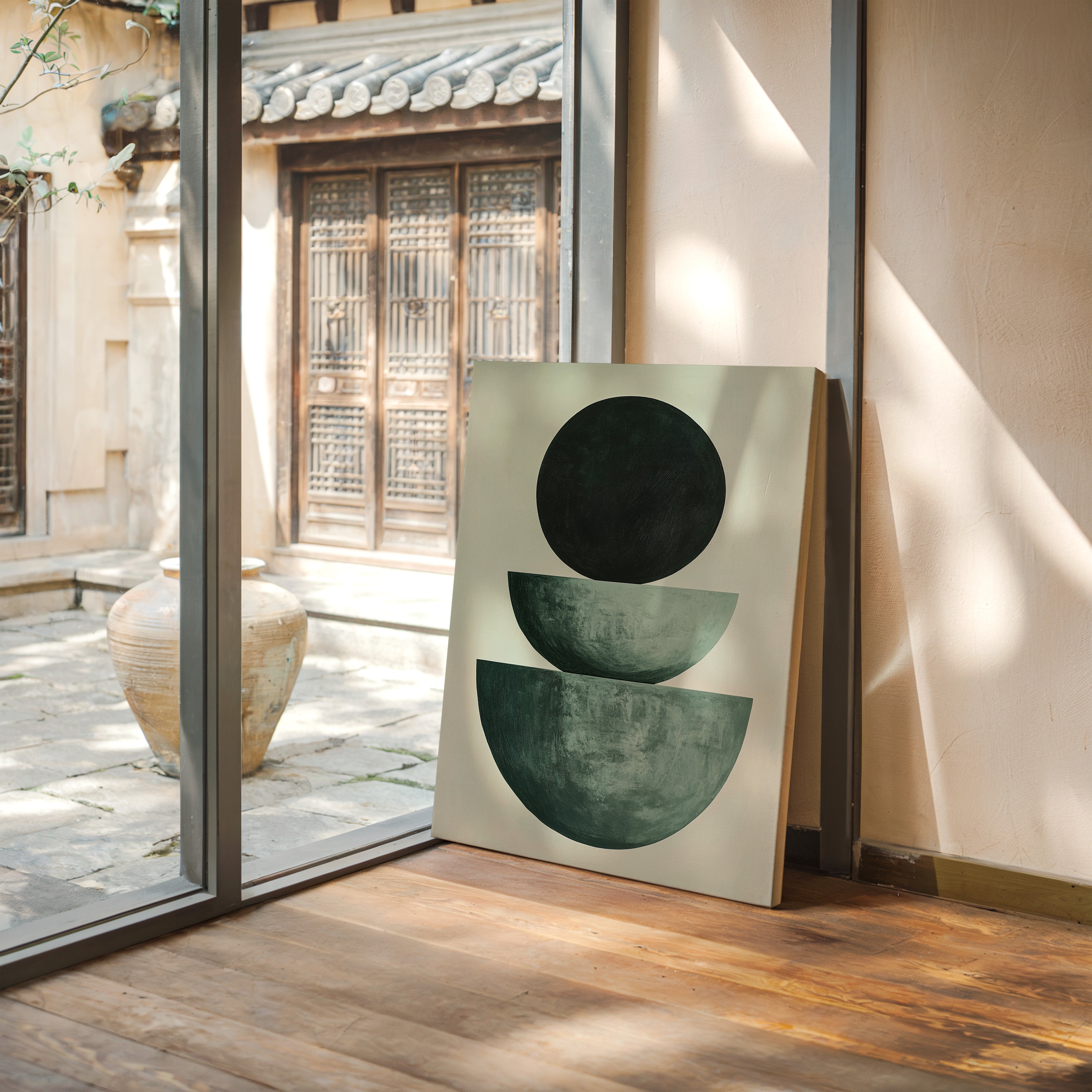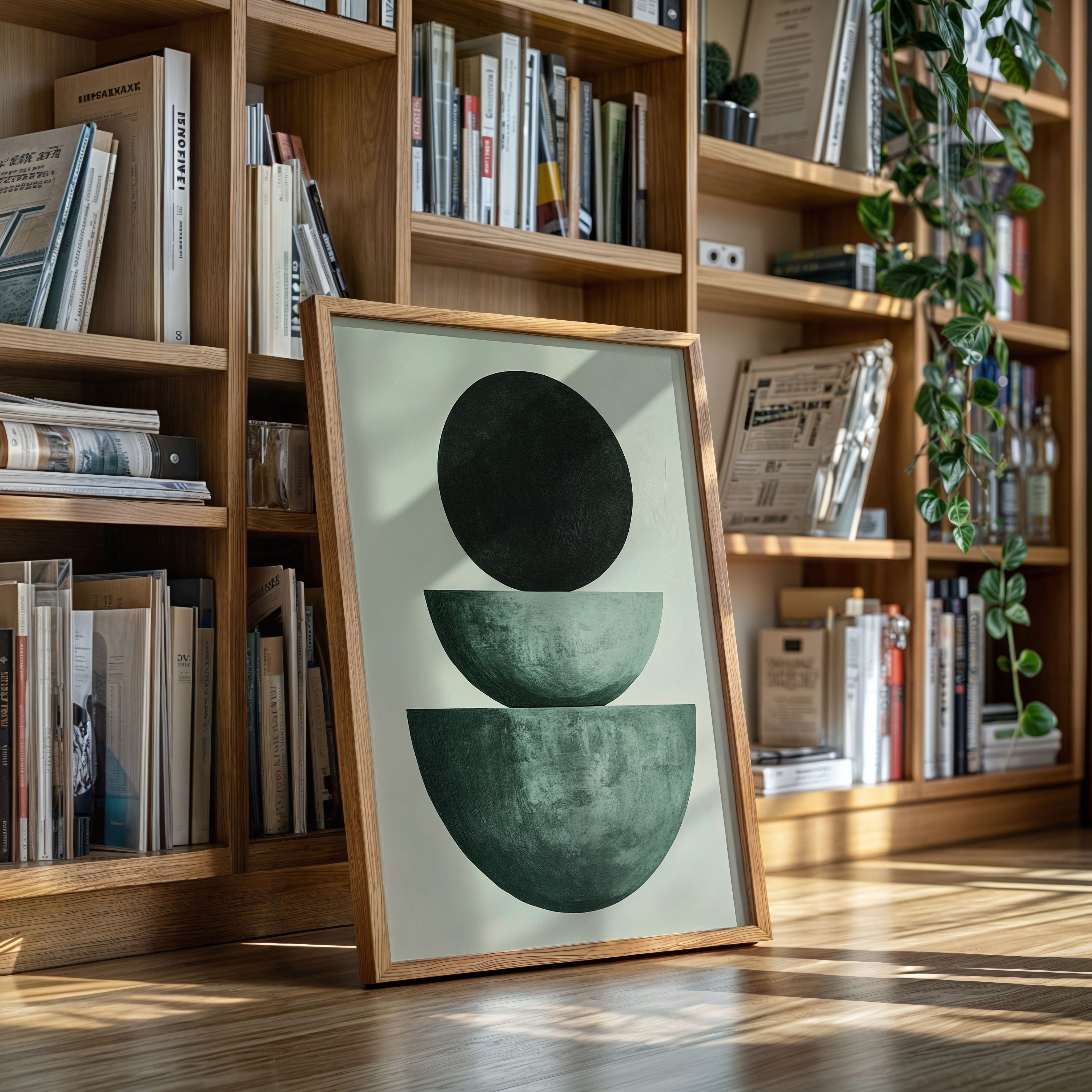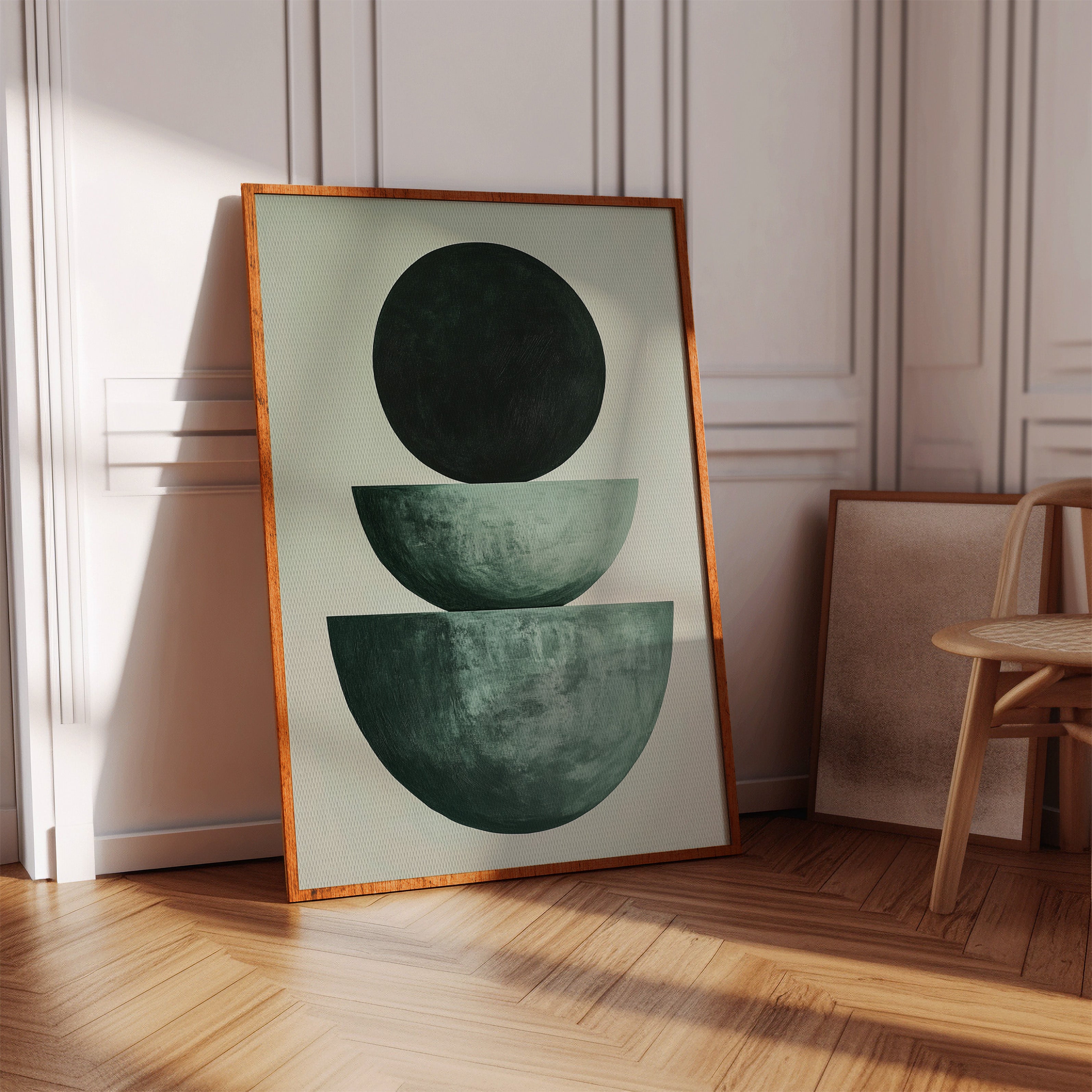 A mesmerizing dance of geometric harmony unfolds in shades of deep forest green and misty sage. Three circular forms stack with deliberate poise - a solid sphere crowning two ascending bowls, their surfaces bearing the gentle marks of time and texture. The composition speaks of meditation and mindfulness, where each element knows its place in the greater whole. Perfect for a minimalist meditation room or a contemporary living space seeking tranquility through clean lines and organic forms.