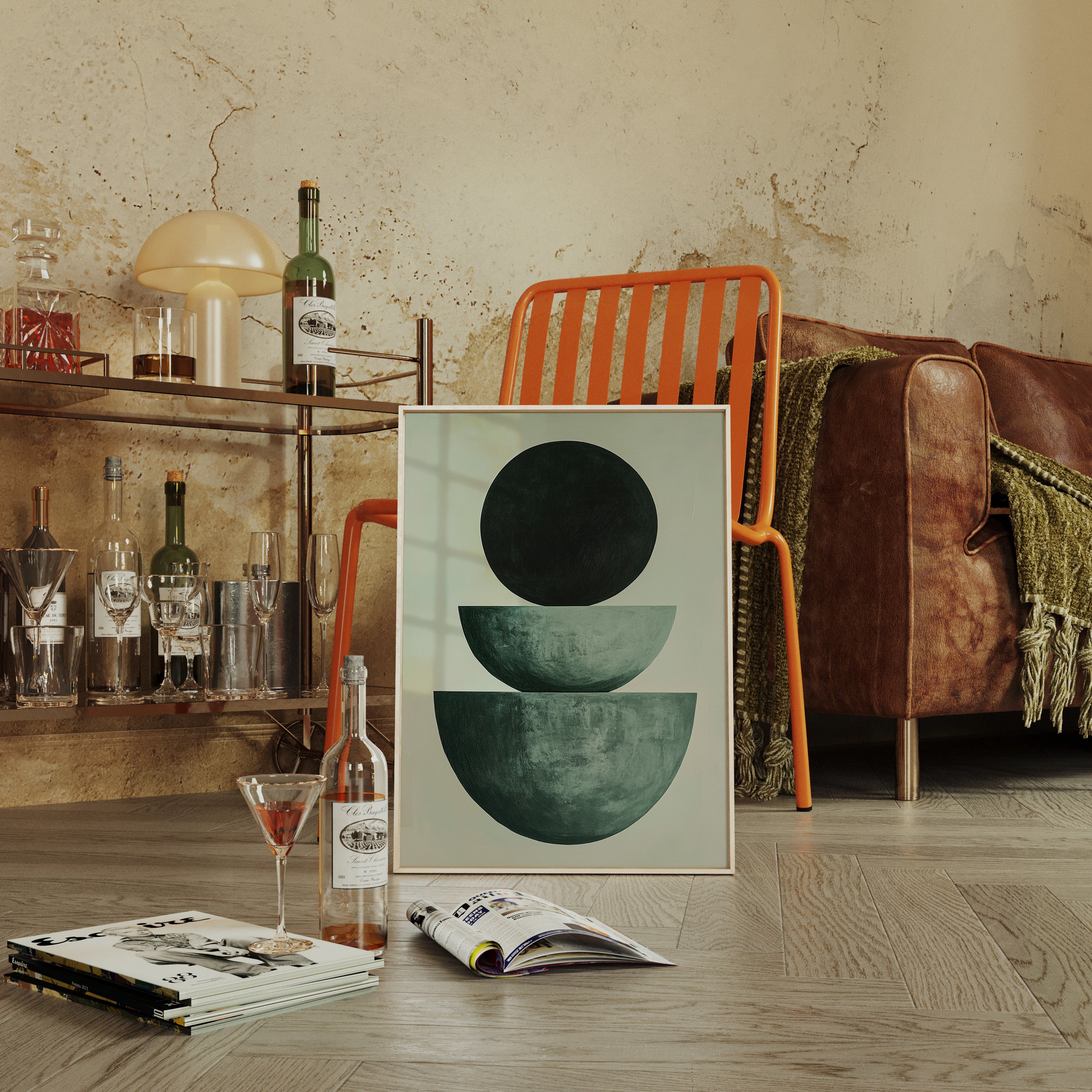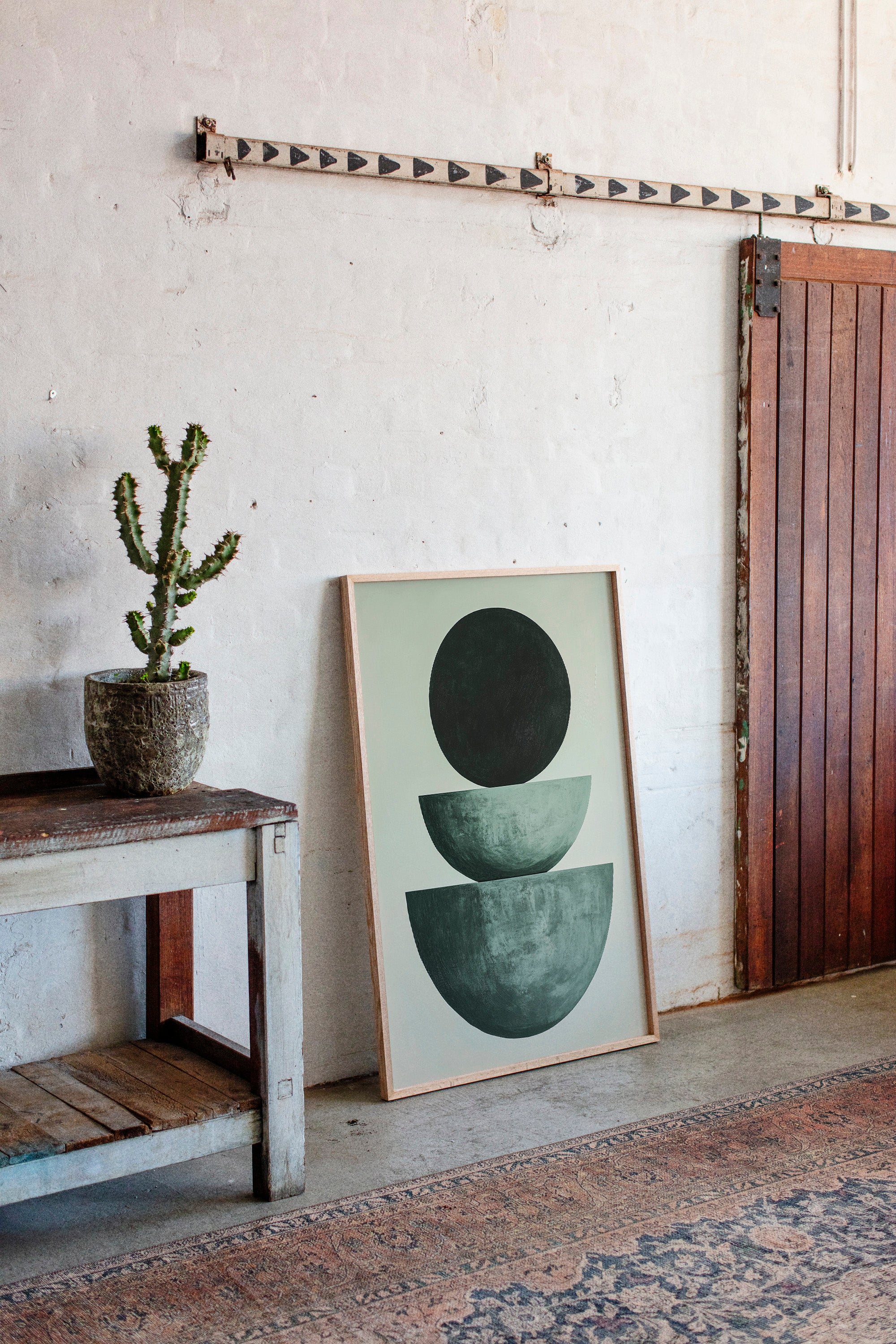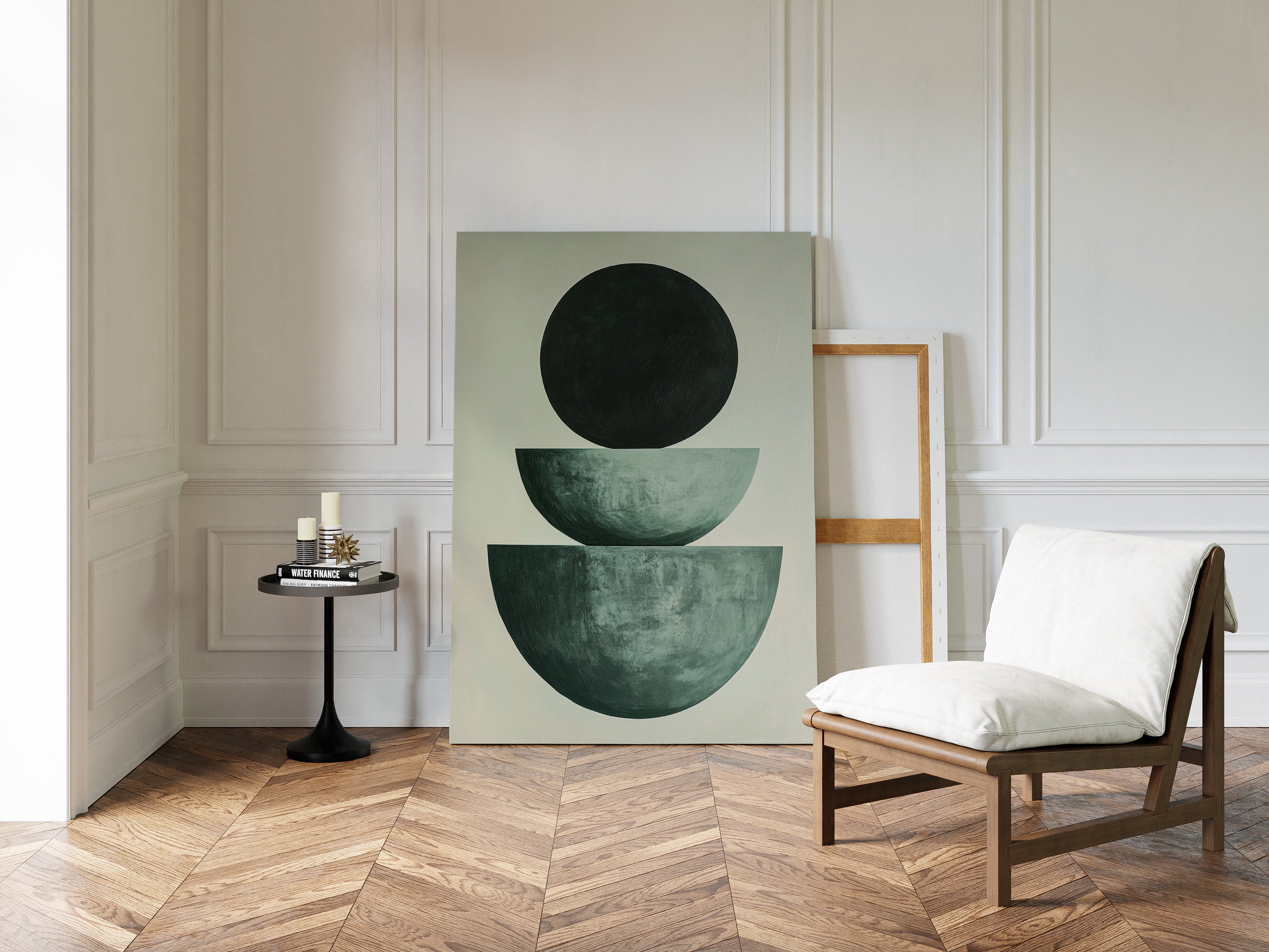 A mesmerizing dance of geometric harmony unfolds in shades of deep forest green and misty sage. Three circular forms stack with deliberate poise - a solid sphere crowning two ascending bowls, their surfaces bearing the gentle marks of time and texture. The composition speaks of meditation and mindfulness, where each element knows its place in the greater whole. Perfect for a minimalist meditation room or a contemporary living space seeking tranquility through clean lines and organic forms.