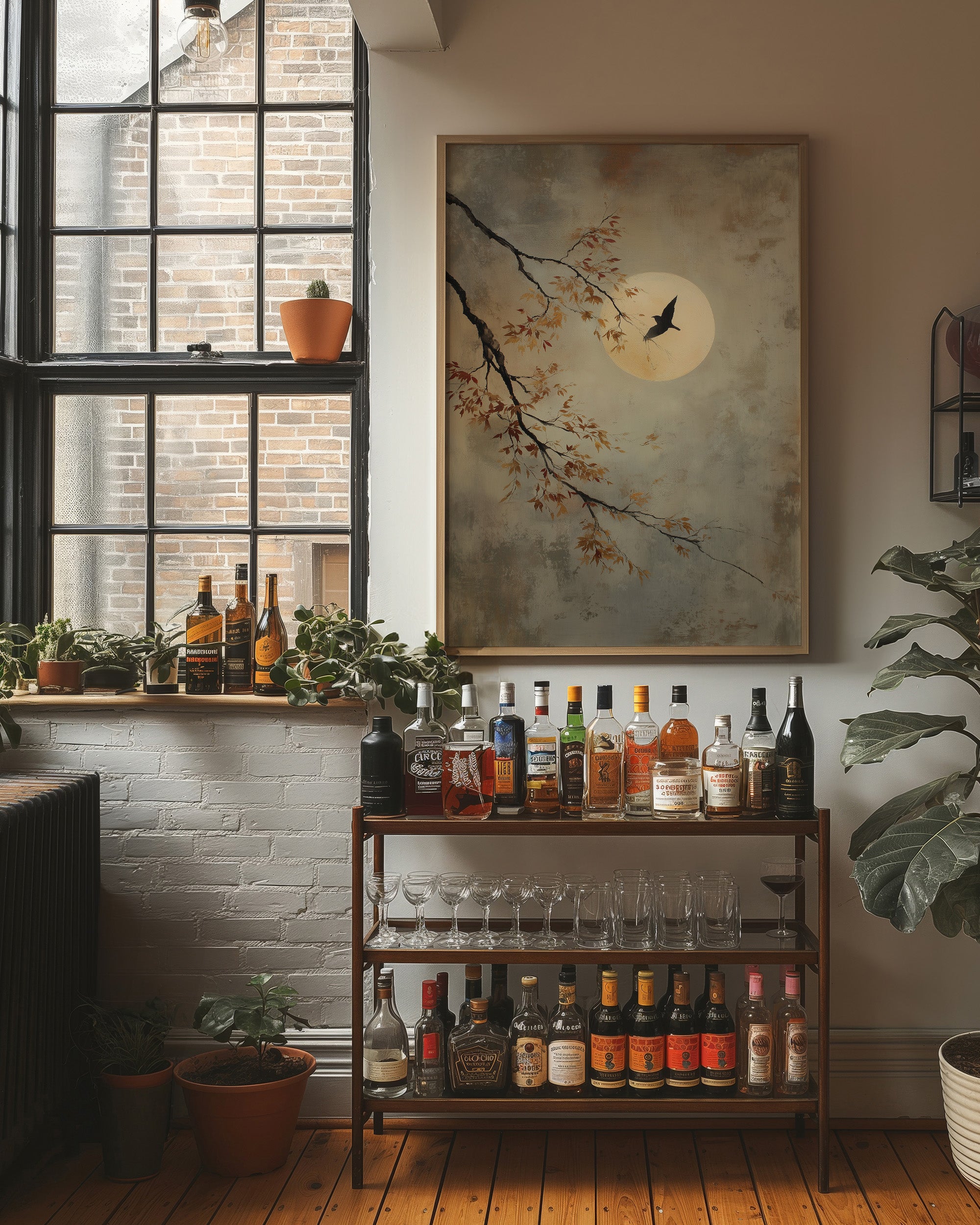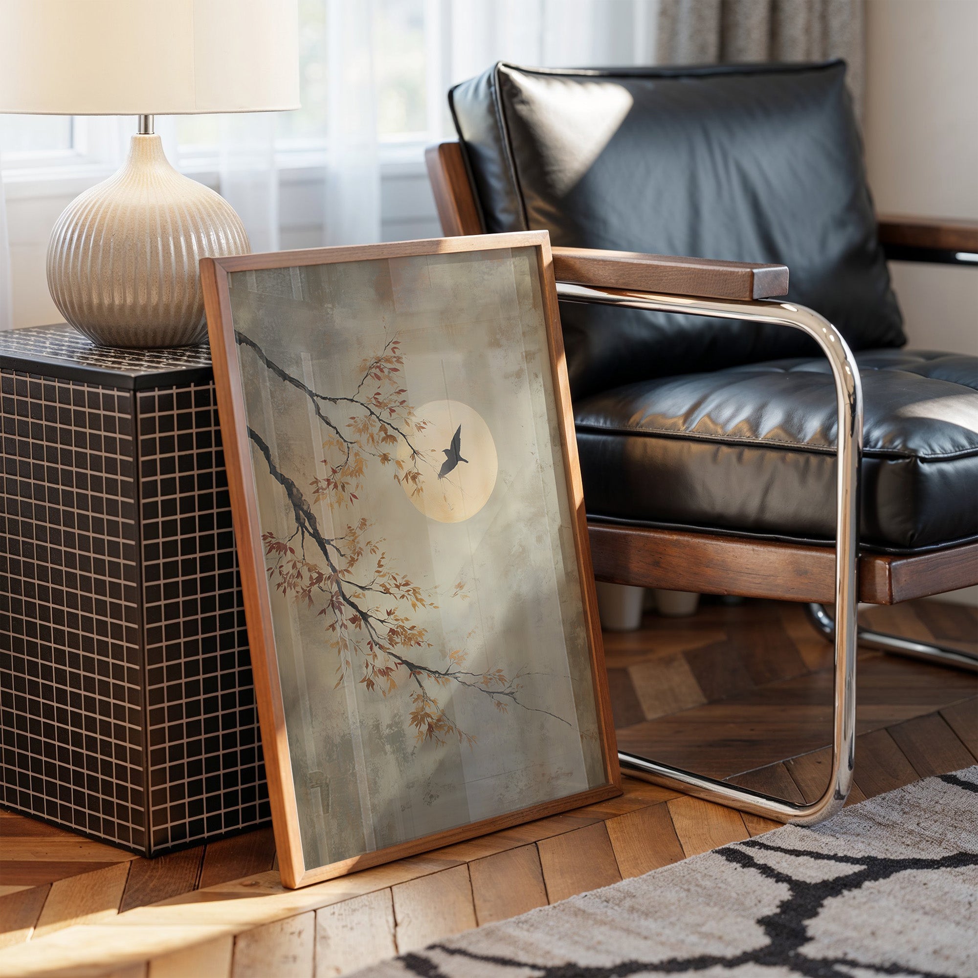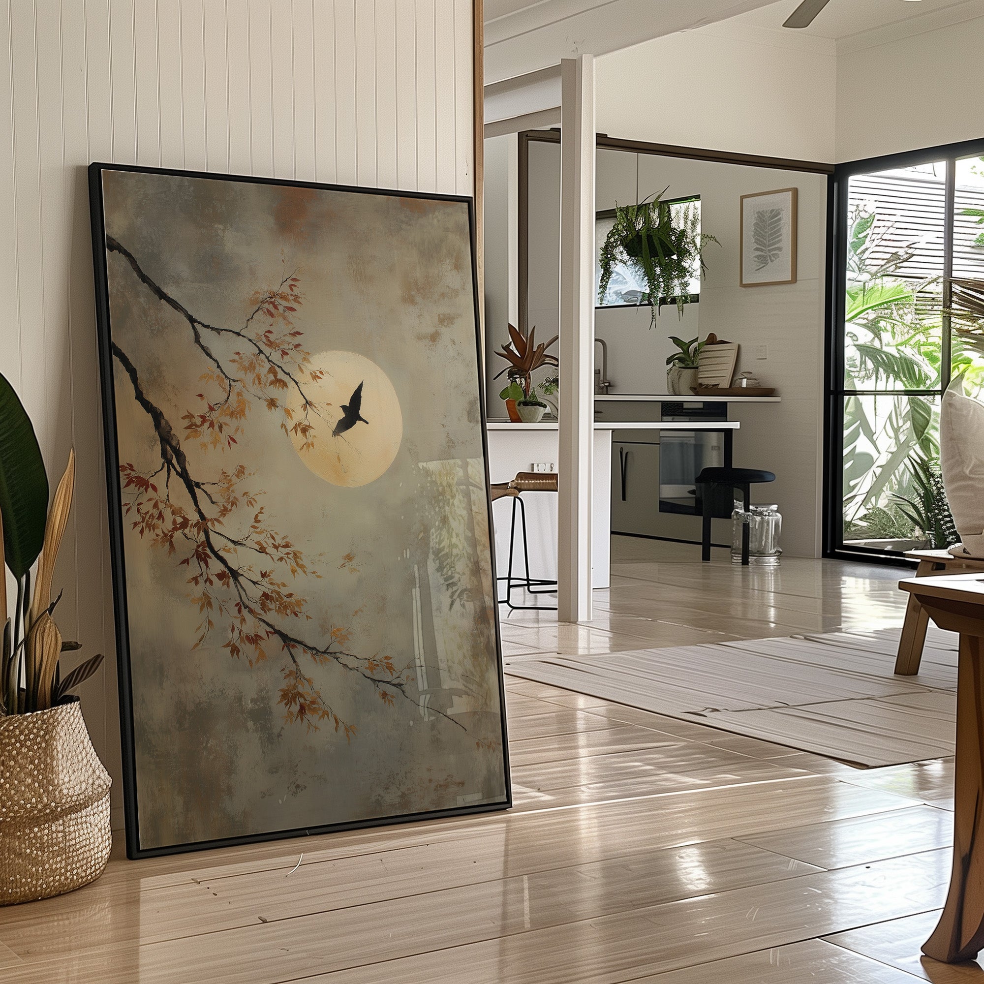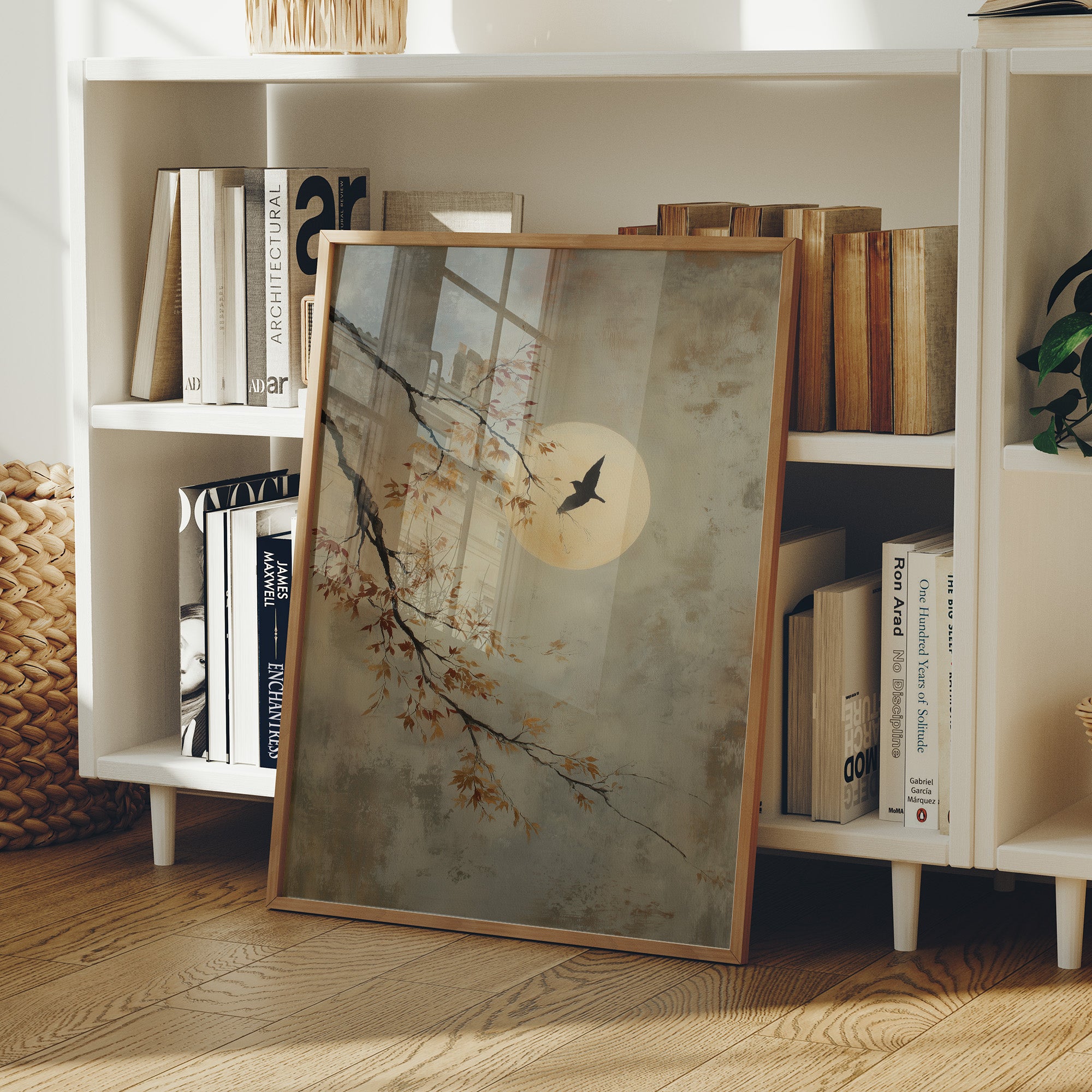 A solitary bird takes wing across a luminous full moon, its silhouette stark against the ethereal glow. Delicate autumn leaves dance along a graceful branch, their copper hues warming the misty grey atmosphere. The composition speaks to quiet moments of transformation, where nature's simple elements create profound poetry. This serene piece would bring contemplative beauty to a reading nook or meditation space, creating a window to tranquil evening moments.