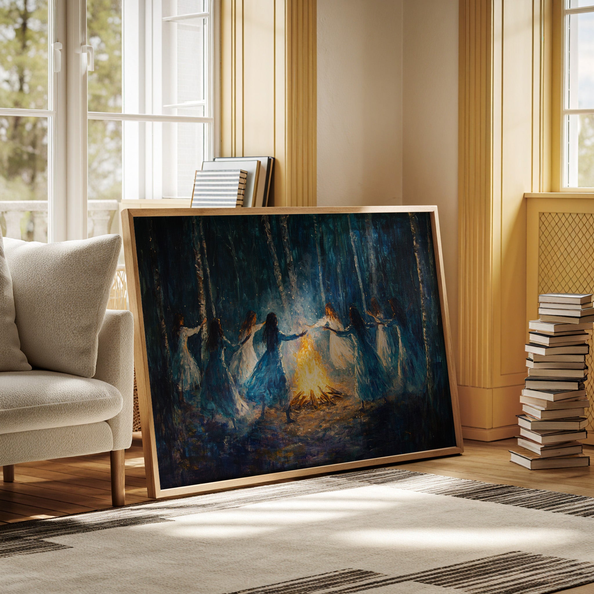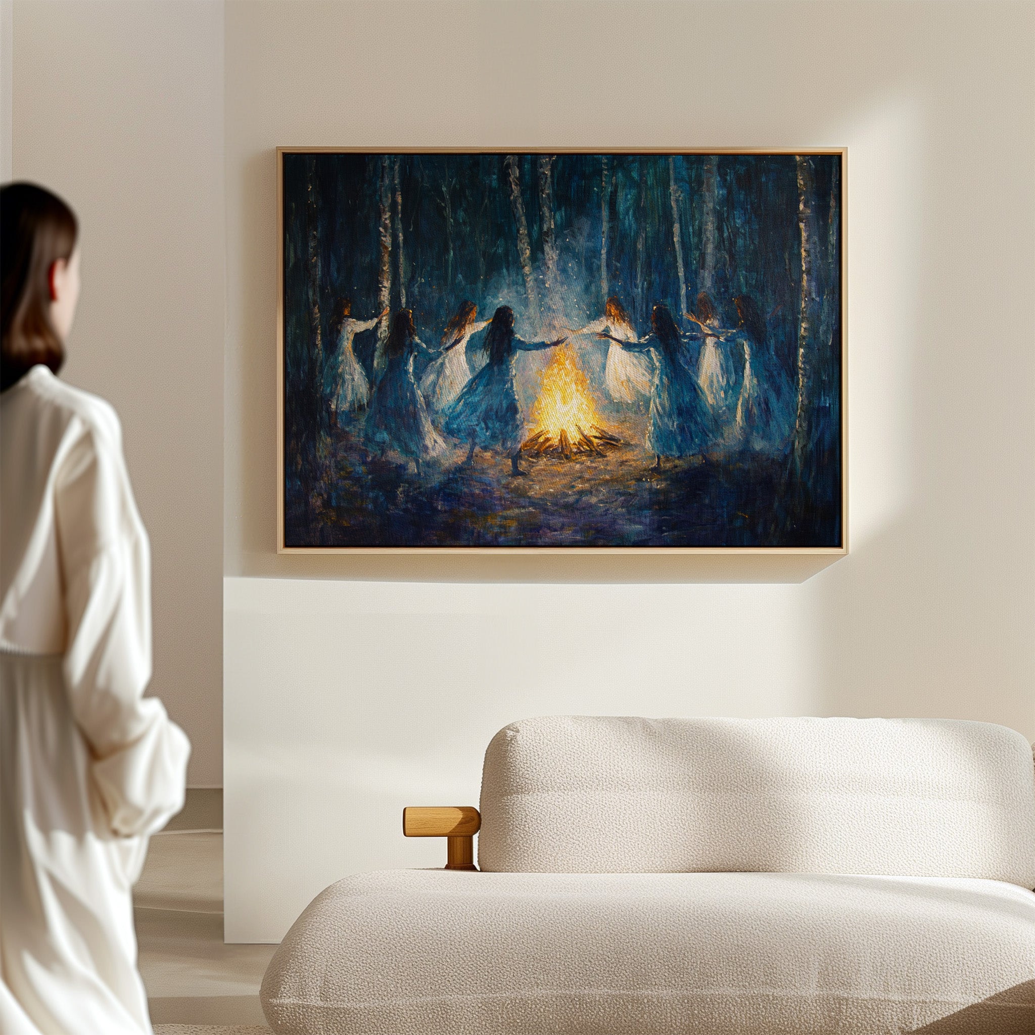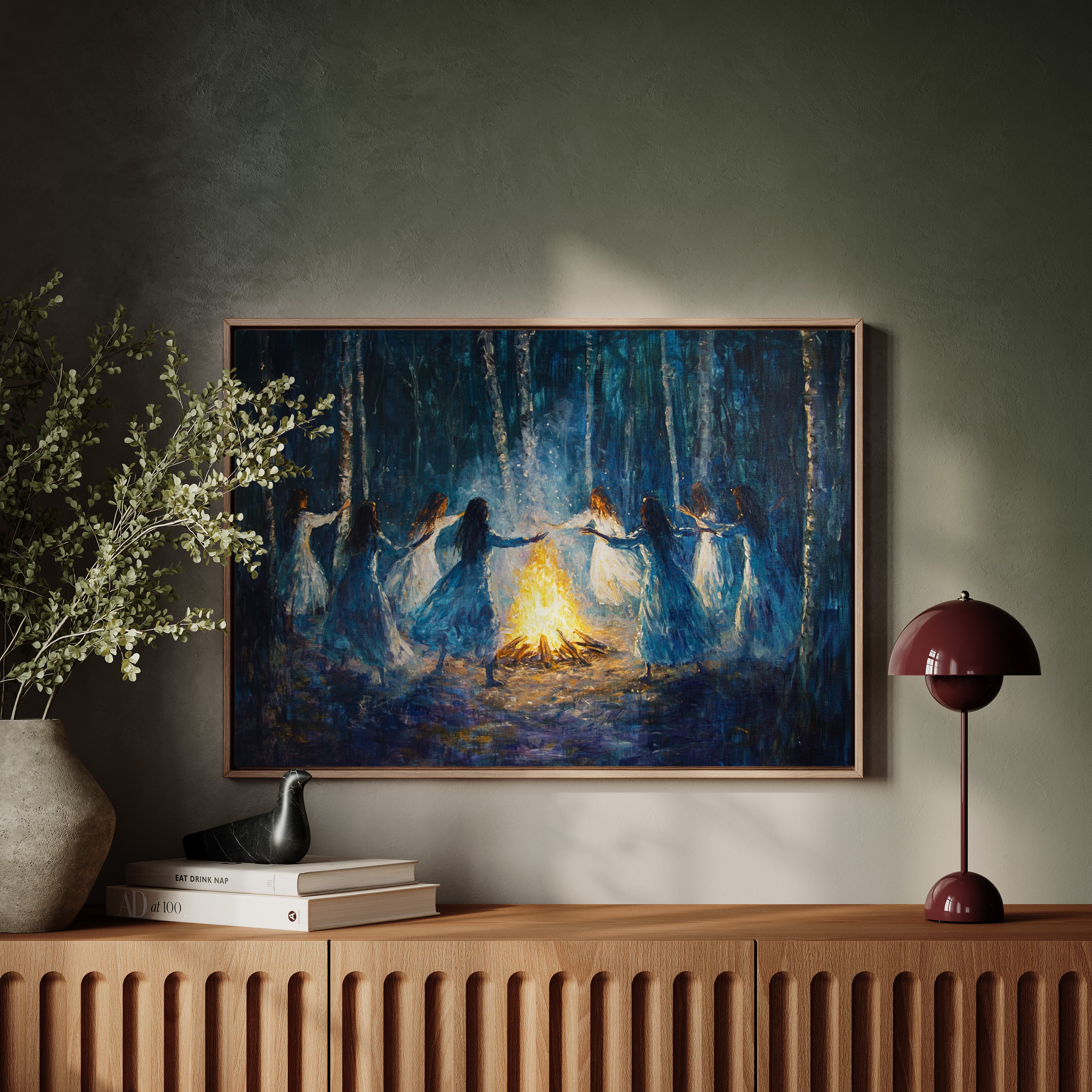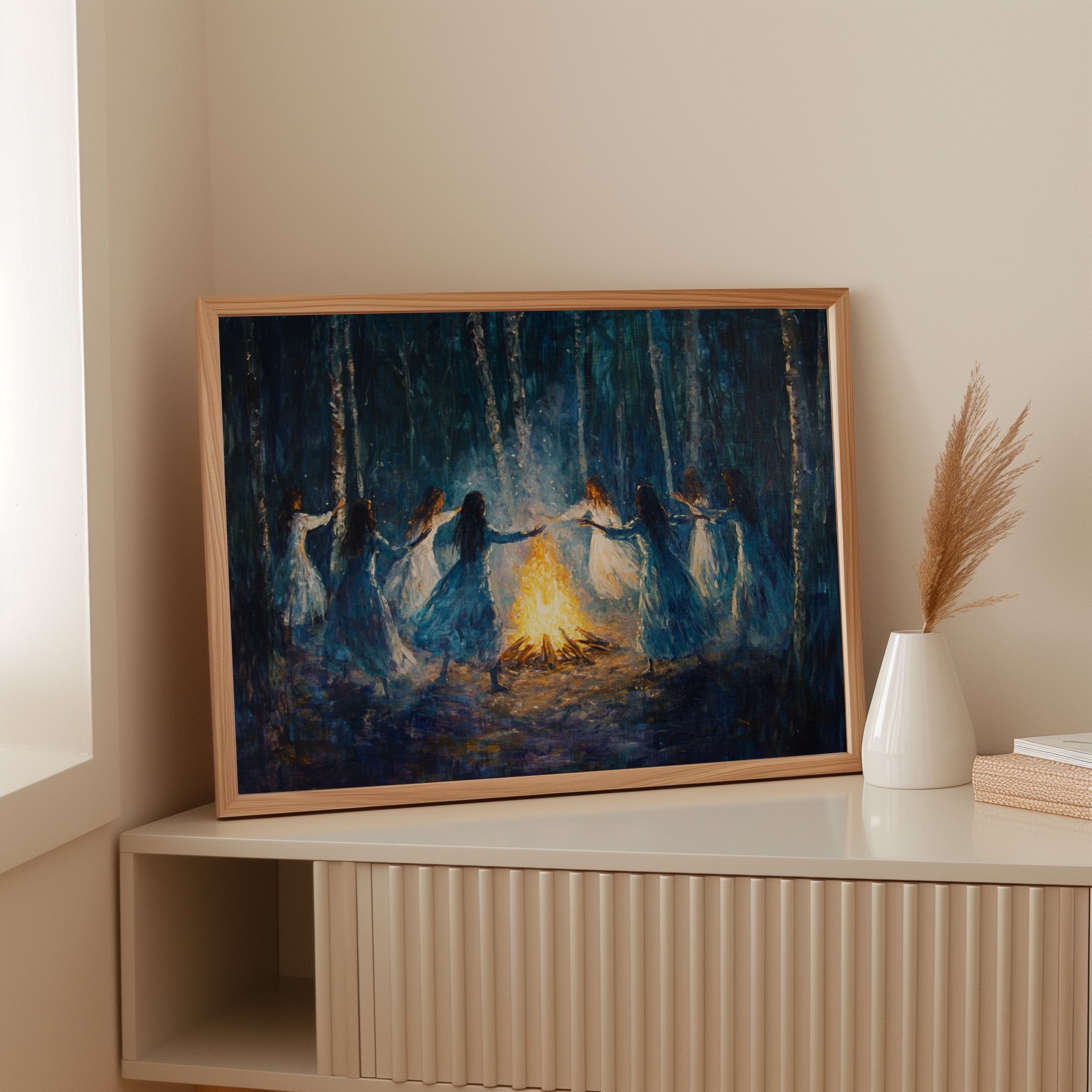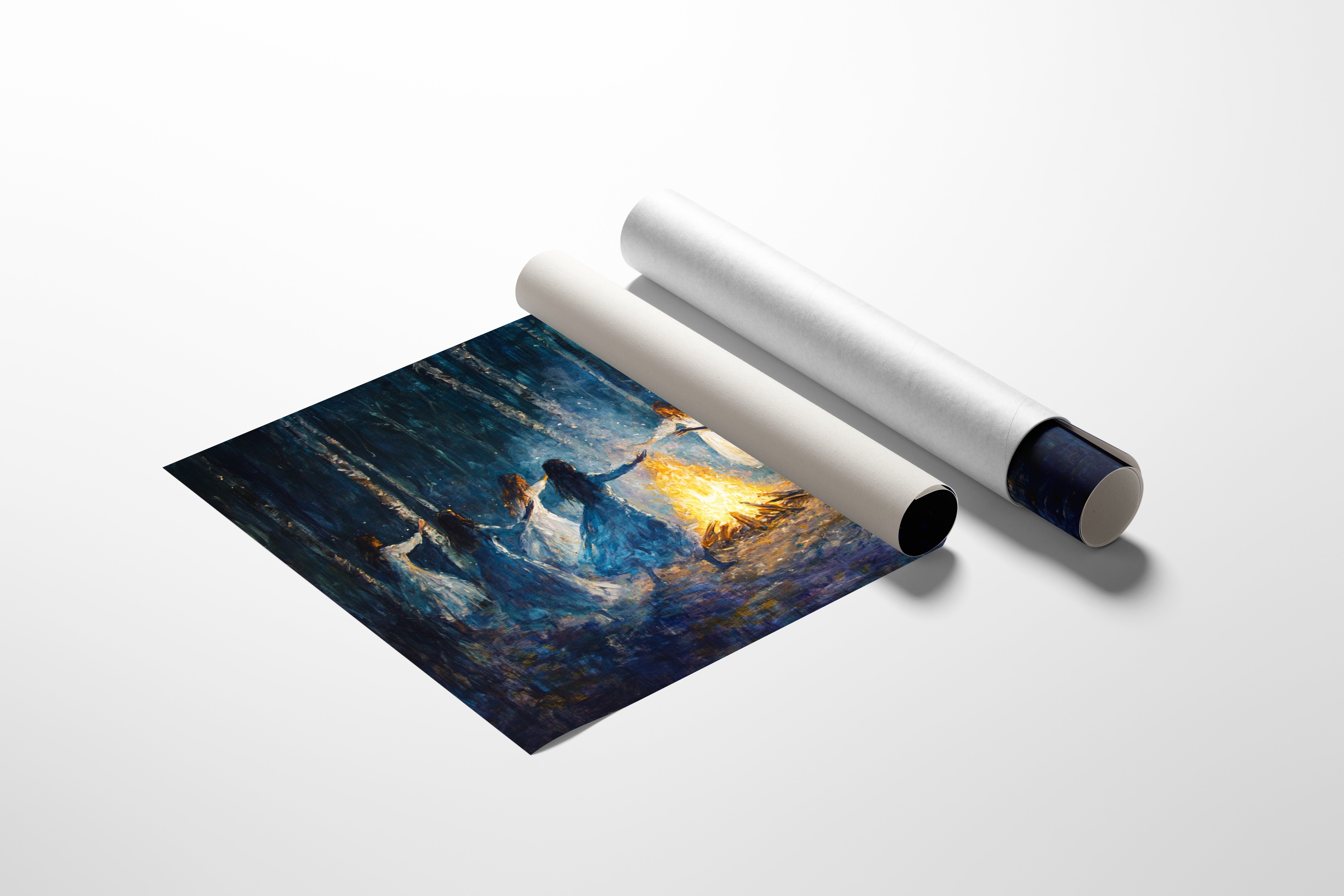 In the depths of a midnight forest, white-clad figures move in an ethereal circle, their forms illuminated by the warm glow of a central bonfire. The deep blues and indigos of the surrounding birch forest create a mystical atmosphere, while golden flames pierce the darkness with primal energy. Each dancer's dress catches the firelight, creating a mesmerizing display of shadow and radiance against the mysterious woodland backdrop. The scene captures a moment of ancient ritual and collective celebration, where the boundary between earth and sky seems to blur.