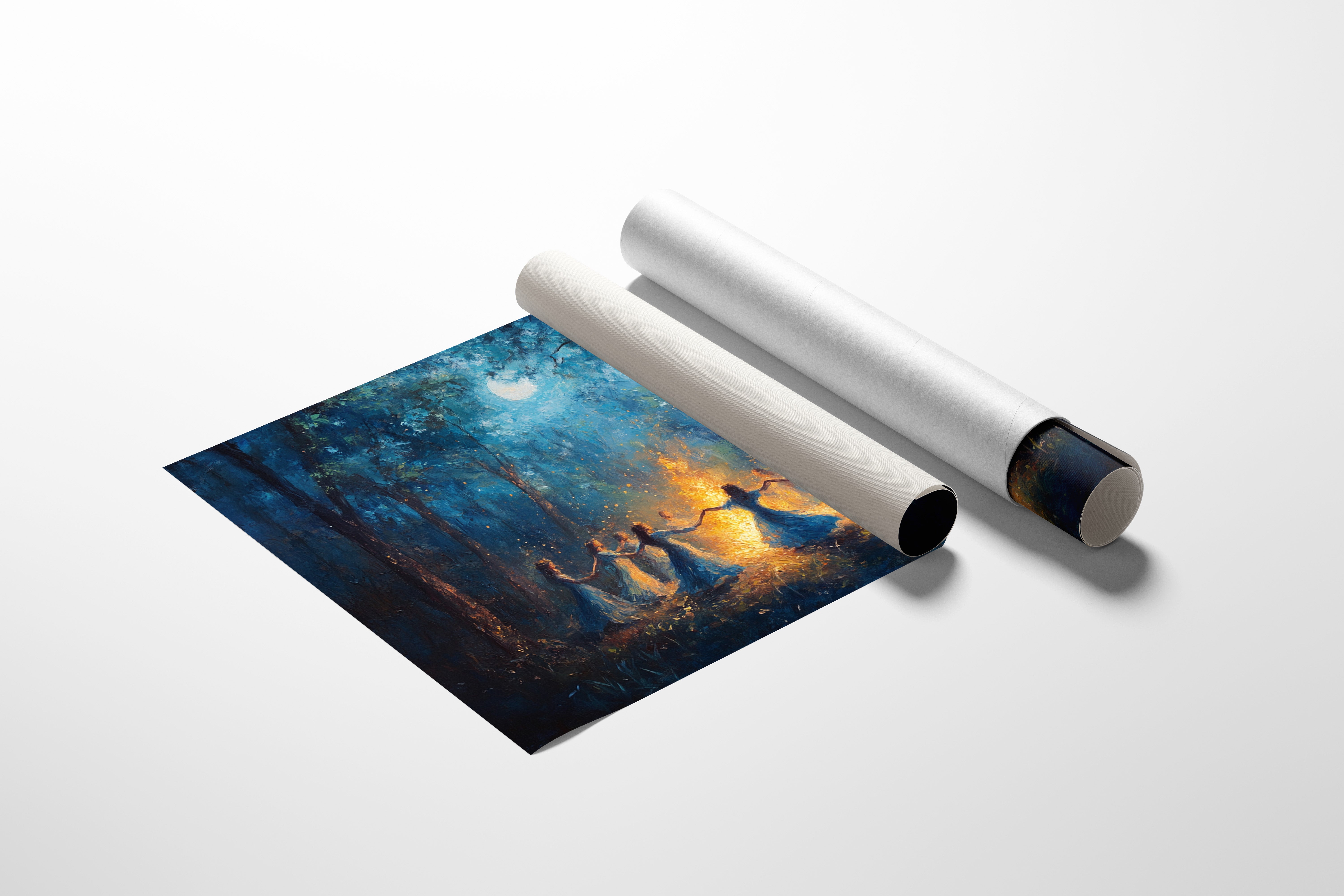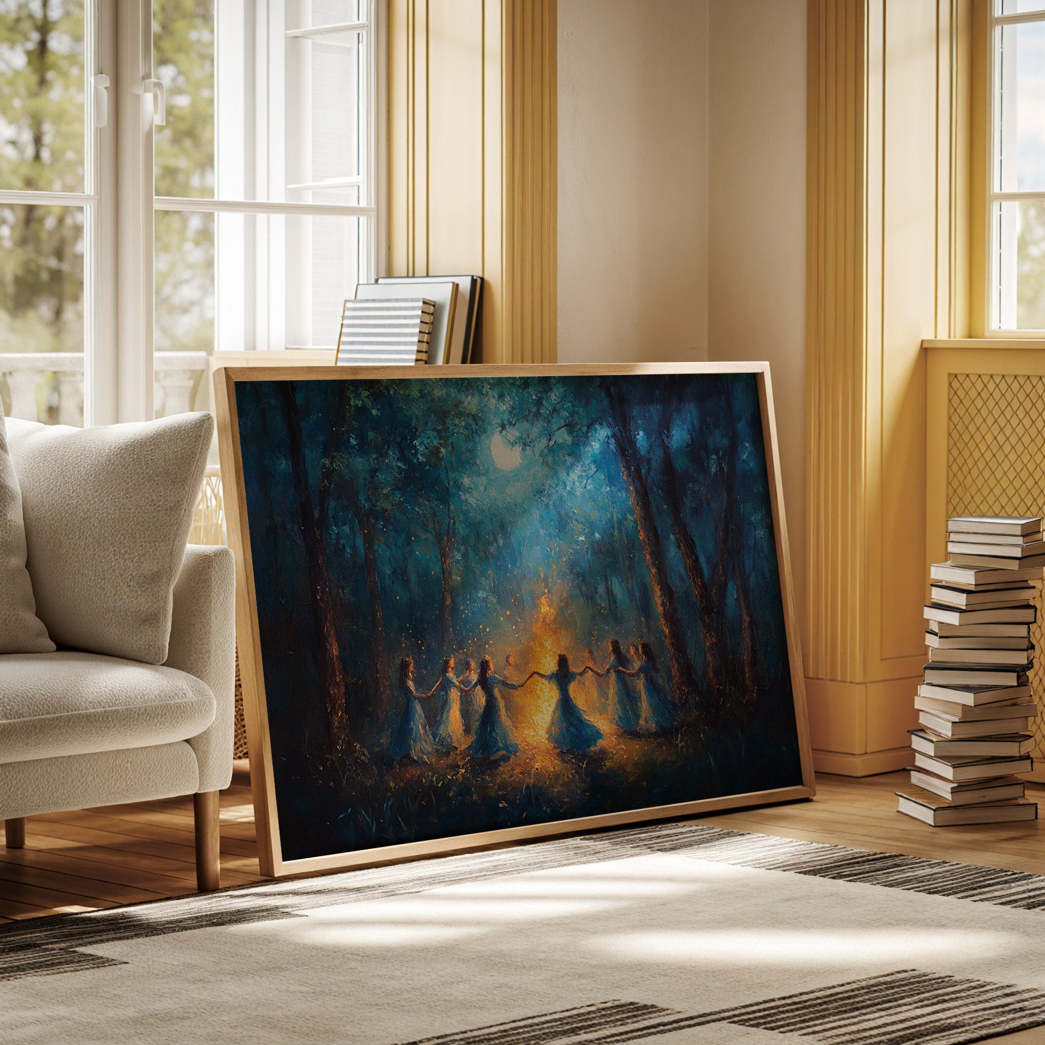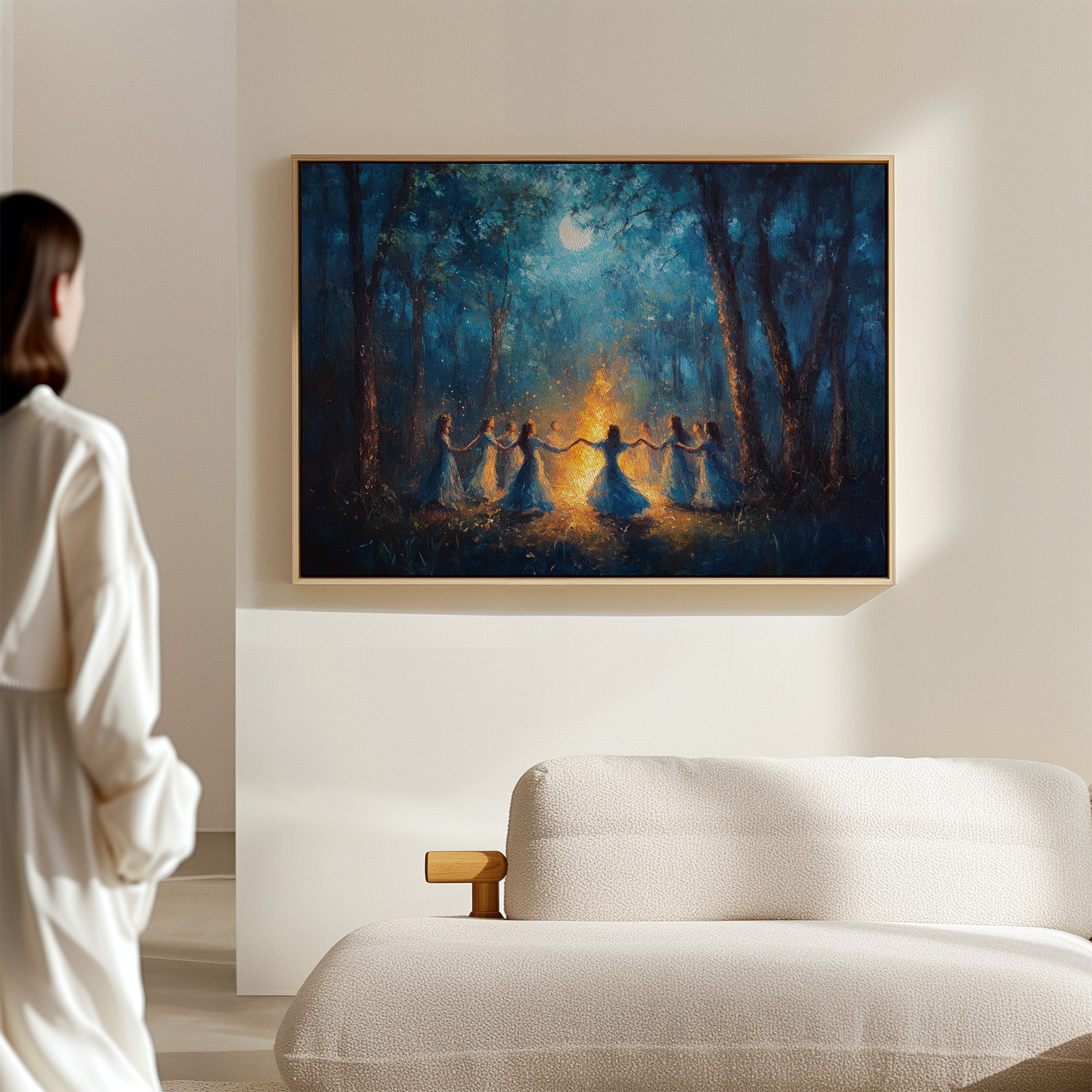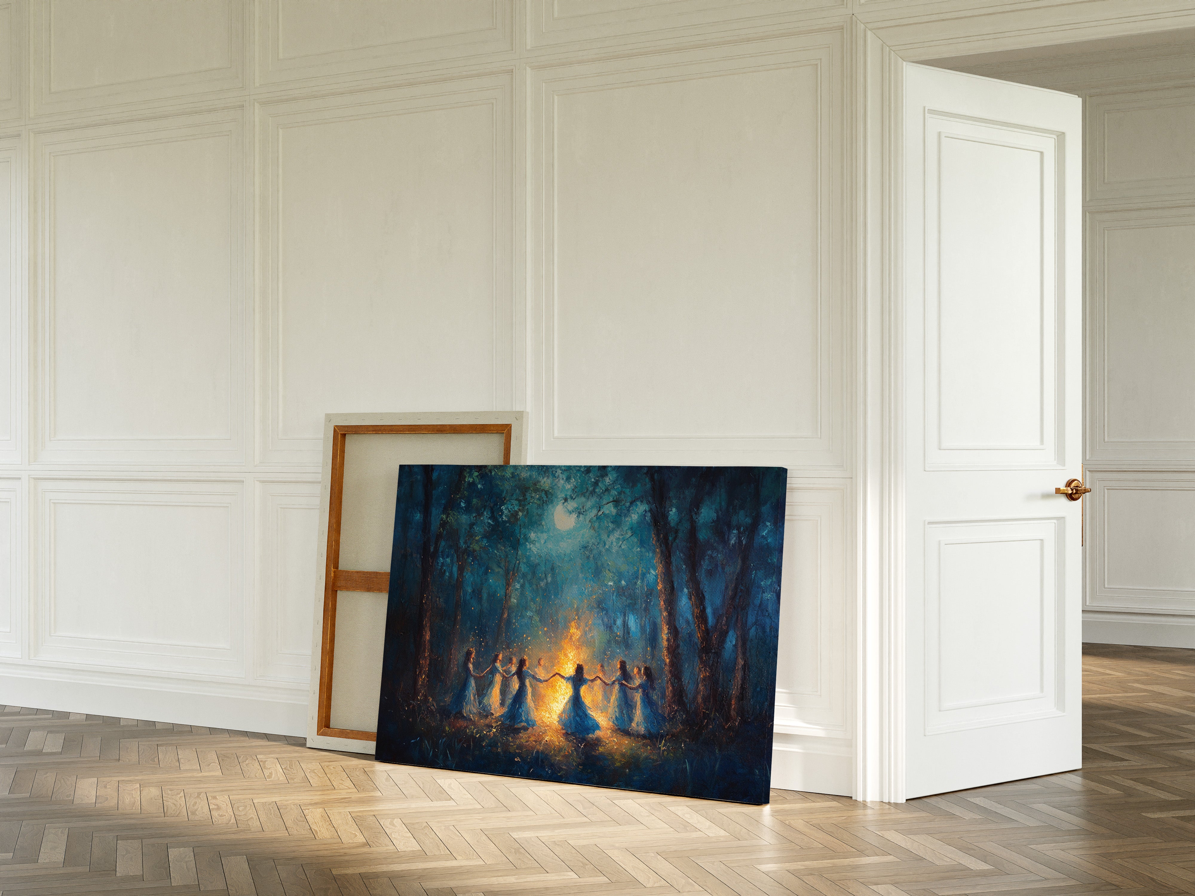 Firelight dances with starlight as figures move in perfect harmony around a glowing bonfire. The deep blues of the midnight forest create a mystical backdrop, while golden flames cast enchanting shadows through the ancient trees. Flowing dresses catch the ethereal light, creating a mesmerizing display of movement and grace against the darkness. The full moon above bathes the scene in silvery light, completing this magical moment where nature and ritual unite. This captivating piece brings a touch of mysticism and wonder to spaces seeking connection with ancient traditions and natural rhythms.