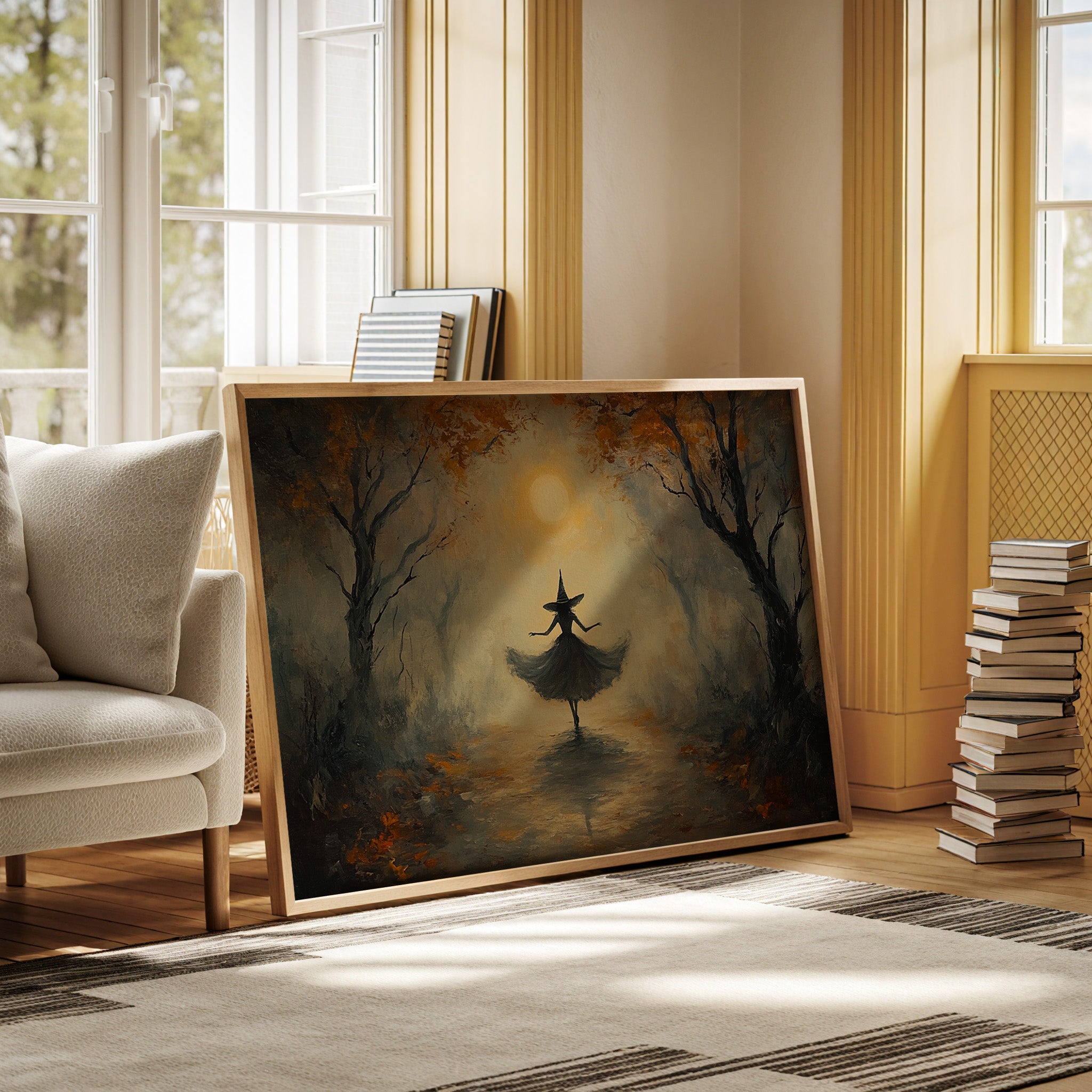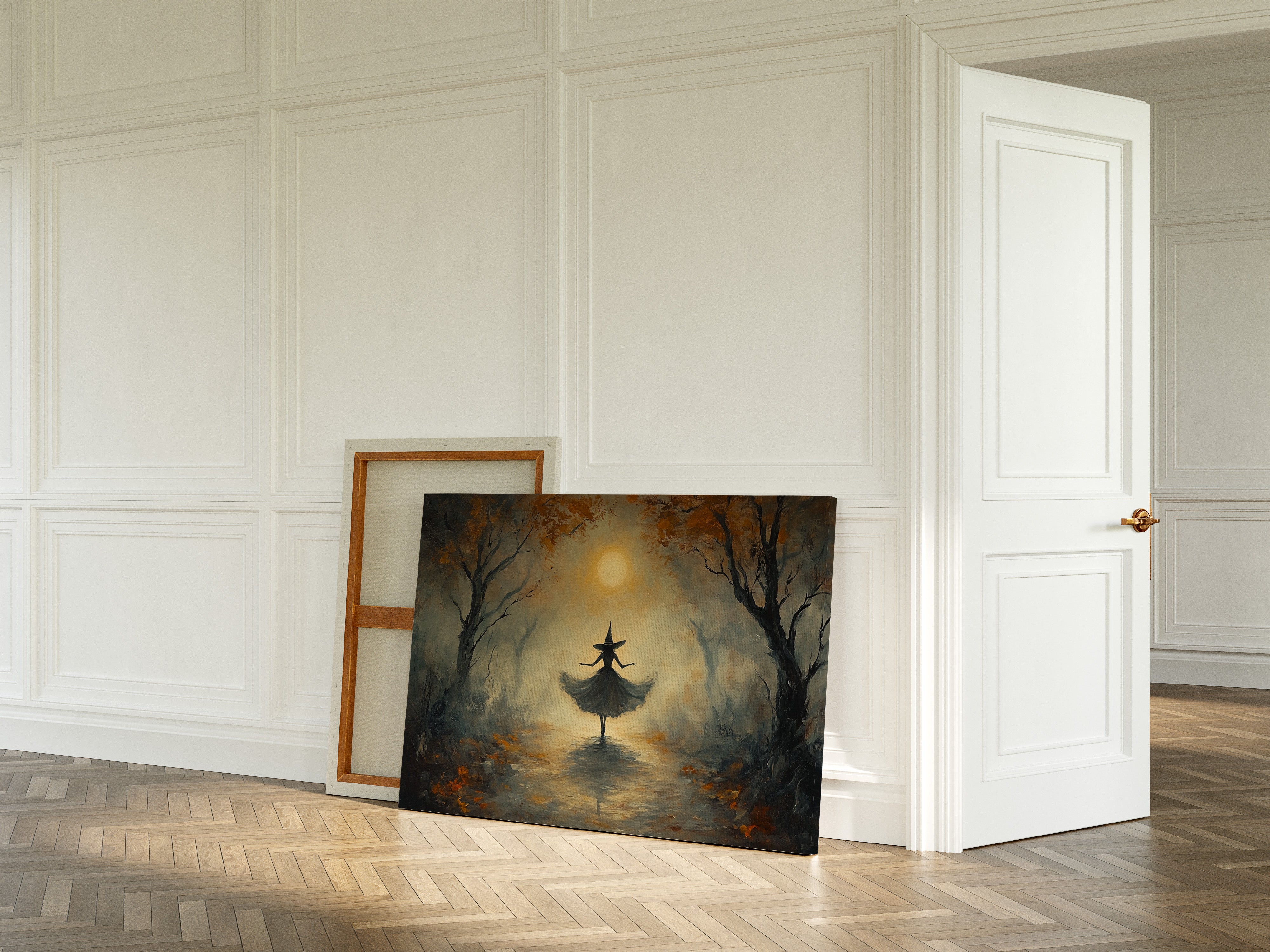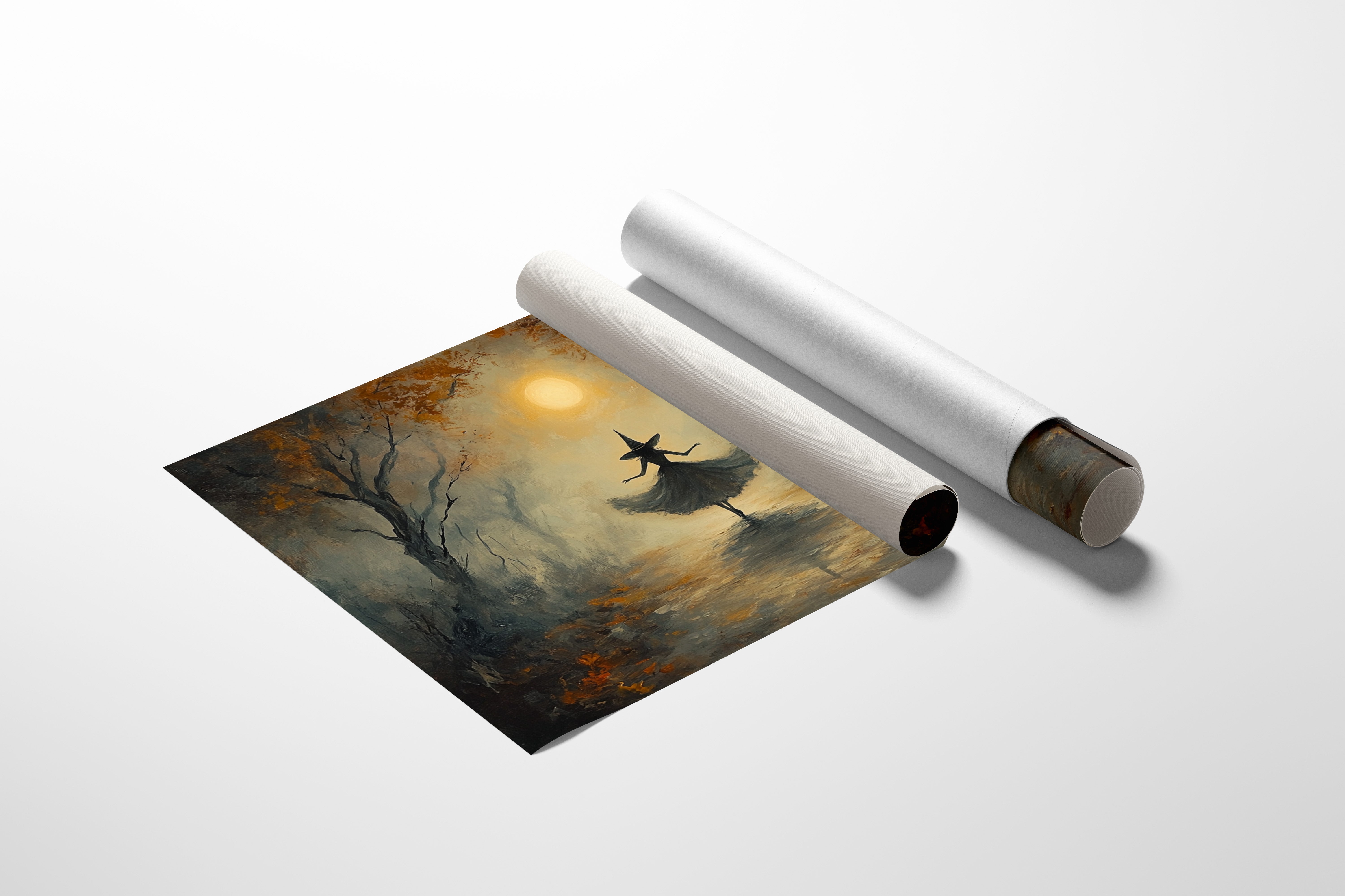 A solitary figure twirls beneath a luminous harvest moon, her dress flowing like midnight silk against the golden sky. Dark trees frame the scene, their branches reaching with gnarled fingers while autumn leaves scatter in burning orange hues. The mysterious dancer casts a delicate reflection on the misty ground, creating an ethereal mirror between earth and sky. This enchanting scene captures a moment of pure magic, where reality blends with fantasy in the depths of an October evening. Perfect for adding a touch of whimsical mystery to a reading nook, bedroom, or any space meant for dreaming.