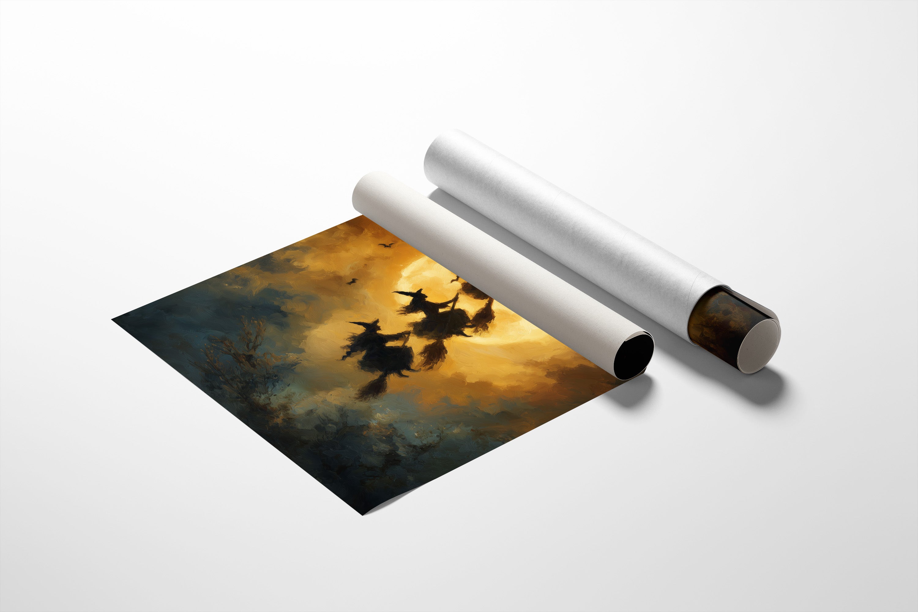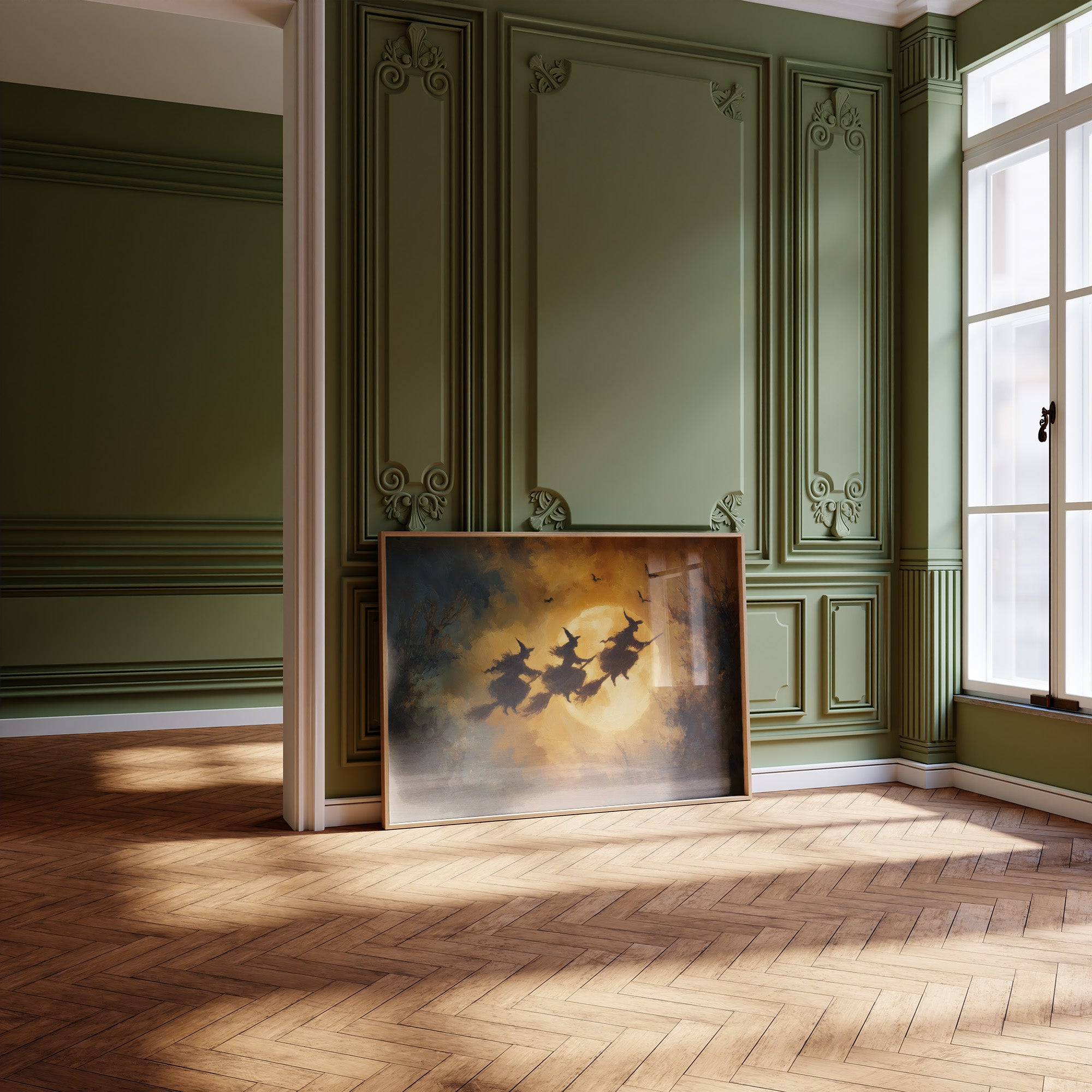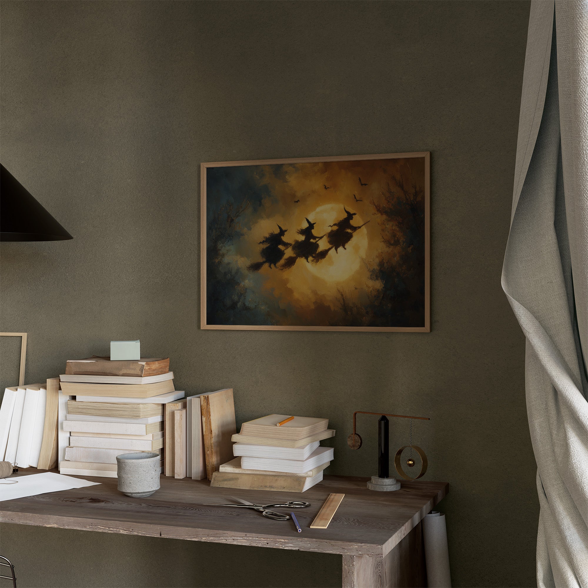 Amber light pools around silhouettes dancing across the night sky, casting an enchanted glow through the scholarly space. The framed painting captures witches on broomsticks silhouetted against a luminous full moon, their mysterious journey set against swirling autumnal hues of gold and deep blue. The contrast between the mystical artwork and the orderly rows of books behind creates a perfect tension between knowledge and folklore.