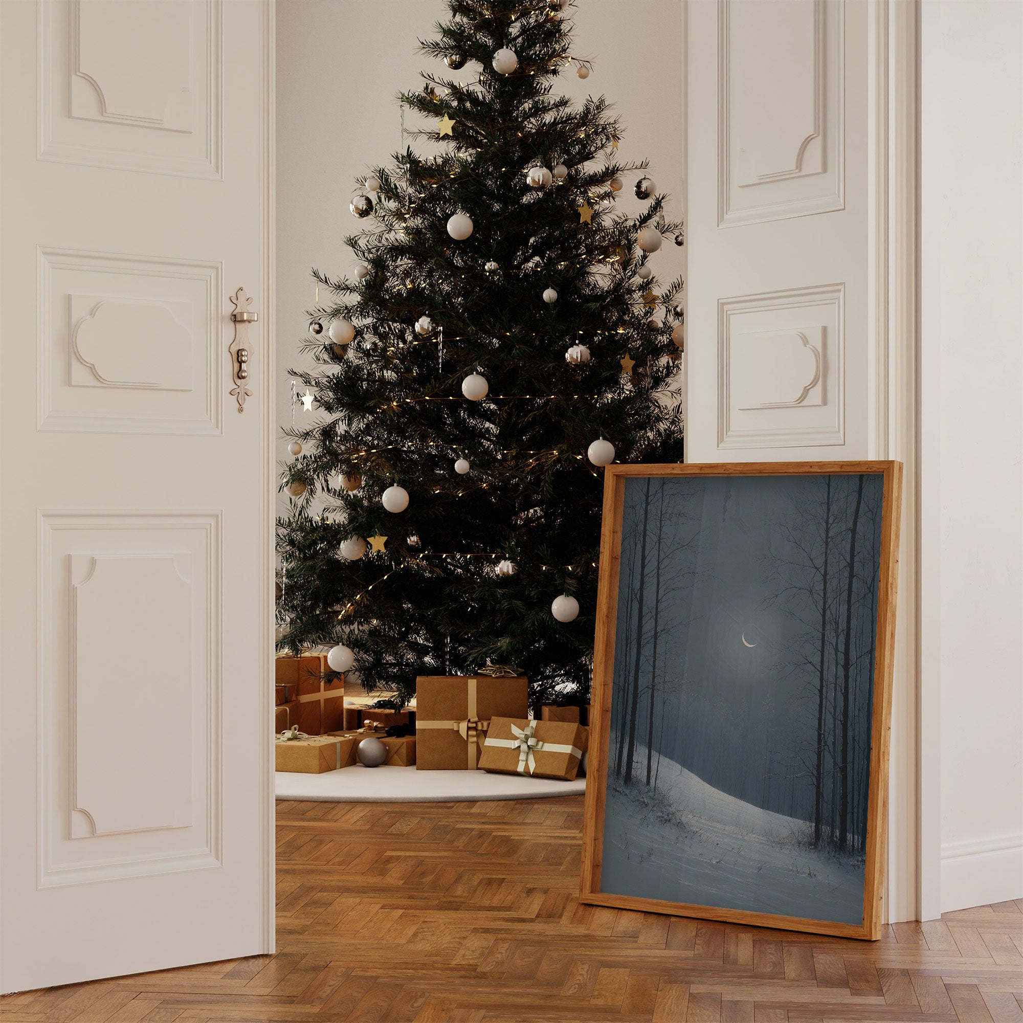 A crescent moon hangs delicately in a misty winter sky, casting ethereal light through bare forest branches. The scene captures the quiet solitude of a snow-covered woodland path, where dark tree silhouettes stand sentinel against the deep blue twilight. This peaceful winter landscape provides a striking contrast to the warm, festive holiday setting it's displayed in, surrounded by a glowing Christmas tree and elegantly wrapped presents. Perfect for creating a serene focal point in a modern living room or adding a touch of wintry tranquility to a cozy reading nook.