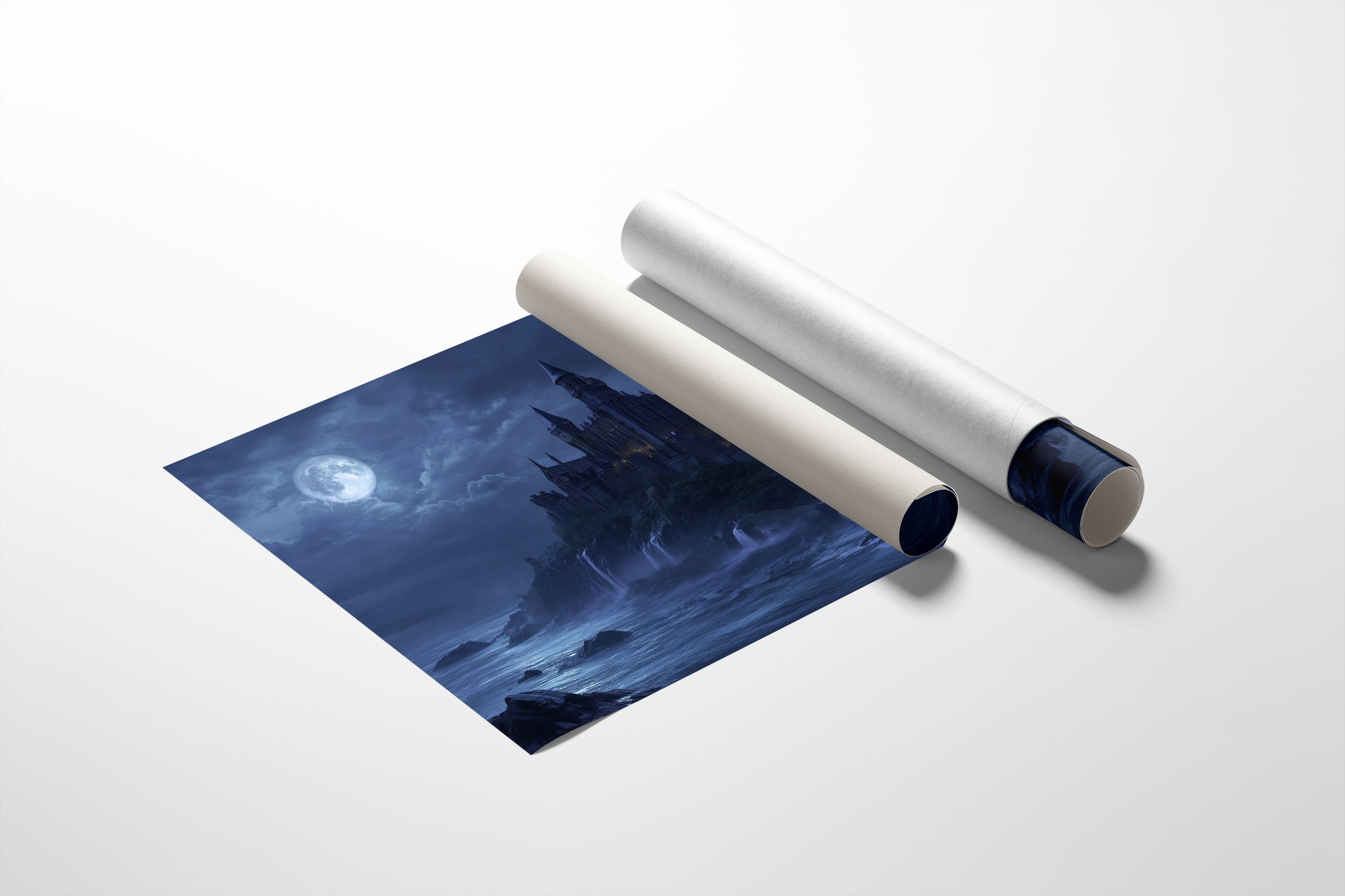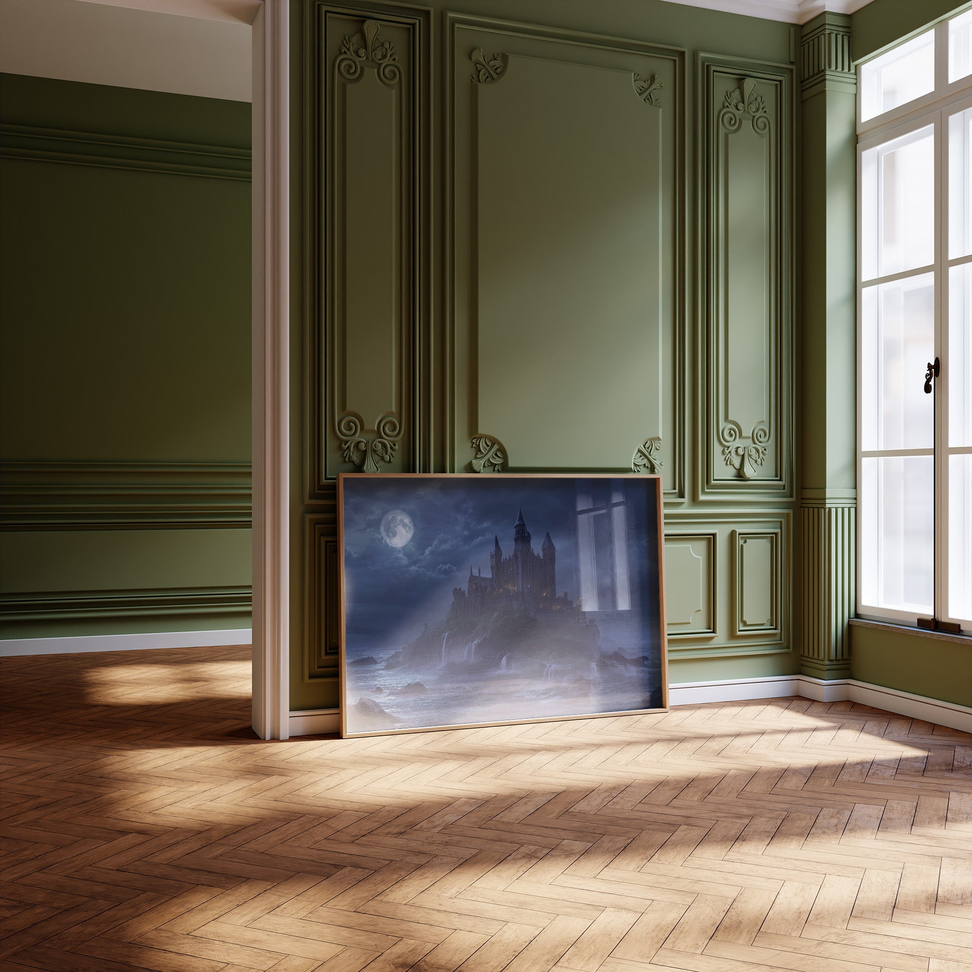 A mysterious castle perches on a rocky cliff, illuminated by an ethereal full moon that pierces through midnight clouds. The medieval fortress stands defiant against crashing waves and cascading waterfalls that tumble from its base into the turbulent ocean below. Displayed elegantly against a backdrop of well-stocked bookshelves, this evocative scene creates a perfect focal point for a home library, study, or any space where literary imagination and dramatic atmosphere converge.