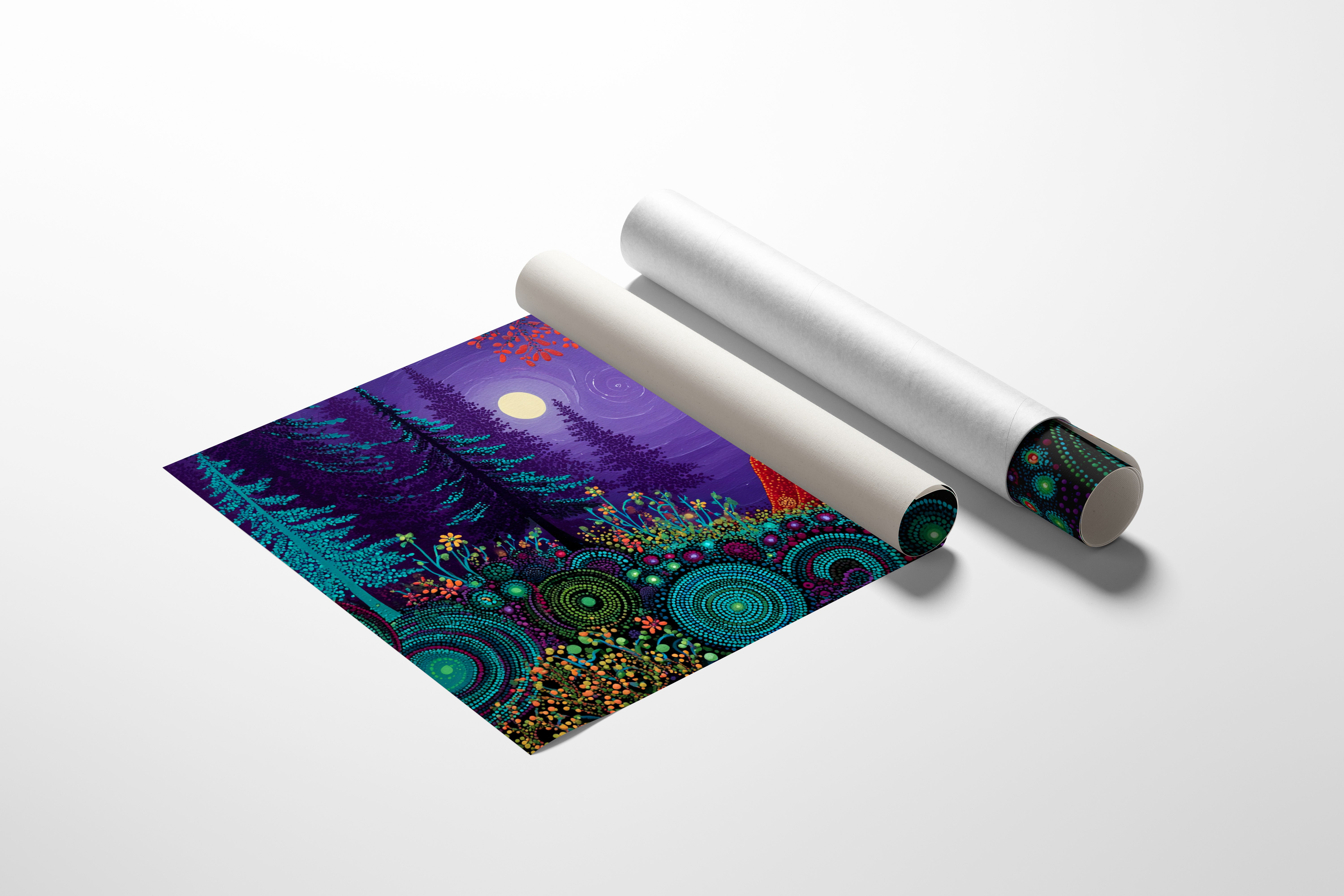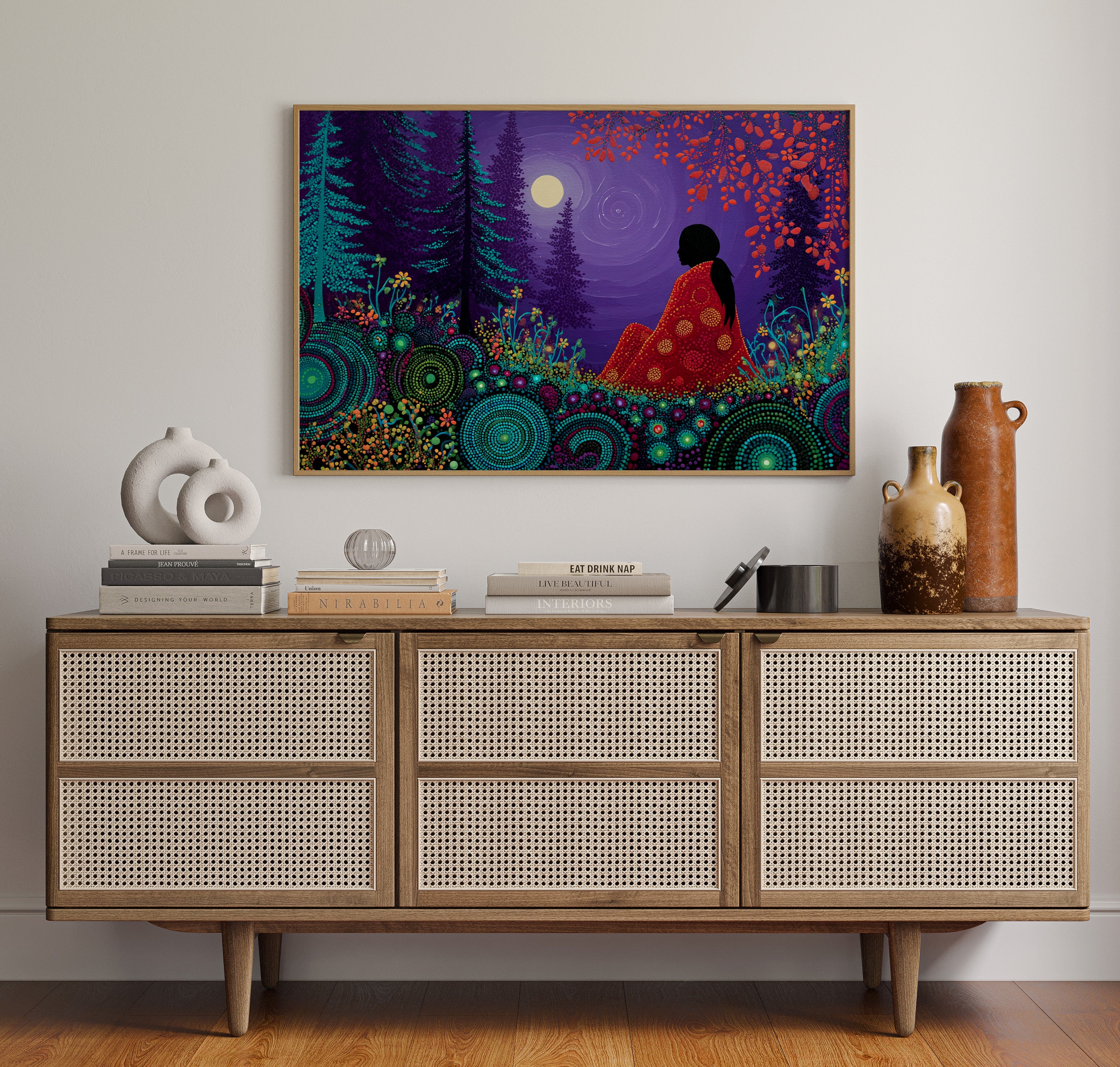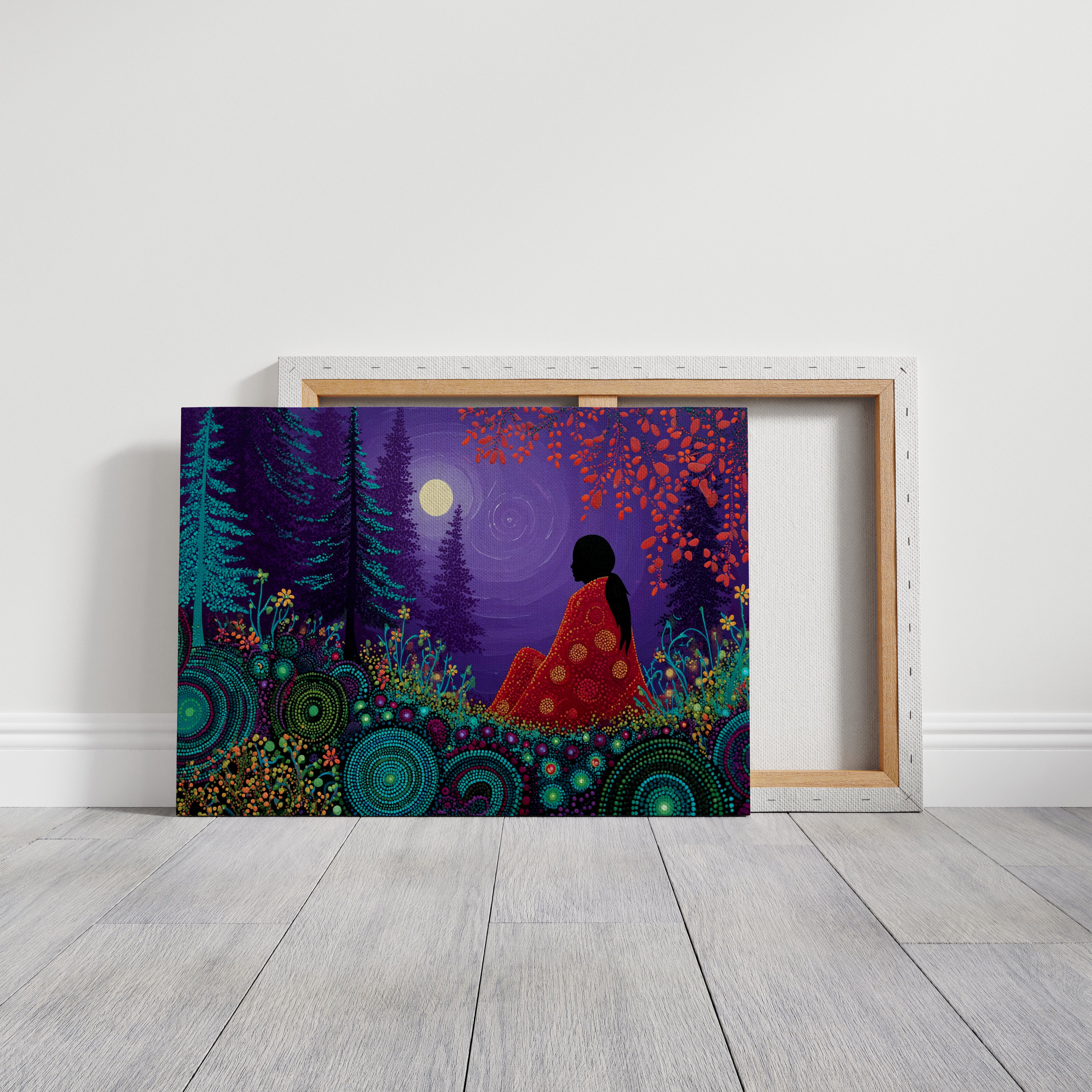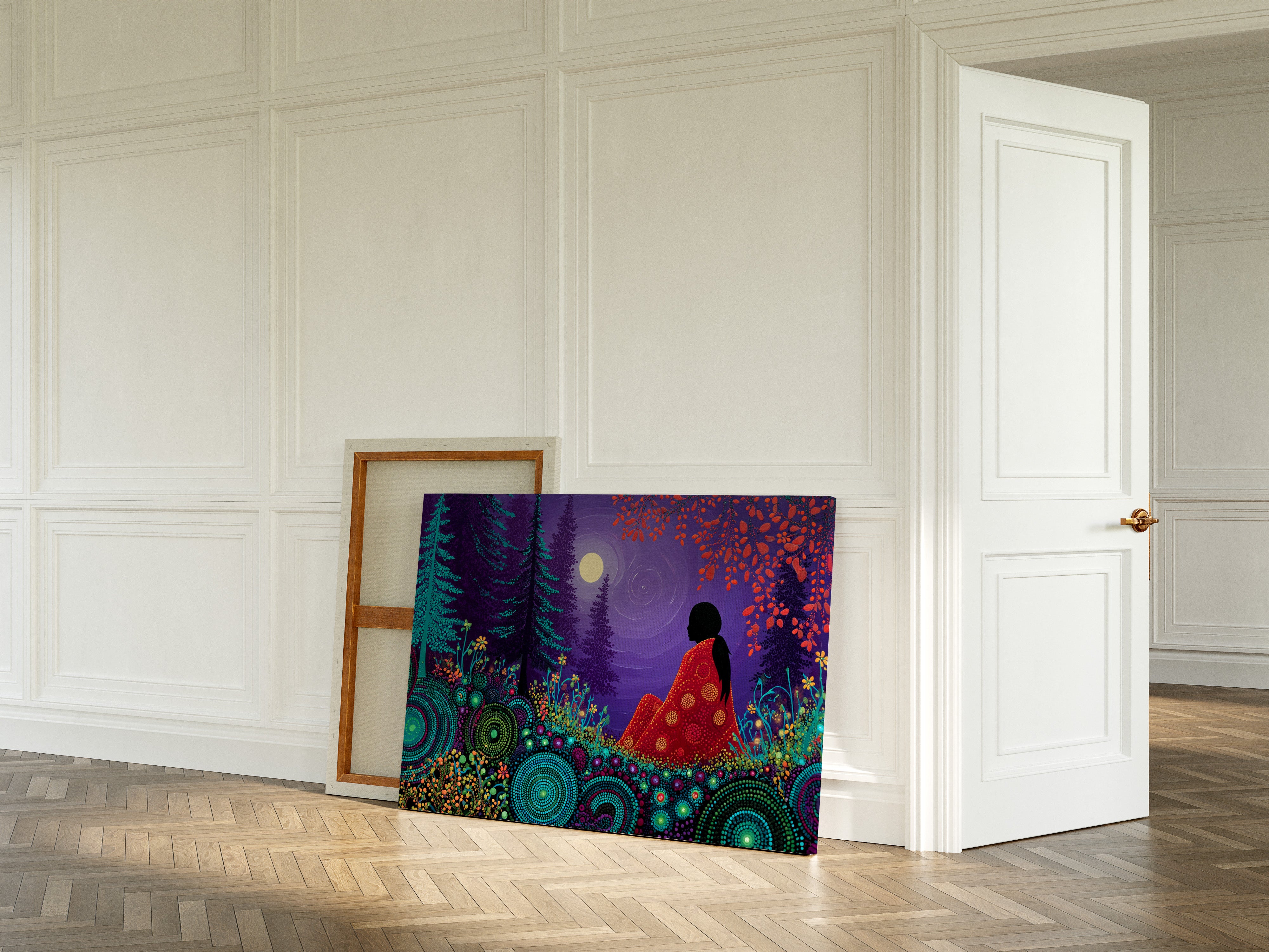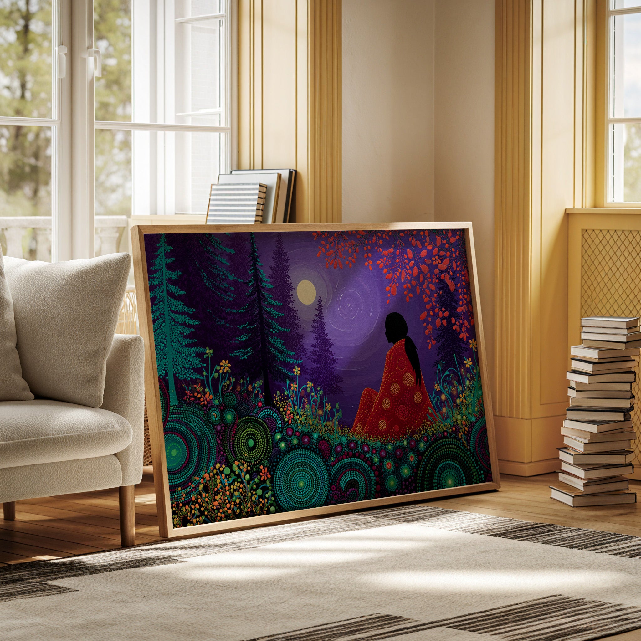 In the depths of a mystical evening, concentric circles of turquoise and emerald dance beneath a violet sky. The scene captures a moment of profound stillness, where dotted flowers and spiral patterns create an enchanted meadow beneath towering evergreens. A figure draped in a vibrant red patterned blanket contemplates the full moon, while coral-colored branches frame the ethereal scene. The artistic style merges Indigenous dot painting techniques with contemporary color relationships, creating a mesmerizing tapestry of nature and spirit.