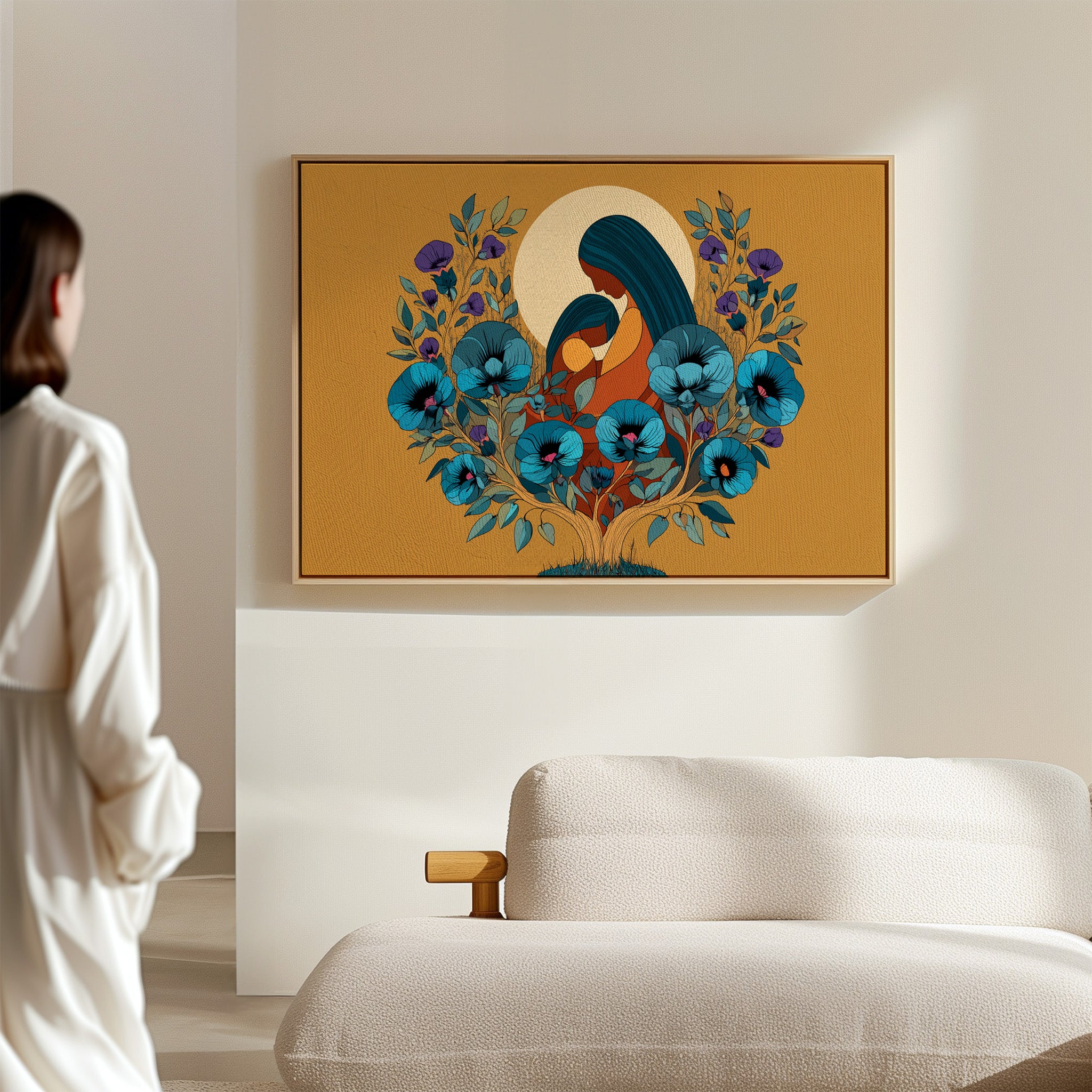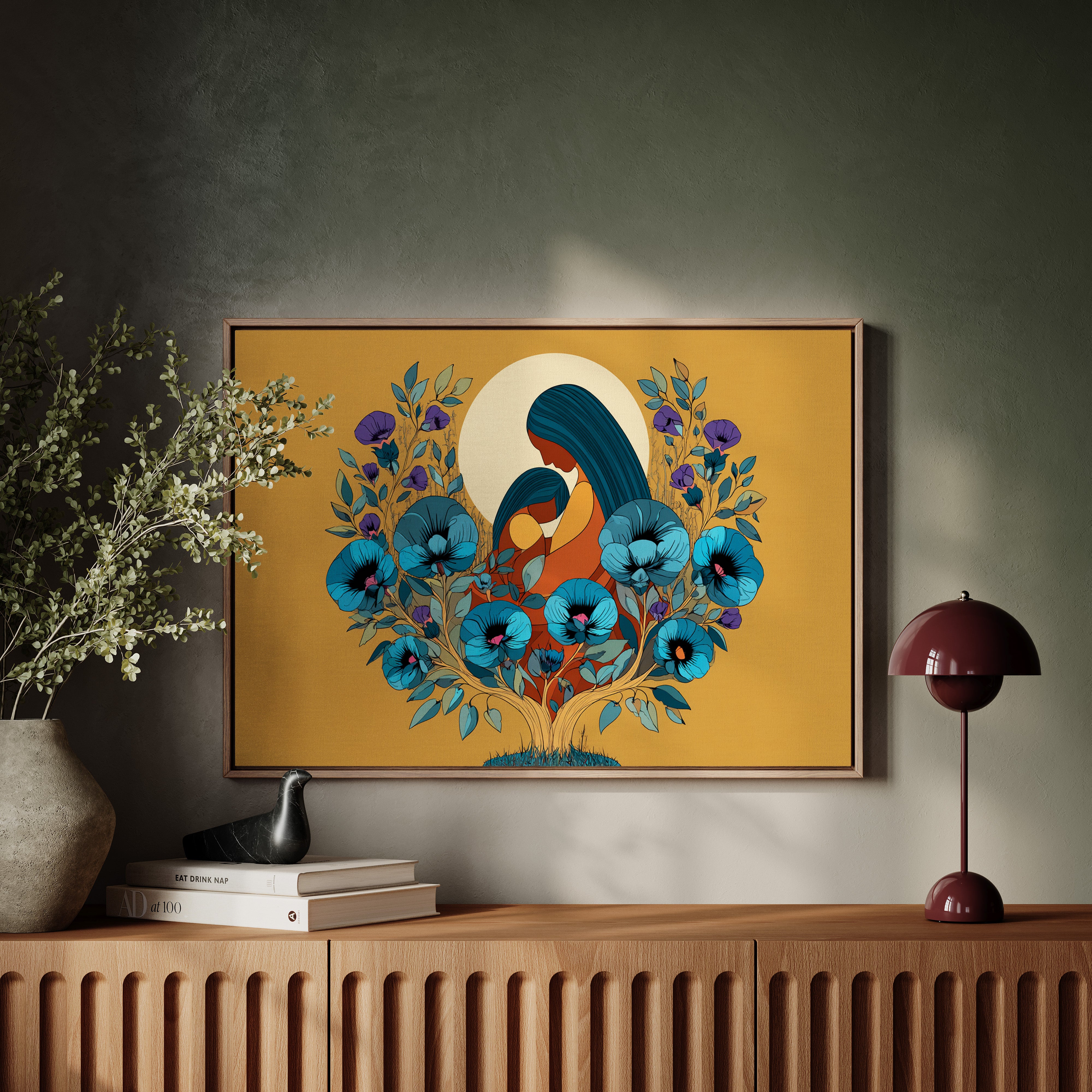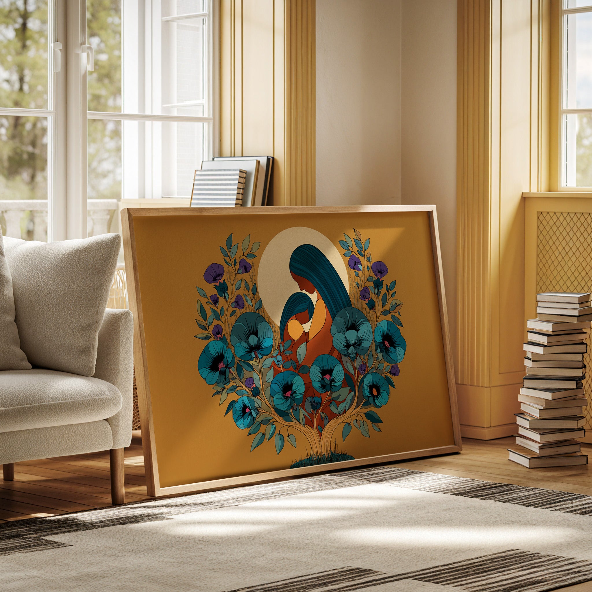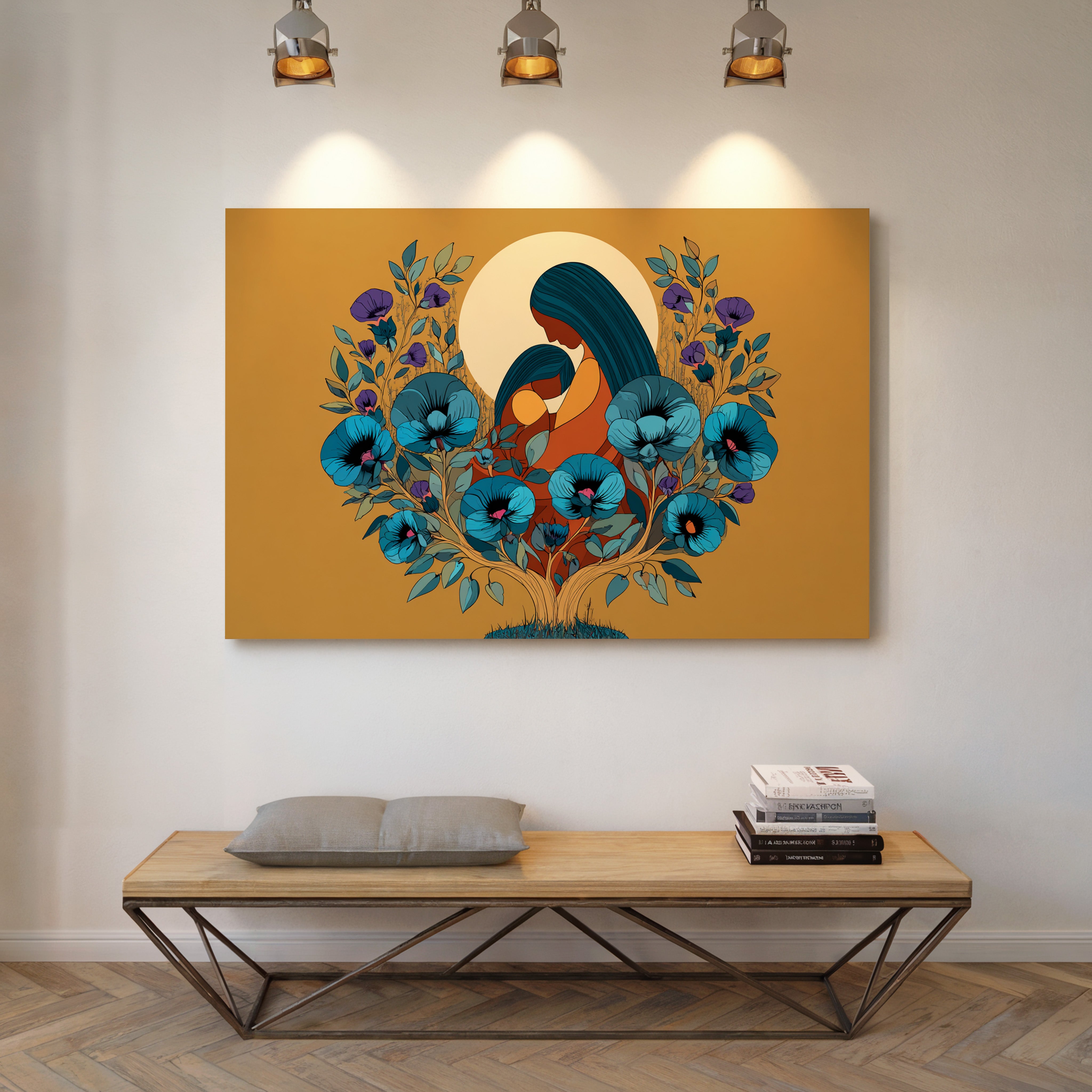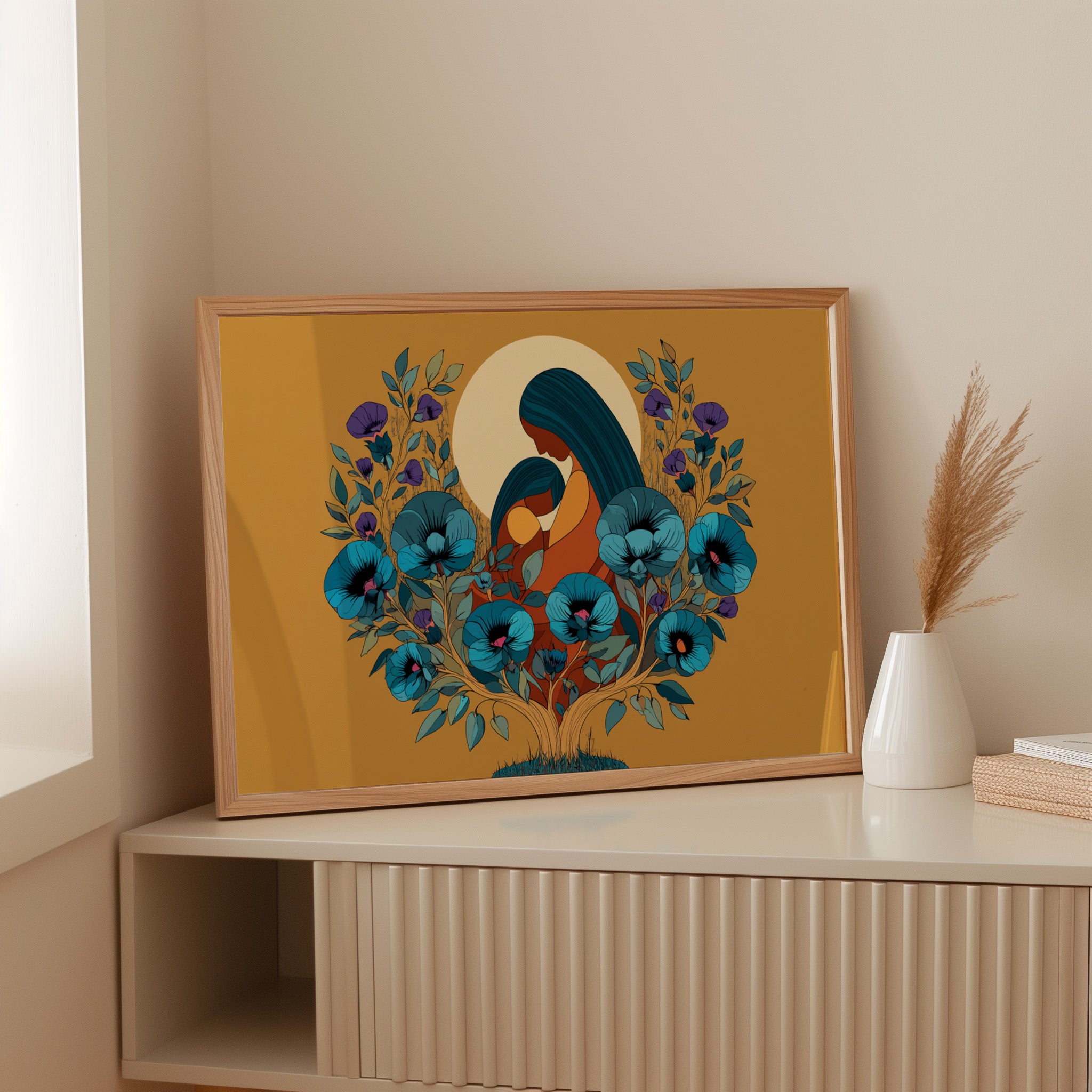 Turquoise and purple blooms frame a tender moment beneath a luminous full moon. The warm amber background bathes the scene in a gentle glow, while delicate branches curve to form a natural embrace. The illustration's flowing lines and harmonious color palette of deep teals, bright turquoise, and rich purples create a sense of peaceful connection and nurturing energy. This contemporary piece balances modern artistic elements with timeless emotional resonance.