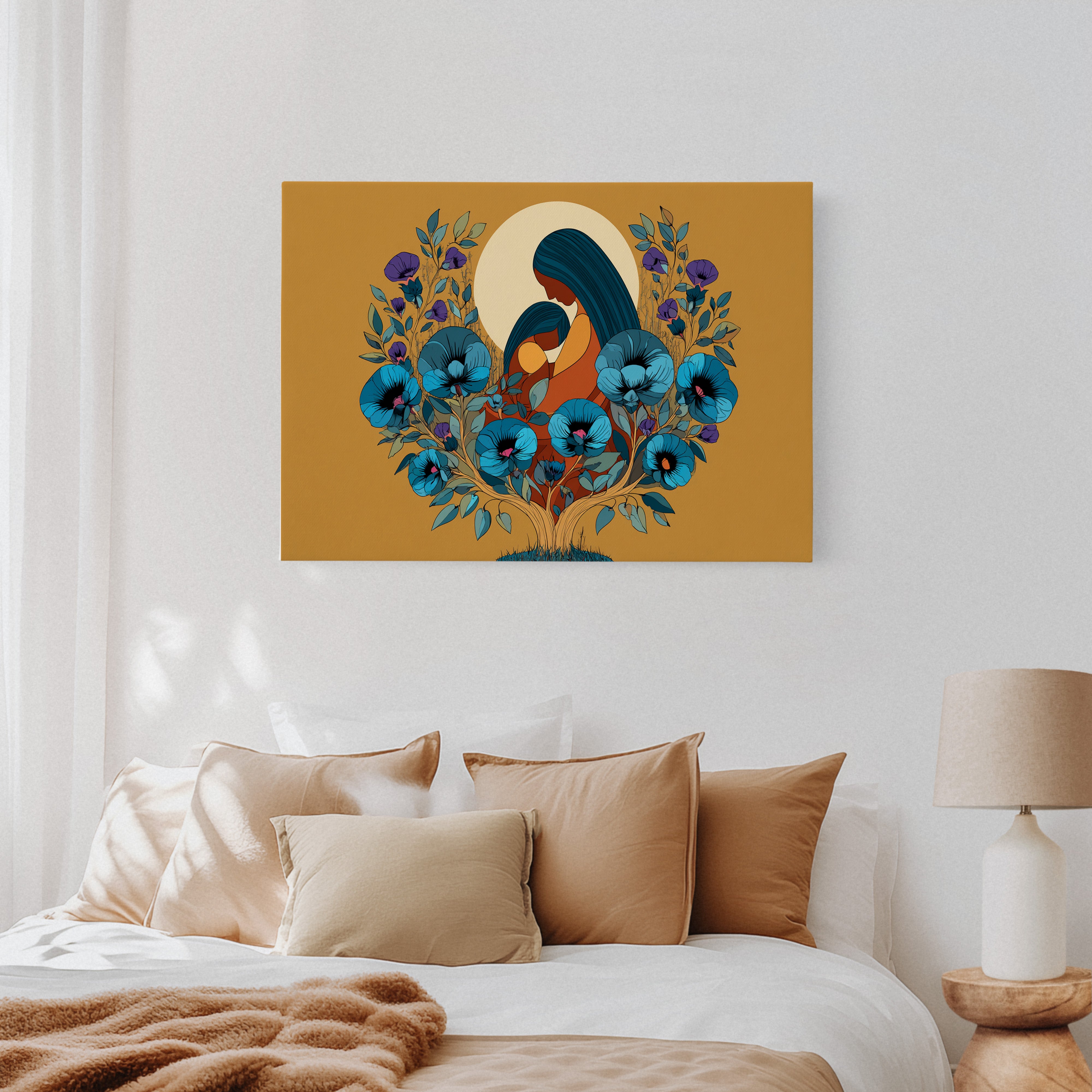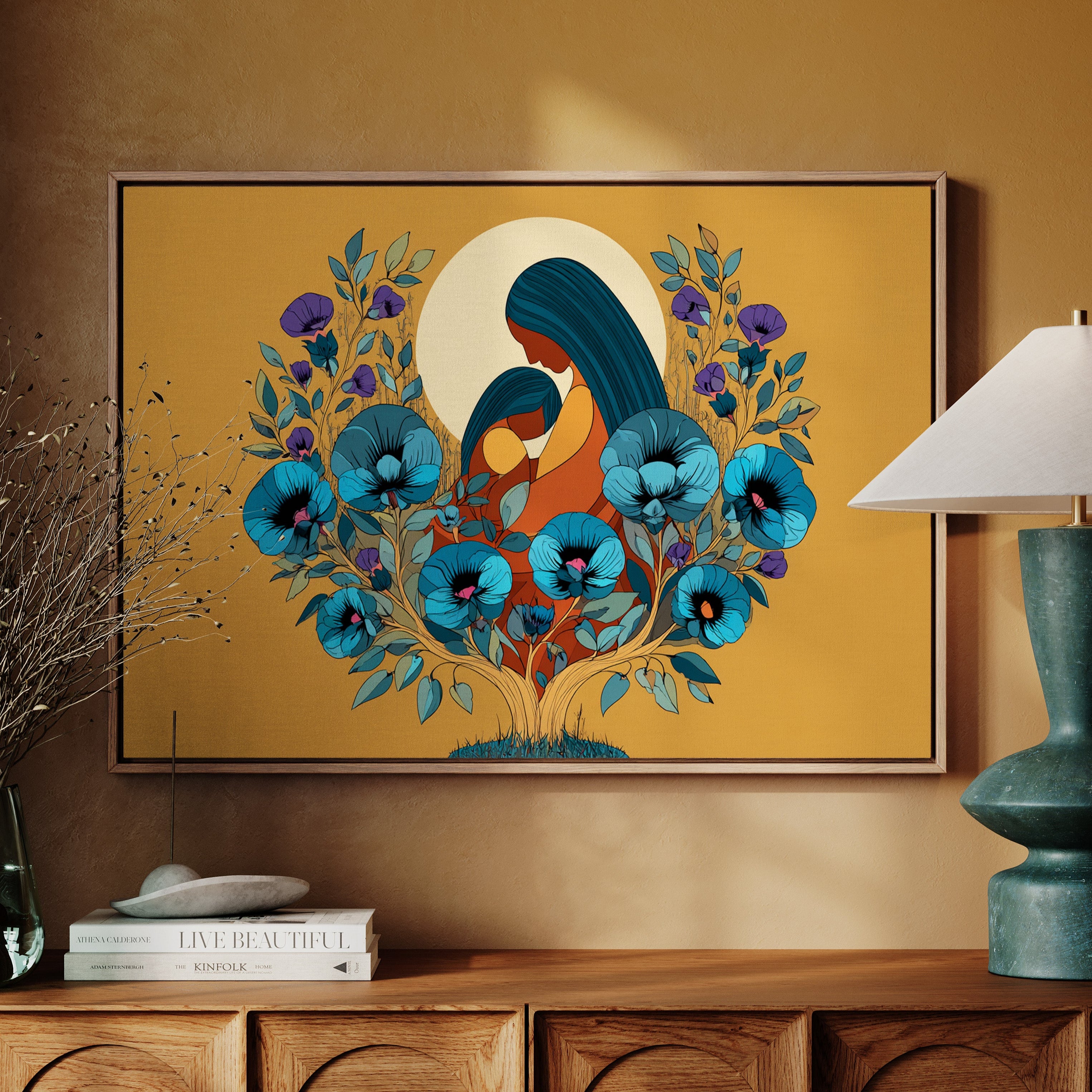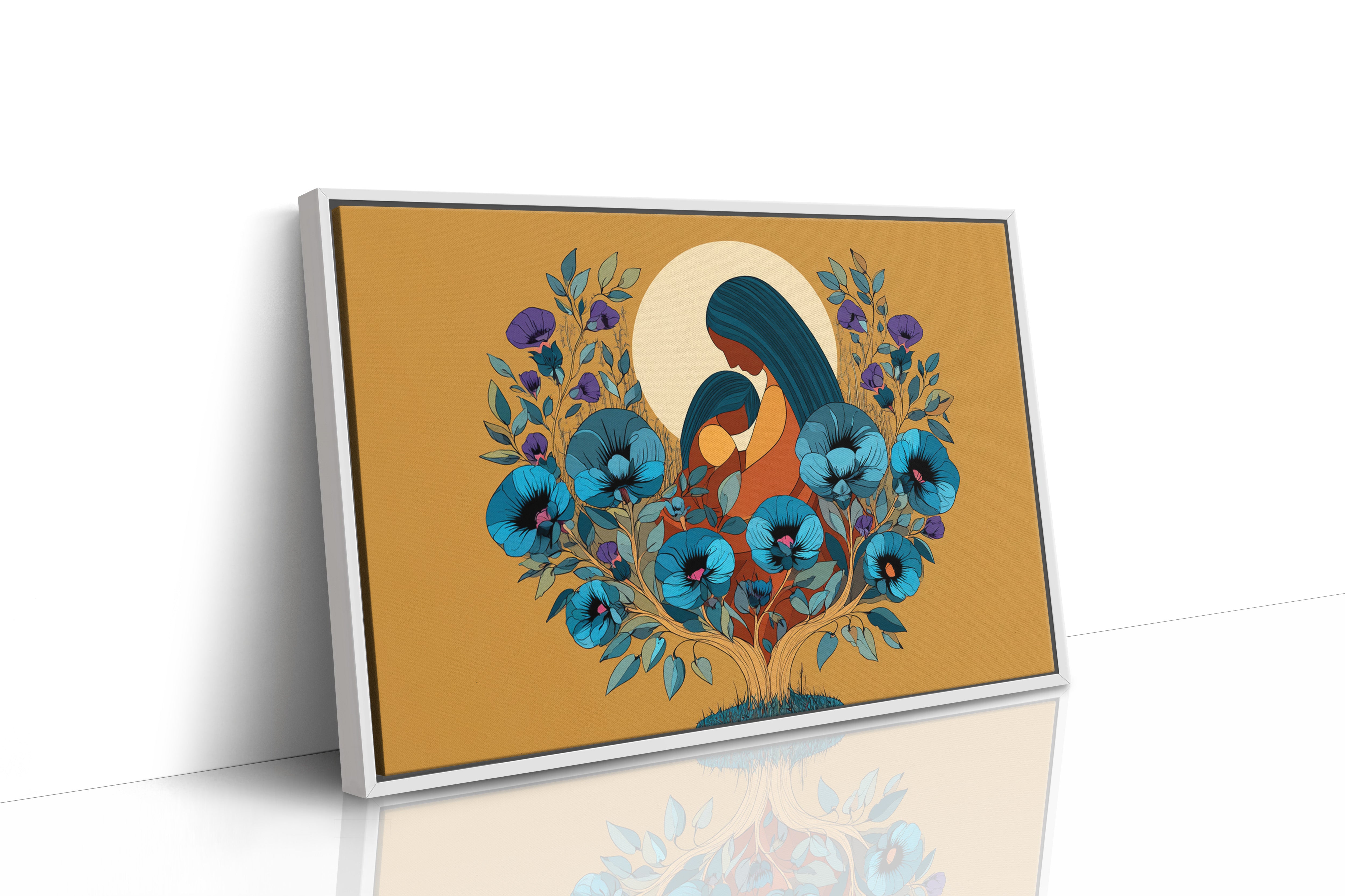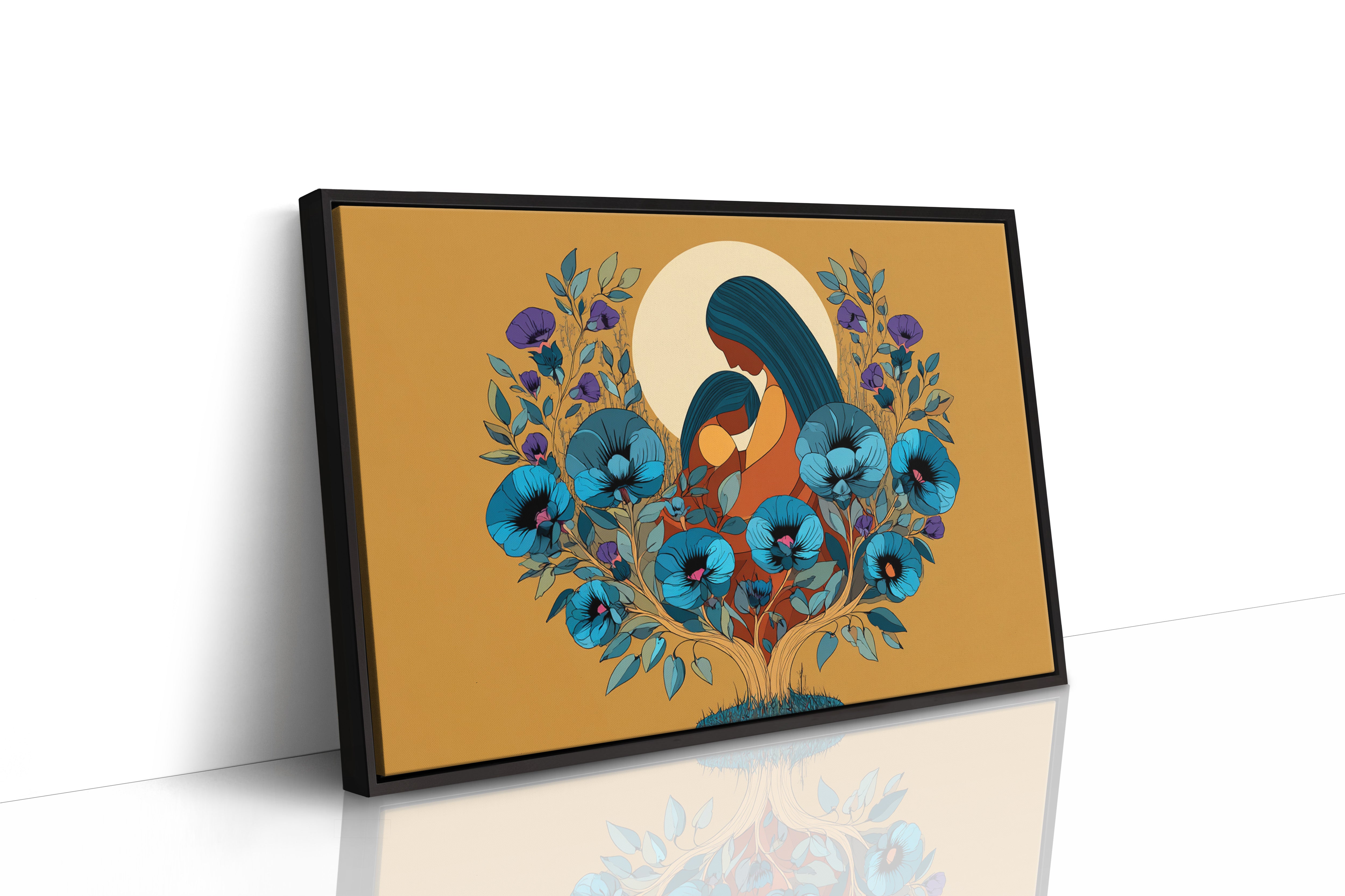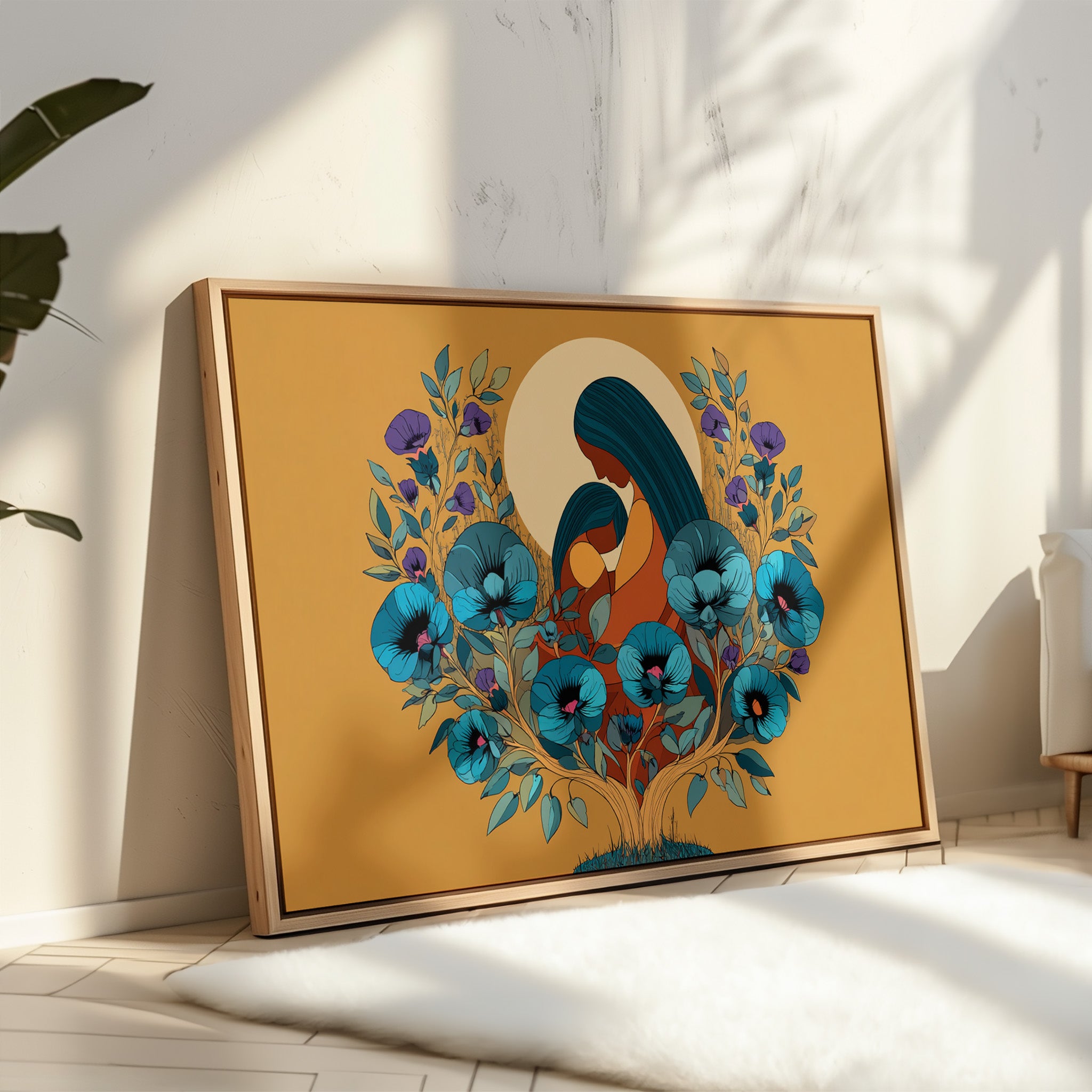 Turquoise and purple blooms frame a tender moment beneath a luminous full moon. The warm amber background bathes the scene in a gentle glow, while delicate branches curve to form a natural embrace. The illustration's flowing lines and harmonious color palette of deep teals, bright turquoise, and rich purples create a sense of peaceful connection and nurturing energy. This contemporary piece balances modern artistic elements with timeless emotional resonance.