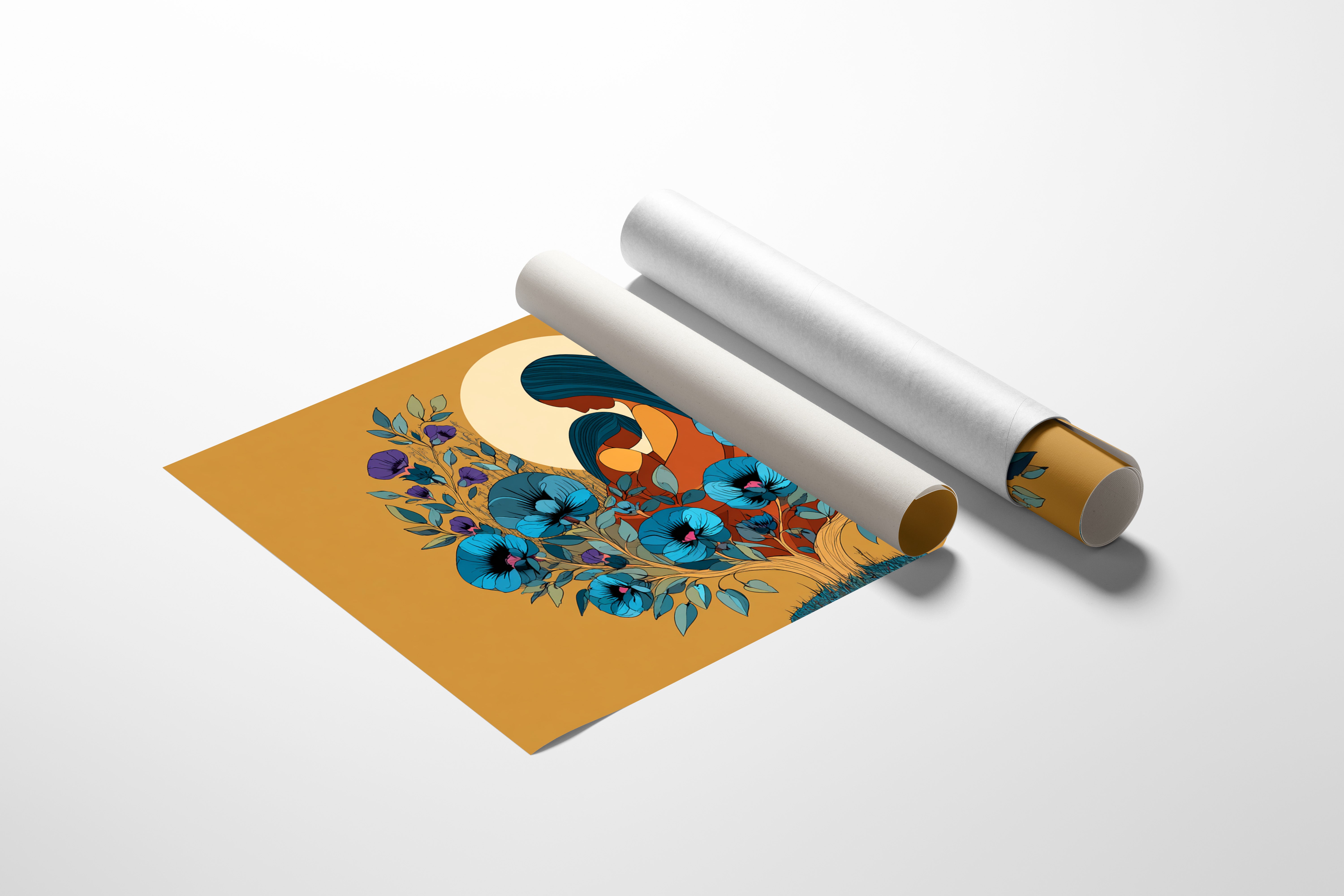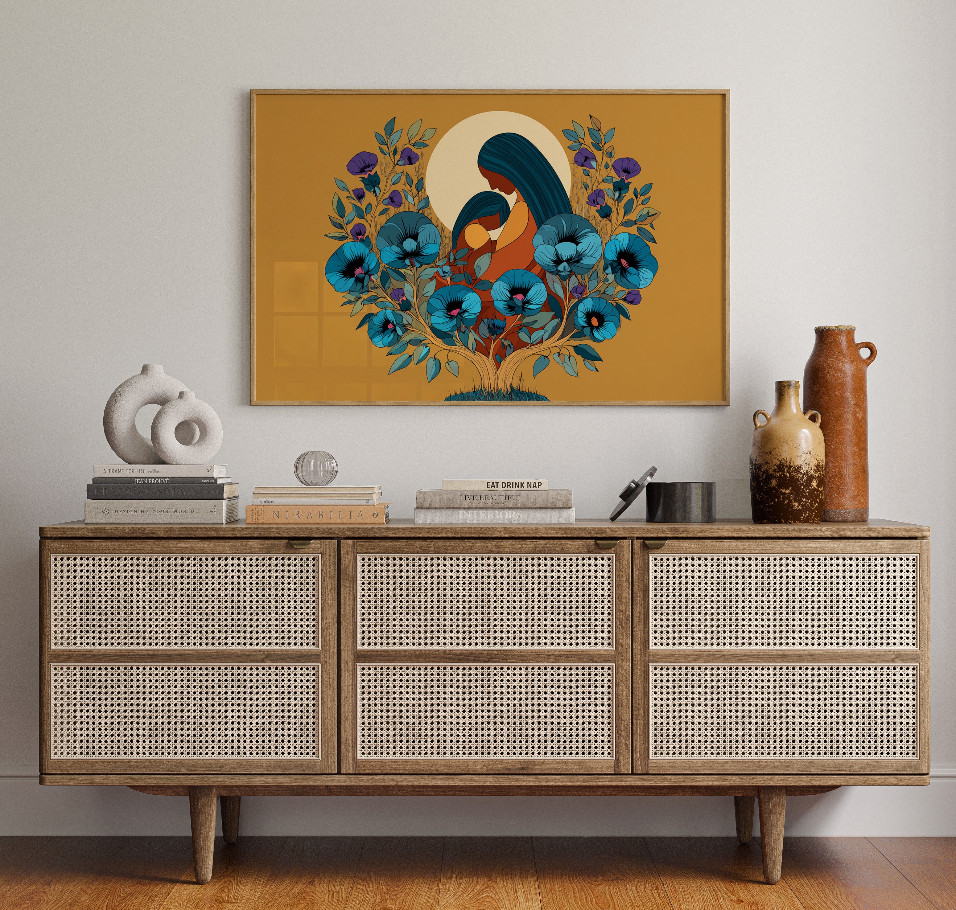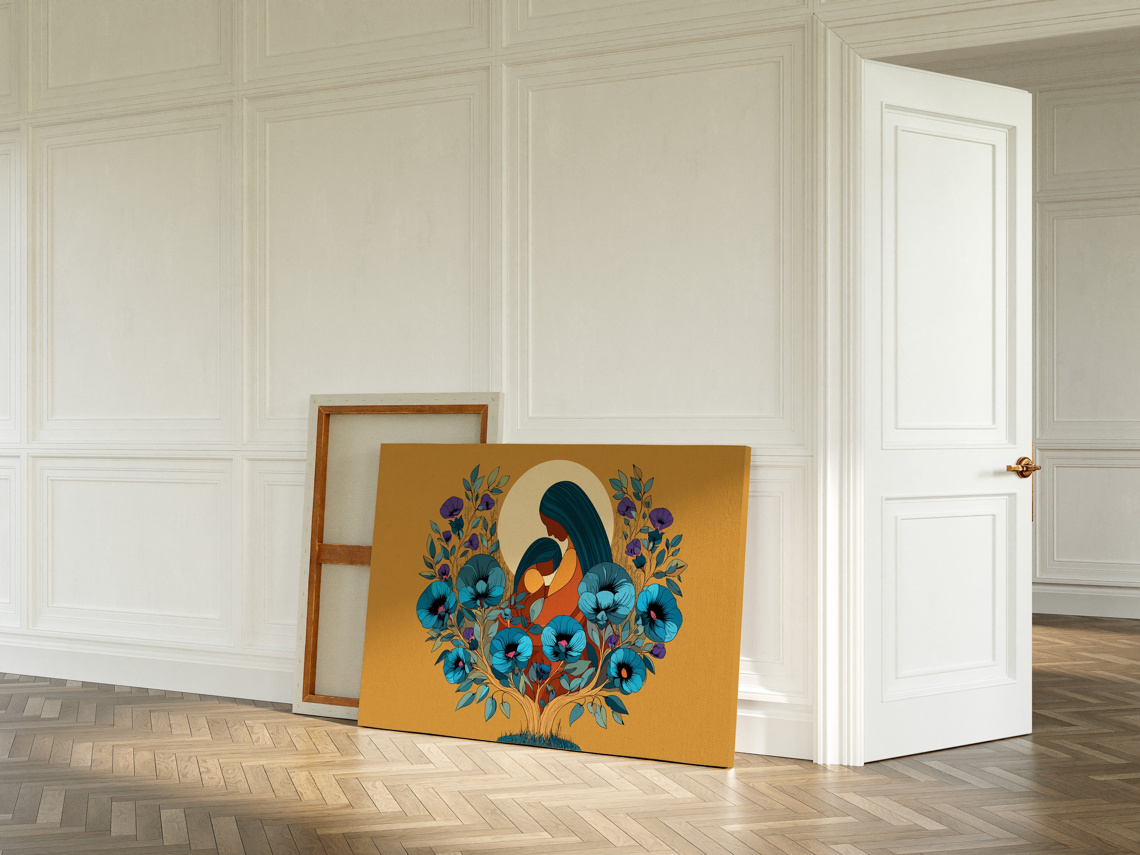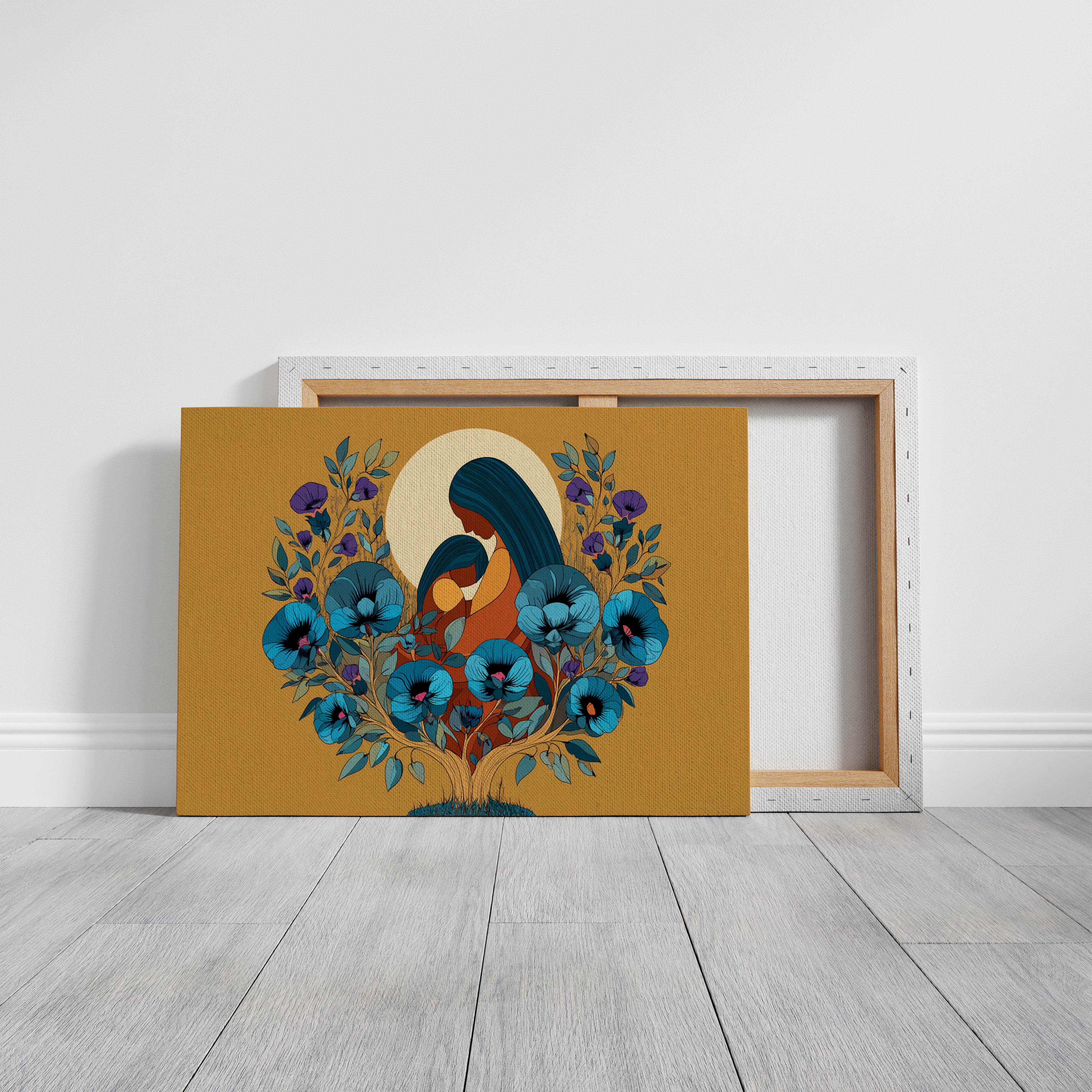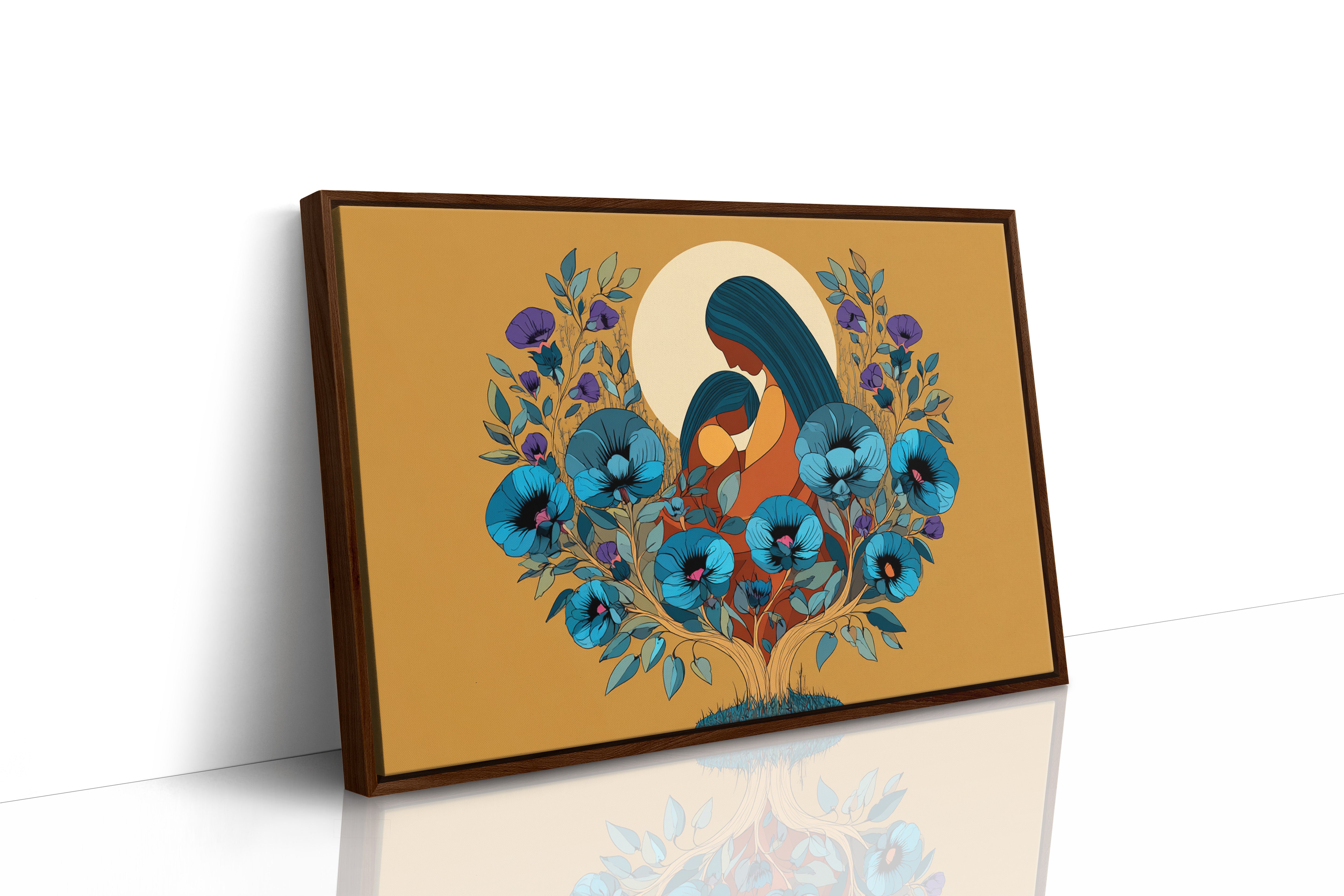 Turquoise and purple blooms frame a tender moment beneath a luminous full moon. The warm amber background bathes the scene in a gentle glow, while delicate branches curve to form a natural embrace. The illustration's flowing lines and harmonious color palette of deep teals, bright turquoise, and rich purples create a sense of peaceful connection and nurturing energy. This contemporary piece balances modern artistic elements with timeless emotional resonance.