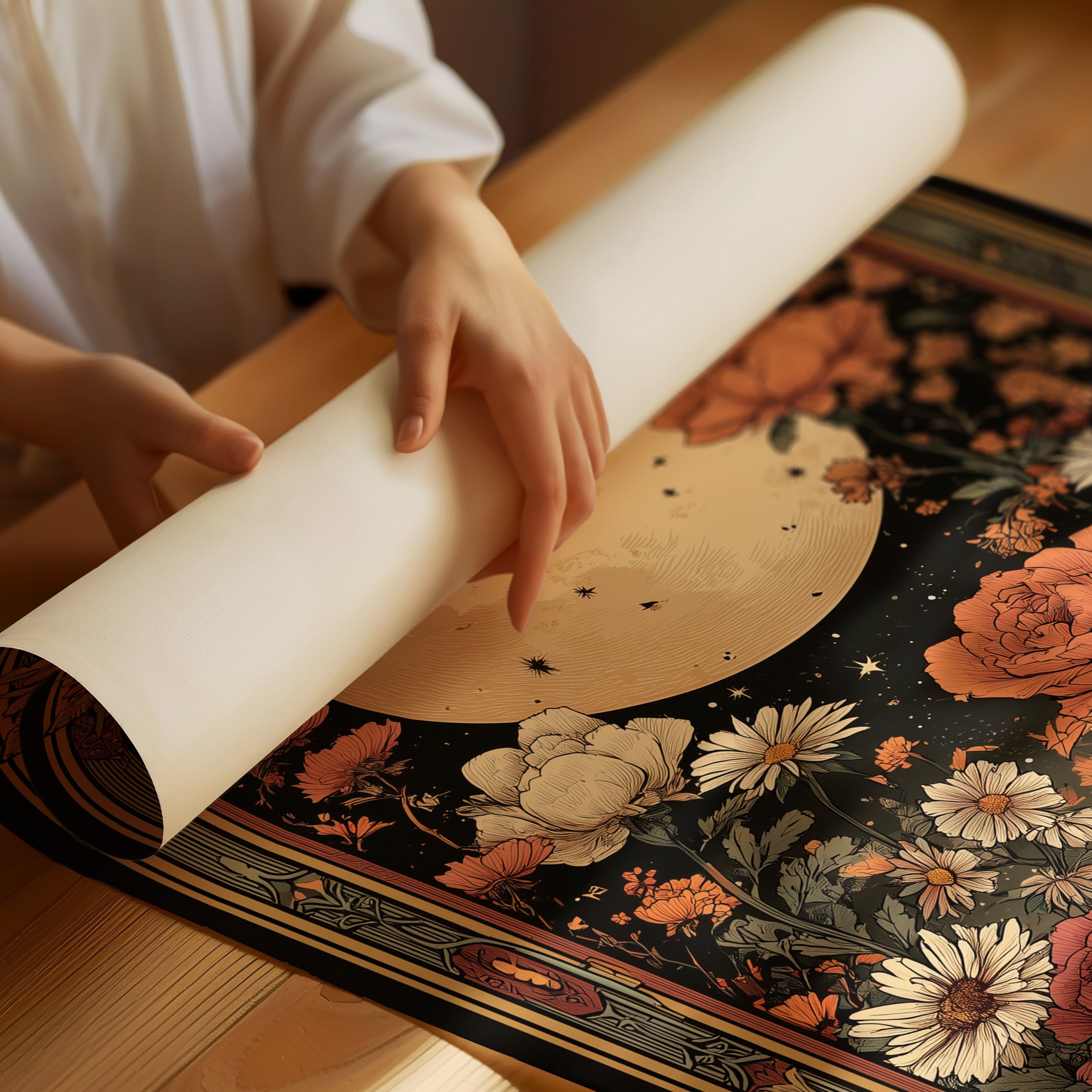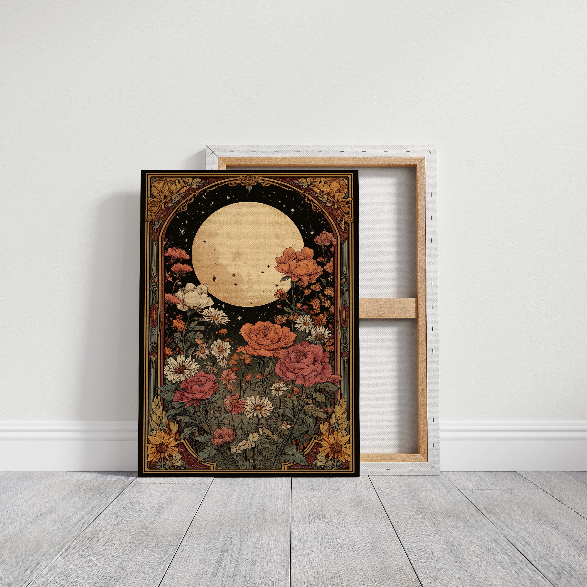 A golden full moon rises through a garden of dreams, casting its honeyed glow across delicate petals. Coral roses and pristine daisies stretch toward the celestial orb, their stems intertwining against a midnight canvas sprinkled with stars. The ornate frame captures this nocturnal ballet in rich, vintage-inspired hues that blend mysticism with botanical precision, creating a portal between earthly beauty and cosmic wonder. This enchanting piece brings dramatic elegance to bedrooms or reading nooks where moonlight stories unfold.