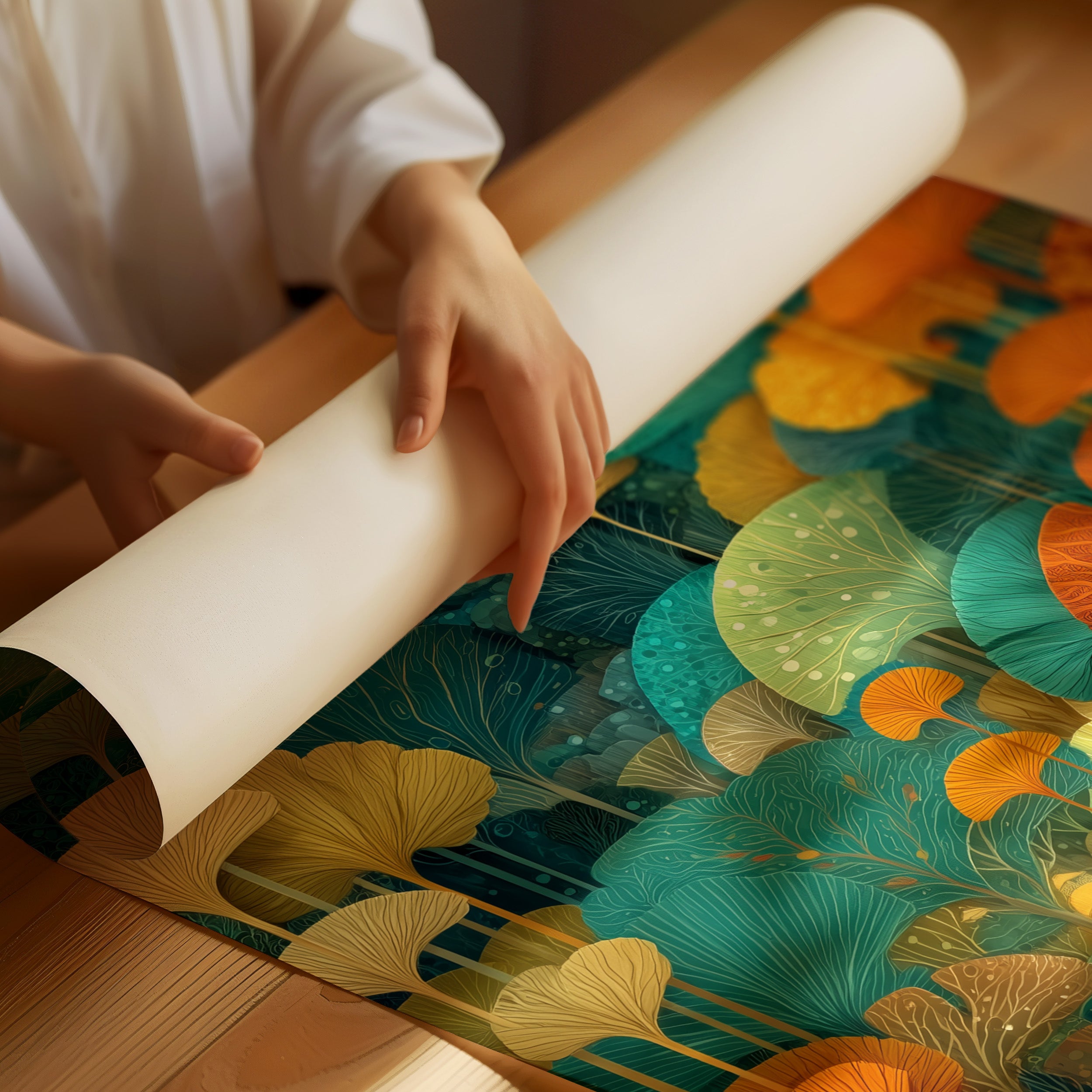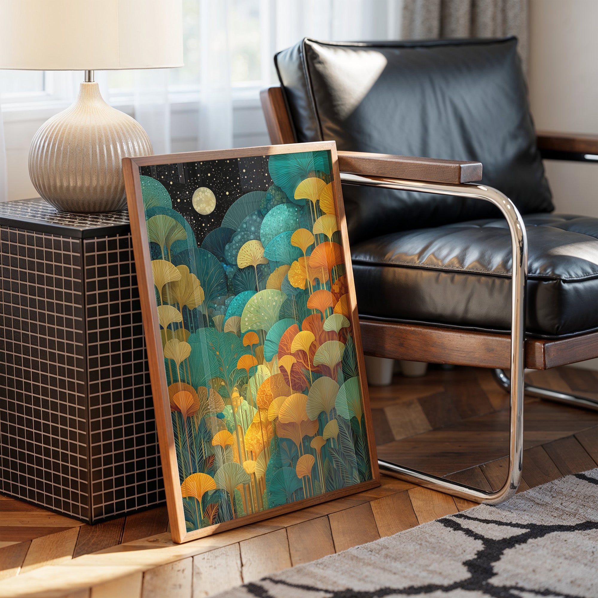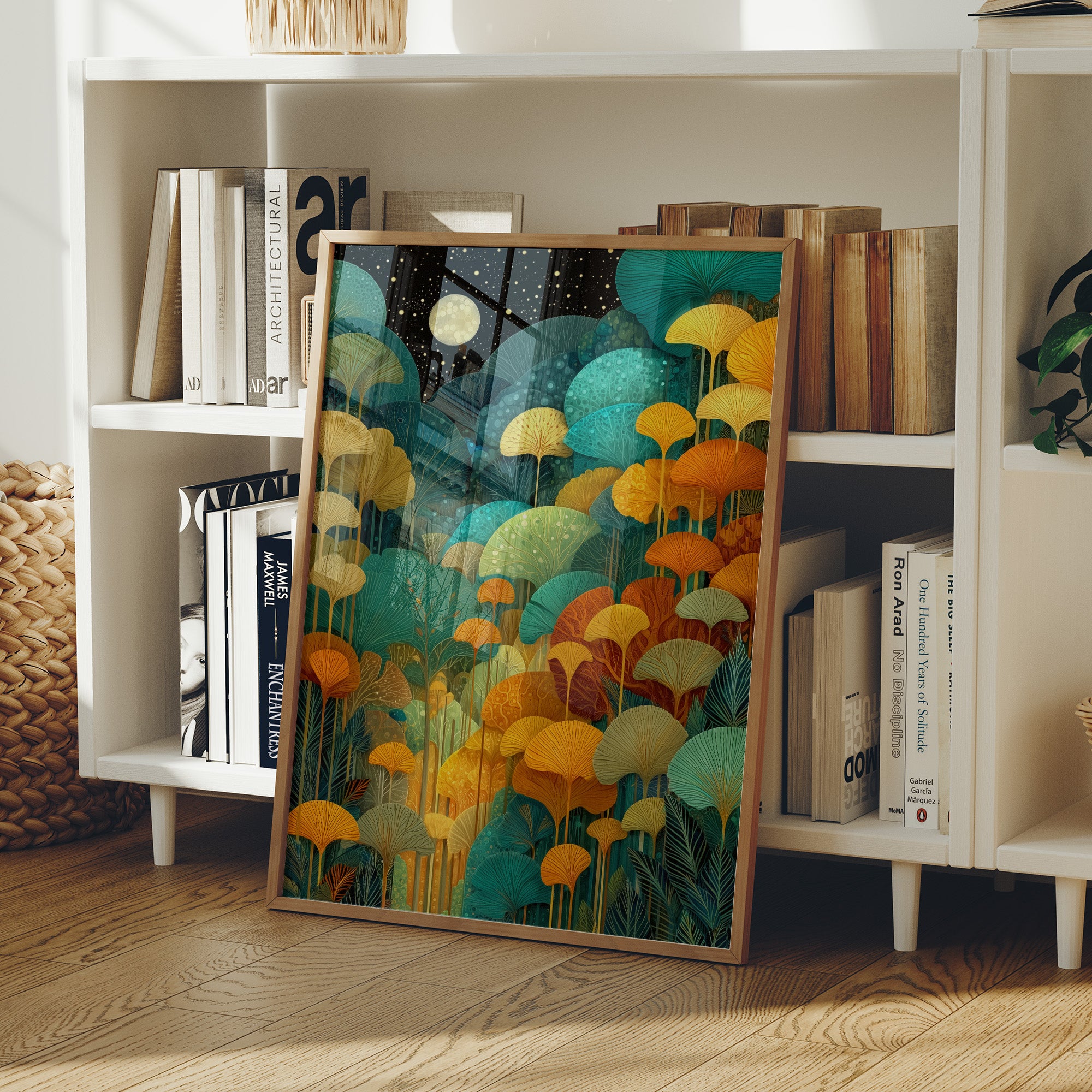 Beneath a luminous full moon, a magical garden of ginkgo leaves stretches toward the starlit sky. Teal and golden fronds create an enchanting dance of color, their fan-shaped silhouettes overlapping in a mesmerizing pattern that captures the essence of an ethereal night garden. The interplay of deep turquoise and warm amber tones creates a sophisticated harmony, while scattered starlight adds a touch of whimsy to this contemporary botanical scene. This striking piece would transform a reading nook or bedroom into a meditative sanctuary, bringing a sense of tranquil sophistication to any modern space.