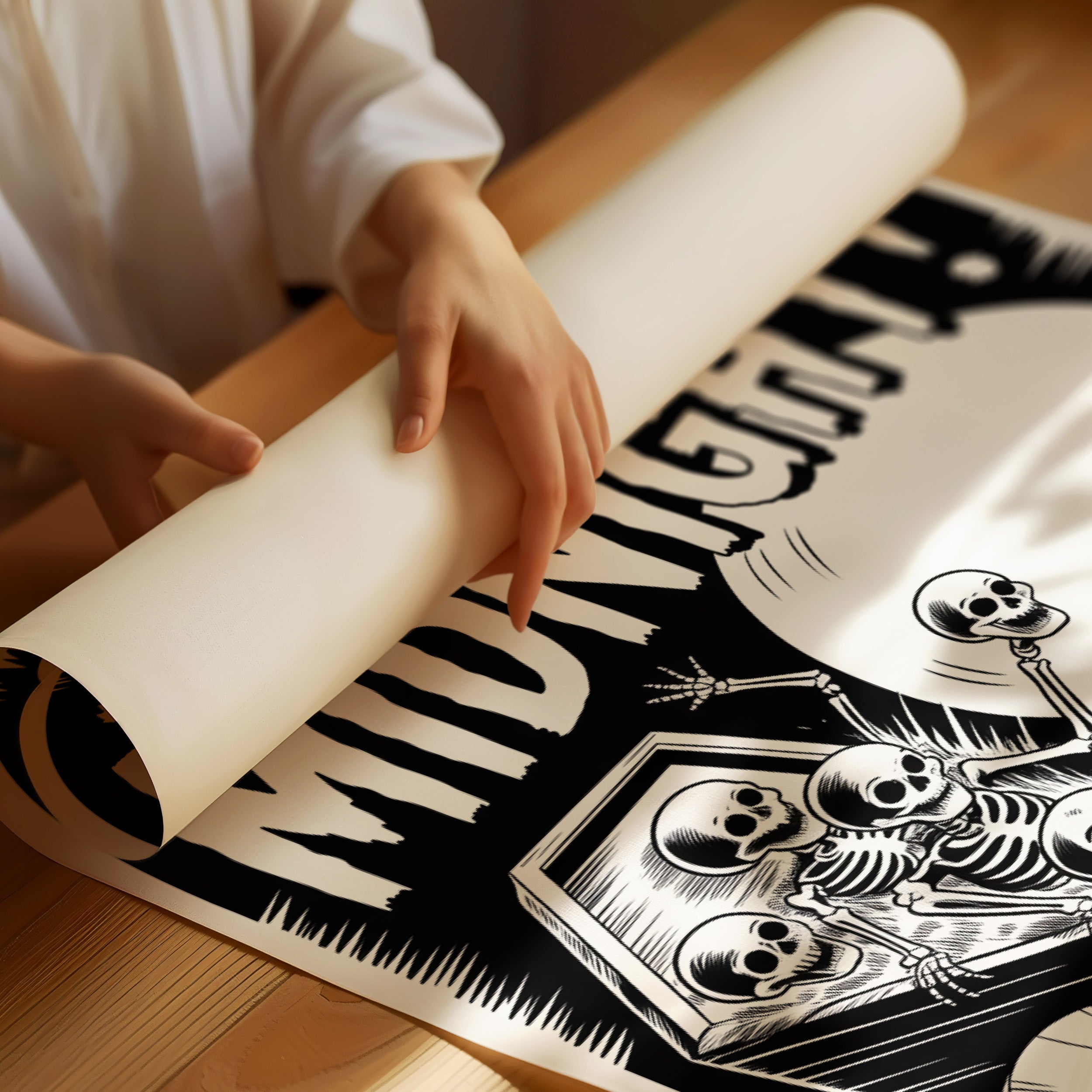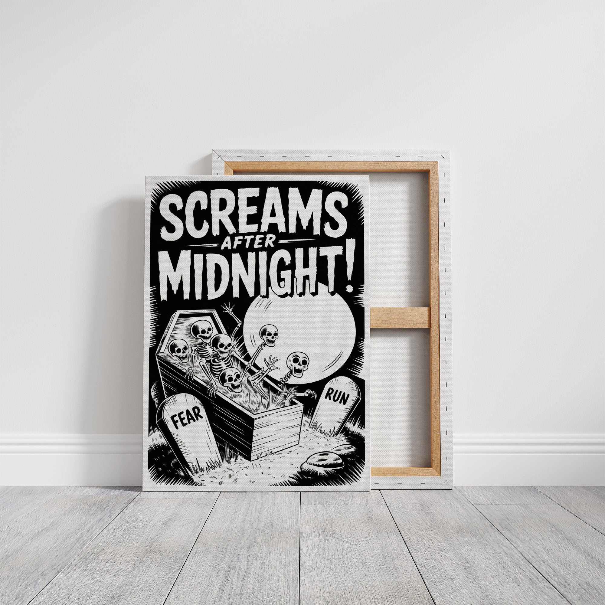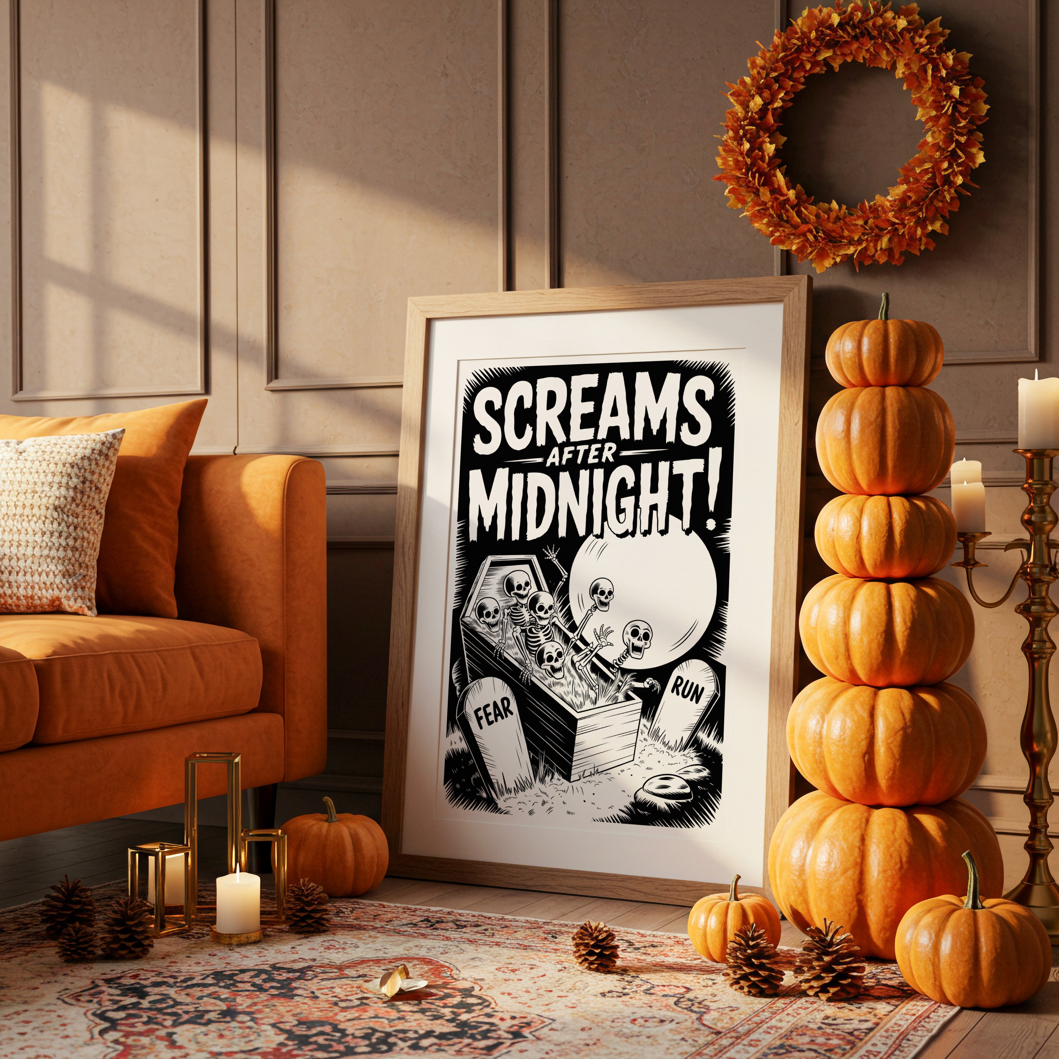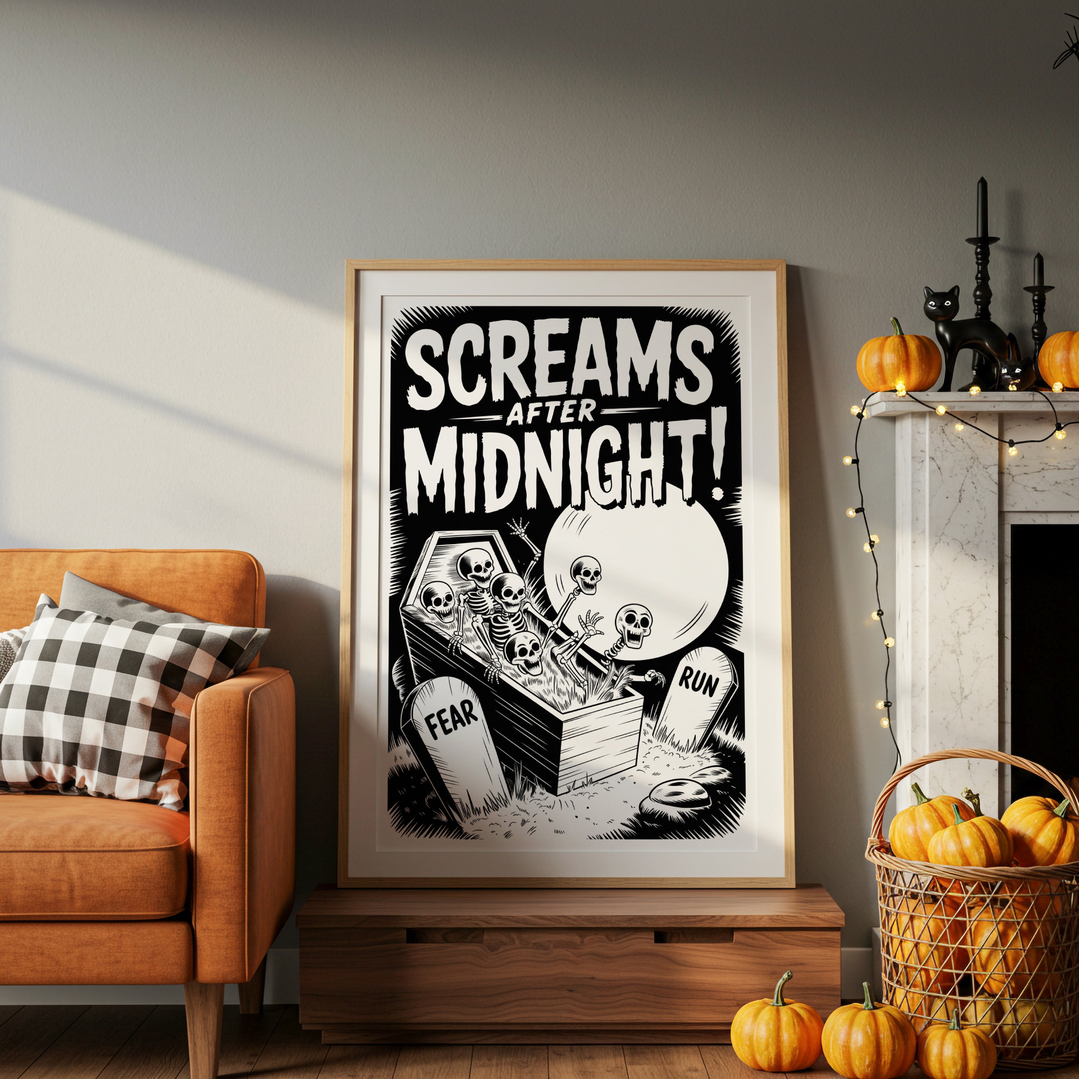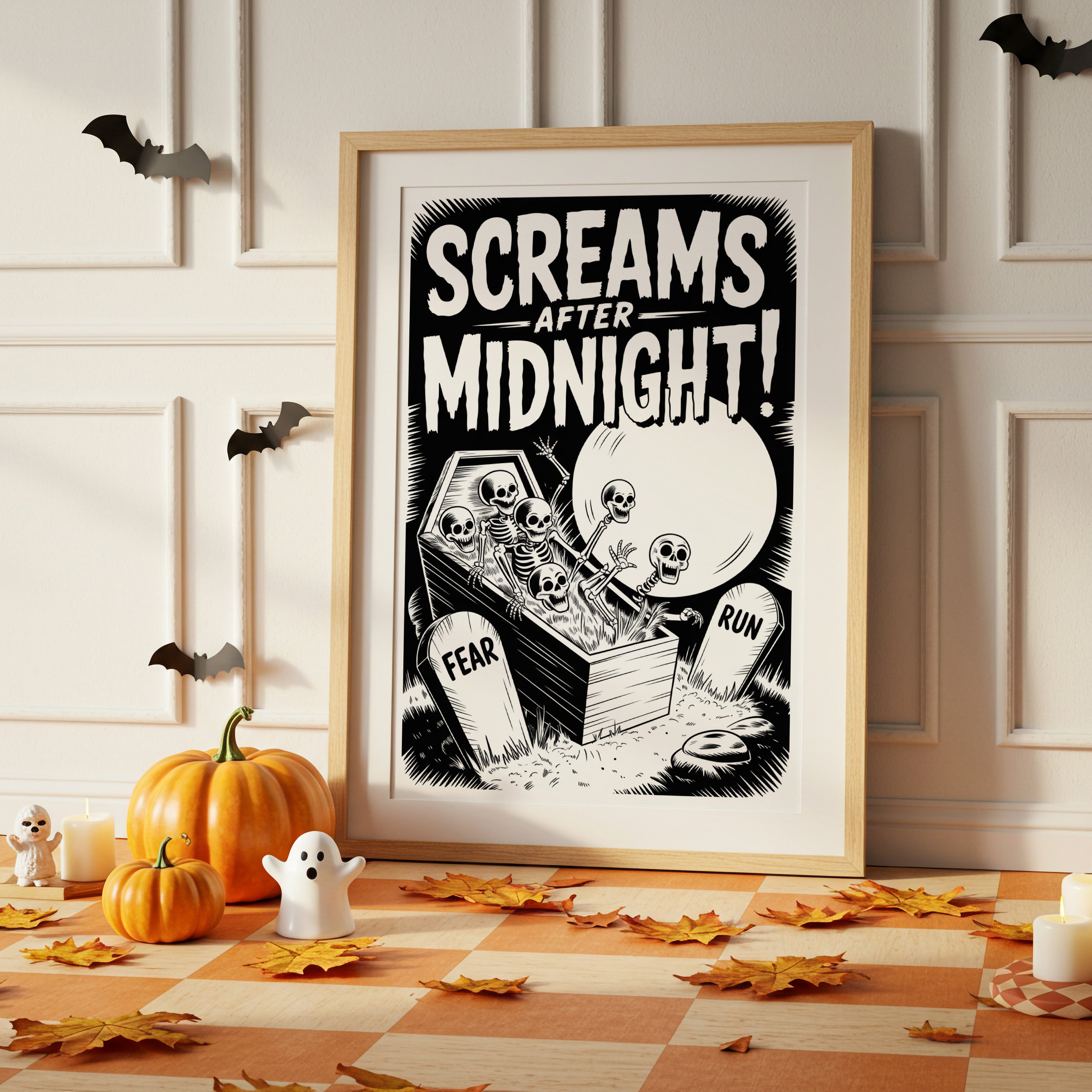 Stark black and white lines carve out a scene of delicious terror as skeletons claw their way from an open coffin beneath a luminous full moon. The bold, jagged typography looms above like a warning cry, while tombstones marked ""FEAR"" and ""RUN"" stand as silent sentinels to impending doom. This vintage horror comic-inspired illustration captures the macabre charm of classic pulp fiction, where death isn't the end but merely an invitation to midnight mischief.