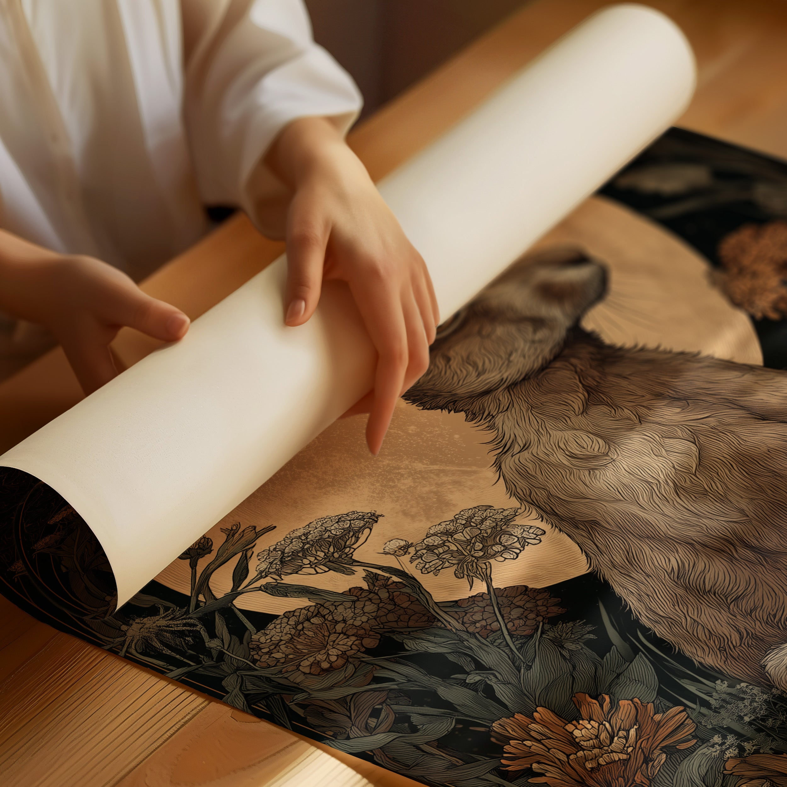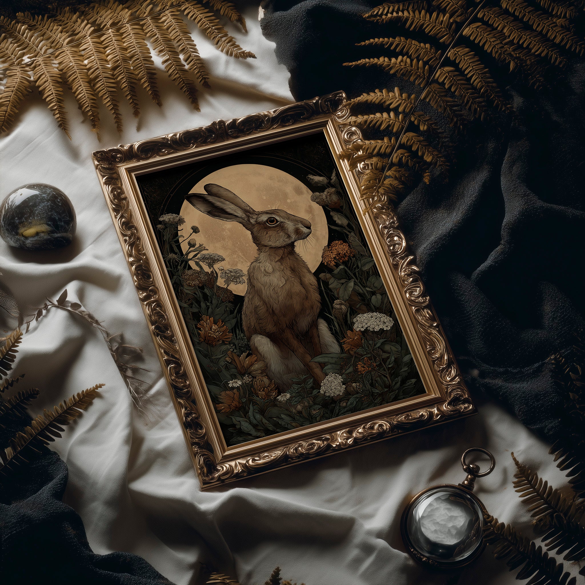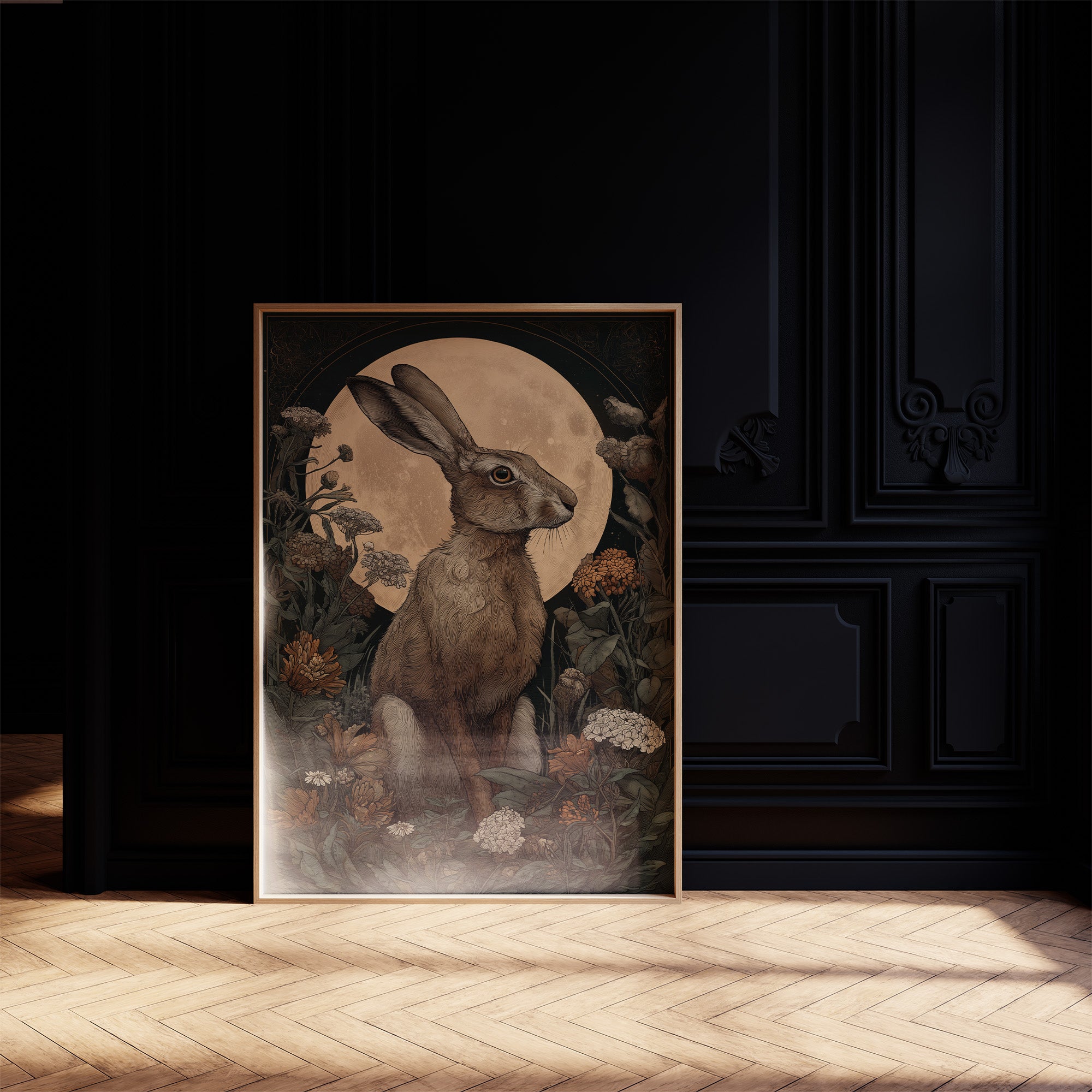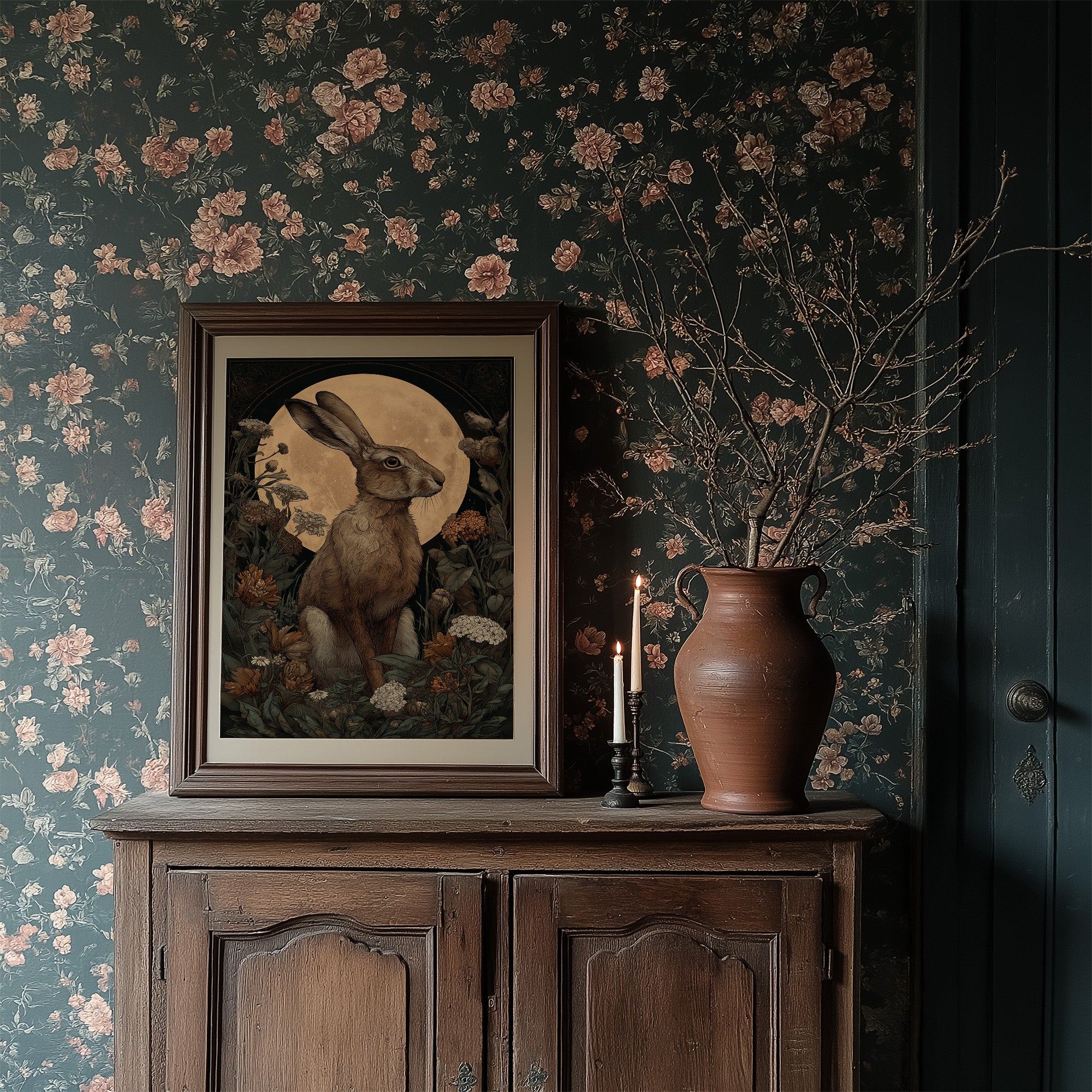A vigilant hare pauses in a moment of stillness, bathed in the amber glow of a full moon. Delicate wildflowers and meadow blooms surround the creature in earthy autumnal hues, creating a mystical woodland scene that feels both ancient and timeless. The detailed illustration captures every fur texture and floral element with meticulous care, evoking a sense of folklore and natural magic. This striking piece brings sophisticated drama to a study, reading nook, or any space where you seek to create an atmosphere of contemplative wonder.