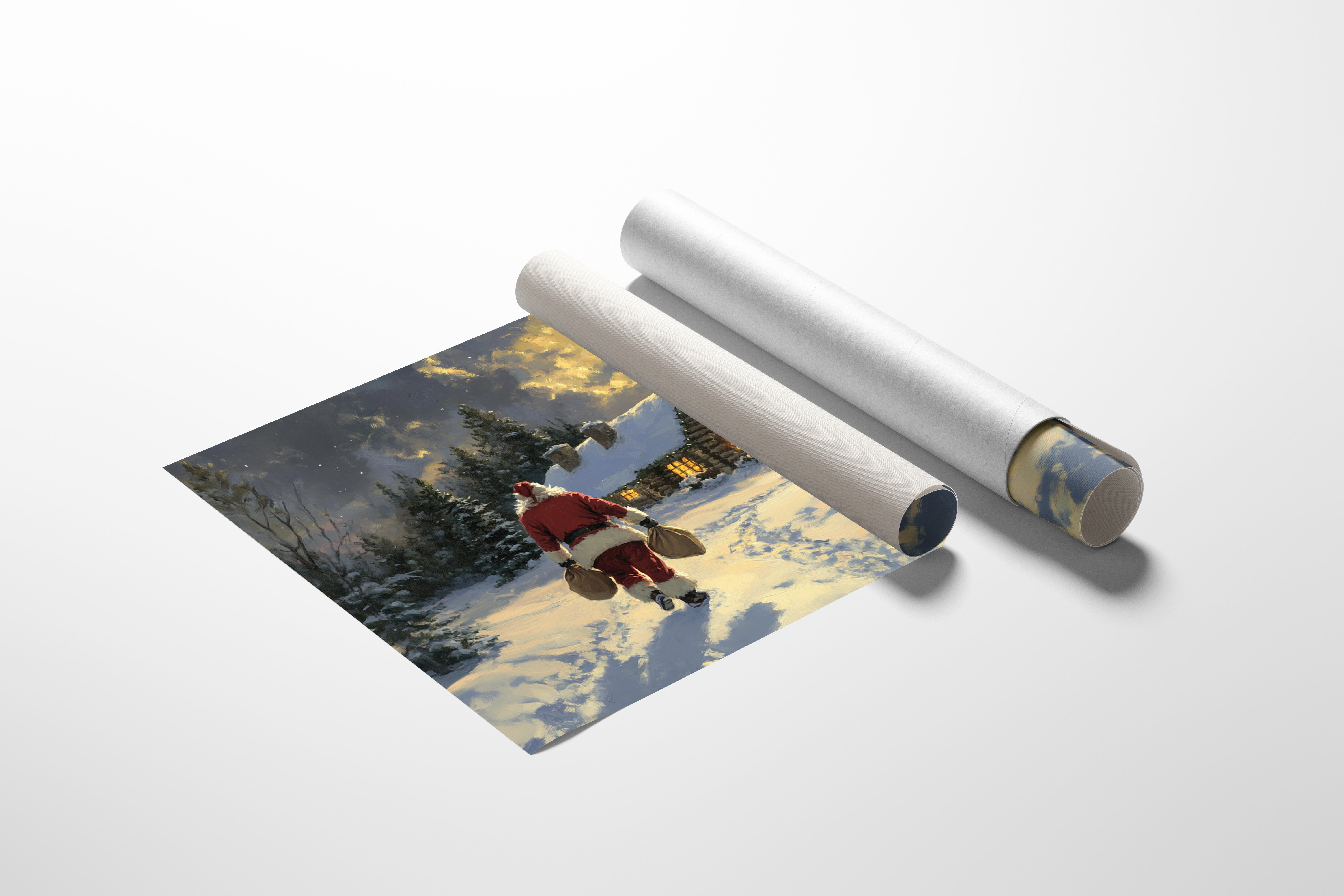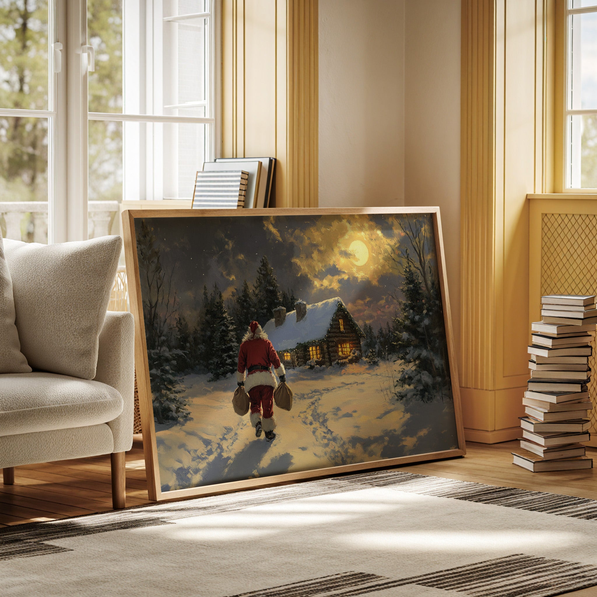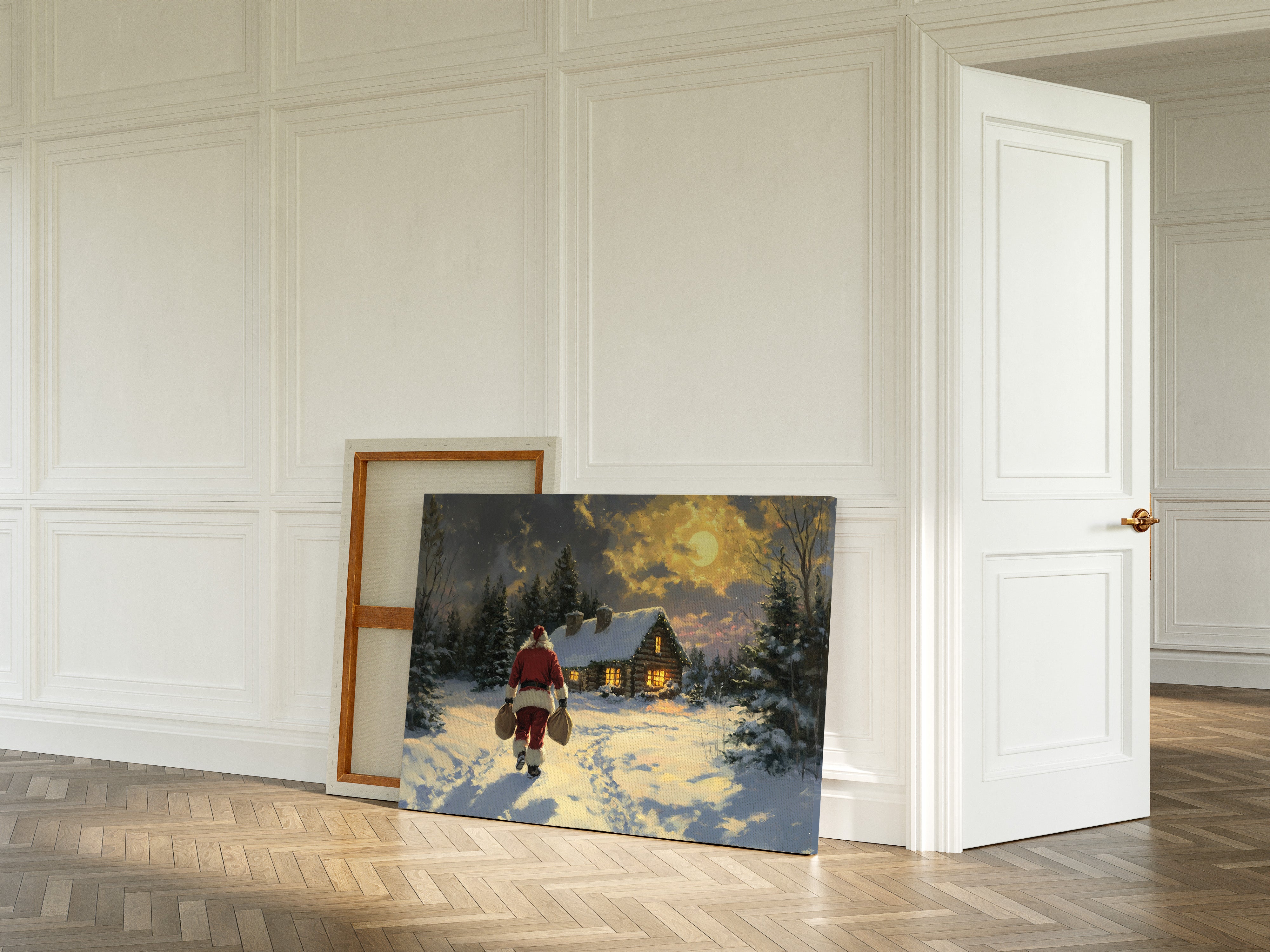 A golden moon pierces through winter clouds, casting ethereal light across fresh-fallen snow. In this enchanted scene, footprints trail toward a welcoming log cabin, its windows glowing with amber warmth against the cold night air. The composition masterfully balances the celestial drama of the sky with the intimate comfort of the rustic shelter below, while evergreens stand sentinel in their winter coat of white. This nostalgic winter tableau captures the magic of seasonal traditions and the promise of comfort awaiting within those illuminated walls. Perfect for creating a cozy focal point in living rooms or adding a touch of winter wonder to holiday gatherings.