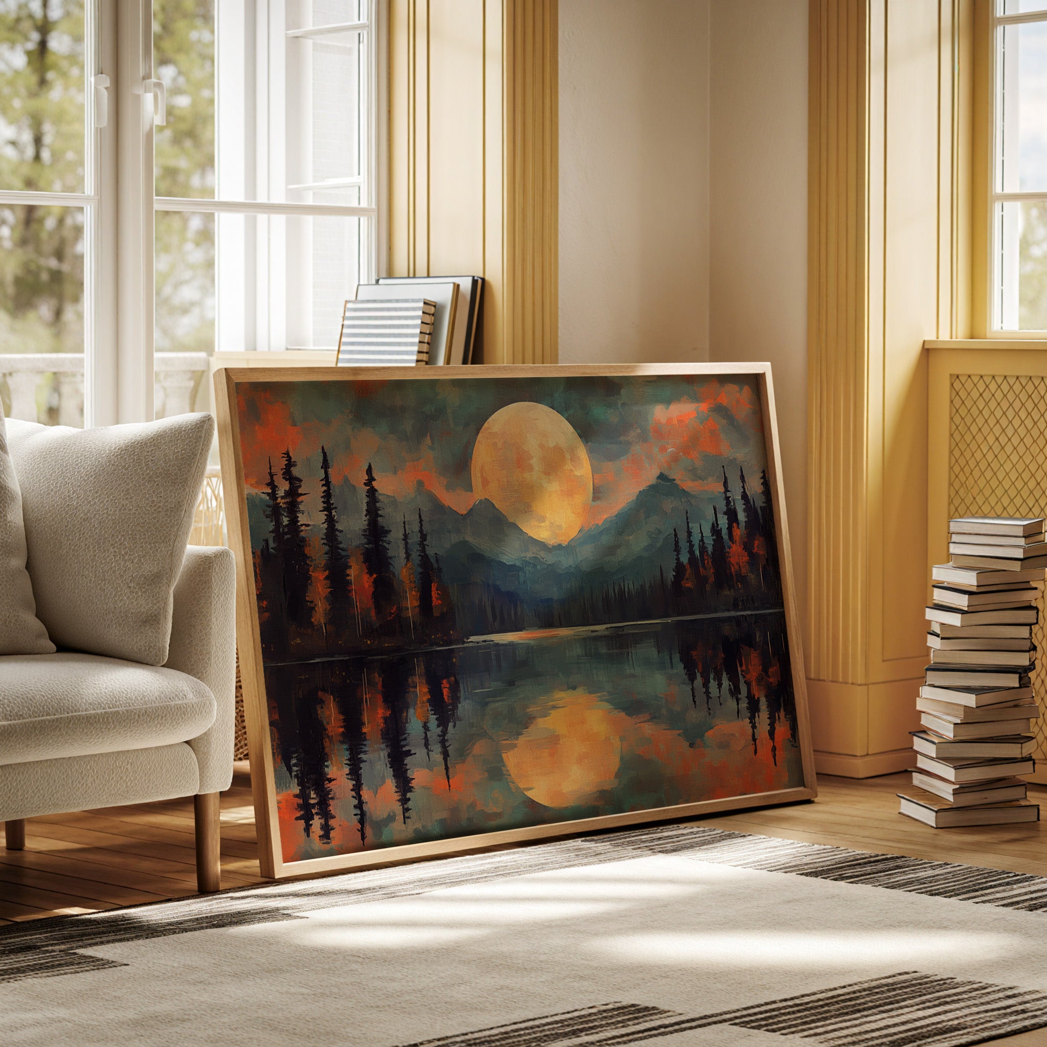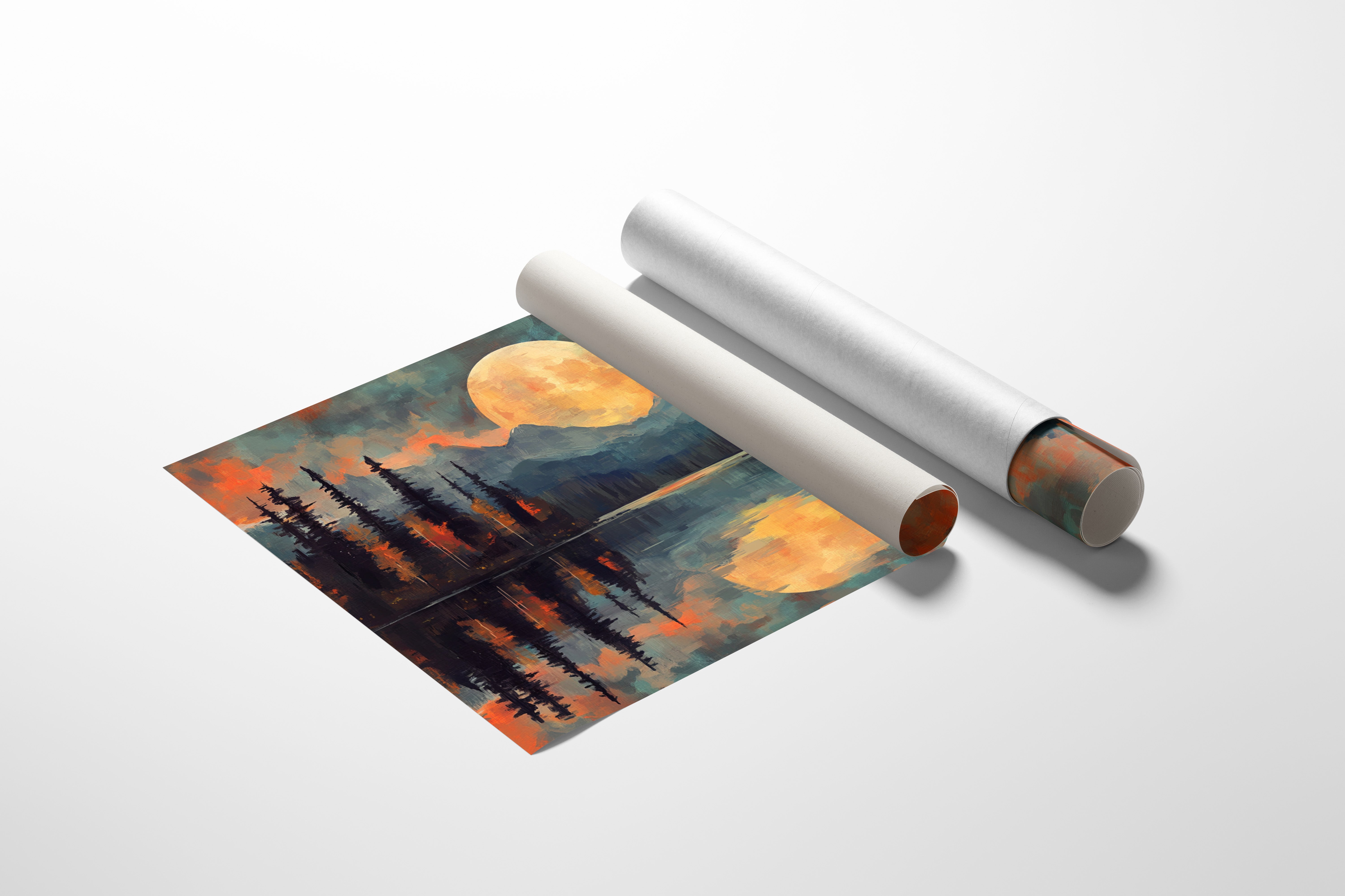 A magnificent harvest moon rises between distant peaks, casting its golden glow across a perfectly still mountain lake. The scene captures that magical moment when day surrenders to night, painting the sky in a dramatic dance of coral and teal hues. Towering evergreens stand like silent sentinels along the shoreline, their dark silhouettes perfectly mirrored in the glassy waters below.