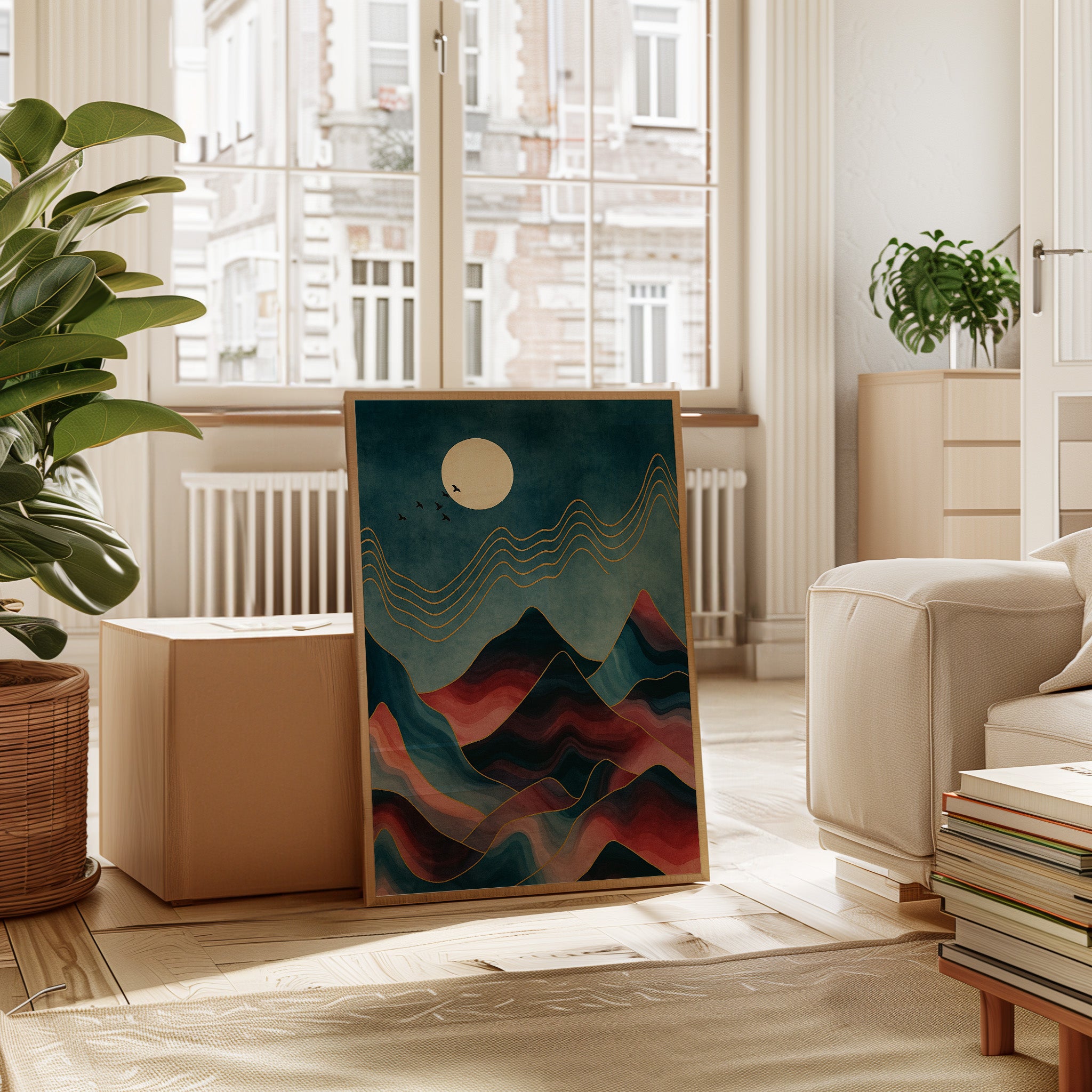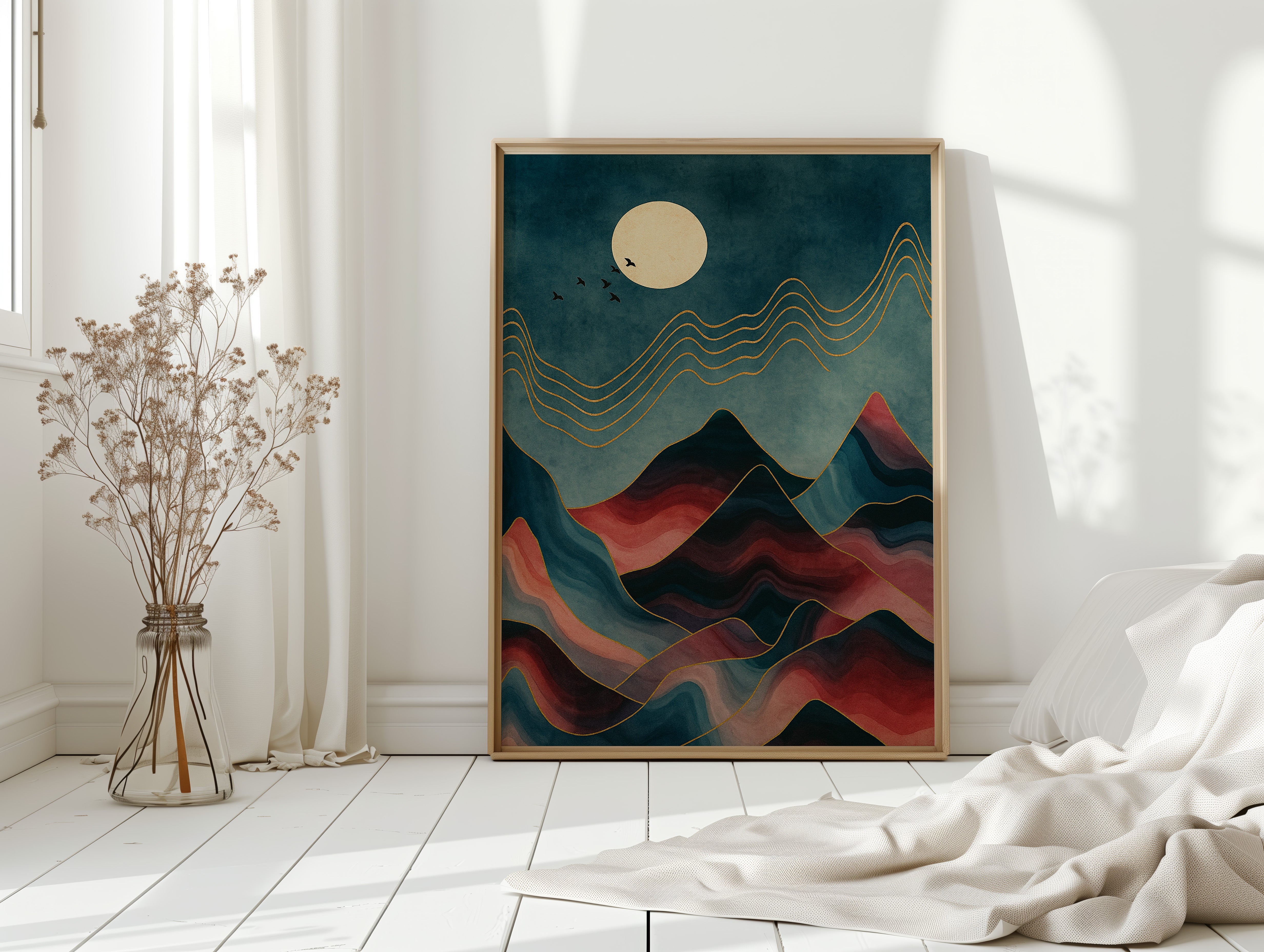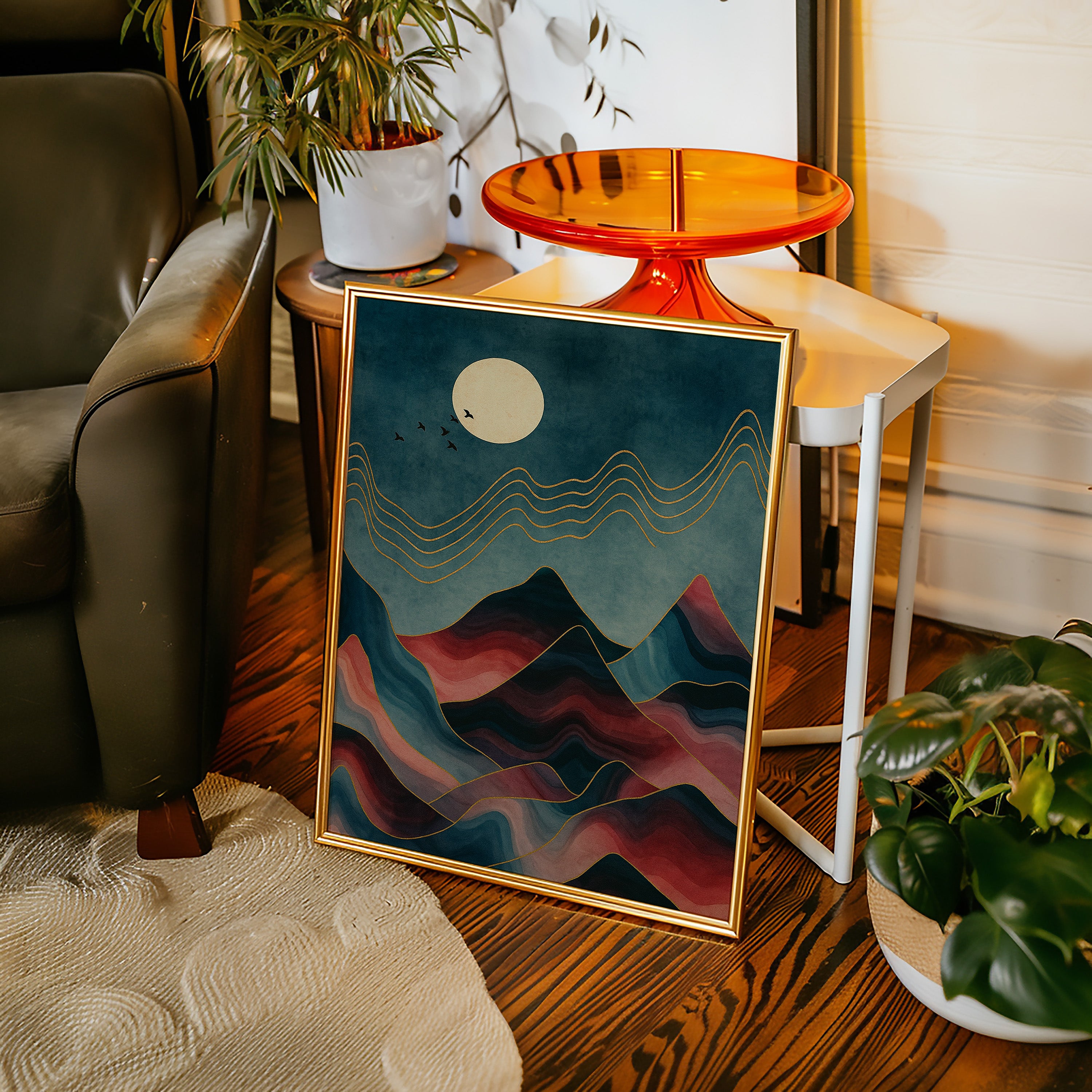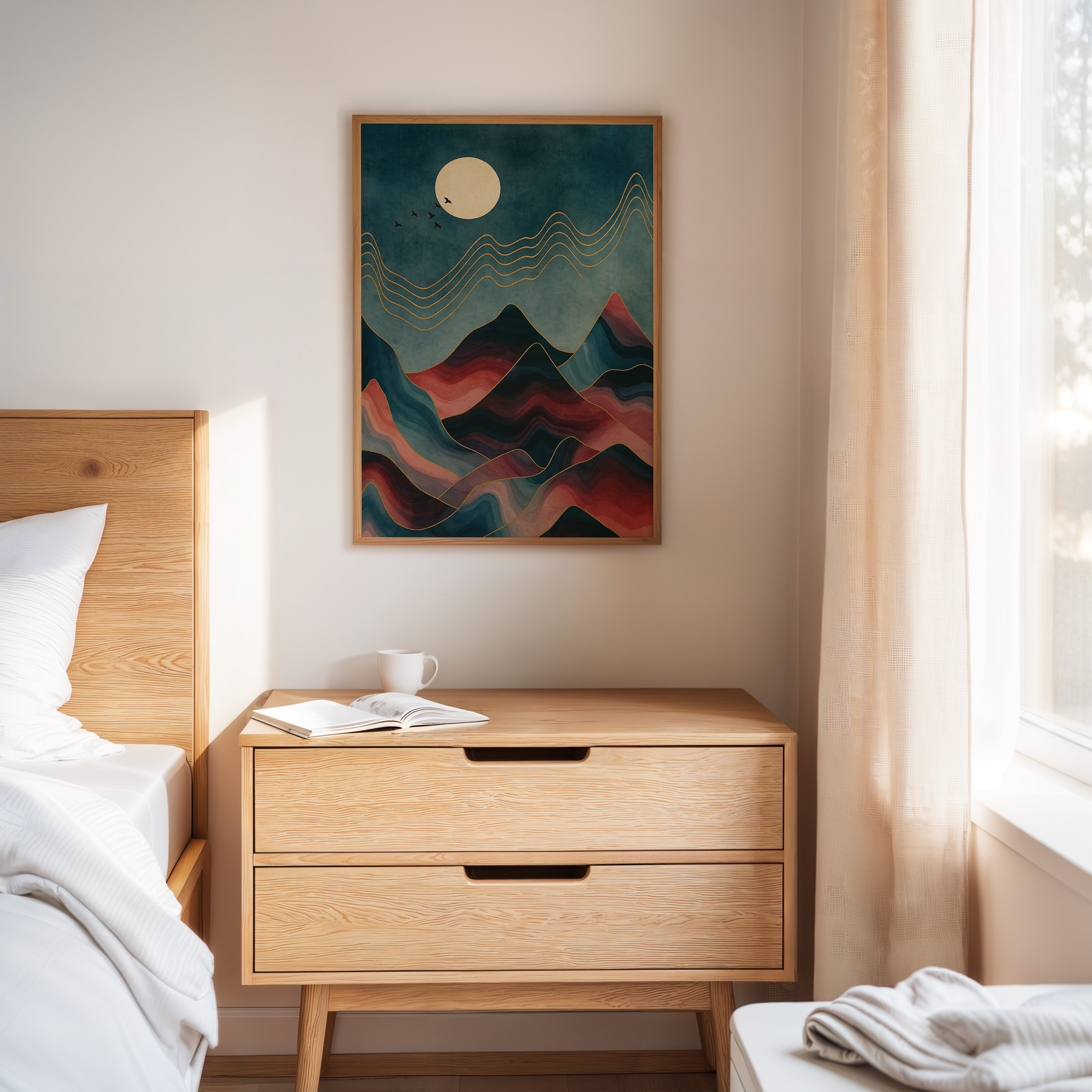 Step into a world of enchantment with our 'Moonlit Mountain Dreams' art print. This captivating piece captures the serene beauty of a moonlit night