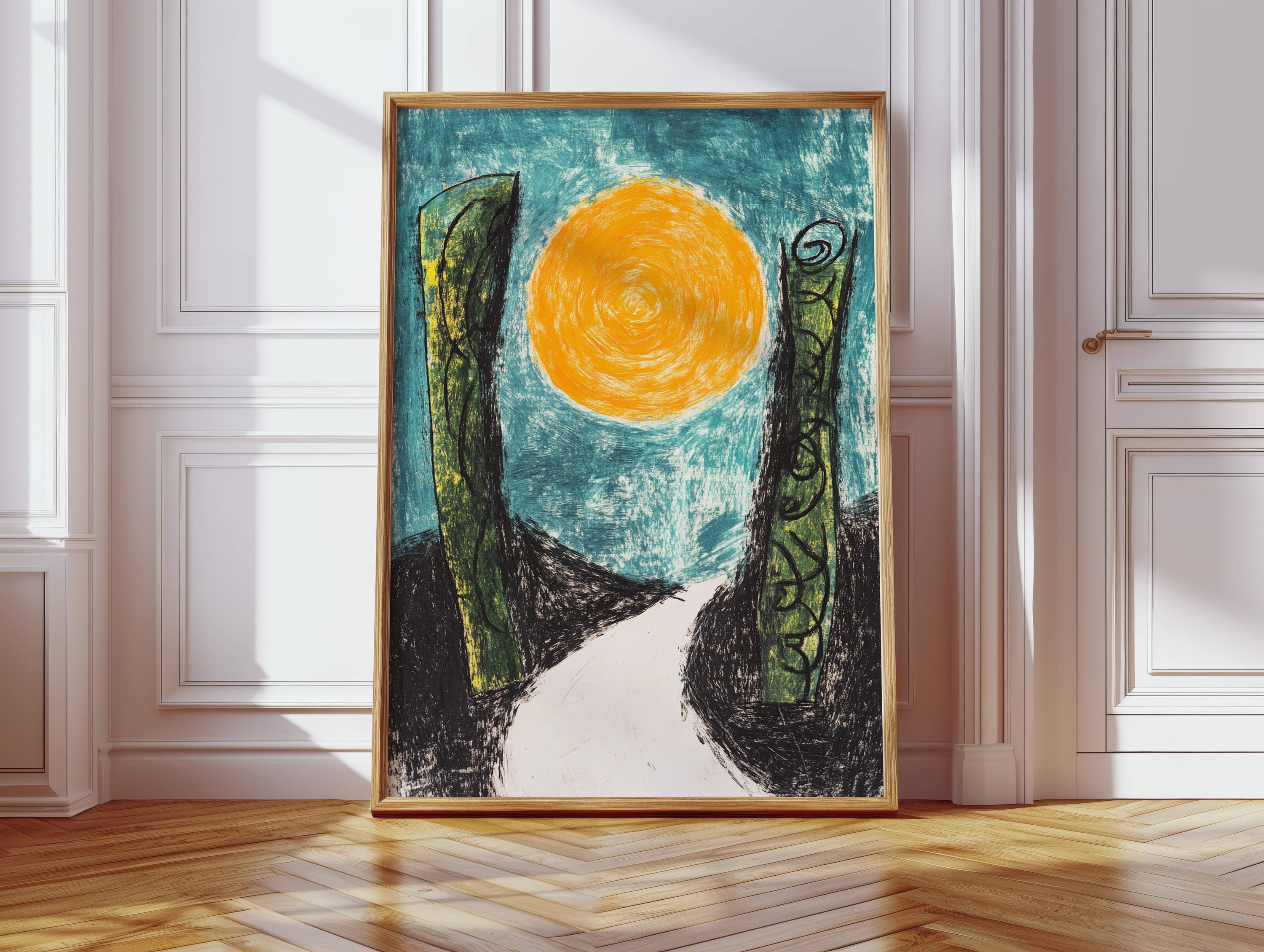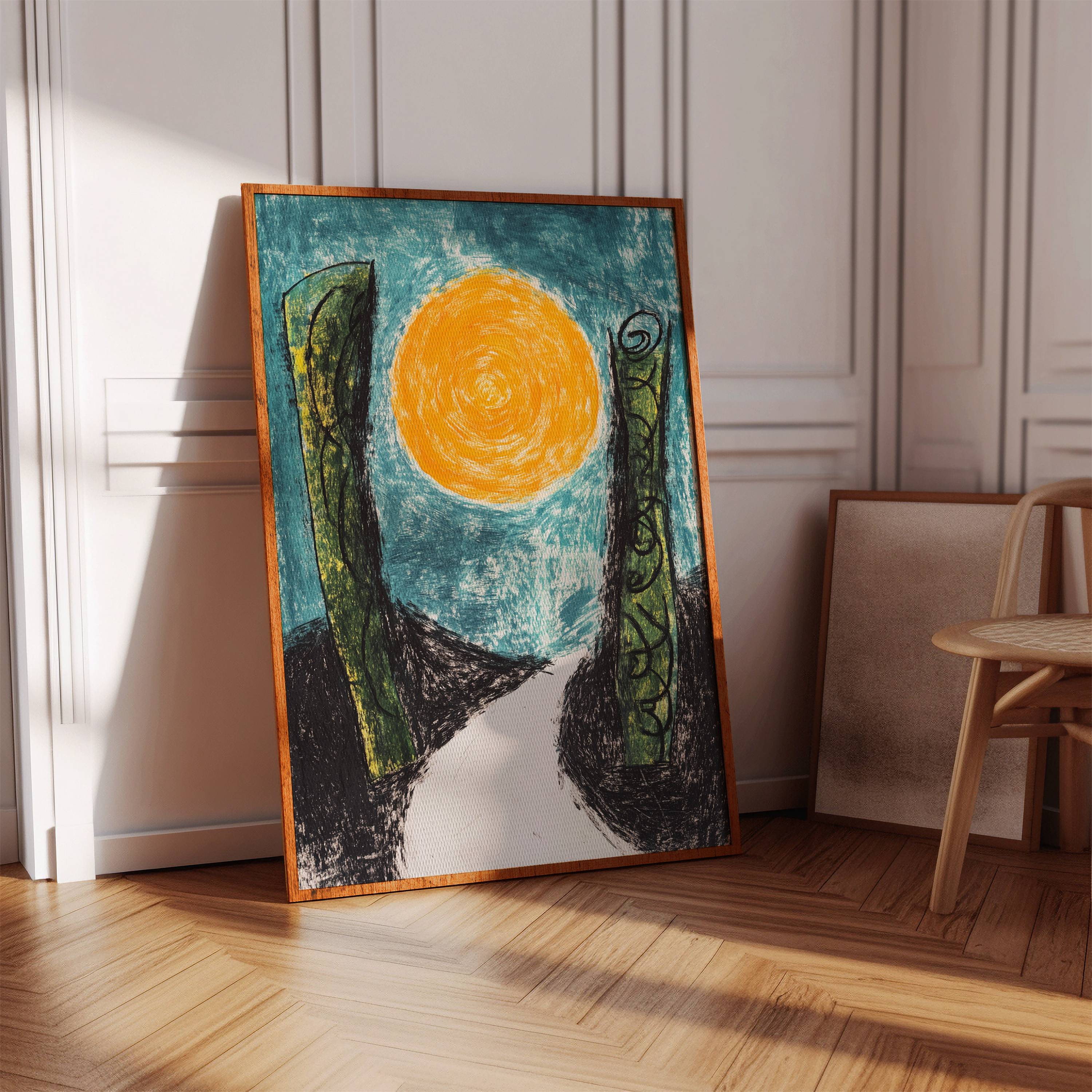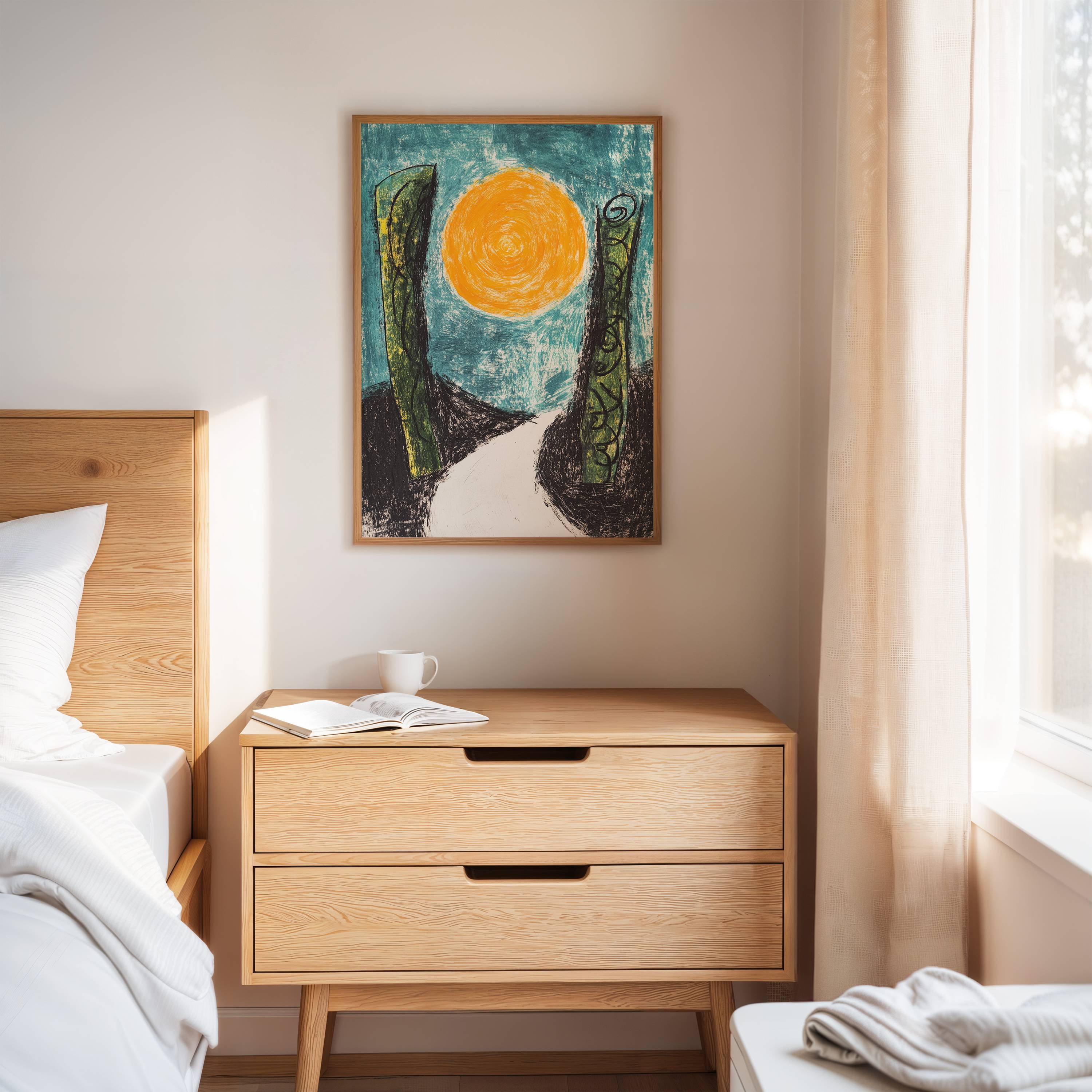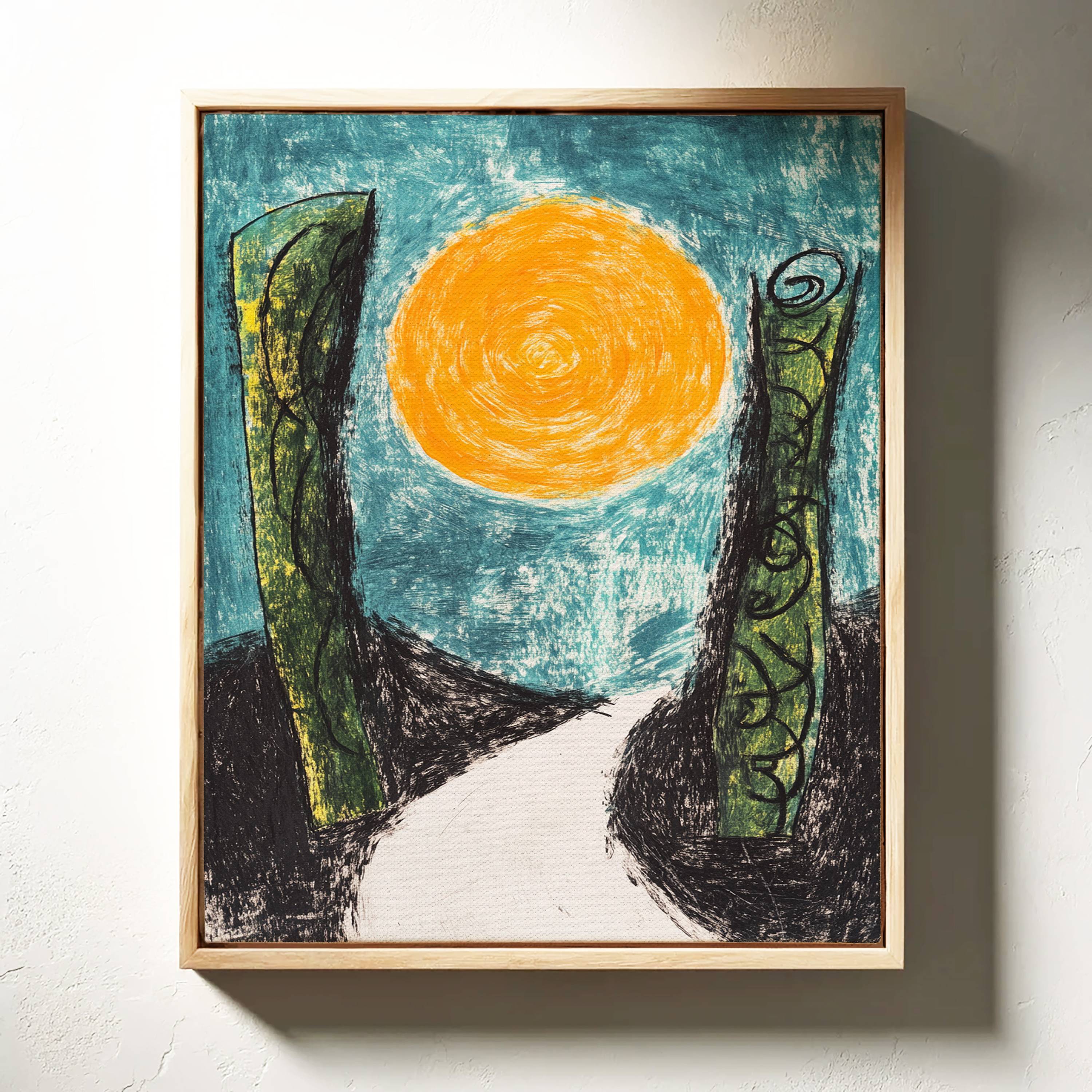 A winding white path cuts through darkness, leading to a brilliant golden orb suspended in a turquoise sky. The textured brushstrokes create a raw, emotional journey through towering green sentinels that frame the scene with their ancient presence. Decorative swirls and organic patterns dance along the forest edges, suggesting a mystical realm where nature and fantasy intertwine. This contemporary interpretation of a woodland passage would bring a sense of adventure and wonder to a reading nook or meditation space.