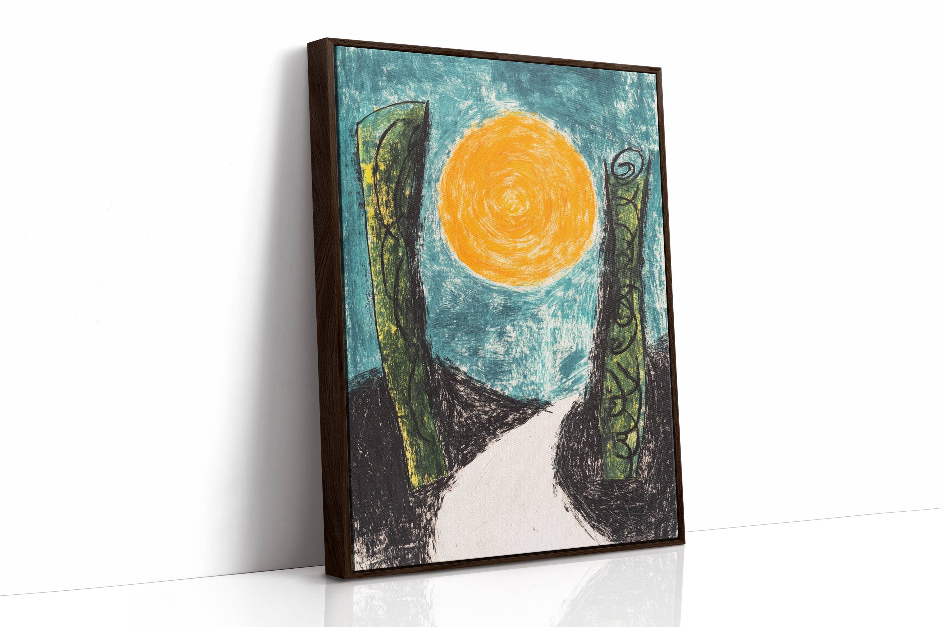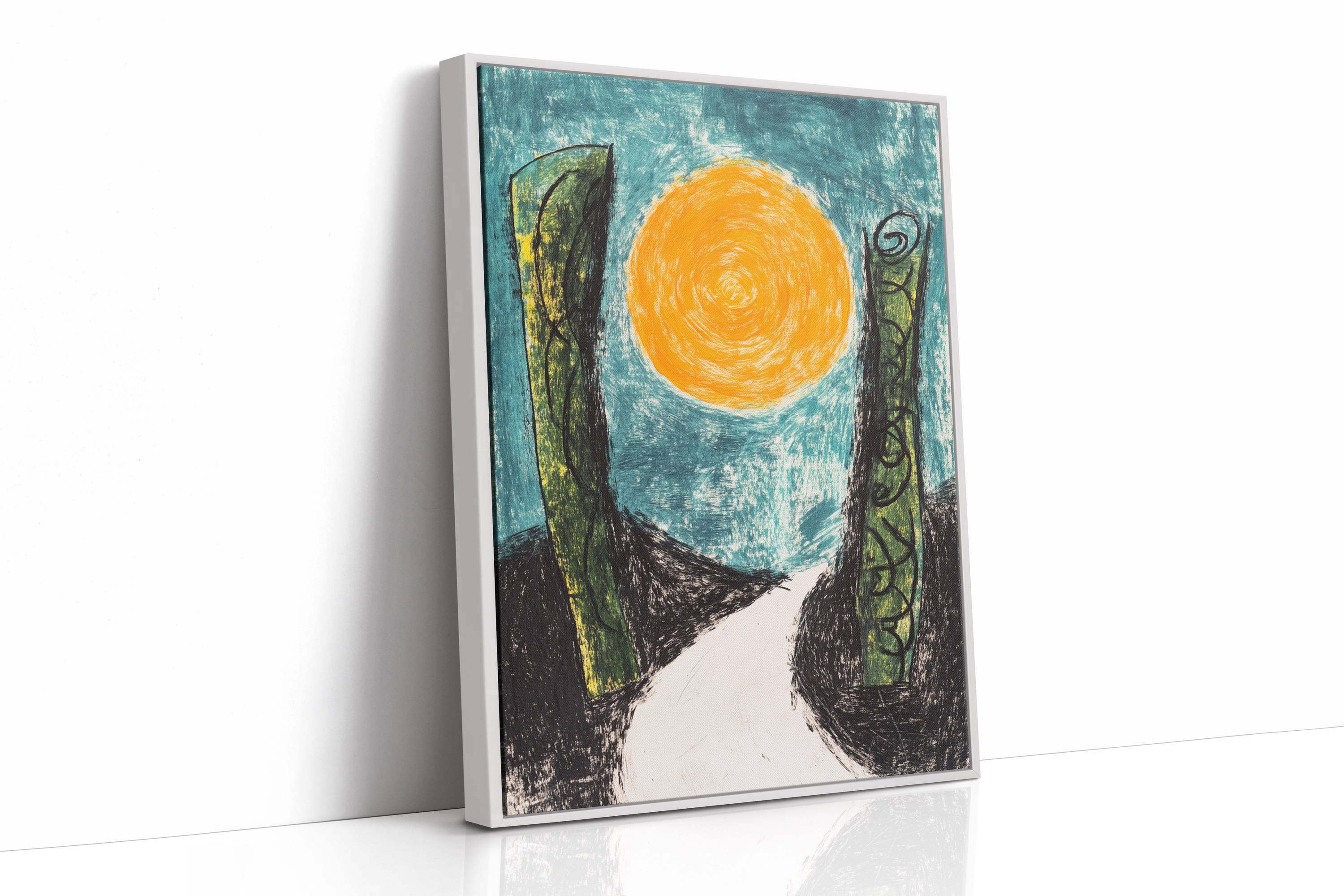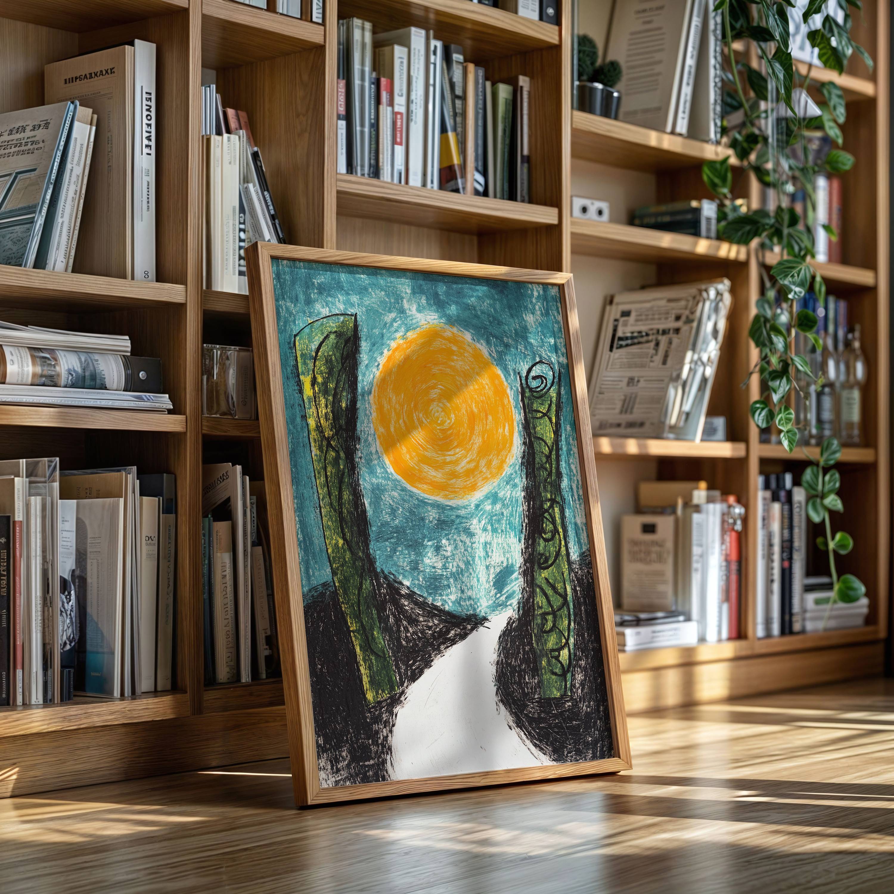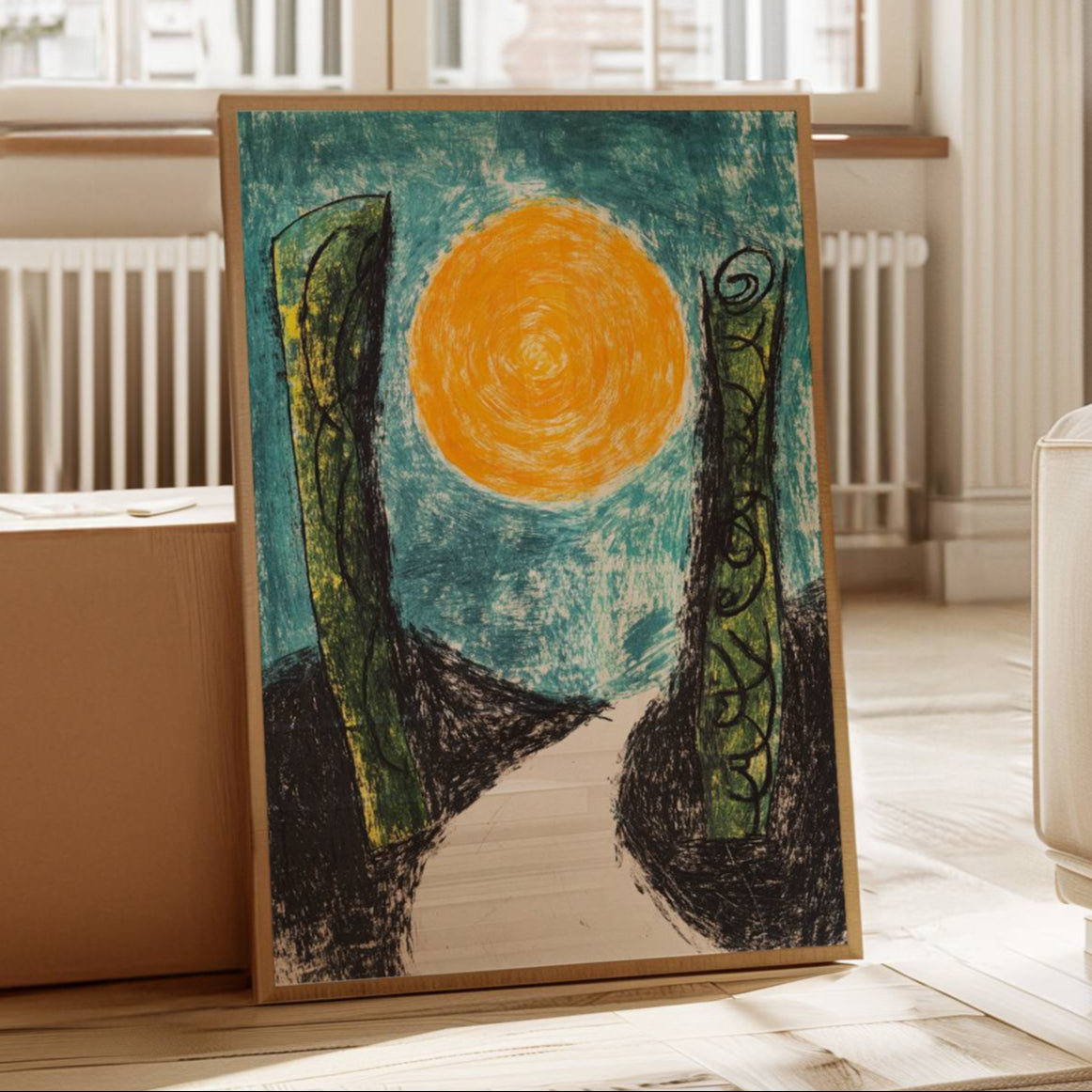 A winding white path cuts through darkness, leading to a brilliant golden orb suspended in a turquoise sky. The textured brushstrokes create a raw, emotional journey through towering green sentinels that frame the scene with their ancient presence. Decorative swirls and organic patterns dance along the forest edges, suggesting a mystical realm where nature and fantasy intertwine. This contemporary interpretation of a woodland passage would bring a sense of adventure and wonder to a reading nook or meditation space.