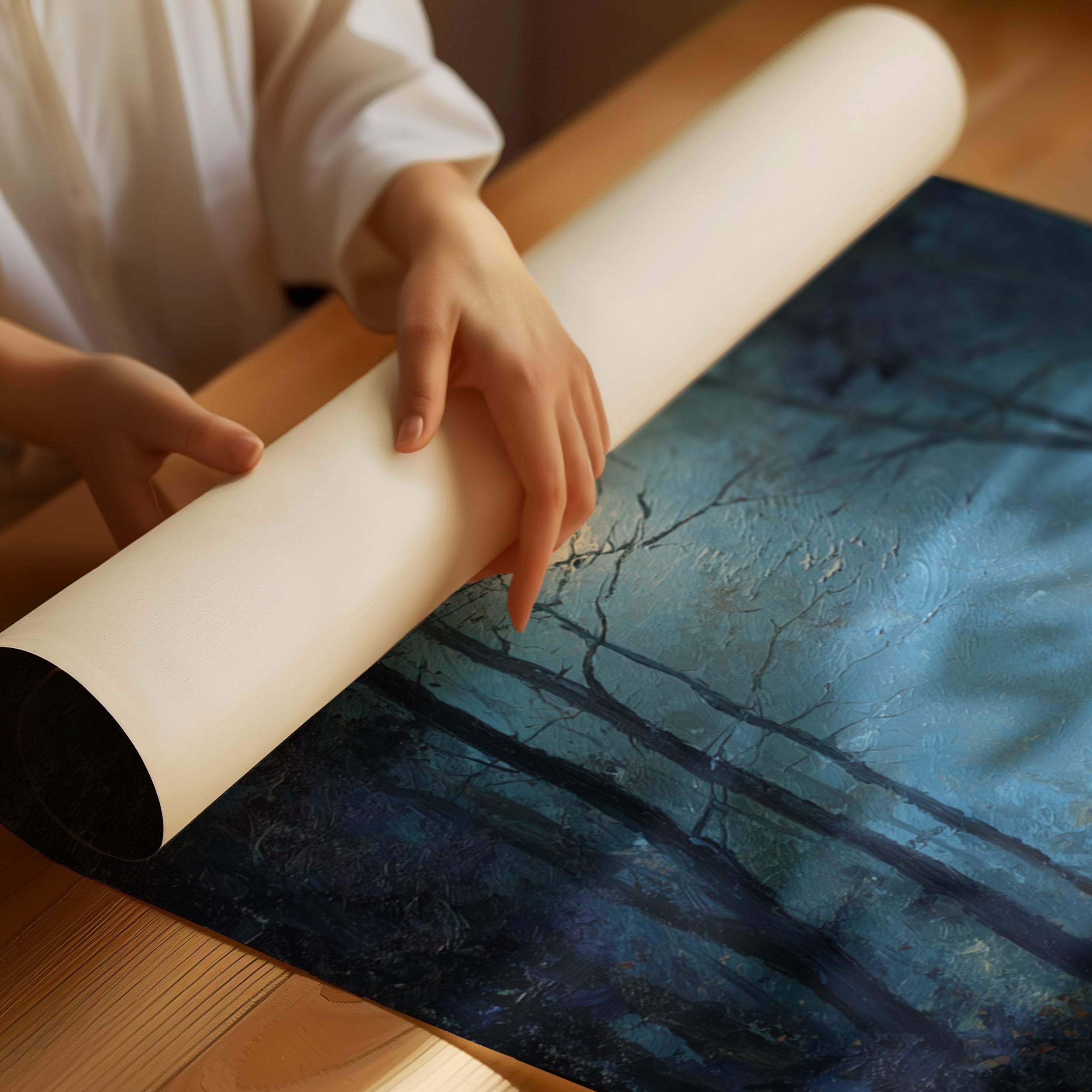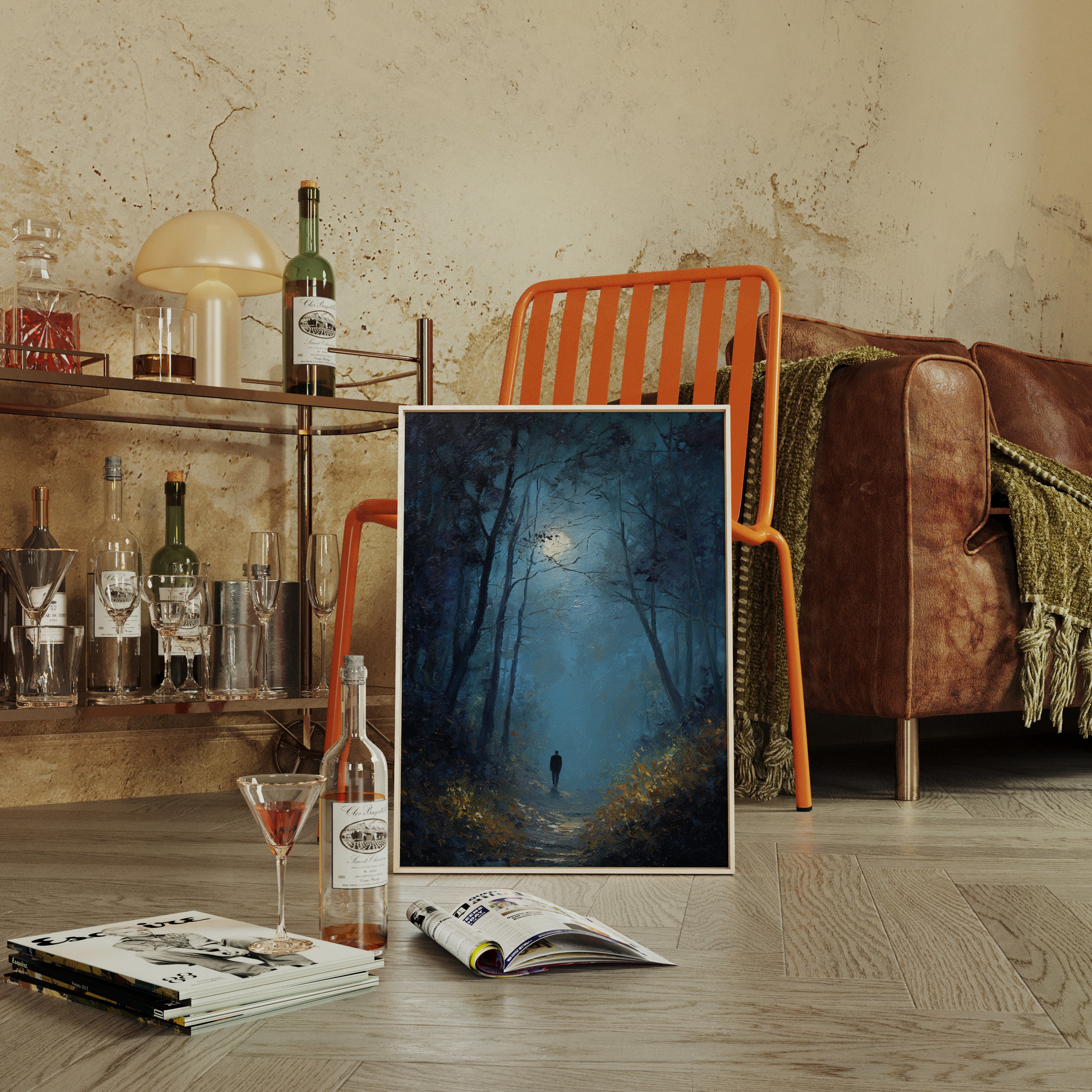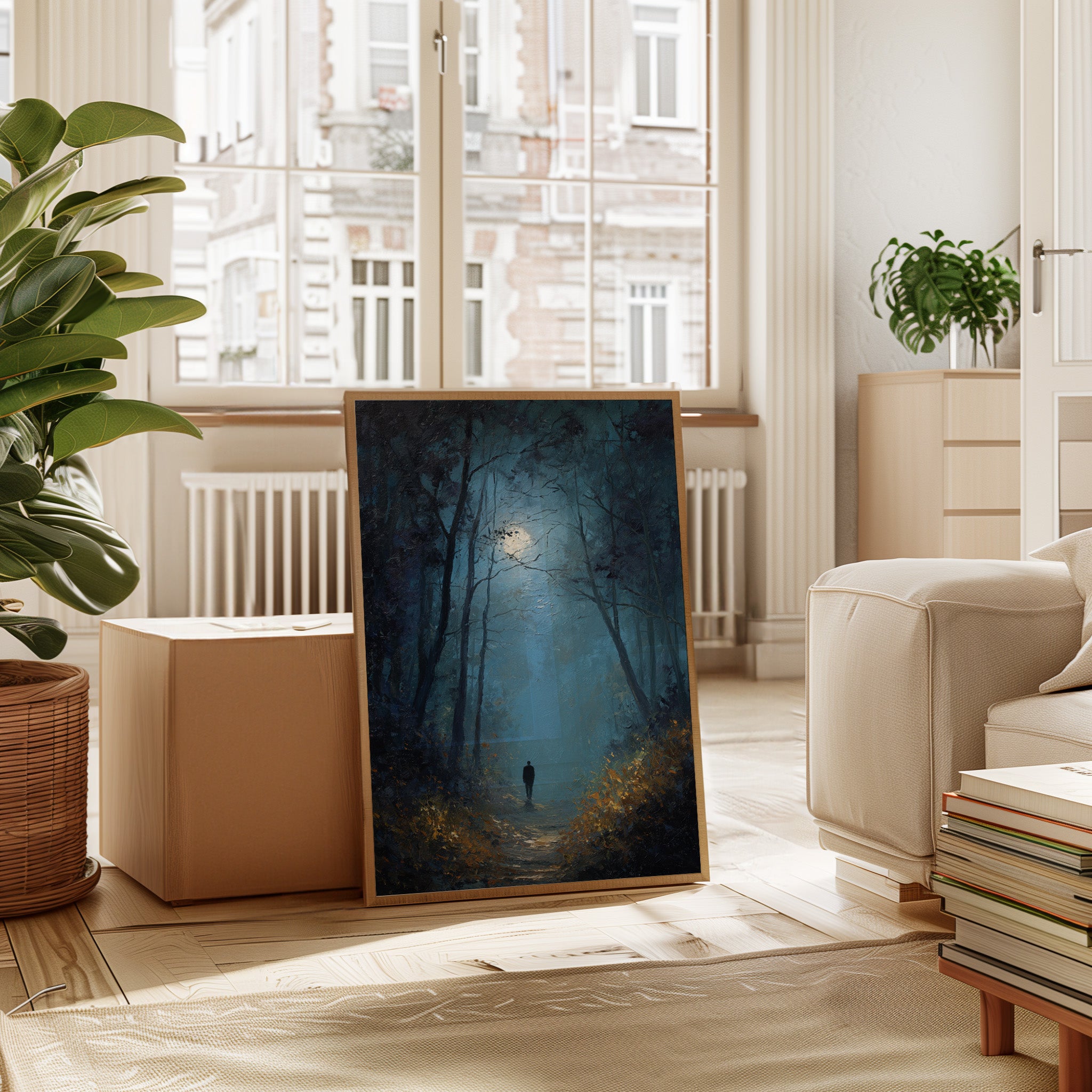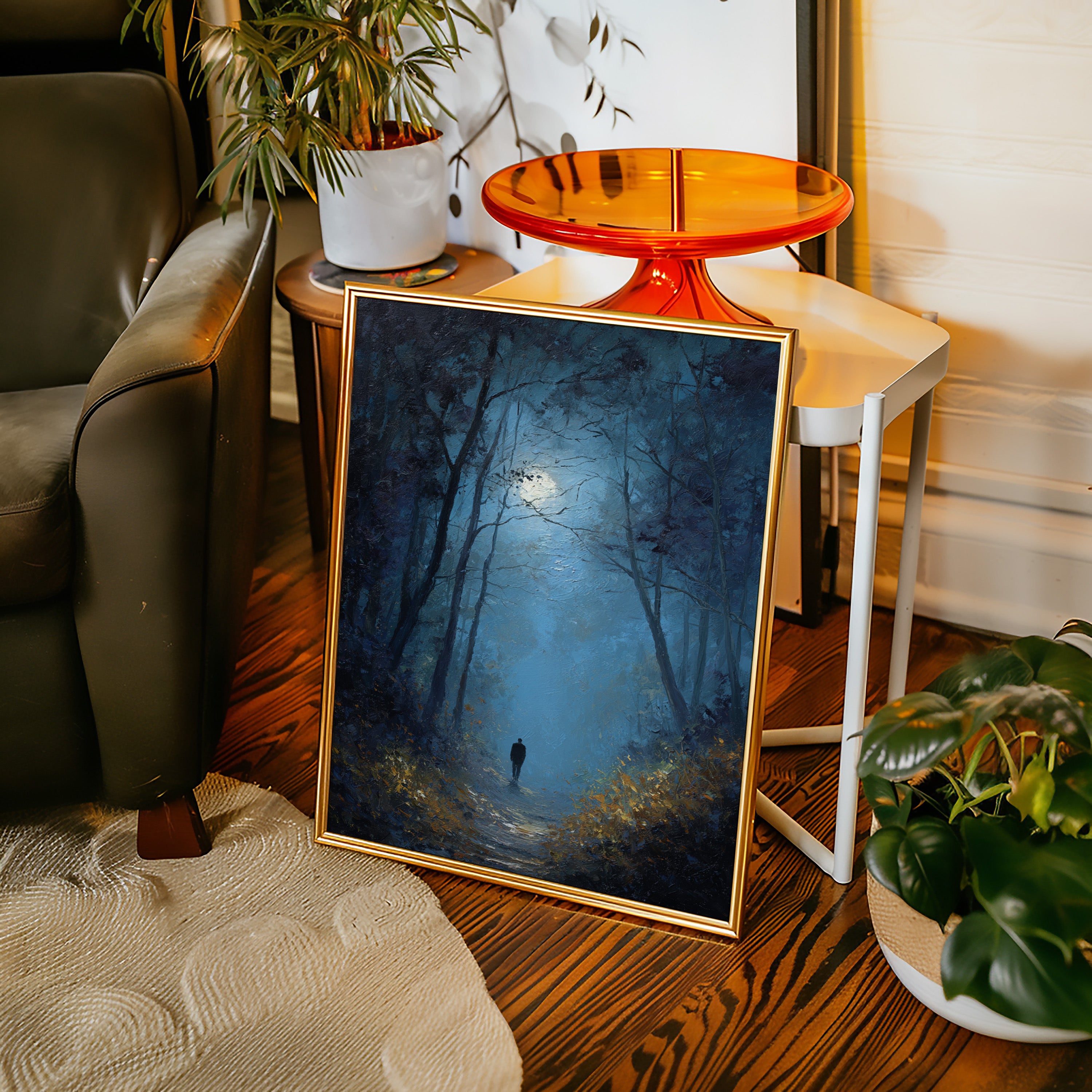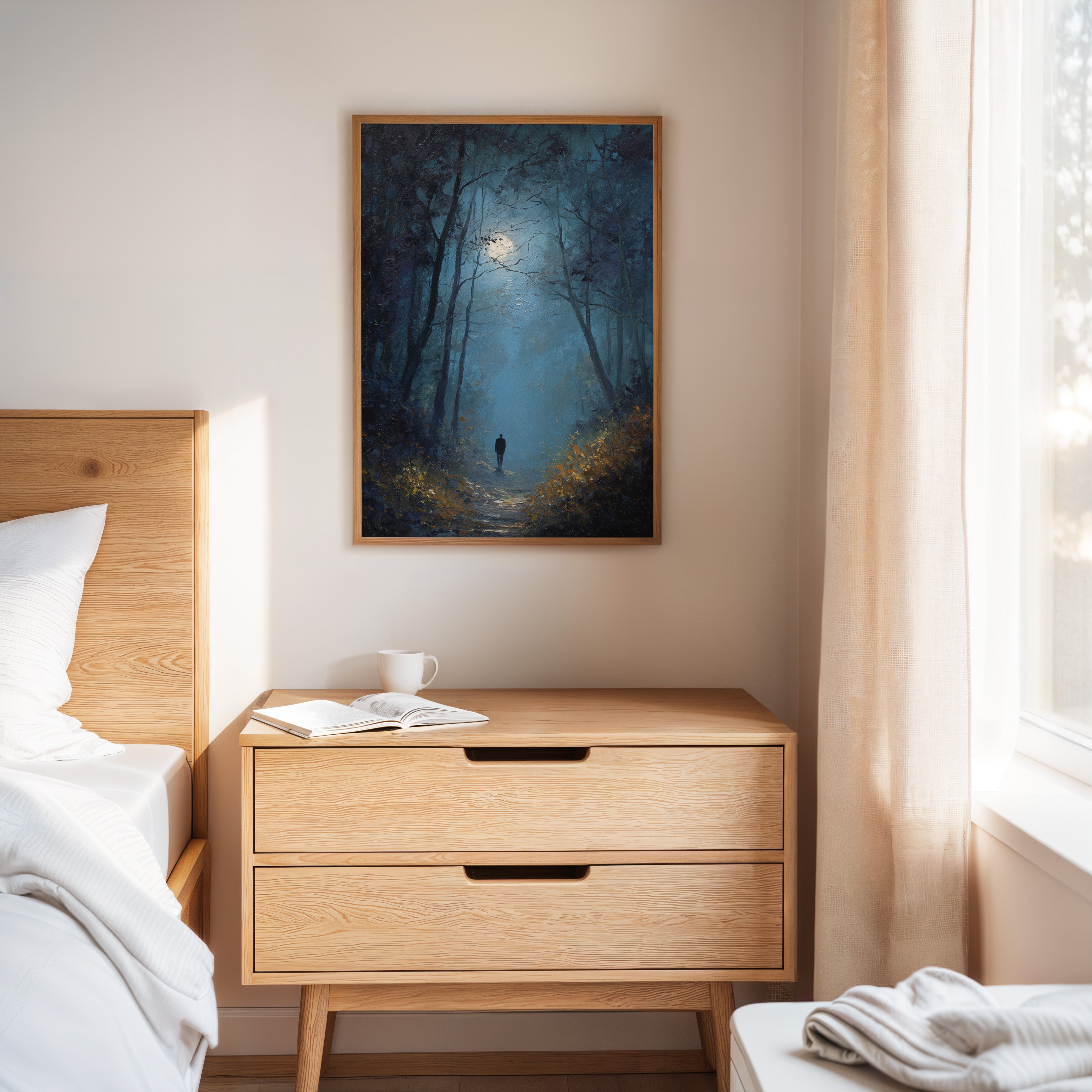 A solitary figure walks beneath the ethereal glow of a full moon, their silhouette small against the towering forest canopy. Deep blues and indigos create a mysterious atmosphere, while golden autumn foliage lines the misty path like nature's lanterns. The textured brushstrokes capture the raw emotion of solitude, with moonbeams filtering through bare branches to illuminate the way forward. This piece would bring a sense of contemplative serenity to a reading nook or meditation space, inviting viewers to pause and reflect on life's quiet journeys.