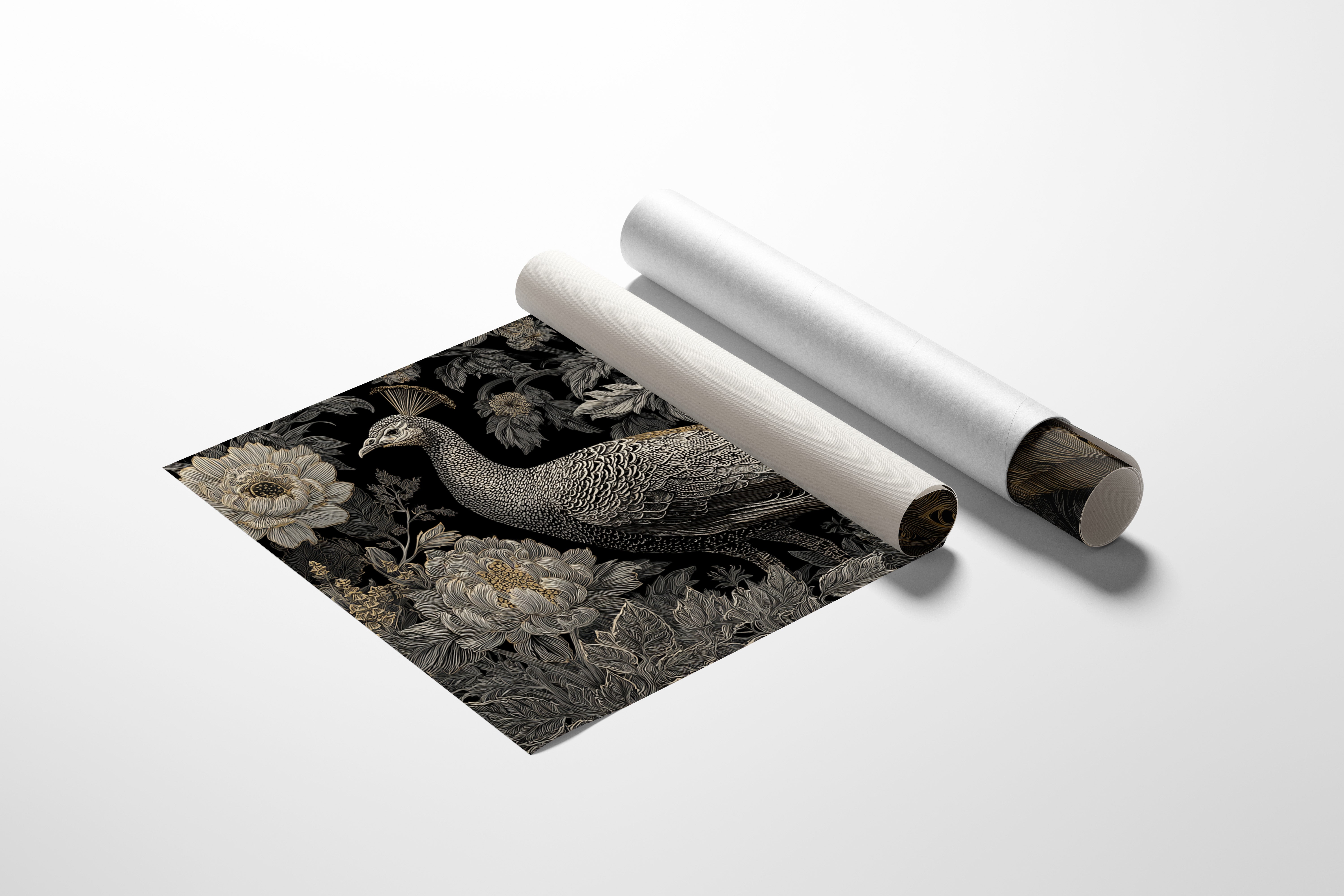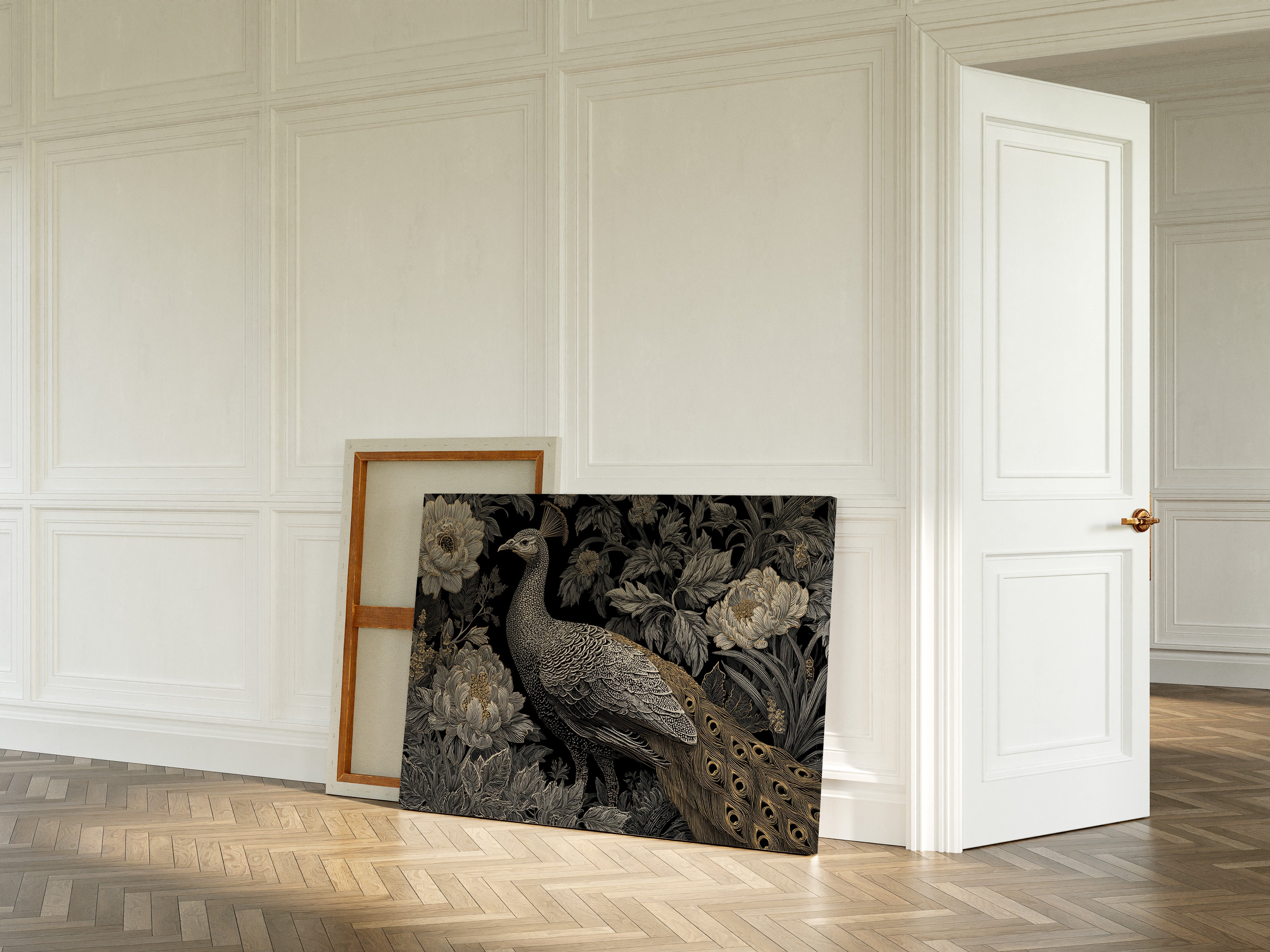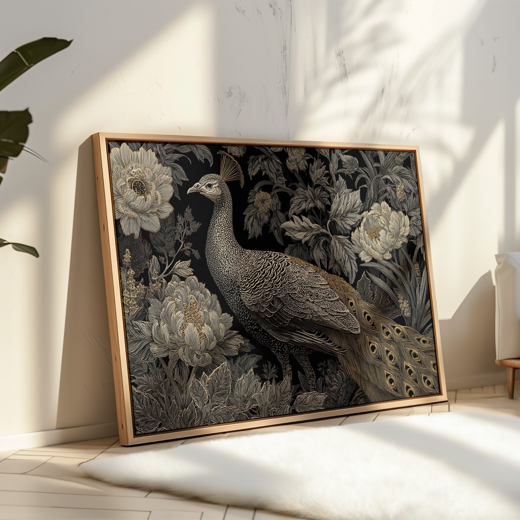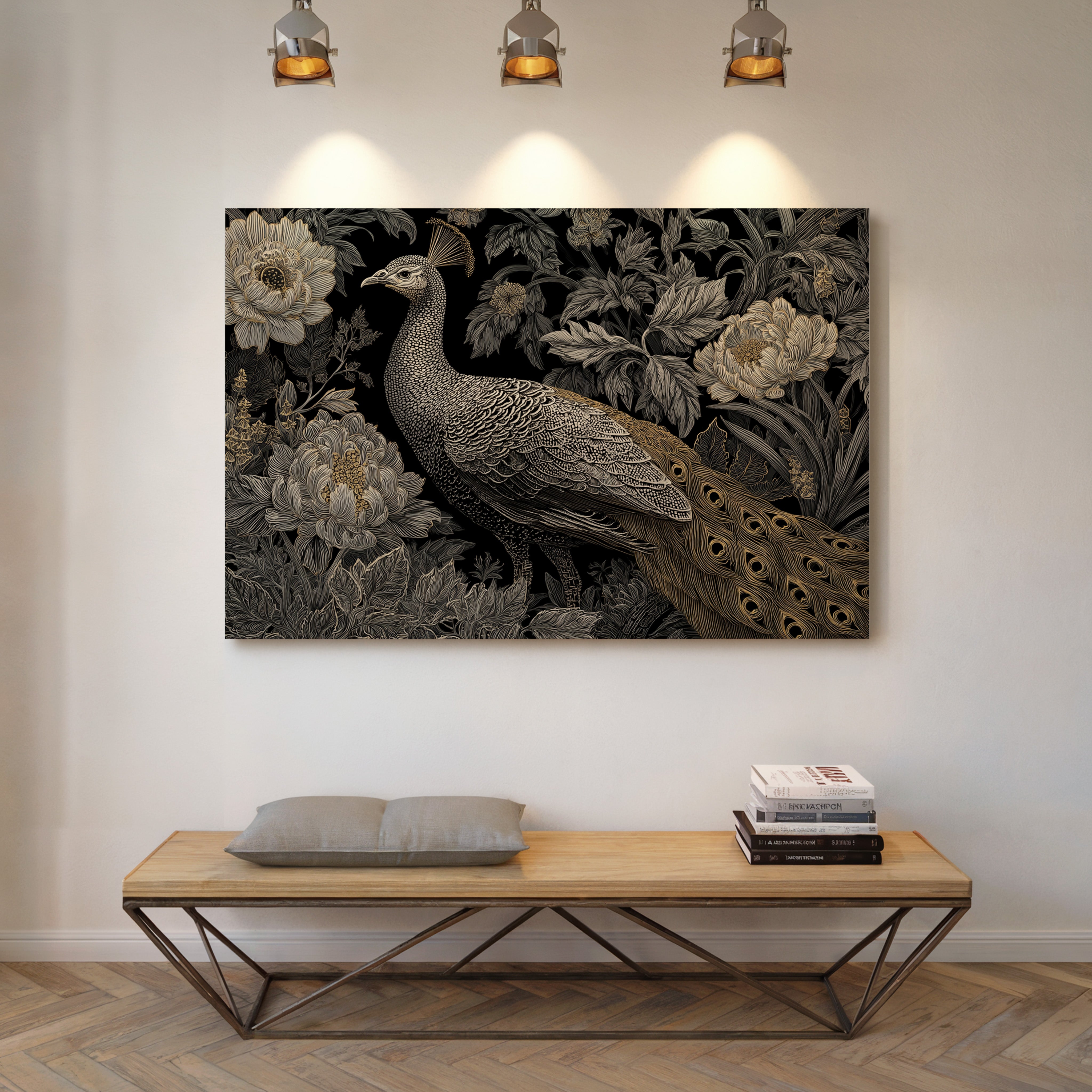 In the depths of night, silver and gold intertwine like ancient poetry. A majestic peacock stands sentinel among blooming peonies, its detailed plumage rendered in exquisite metallic patterns against the velvet darkness. The composition flows with sophisticated grace, where every feather and petal is meticulously etched in a dance of light and shadow. This striking piece marries Oriental artistry with contemporary elegance, creating a timeless narrative of natural beauty. Perfect for making a bold statement in formal dining rooms or adding dramatic sophistication to master bedrooms.