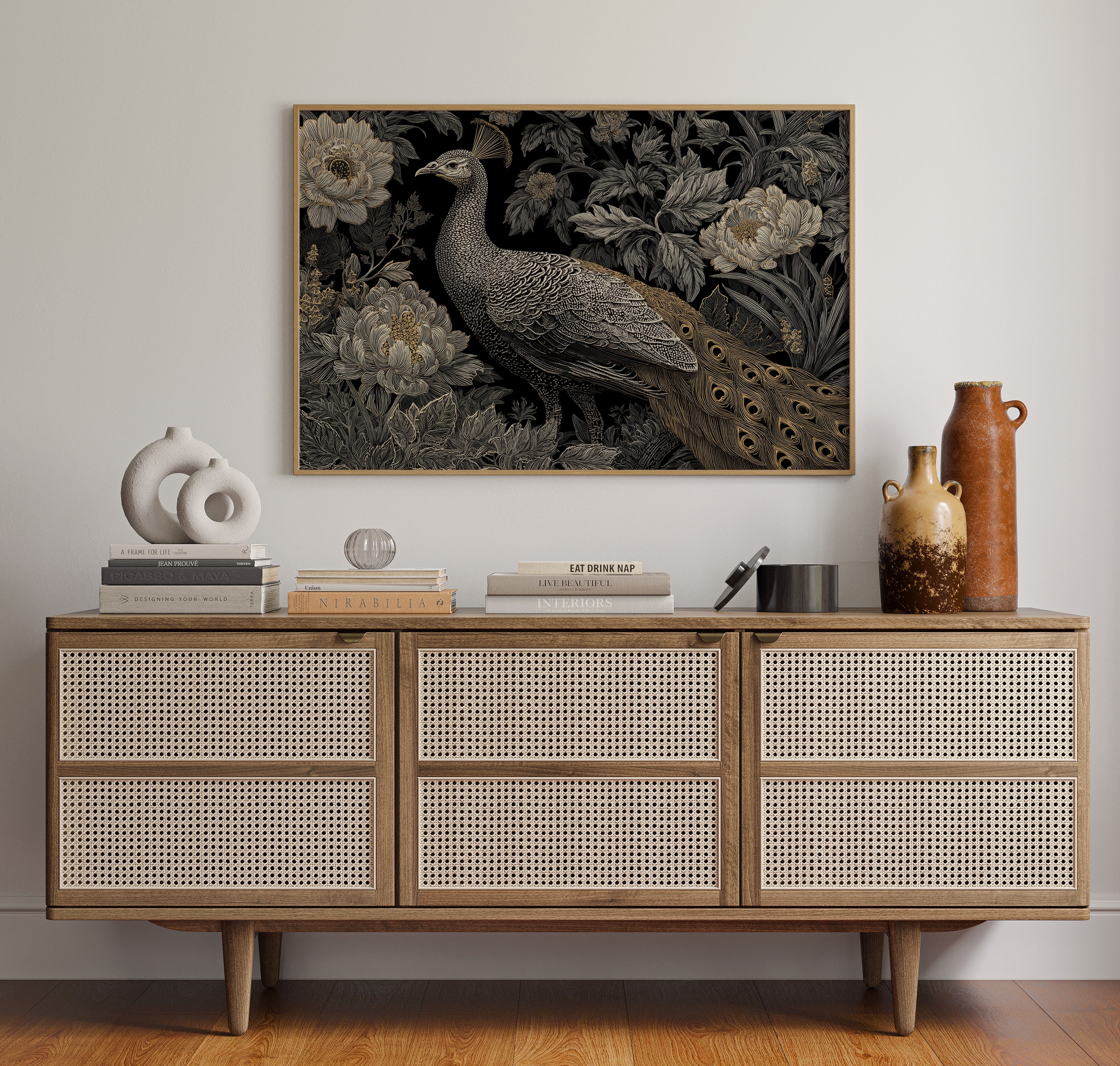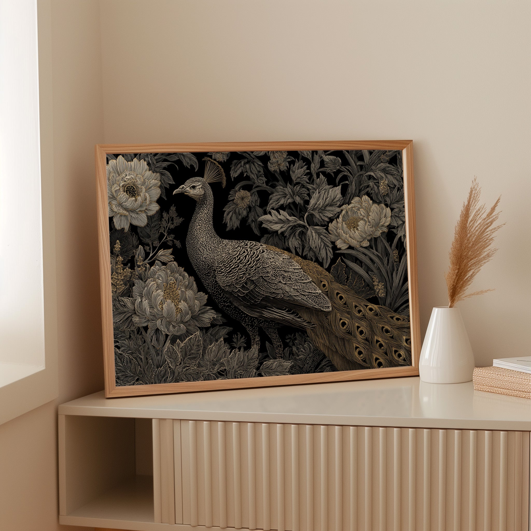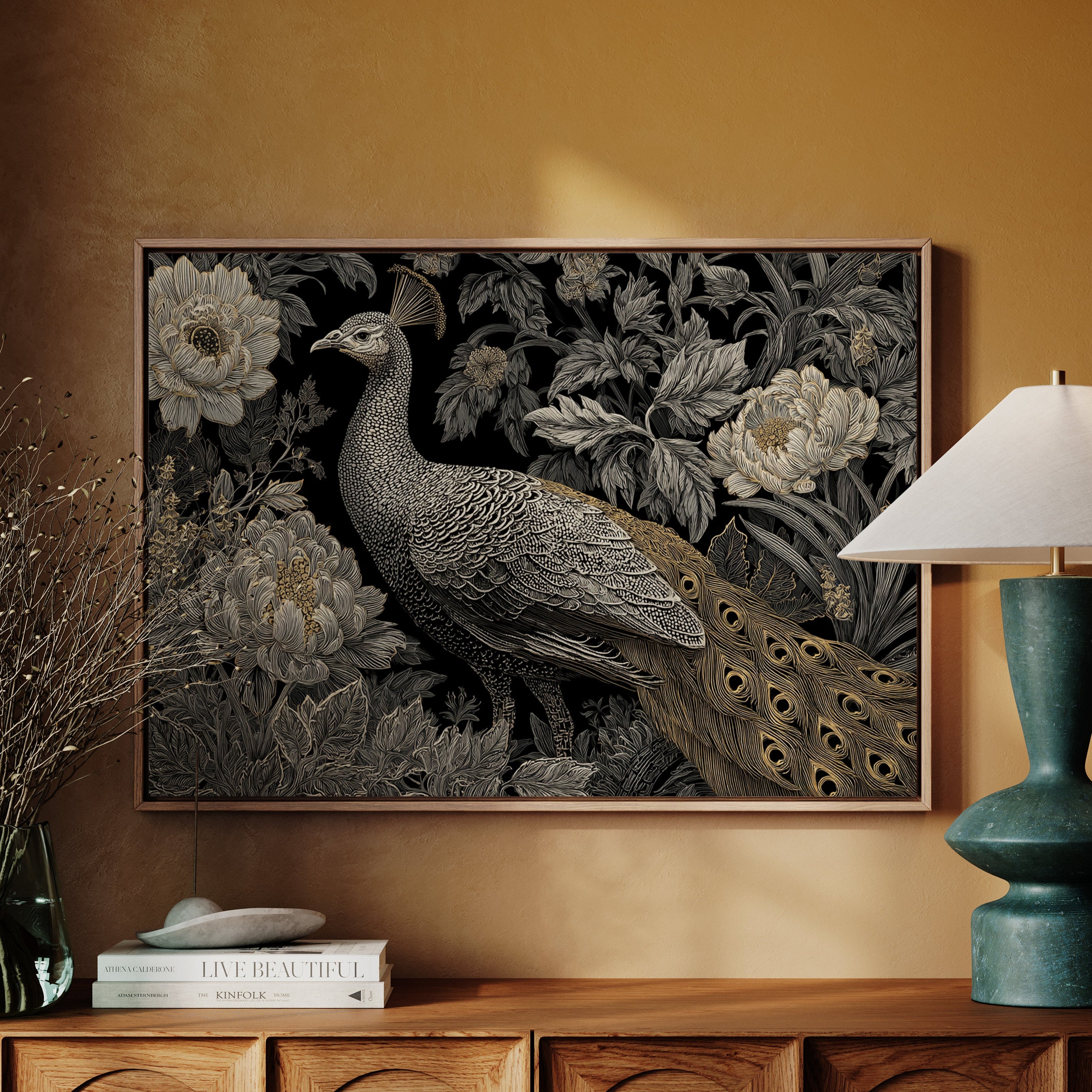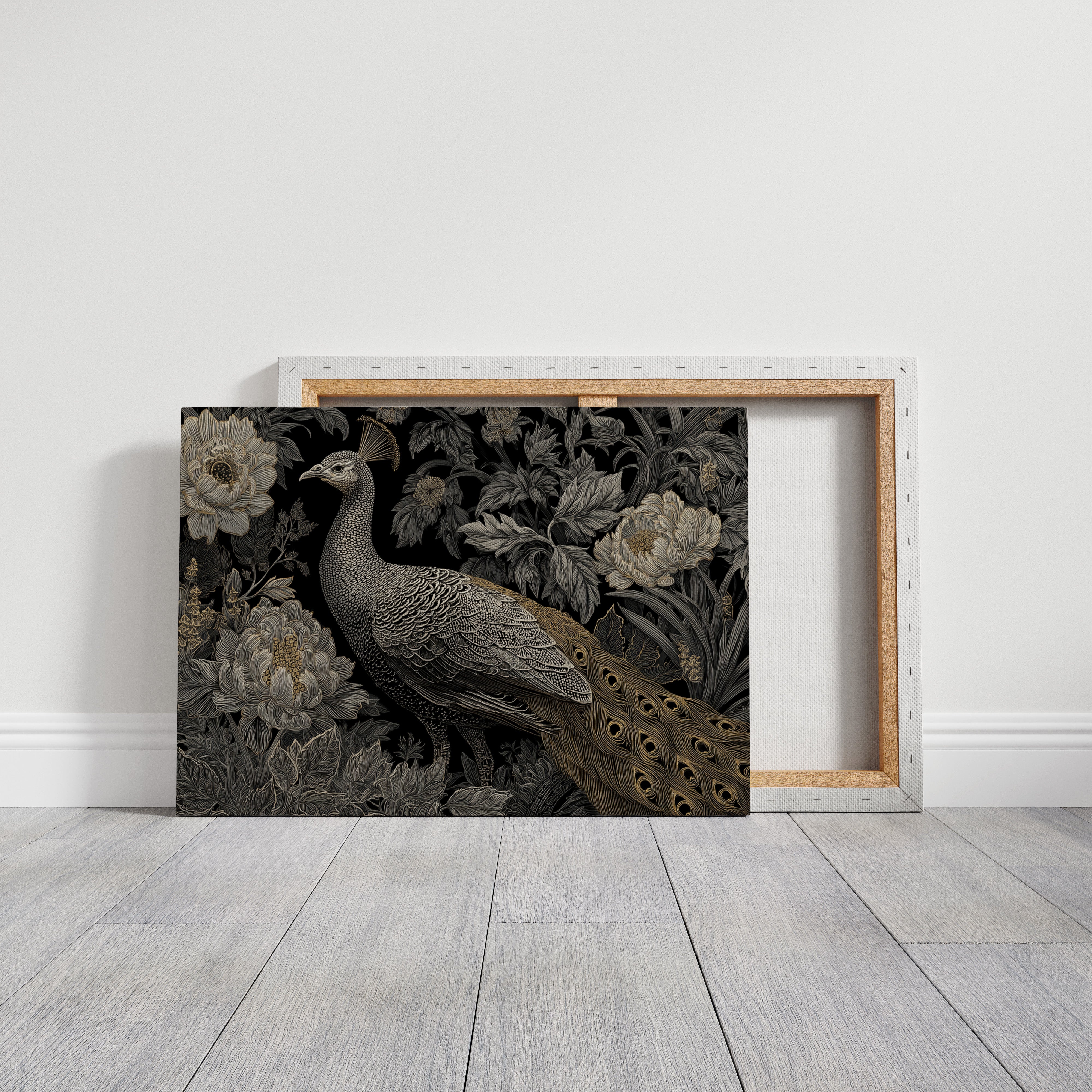 In the depths of night, silver and gold intertwine like ancient poetry. A majestic peacock stands sentinel among blooming peonies, its detailed plumage rendered in exquisite metallic patterns against the velvet darkness. The composition flows with sophisticated grace, where every feather and petal is meticulously etched in a dance of light and shadow. This striking piece marries Oriental artistry with contemporary elegance, creating a timeless narrative of natural beauty. Perfect for making a bold statement in formal dining rooms or adding dramatic sophistication to master bedrooms.