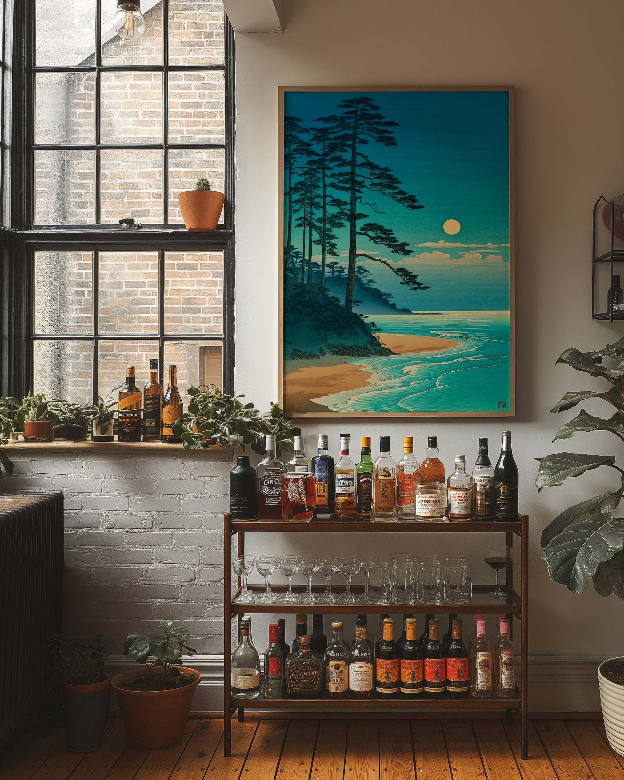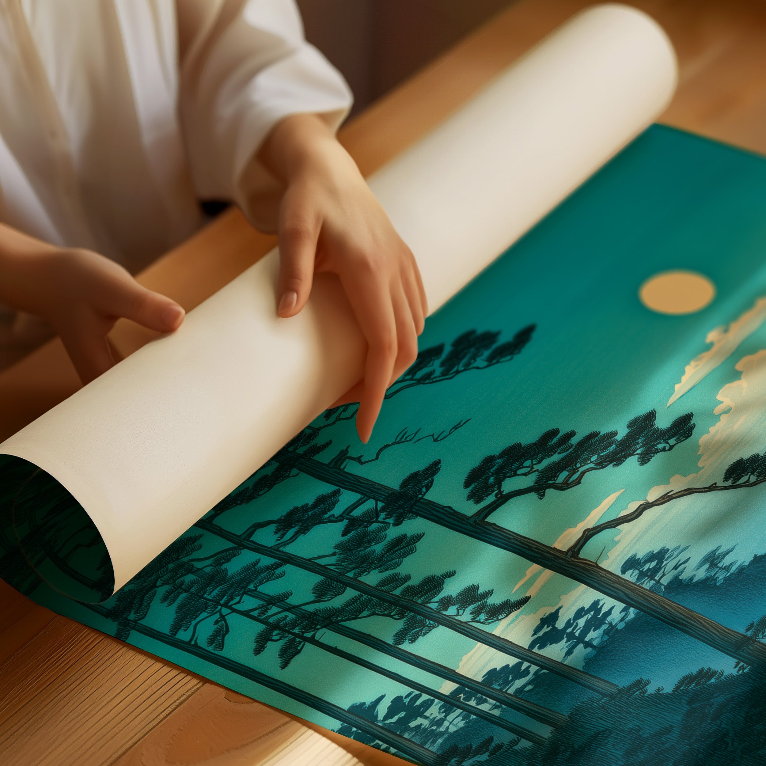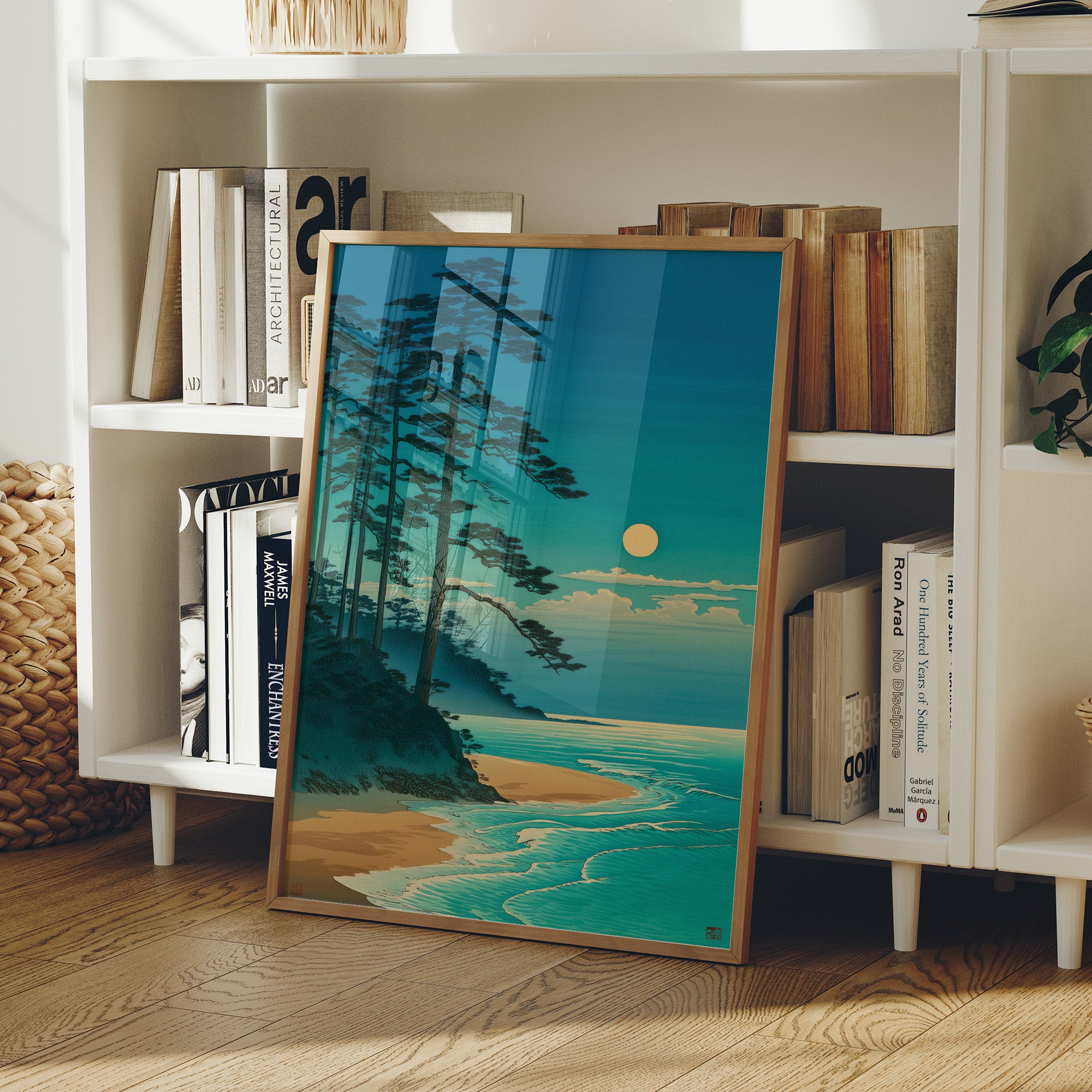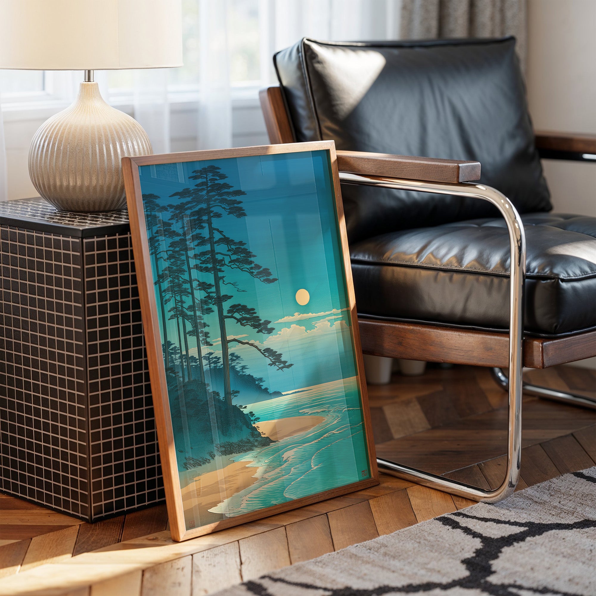 Tranquil waves lap against a moonlit shore, where towering pines stand sentinel against a turquoise night sky. The scene captures that magical moment when dusk settles into evening, painting the ocean in luminescent aqua hues while a golden moon hangs perfectly suspended above wispy clouds. The composition masterfully balances the vertical strength of the pine trees with the horizontal flow of gentle waves, creating a harmonious dance between land and sea. This piece would bring a sense of serenity to a reading nook or meditation space, where its calming coastal energy can inspire moments of quiet reflection.