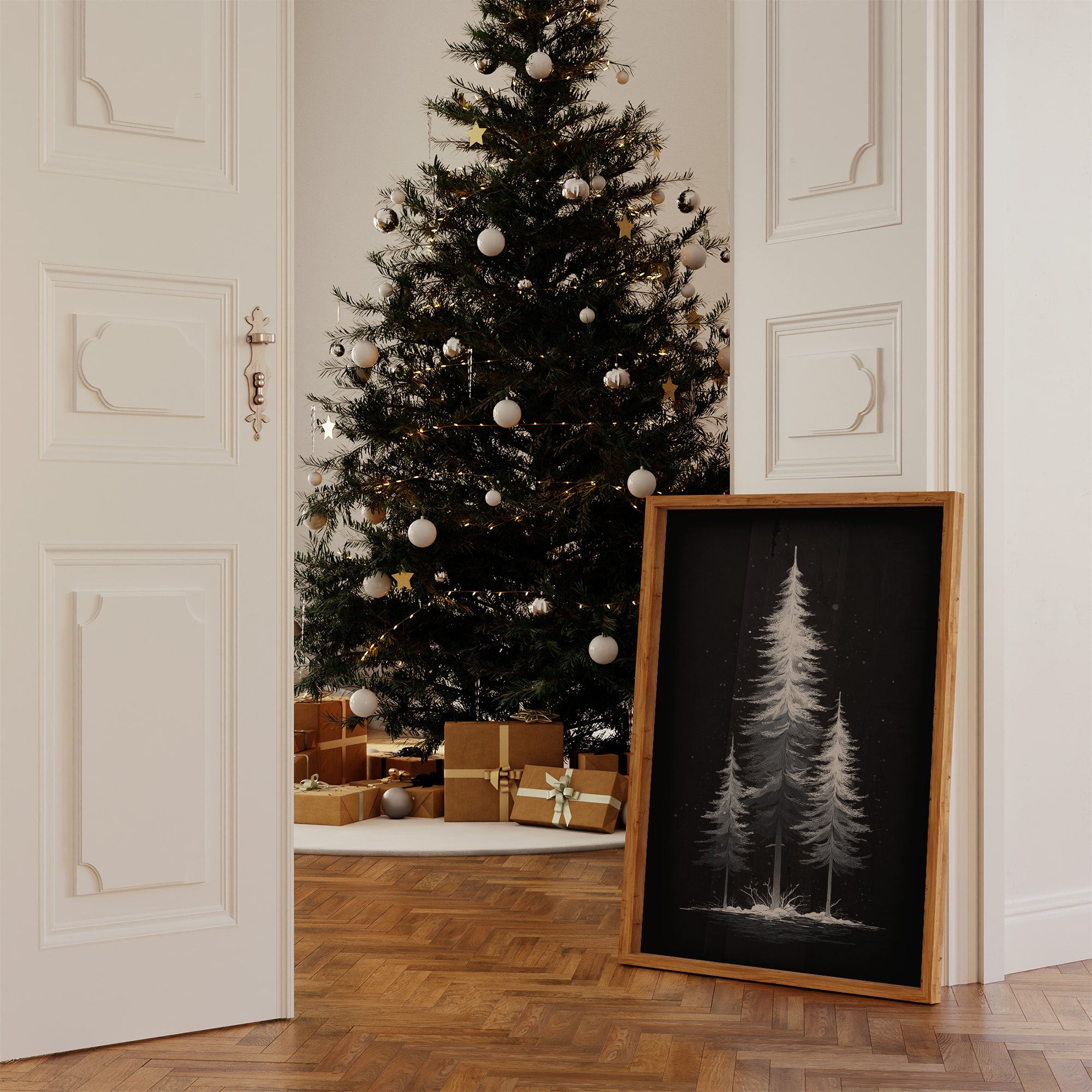 In the depths of a winter night, three ethereal pines stand like luminous sentinels against the darkness. Their delicate, feather-like branches catch the silvery light, creating an almost otherworldly glow against the obsidian sky. The detailed brushwork captures each needle with crystalline precision, while scattered stars dust the scene with diamond-like sparkle. At their feet, snow gathers in gentle drifts, reflecting the same celestial radiance that bathes their towering forms. This piece would create a striking focal point in a modern minimalist space, bringing a sense of winter's quiet magic to any room.