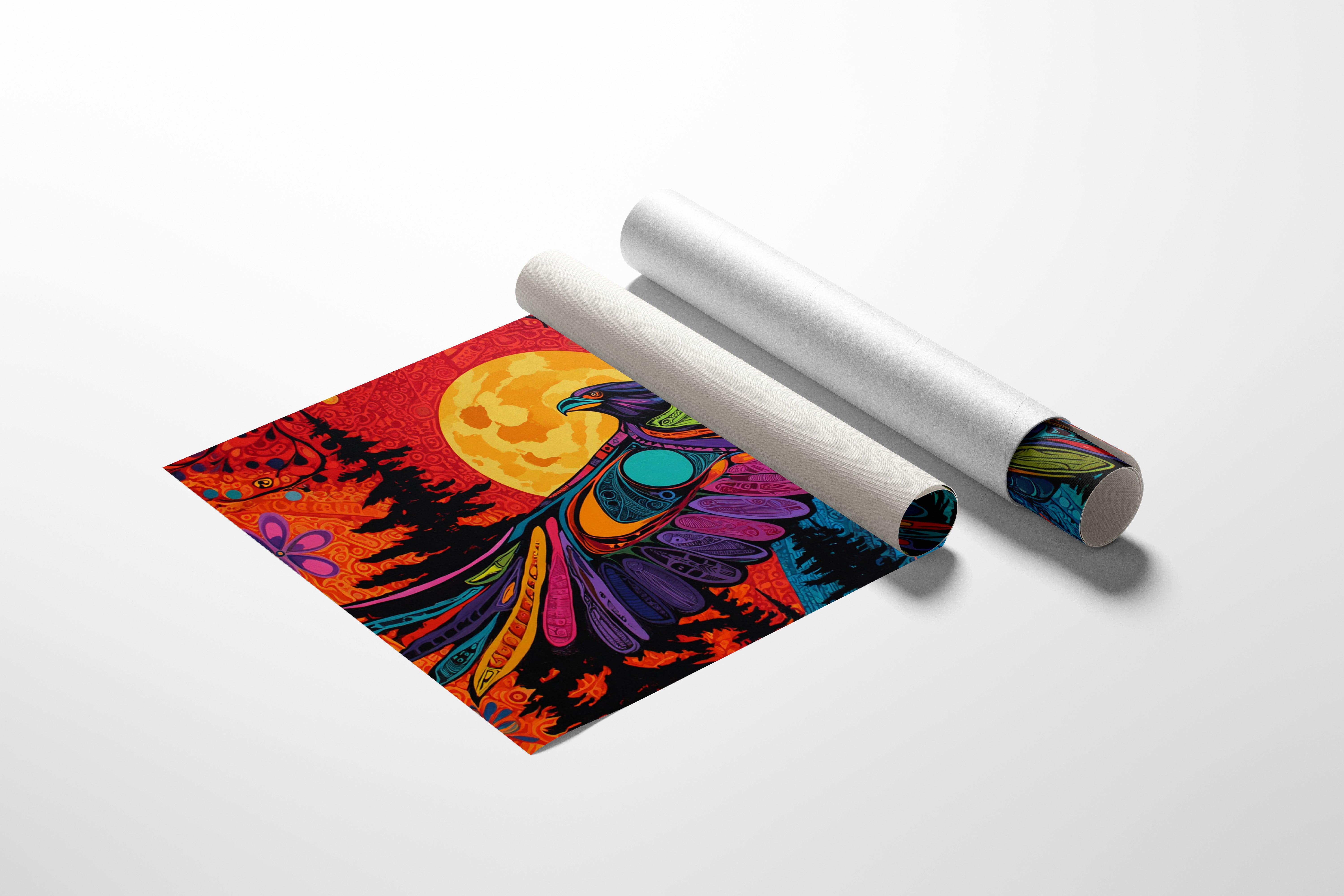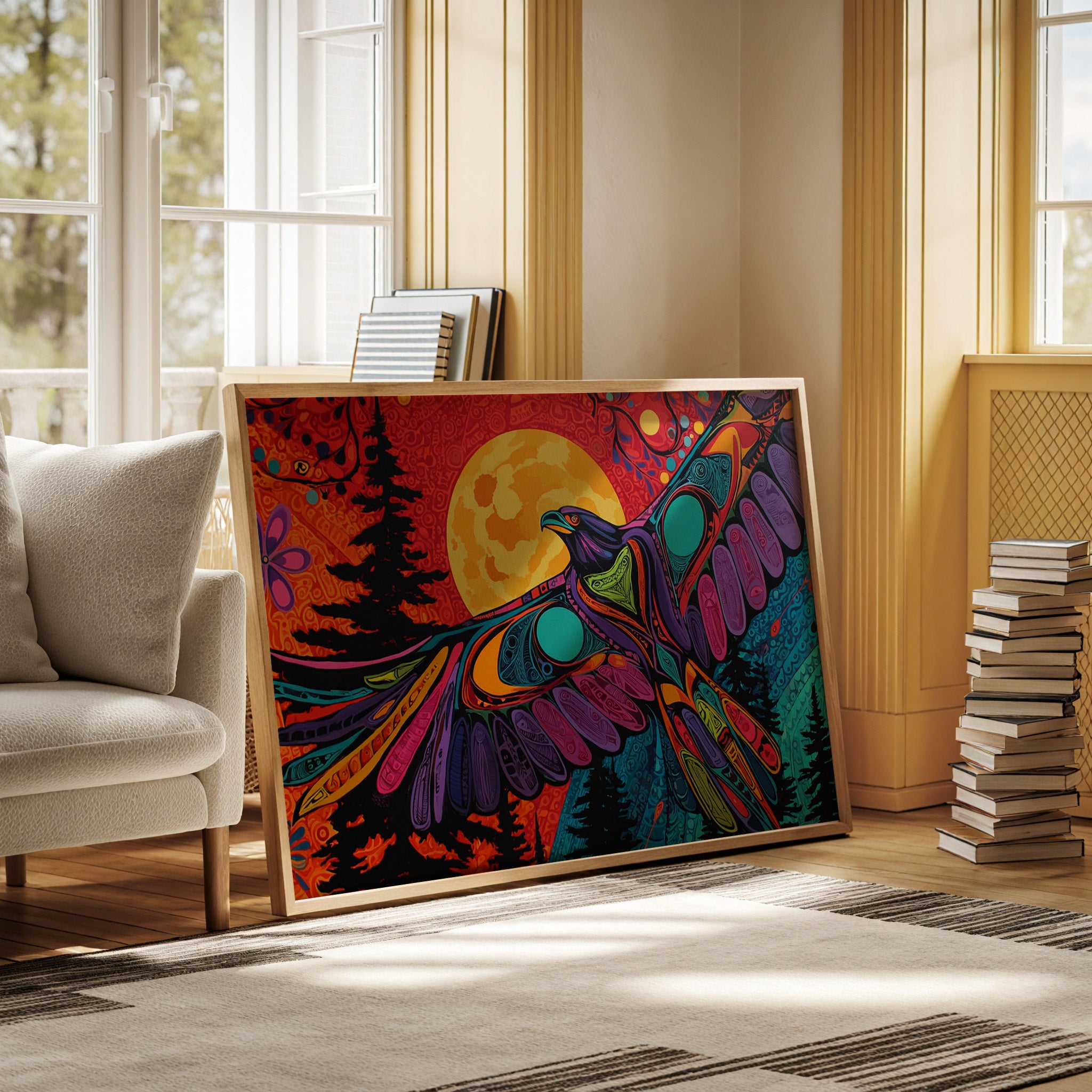 A mystical raven takes flight against a blazing golden moon, its wings unfurling in a spectacular display of jewel-toned feathers. Each feather tells its own story through intricate patterns and bold colors - deep purples, vibrant teals, and rich crimsons swirling together in a psychedelic dance. Dark pine sentinels stand watch at the edges, while ornate patterns ripple across a sky that burns with supernatural energy. This piece captures the profound connection between nature's wild spirit and Native American artistic traditions.