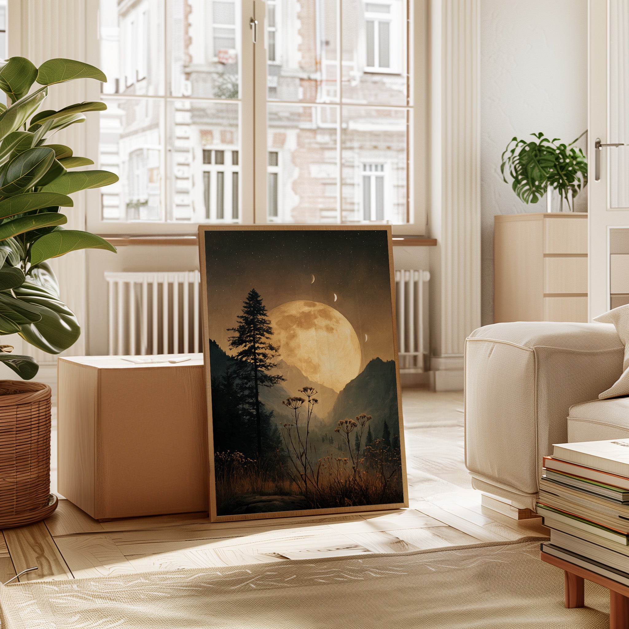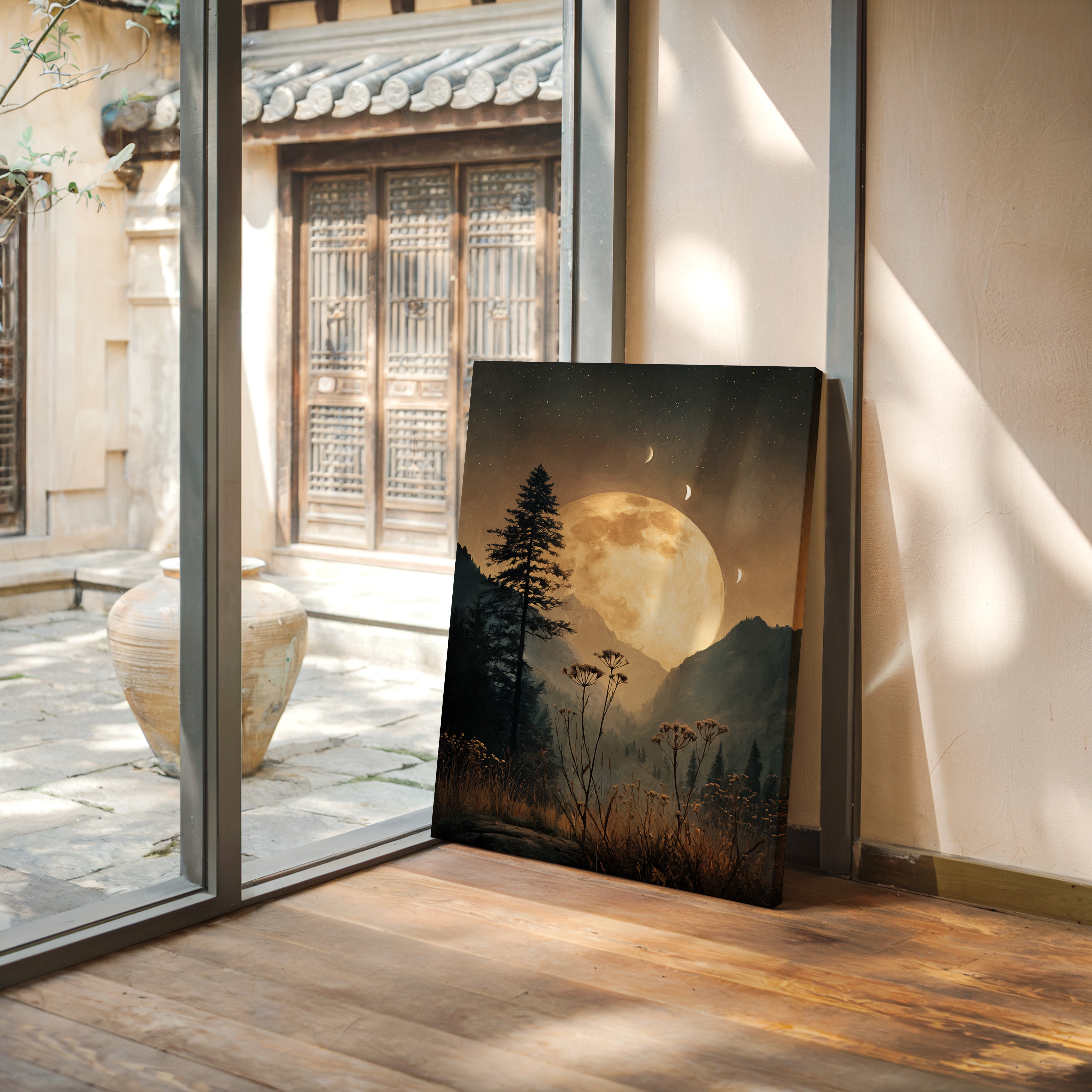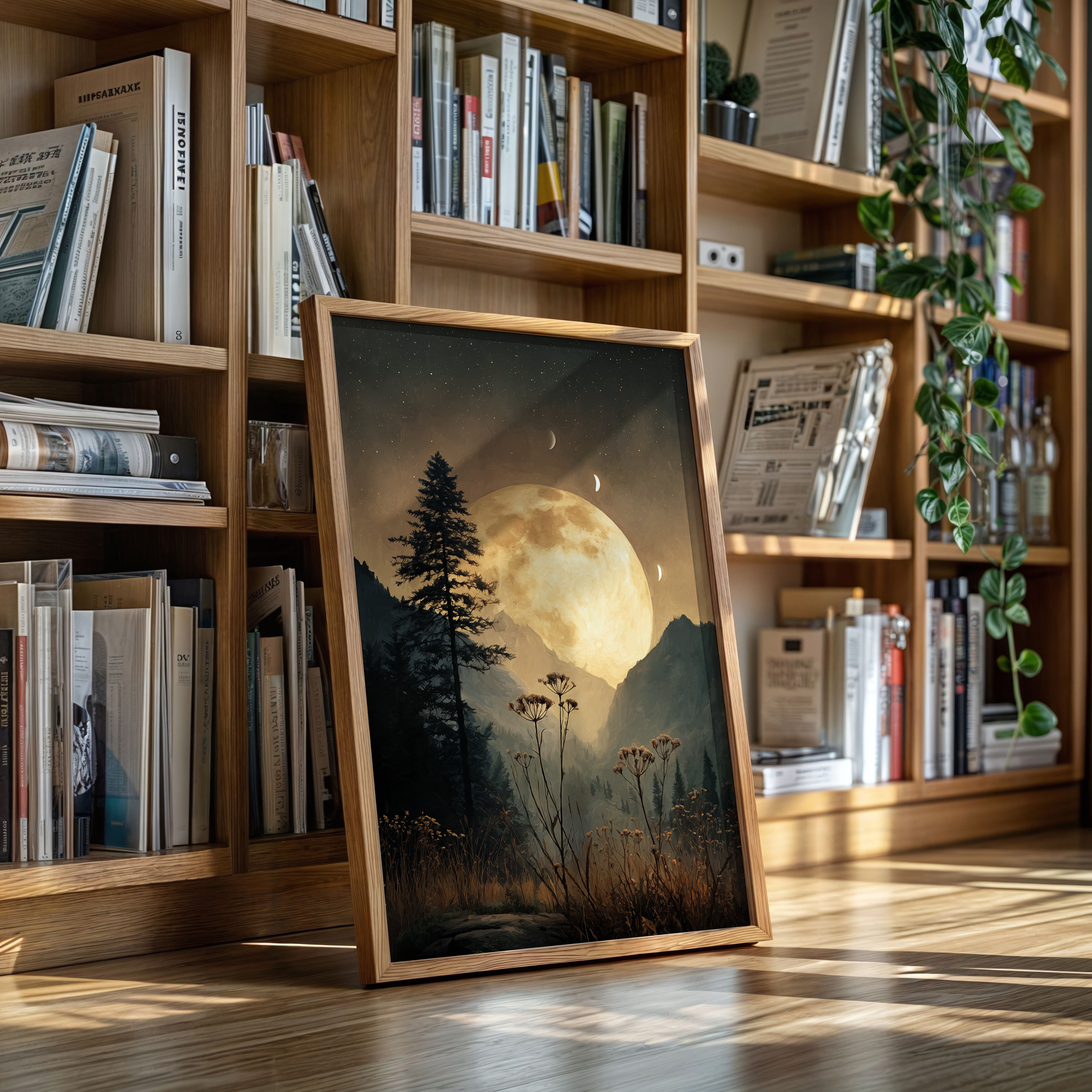 Amidst the towering pines, the world pauses, bathed in the golden glow of a magnificent moon. This piece captures the essence of the Artisanal collection, celebrating nature's quiet beauty. The landscape unfolds like a canvas, where delicate wildflowers stand sentinel against the majestic backdrop of mountains, their silhouettes softened by the luminous moonlight. Ideal for a tranquil reading nook or a serene bedroom, this art invites reflection and peace into your space.