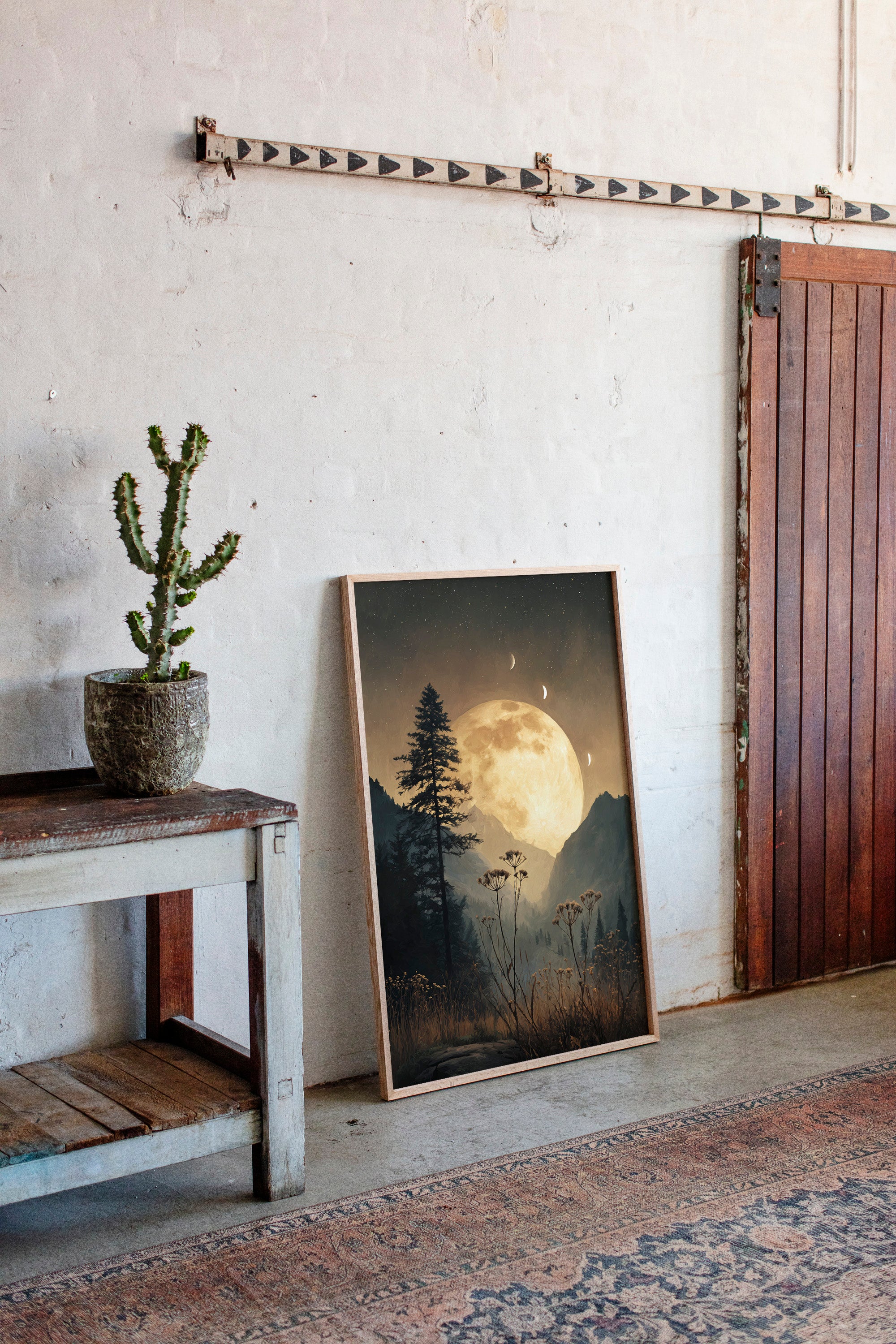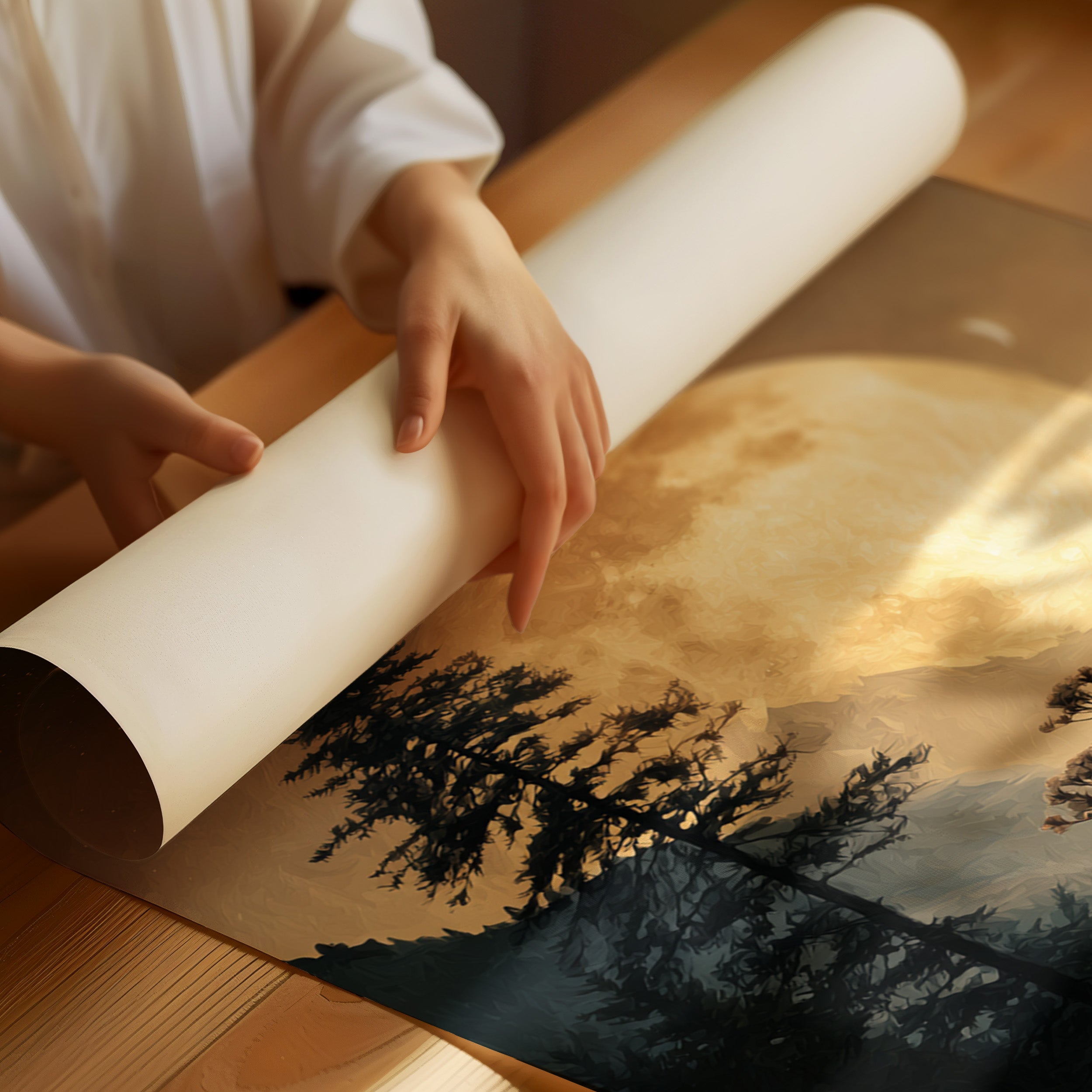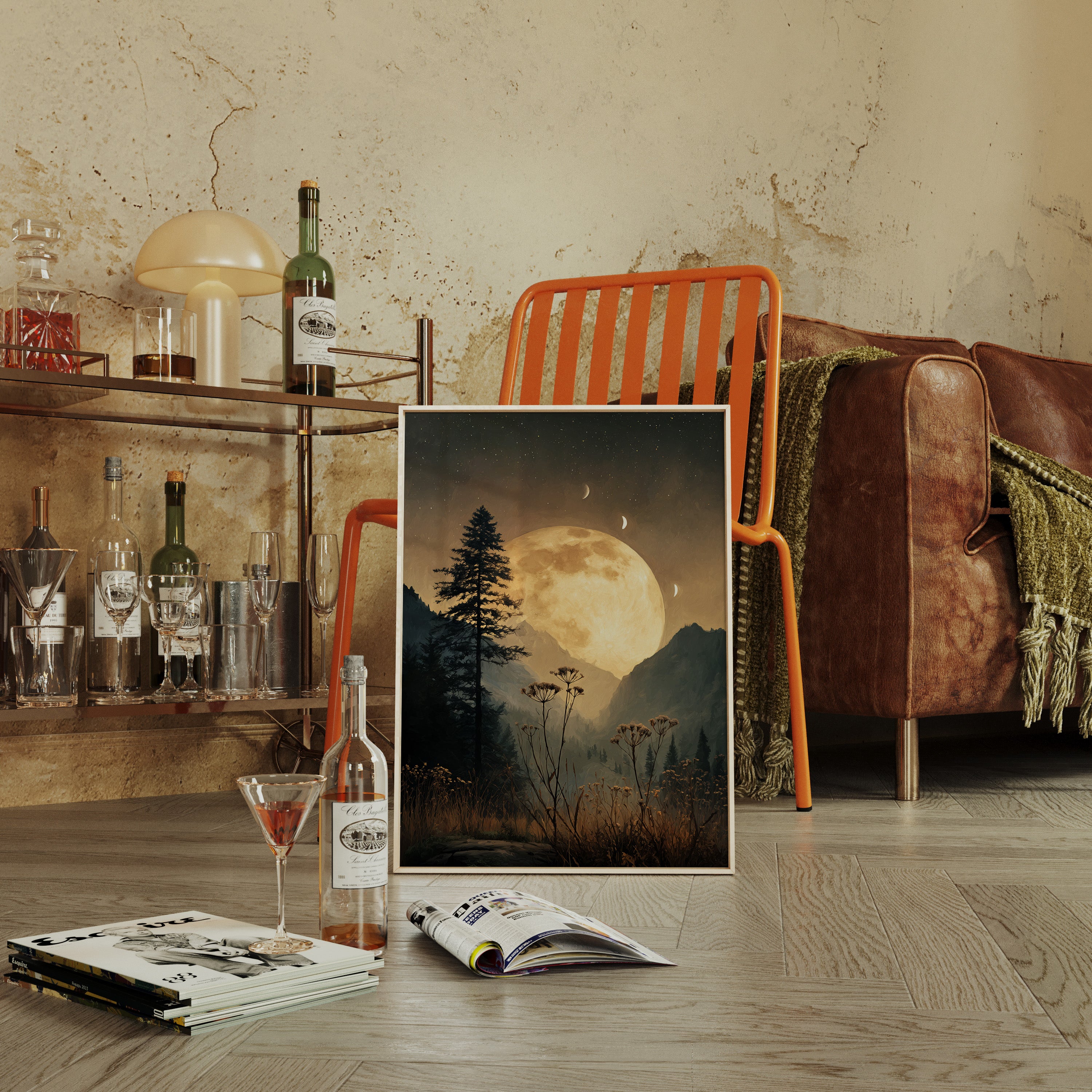 Amidst the towering pines, the world pauses, bathed in the golden glow of a magnificent moon. This piece captures the essence of the Artisanal collection, celebrating nature's quiet beauty. The landscape unfolds like a canvas, where delicate wildflowers stand sentinel against the majestic backdrop of mountains, their silhouettes softened by the luminous moonlight. Ideal for a tranquil reading nook or a serene bedroom, this art invites reflection and peace into your space.